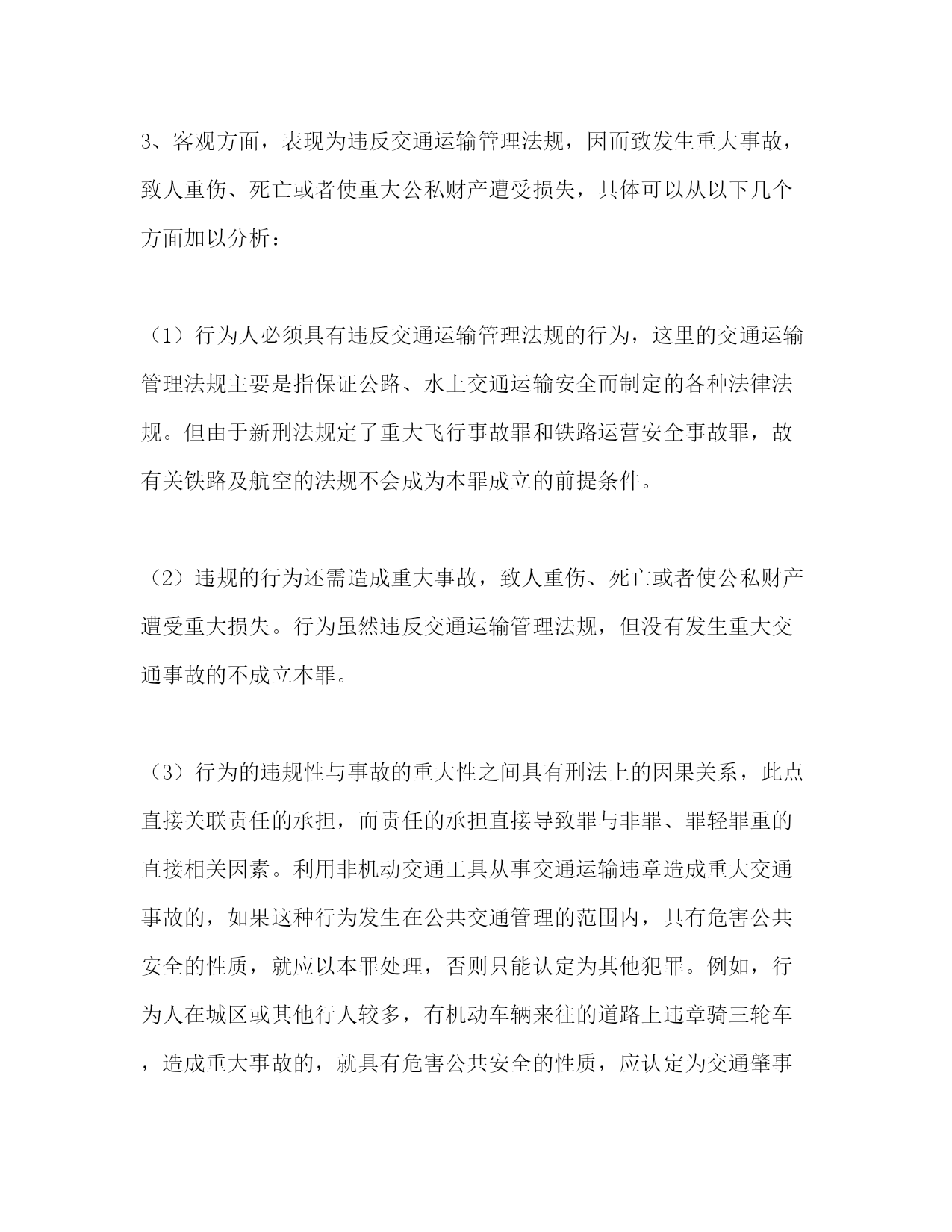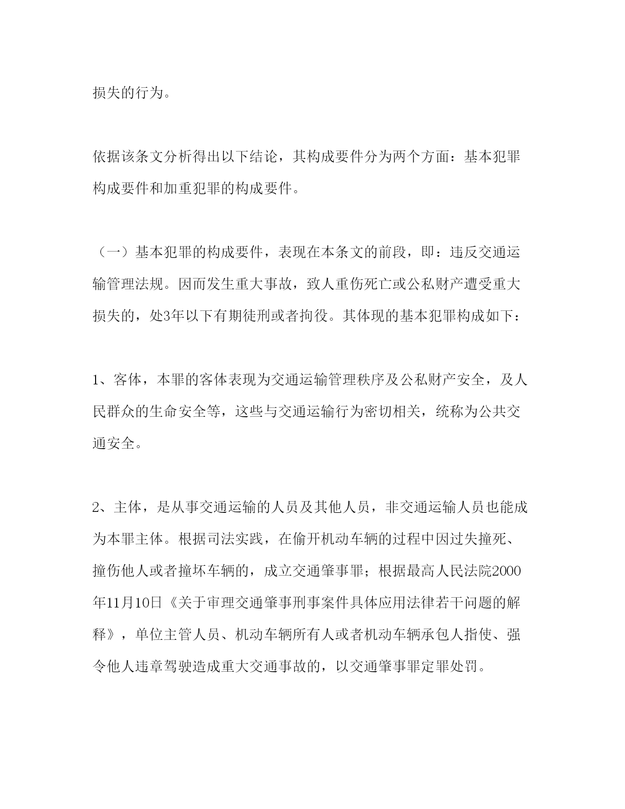 PAGE此资料由网络收集而来,如有侵权请告知上传者立即删除。资料共分享,我们负责传递知识。交通肇事罪的认定与预防交通安全与社会生活中的每个人息息相关,随着社会经济的发展,交通运输事业的日益发达,车辆逐渐增多,全国各地交通肇事案件接连不断的上升,交通肇事犯罪已经成为一种多发性犯罪,它严重的影响了人民群众生命和财产的安全,交通肇事罪作为一种常见多发的犯罪,极具社会危害性,成为社会安定的一大隐患。正确认定交通肇事罪正对于我们预防及打击交通肇事犯罪具有重要意义。一、交通肇事罪的概念及构成要件交通肇事罪是指违反交通运输管理法规,因而发生重大交通事故,致人重伤、死亡或者公私财产遭受重大损失的行为。新刑法133条规定“违反交通运输管理法规。因而发生重大事故,致人重伤死亡或公私财产遭受重大损失的,处3年以下有期徒刑或者拘役;交通运输肇事后逃逸或者有其他特别恶劣情节的,处3年以上7年以下有期徒刑;因逃逸致人死亡的,处7年以上有期徒刑。”本罪的客体是公共交通安全。客观方面表现为违反交通运输管理法规,因而发生重大交通事故,致人重伤、死亡或者使公私财物遭受重大损失的行为。依据该条文分析得出以下结论,其构成要件分为两个方面:基本犯罪构成要件和加重犯罪的构成要件。(一)基本犯罪的构成要件,表现在本条文的前段,即:违反交通运输管理法规。因而发生重大事故,致人重伤死亡或公私财产遭受重大损失的,处3年以下有期徒刑或者拘役。其体现的基本犯罪构成如下:1、客体,本罪的客体表现为交通运输管理秩序及公私财产安全,及人民群众的生命安全等,这些与交通运输行为密切相关,统称为公共交通安全。2、主体,是从事交通运输的人员及其他人员,非交通运输人员也能成为本罪主体。根据司法实践,在偷开机动车辆的过程中因过失撞死、撞伤他人或者撞坏车辆的,成立交通肇事罪;根据最高人民法院2000年11月10日《关于审理交通肇事刑事案件具体应用法律若干问题的解释》,单位主管人员、机动车辆所有人或者机动车辆承包人指使、强令他人违章驾驶造成重大交通事故的,以交通肇事罪定罪处罚。3、客观方面,表现为违反交通运输管理法规,因而致发生重大事故,致人重伤、死亡或者使重大公私财产遭受损失,具体可以从以下几个方面加以分析:(1)行为人必须具有违反交通运输管理法规的行为,这里的交通运输管理法规主要是指保证公路、水上交通运输安全而制定的各种法律法规。但由于新刑法规定了重大飞行事故罪和铁路运营安全事故罪,故有关铁路及航空的法规不会成为本罪成立的前提条件。(2)违规的行为还需造成重大事故,致人重伤、死亡或者使公私财产遭受重大损失。行为虽然违反交通运输管理法规,但没有发生重大交通事故的不成立本罪。(3)行为的违规性与事故的重大性之间具有刑法上的因果关系,此点直接关联责任的承担,而责任的承担直接导致罪与非罪、罪轻罪重的直接相关因素。利用非机动交通工具从事交通运输违章造成重大交通事故的,如果这种行为发生在公共交通管理的范围内,具有危害公共安全的性质,就应以本罪处理,否则只能认定为其他犯罪。例如,行为人在城区或其他行人较多,有机动车辆来往的道路上违章骑三轮车,造成重大事故的,就具有危害公共安全的性质,应认定为交通肇事罪。但行为人在人烟稀少、没有机动车来往的道路上违章骑三轮车致人重伤或死亡的,就不具有危害公共安全的性质,只能分别认定为过失致人重伤罪或过失致人死亡罪。4、主观方面,对于违规本身是故意,但对结果的发生仍然是一种过失,目前已达成基本共识。以上分析了交通肇事罪的基本犯罪构成,凡是符合以上四点,毫无疑问,应定为交通肇事罪,但是引起较大争议的,乃是笔者下文即要论述的加重犯罪构成。