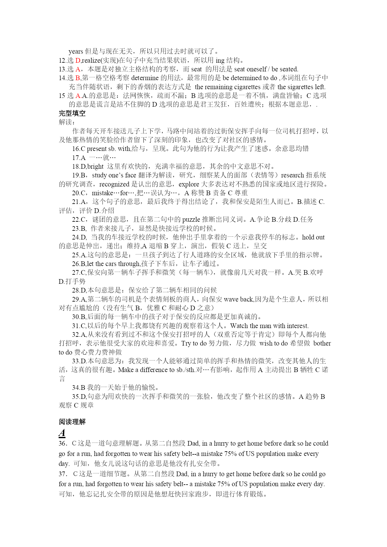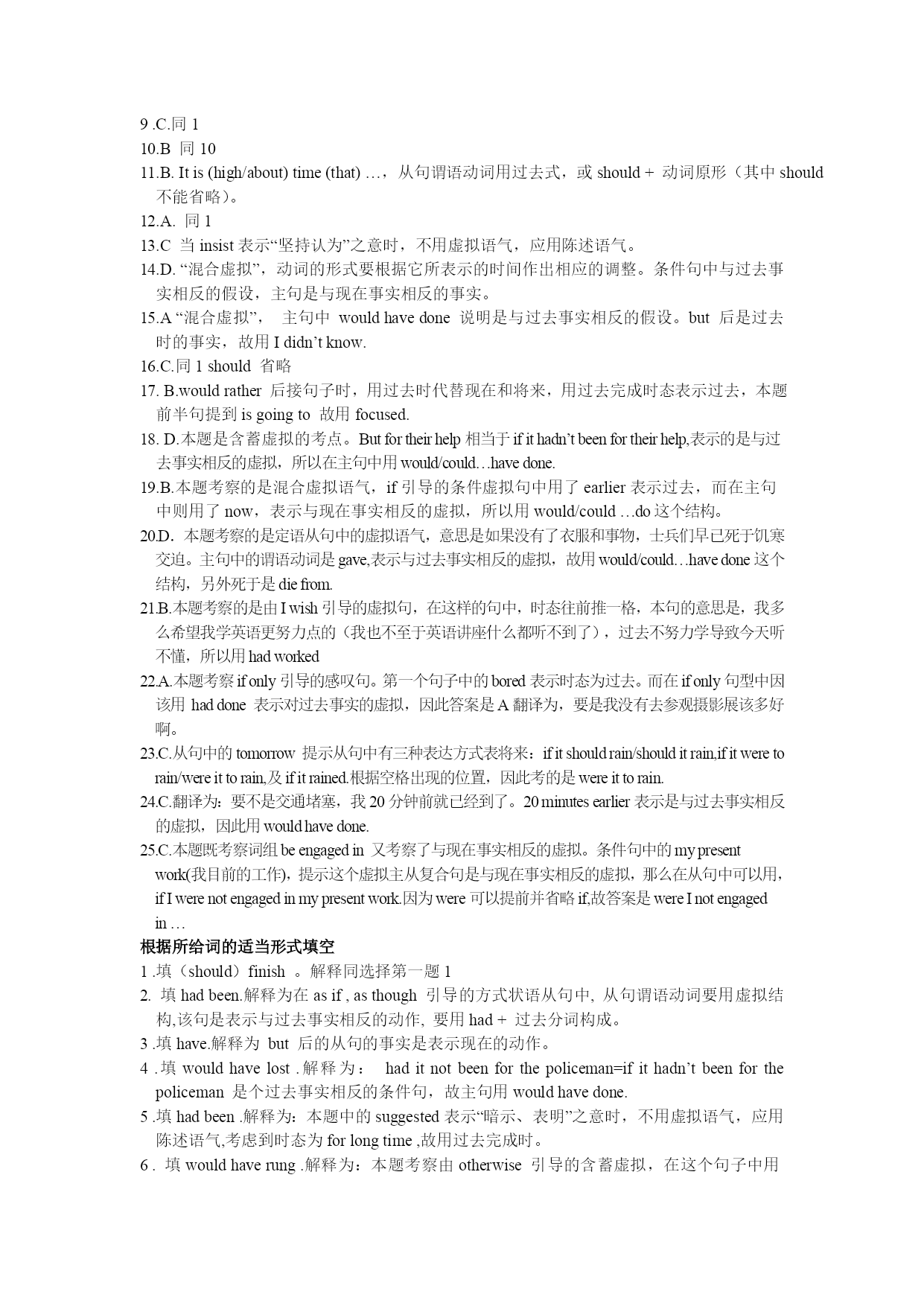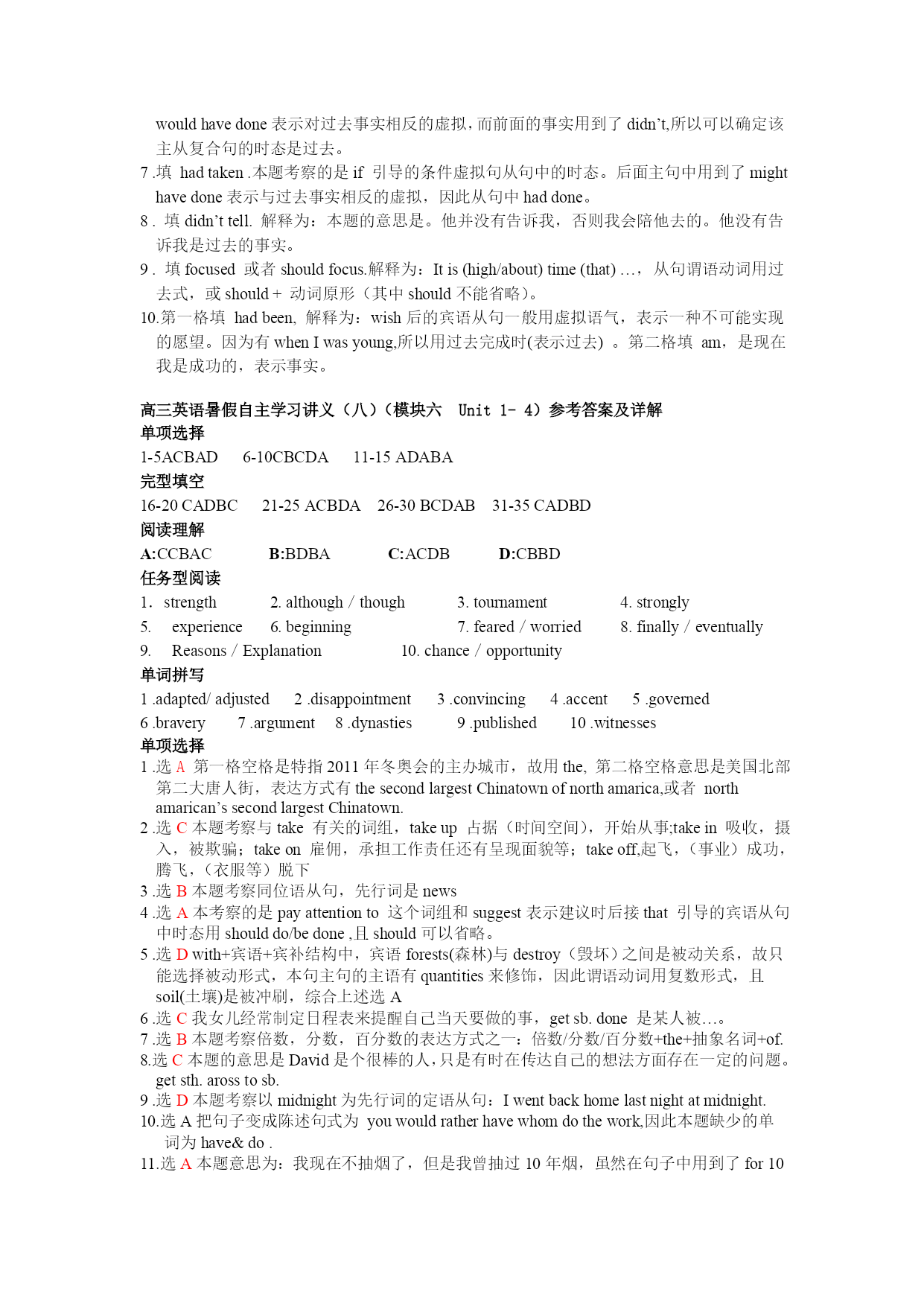 高三英语学生暑期自主学习讲义(七)(模块六虚拟语气)参考答案巩固性检测:单项选择1-5CDCBB6-10CDDCB11-15BACDA16-20CBDBD21-25BACCC根据所给动词的适当形式填空1.(should)finish2.hadbeen3.have4.wouldhavelost5.hadbeen6.wouldhaverung7.hadtaken8.didn’ttell9.focused/shouldfocus10.hadbeen,am二、作文答案:Withtheimprovementofpeople’slivingconditions,owningprivatecarsisbecomingpopularinChina.Differentvoicesariseinarecentsurveyconductedbyus.Thoseinfavorofbuyingprivatecarsarguethatwaitingforbuseswastesmuchtime.Evenwhentheymanagetogetontothebus,crowdednessoftenmakesthemuncomfortable.Privatecarsmakeupfortheaboveheadaches,though.Besides,owingcarsindicatestheadvancementofourcountry,andinmm,itstimulatesautoindustryandthereforecontributestoeconomicdevelopment.However,otherpeoplelistsomeunfavorableeffectsofprivatecars.Theyoftencreatetrafficjams;theyconsumeplentyofoil.What’smore,theygiveoffenormouswastegases,causingpollutionanddisease.Inourview,todevelopcleanandhybridfuelsmaybeagoodsolutiontoairpollution,becauseitcanreducetheemissionofcarbondioxide.Inaddition,efficientandconvenientpublictransportationsystemscanalsodiscouragepeoplefrombuyingprivatecars.Onthewhole,awarenessofenvironmentprotectionneedsthecollectiveeffortsfromthegovernmentaswellasthepublic.巩固性检测详解:单项选择1.C虚拟语气中用于表示建议、愿望、命令等词后的宾语从句中,常见的动词有:demand,order,require,insist,suggest,propose,advise,recommend等。结构为“should+动词原形”,should可以省略。2.D.该题是由if引导的条件状语从句,表示一种假设。表示与过去事实相反,主句的动作与过去将来事实相反,故从句谓语动词用haddone,主句用would(could,might)+havedone。答案D。3.C.Itisdesired/suggested/proposed/necessary/important/strange/natural/apity+that从句,从句中的谓语动词用“should+动词原形”,should可以省略。4.B在wouldrather后的宾语从句中,也用虚拟语气,其构成为动词用过去式。如:Iwouldrathertheydidn'thearofthenews.5.B在suggestion,proposal,order,plan,idea,request,advice等名词后的主语从句、表语从句和同位语从句中要用虚拟语气。其构成是“should+动词原形”。6.C.考查虚拟语气条件句,if从句是与将来事实相反的假设。Ifheweretodo….,hewoulddo这里if省略,were提前.7.D考查虚拟语气条件句,if从句是与将来事实相反的假设。故从句谓语动词用were,主句用would(could,might)+动词原形。答案D。8.D.该题是由if引导的条件状语从句,表示一种假设。从句表示与过去事实相反,if省略,助动词提前,主句的动作与过去将来事实相反.从句中hadsbdone,主句用would(could,might)+havedone。答