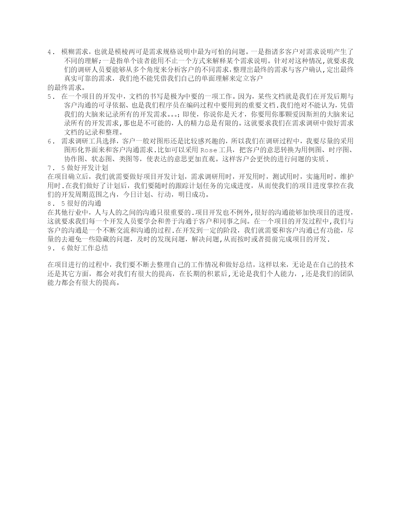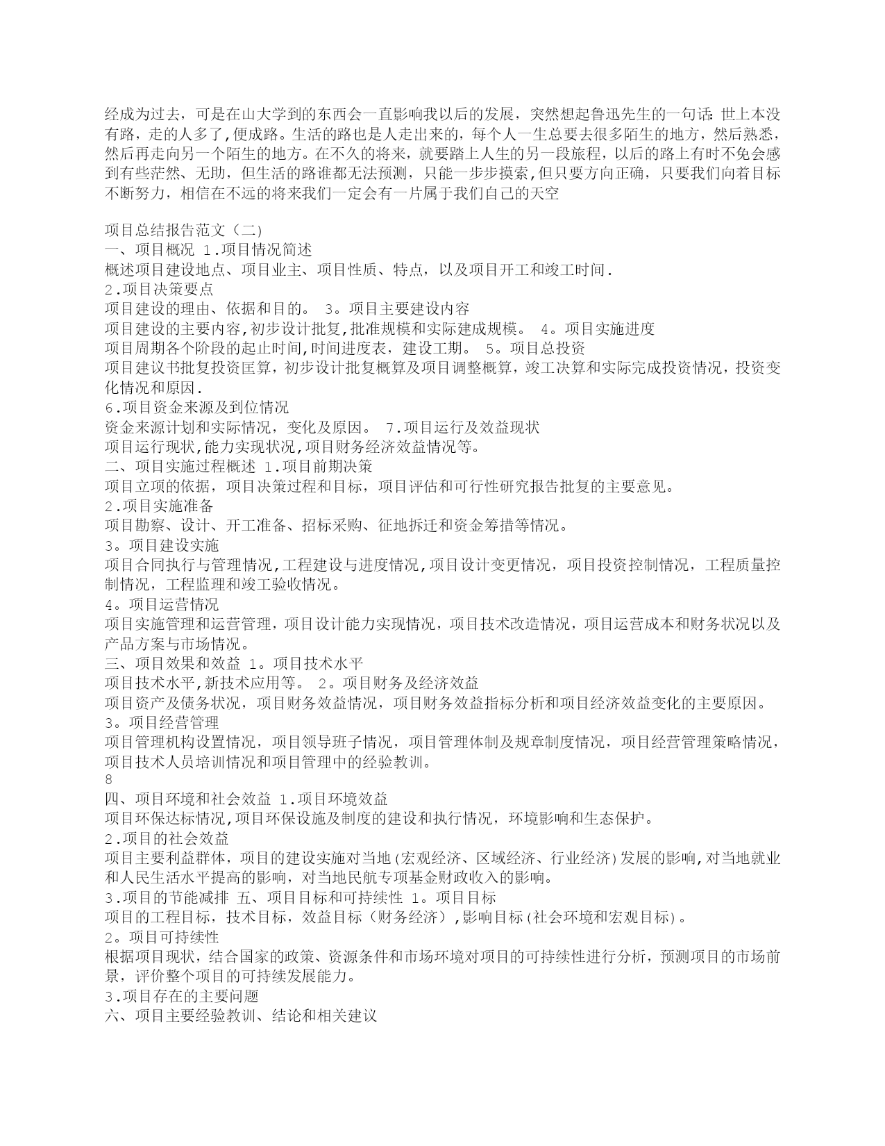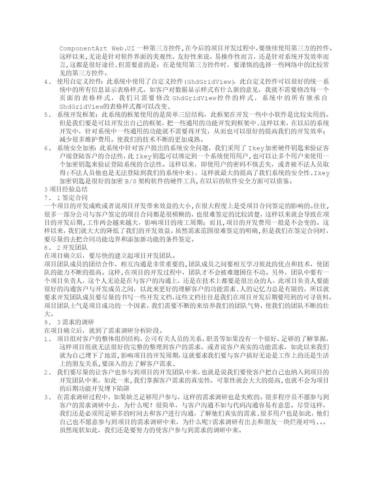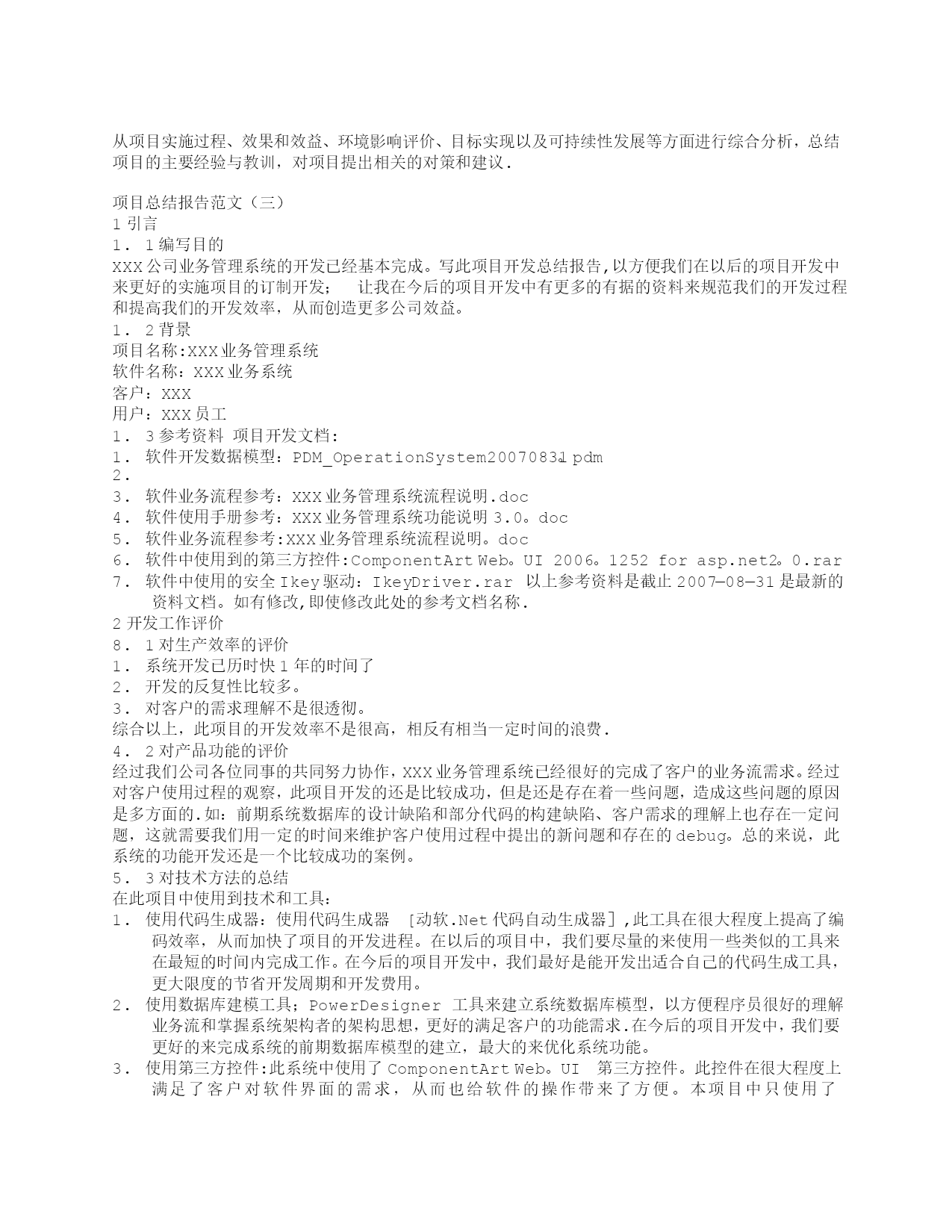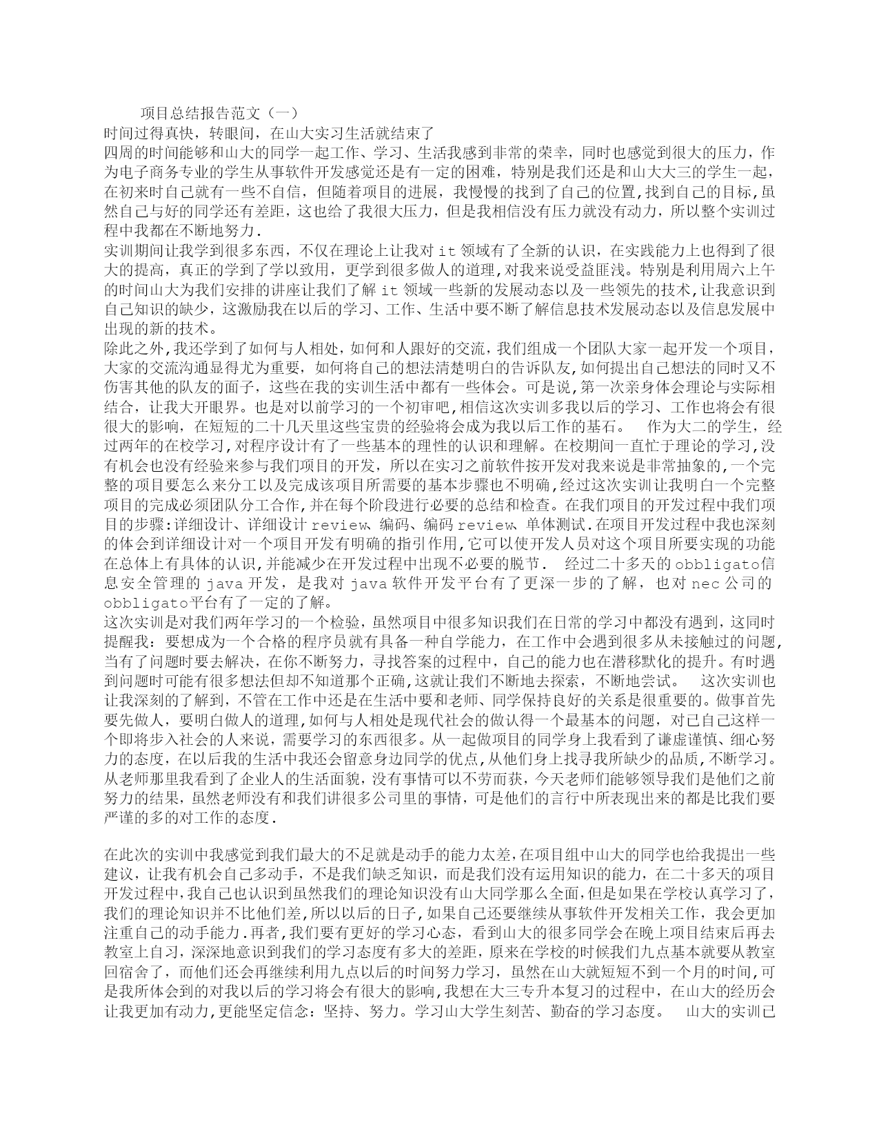 项目验收附件三——科技计划项目技术总结报告(样表)实用文档(实用文档,可以直接使用,可编辑优秀版资料,欢迎下载)城关区科技项目验收附件三城关区科技计划项目技术总结报告项目名称:项目编号:起止时间:承担单位(盖章):项目负责人:填报日期:目录一、项目概况1、项目提出的背景2、项目基本情况概述二、项目项目主要技术及基本原理三、技术特点及技术路线1、技术特点及创新点2、解决的关键技术问题3、技术路线四、项目取得的技术成果五、项目的适用范围六、项目存在的问题及改进方法项目总结报告范文(一)时间过得真快,转眼间,在山大实习生活就结束了四周的时间能够和山大的同学一起工作、学习、生活我感到非常的荣幸,同时也感觉到很大的压力,作为电子商务专业的学生从事软件开发感觉还是有一定的困难,特别是我们还是和山大大三的学生一起,在初来时自己就有一些不自信,但随着项目的进展,我慢慢的找到了自己的位置,找到自己的目标,虽然自己与好的同学还有差距,这也给了我很大压力,但是我相信没有压力就没有动力,所以整个实训过程中我都在不断地努力.实训期间让我学到很多东西,不仅在理论上让我对it领域有了全新的认识,在实践能力上也得到了很大的提高,真正的学到了学以致用,更学到很多做人的道理,对我来说受益匪浅。特别是利用周六上午的时间山大为我们安排的讲座让我们了解it领域一些新的发展动态以及一些领先的技术,让我意识到自己知识的缺少,这激励我在以后的学习、工作、生活中要不断了解信息技术发展动态以及信息发展中出现的新的技术。除此之外,我还学到了如何与人相处,如何和人跟好的交流,我们组成一个团队大家一起开发一个项目,大家的交流沟通显得尤为重要,如何将自己的想法清楚明白的告诉队友,如何提出自己想法的同时又不伤害其他的队友的面子,这些在我的实训生活中都有一些体会。可是说,第一次亲身体会理论与实际相结合,让我大开眼界。也是对以前学习的一个初审吧,相信这次实训多我以后的学习、工作也将会有很很大的影响,在短短的二十几天里这些宝贵的经验将会成为我以后工作的基石。作为大二的学生,经过两年的在校学习,对程序设计有了一些基本的理性的认识和理解。在校期间一直忙于理论的学习,没有机会也没有经验来参与我们项目的开发,所以在实习之前软件按开发对我来说是非常抽象的,一个完整的项目要怎么来分工以及完成该项目所需要的基本步骤也不明确,经过这次实训让我明白一个完整项目的完成必须团队分工合作,并在每个阶段进行必要的总结和检查。在我们项目的开发过程中我们项目的步骤:详细设计、详细设计review、编码、编码review、单体测试.在项目开发过程中我也深刻的体会到详细设计对一个项目开发有明确的指引作用,它可以使开发人员对这个项目所要实现的功能在总体上有具体的认识,并能减少在开发过程中出现不必要的脱节.经过二十多天的obbligato信息安全管理的java开发,是我对java软件开发平台有了更深一步的了解,也对nec公司的obbligato平台有了一定的了解。这次实训是对我们两年学习的一个检验,虽然项目中很多知识我们在日常的学习中都没有遇到,这同时提醒我:要想成为一个合格的程序员就有具备一种自学能力,在工作中会遇到很多从未接触过的问题,当有了问题时要去解决,在你不断努力,寻找答案的过程中,自己的能力也在潜移默化的提升。有时遇到问题时可能有很多想法但却不知道那个正确,这就让我们不断地去探索,不断地尝试。这次实训也让我深刻的了解到,不管在工作中还是在生活中要和老师、同学保持良好的关系是很重要的。做事首先要先做人,要明白做人的道理,如何与人相处是现代社会的做认得一个最基本的问题,对已自己这样一个即将步入社会的人来说,需要学习的东西很多。从一起做项目的同学身上我看到了谦虚谨慎、细心努力的态度,在以后我的生活中我还会留意身边同学的优点,从他们身上找寻我所缺少的品质,不断学习。从老师那里我看到了企业人的生活面貌,没有事情可以不劳而获,今天老师们能够领导我们是他们之前努力的结果,虽然老师没有和我们讲很多公司里的事情,可是他们的言行中所表现出来的都是比我们要严谨的多的对工作的态度.在此次的实训中我感觉到我们最大的不足就是动手的能力太差,在项目组中山大的同学也给我提出一些建议,让我有机会自己多动手,不是我们缺乏知识,而是我们没有运用知识的能力,在二十多天的项目开发过程中,我自己也认识到虽然我们的理论知识没有山大同学那么全面,但是如果在学校认真学习了,我们的理论知识并不比他们差,所以以后的日子,如果自己还要继续从事软件开发相关工作,我会更加注重自己的动手能力.再者,我们要有更好的学习心态,看到山大的很多同学会在晚上项目结束后再去教室上