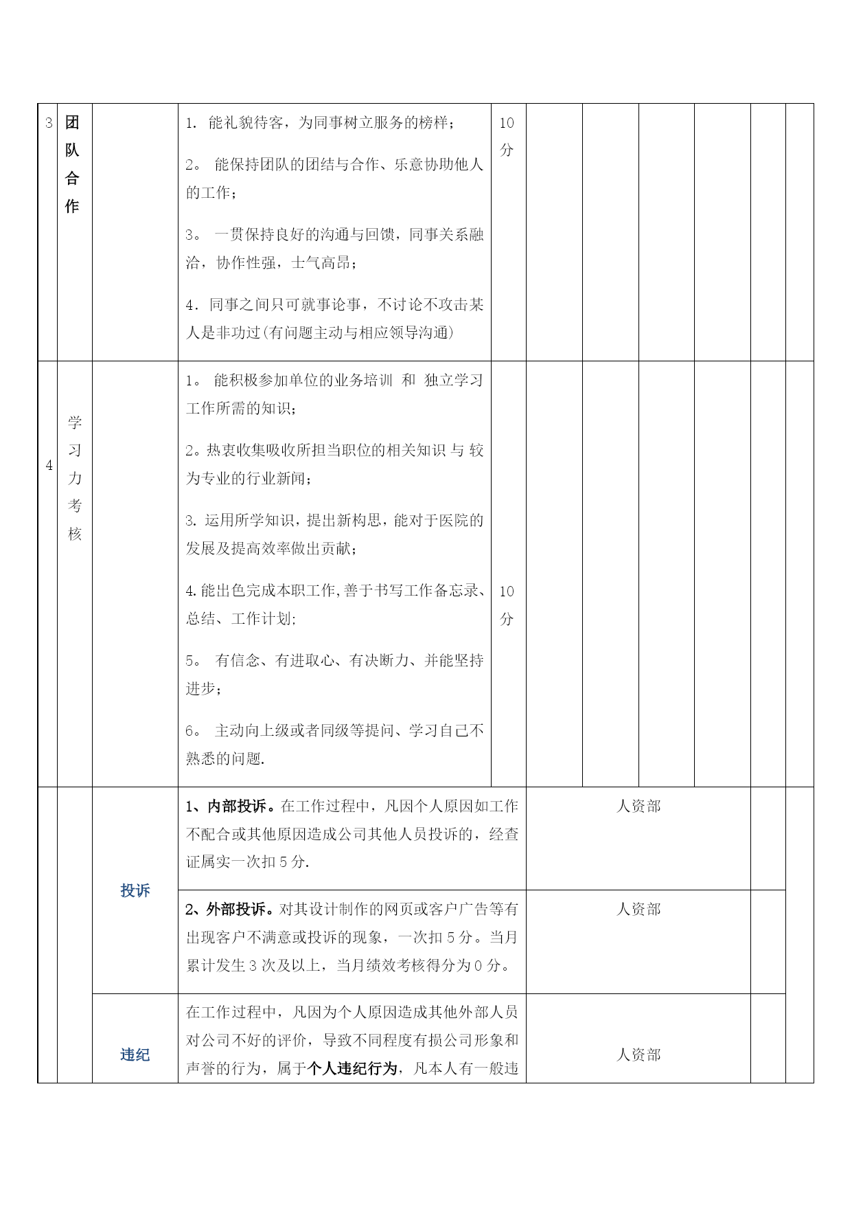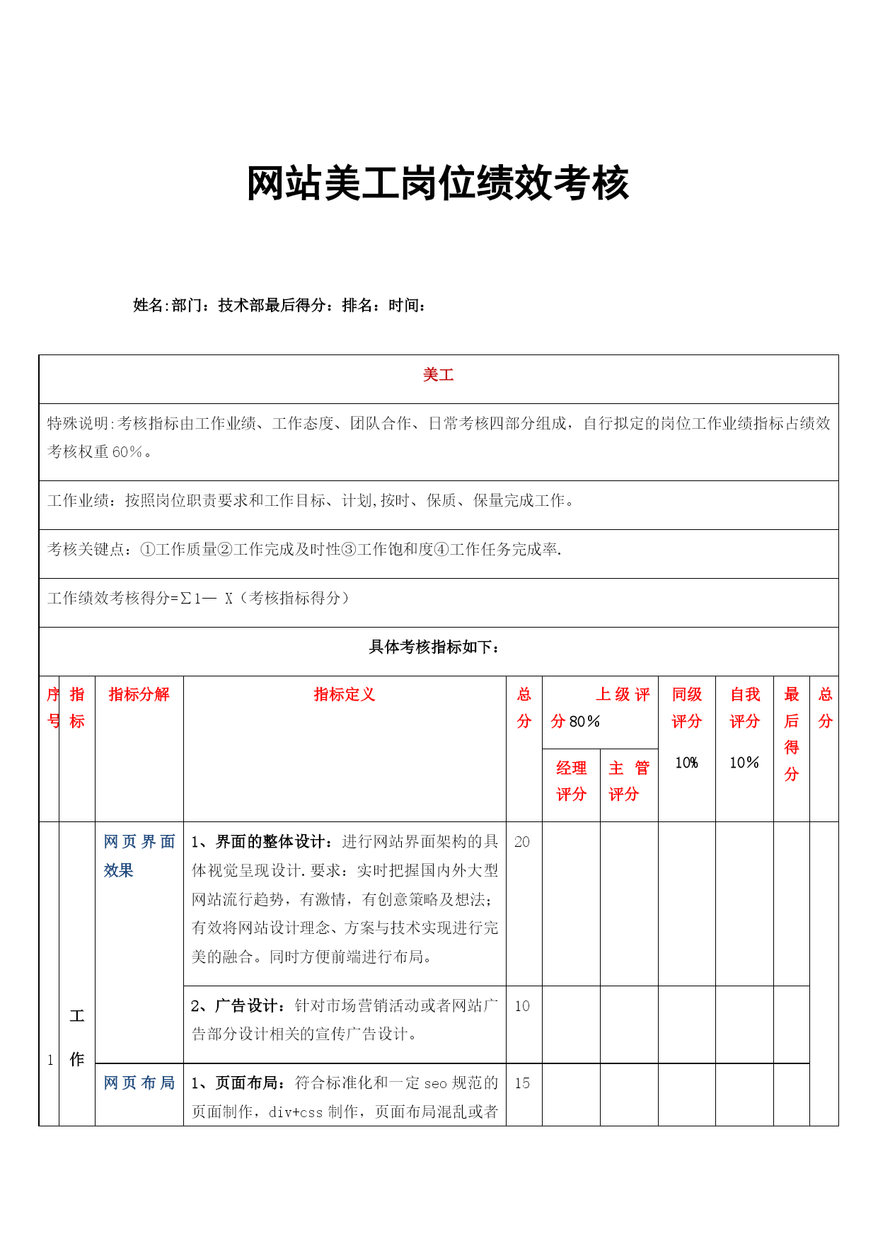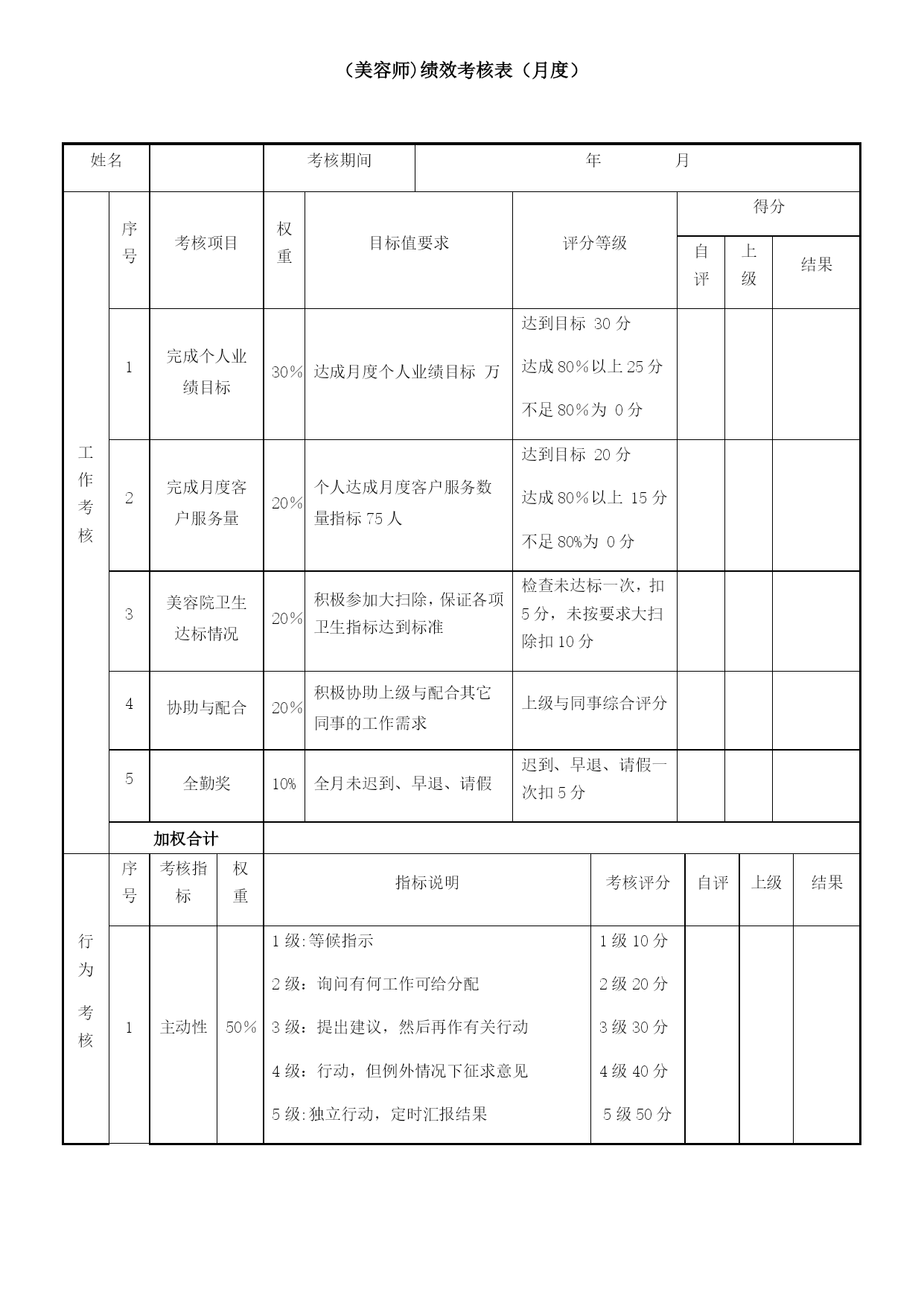 美工设计绩效考核(可以直接使用,可编辑优秀版资料,欢迎下载)权重指标项目指标内容及分数自评同事经理平均得分此项得分工作业绩50%卡片设计(0-10′)公司所需素材设计(0-10′)海报设计(0—10′)店铺/官网图片设计(0—10′)B2B产品发布(0—10′)岗位技能20%PS/AI熟练程度(0-5′)其他修图软件操作(0-5′)工作完成速度(0—5′)图片设计质量(0—5′)工作态度15%工作效率(0—5′)工作汇报完成情况(0-5′)日常考勤(0—5′)综合能力15%团队意识(0—3′)学习能力(0-3′)沟通能力(0-3′)职业操守道德(0—3′)配合处理能力(0—3′)额外分失误工作中因图片信息失误,给公司造成不良影响或有出现客户不满意或投诉的现象,扣3分;若造成重大损失当月绩效为0。人事部违纪在工作过程中,不遵守公司规章制度或对公司造成不良影响,属于个人违纪行为,一次扣3分;凡本人有较严重违纪行为,一次扣10分;凡本人有严重违纪行为,当月绩效得分为0,公司有权解除劳动合同.人事部表扬部门级奖励:月度内若员工在工作中有突出表现或进行了额外的工作,可由部门负责人根据实际情况酌情给予一定的加分,此项加分上限为5分。人事部奖励:月度内员工在公司组织的活动、员工大会或其他方面表现突出的,可酌情给予加2分奖励,此项加分上限为5分。人事部特殊贡献1、为公司系统性节约成本500元以上;2、针对公司管理及其他提出合理性工作建议和解决方案,被公司采纳并推广实行的;3、其他:获得客户赞扬或为公司带来荣誉的,获董事长认可。根据贡献的大小,酌情给予奖励,加分上限为5分。人事部汇总(岗位技能)+(业绩指标)+(工作态度)+(学习能力)+/-额外分值说明考核说明:薪资结算方式=基本薪资×绩效系数%×绩效得分+基本薪资1、以上考核做为月度考核,但考核分数将纳入年终考核范畴;2、总计分数为100分,达90分以上为月优秀员工、80—90分为月合格员工、75分以下无绩效奖金;3、连续三个月被达90分以上,将被授予季度“优秀员工”,可获得季度奖金500元,并享受带薪学习机会;4、绩效系数有绩效得分确定:80≤绩效分<90绩效系数为0.05;90≤绩效分<95绩效系数为0.08;95≤绩效分<100绩效系数为0.1;100以上绩效系数为0。12;110以上(最高)绩效系数为0。15。美工设计绩效考核标准(美容师)绩效考核表(月度)姓名考核期间年月工作考核序号考核项目权重目标值要求评分等级得分自评上级结果1完成个人业绩目标30%达成月度个人业绩目标万达到目标30分达成80%以上25分不足80%为0分2完成月度客户服务量20%个人达成月度客户服务数量指标75人达到目标20分达成80%以上15分不足80%为0分3美容院卫生达标情况20%积极参加大扫除,保证各项卫生指标达到标准检查未达标一次,扣5分,未按要求大扫除扣10分4协助与配合20%积极协助上级与配合其它同事的工作需求上级与同事综合评分5全勤奖10%全月未迟到、早退、请假迟到、早退、请假一次扣5分加权合计行为考核序号考核指标权重指标说明考核评分自评上级结果1主动性50%1级:等候指示2级:询问有何工作可给分配3级:提出建议,然后再作有关行动4级:行动,但例外情况下征求意见5级:独立行动,定时汇报结果1级10分2级20分3级30分4级40分5级50分2责任心50%1级:无责任心,喜欢推诿任务,找借口2级:责任心一般,勉强完成工作任务3级:有一定的责任感,能完成工作任务4级:有较强的责任感,主动分担工作责任,努力完成任务5级:责任感强,勇于承担工作责任,克服一切困难确保完成任务1级10分2级20分3级30分4级40分5级50分加权合计总分总分=业绩考核得分×80%+行为考核得分×20%=考核人签字:年月日考被核人签签字:月日网站美工岗位绩效考核姓名:部门:技术部最后得分:排名:时间:美工特殊说明:考核指标由工作业绩、工作态度、团队合作、日常考核四部分组成,自行拟定的岗位工作业绩指标占绩效考核权重60%。工作业绩:按照岗位职责要求和工作目标、计划,按时、保质、保量完成工作。考核关键点:①工作质量②工作完成及时性③工作饱和度④工作任务完成率.工作绩效考核得分=∑1—X(考核指标得分)具体考核指标如下:序号指标指标分解指标定义总分上级评分80%同级评分10%自我评分10%最后得分总分经理评分主管评分1工作业绩网页界面效果1、界面的整体设计:进行网站界面架构的具体视觉呈现设计.要求:实时把握国内外大型网站流行趋势,有激情,有创意策略及想法;有效将网站设计理念、方案与技术实现进行完美的融合