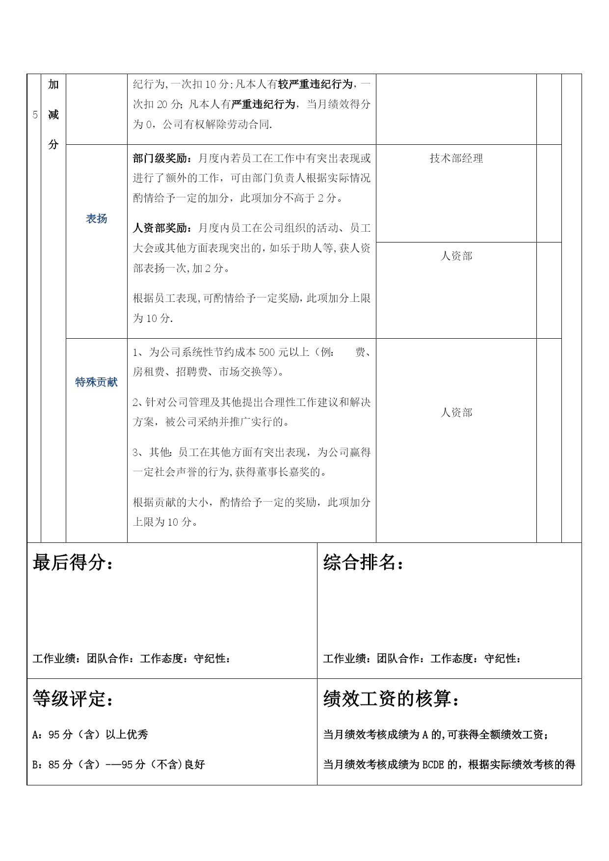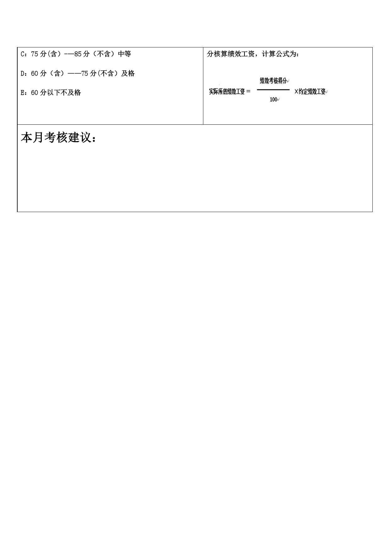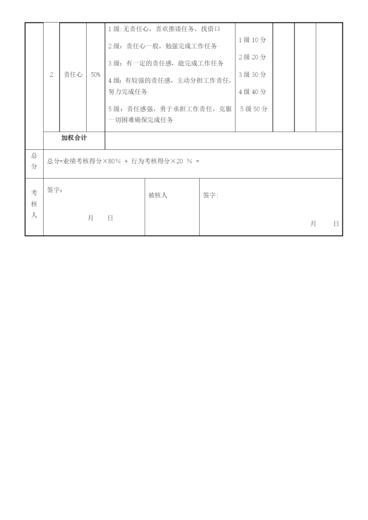 美工设计绩效考核(可以直接使用,可编辑优秀版资料,欢迎下载)权重指标项目指标内容及分数自评同事经理平均得分此项得分工作业绩50%卡片设计(0-10′)公司所需素材设计(0-10′)海报设计(0—10′)店铺/官网图片设计(0—10′)B2B产品发布(0—10′)岗位技能20%PS/AI熟练程度(0-5′)其他修图软件操作(0-5′)工作完成速度(0—5′)图片设计质量(0—5′)工作态度15%工作效率(0—5′)工作汇报完成情况(0-5′)日常考勤(0—5′)综合能力15%团队意识(0—3′)学习能力(0-3′)沟通能力(0-3′)职业操守道德(0—3′)配合处理能力(0—3′)额外分失误工作中因图片信息失误,给公司造成不良影响或有出现客户不满意或投诉的现象,扣3分;若造成重大损失当月绩效为0。人事部违纪在工作过程中,不遵守公司规章制度或对公司造成不良影响,属于个人违纪行为,一次扣3分;凡本人有较严重违纪行为,一次扣10分;凡本人有严重违纪行为,当月绩效得分为0,公司有权解除劳动合同.人事部表扬部门级奖励:月度内若员工在工作中有突出表现或进行了额外的工作,可由部门负责人根据实际情况酌情给予一定的加分,此项加分上限为5分。人事部奖励:月度内员工在公司组织的活动、员工大会或其他方面表现突出的,可酌情给予加2分奖励,此项加分上限为5分。人事部特殊贡献1、为公司系统性节约成本500元以上;2、针对公司管理及其他提出合理性工作建议和解决方案,被公司采纳并推广实行的;3、其他:获得客户赞扬或为公司带来荣誉的,获董事长认可。根据贡献的大小,酌情给予奖励,加分上限为5分。人事部汇总(岗位技能)+(业绩指标)+(工作态度)+(学习能力)+/-额外分值说明考核说明:薪资结算方式=基本薪资×绩效系数%×绩效得分+基本薪资1、以上考核做为月度考核,但考核分数将纳入年终考核范畴;2、总计分数为100分,达90分以上为月优秀员工、80—90分为月合格员工、75分以下无绩效奖金;3、连续三个月被达90分以上,将被授予季度“优秀员工”,可获得季度奖金500元,并享受带薪学习机会;4、绩效系数有绩效得分确定:80≤绩效分<90绩效系数为0.05;90≤绩效分<95绩效系数为0.08;95≤绩效分<100绩效系数为0.1;100以上绩效系数为0。12;110以上(最高)绩效系数为0。15。美工设计绩效考核标准(美容师)绩效考核表(月度)姓名考核期间年月工作考核序号考核项目权重目标值要求评分等级得分自评上级结果1完成个人业绩目标30%达成月度个人业绩目标万达到目标30分达成80%以上25分不足80%为0分2完成月度客户服务量20%个人达成月度客户服务数量指标75人达到目标20分达成80%以上15分不足80%为0分3美容院卫生达标情况20%积极参加大扫除,保证各项卫生指标达到标准检查未达标一次,扣5分,未按要求大扫除扣10分4协助与配合20%积极协助上级与配合其它同事的工作需求上级与同事综合评分5全勤奖10%全月未迟到、早退、请假迟到、早退、请假一次扣5分加权合计行为考核序号考核指标权重指标说明考核评分自评上级结果1主动性50%1级:等候指示2级:询问有何工作可给分配3级:提出建议,然后再作有关行动4级:行动,但例外情况下征求意见5级:独立行动,定时汇报结果1级10分2级20分3级30分4级40分5级50分2责任心50%1级:无责任心,喜欢推诿任务,找借口2级:责任心一般,勉强完成工作任务3级:有一定的责任感,能完成工作任务4级:有较强的责任感,主动分担工作责任,努力完成任务5级:责任感强,勇于承担工作责任,克服一切困难确保完成任务1级10分2级20分3级30分4级40分5级50分加权合计总分总分=业绩考核得分×80%+行为考核得分×20%=考核人签字:年月日考被核人签签字:月日网站美工岗位绩效考核姓名:部门:技术部最后得分:排名:时间:美工特殊说明:考核指标由工作业绩、工作态度、团队合作、日常考核四部分组成,自行拟定的岗位工作业绩指标占绩效考核权重60%。工作业绩:按照岗位职责要求和工作目标、计划,按时、保质、保量完成工作。考核关键点:①工作质量②工作完成及时性③工作饱和度④工作任务完成率.工作绩效考核得分=∑1—X(考核指标得分)具体考核指标如下:序号指标指标分解指标定义总分上级评分80%同级评分10%自我评分10%最后得分总分经理评分主管评分1工作业绩网页界面效果1、界面的整体设计:进行网站界面架构的具体视觉呈现设计.要求:实时把握国内外大型网站流行趋势,有激情,有创意策略及想法;有效将网站设计理念、方案与技术实现进行完美的融合