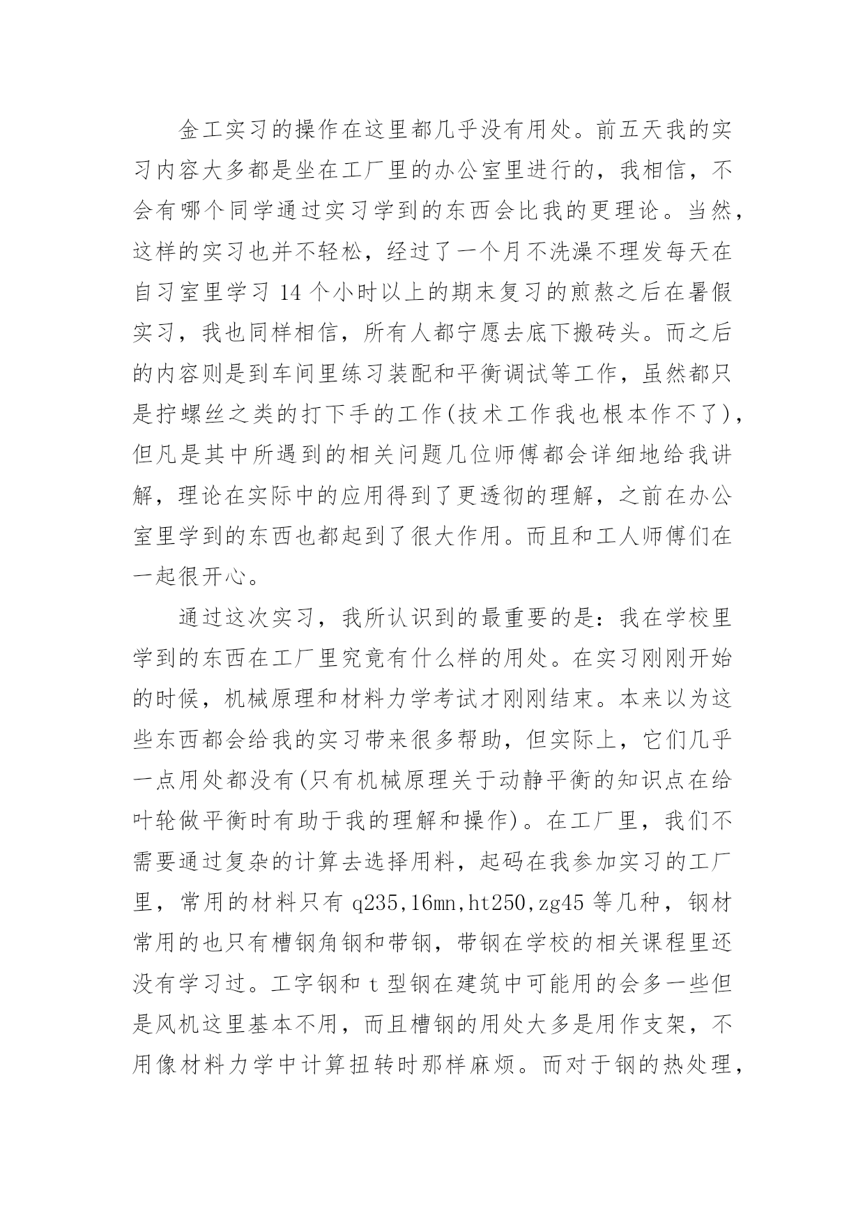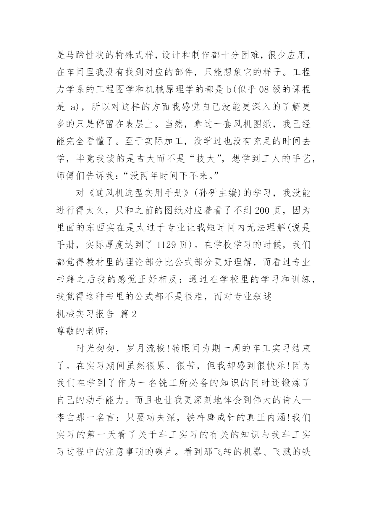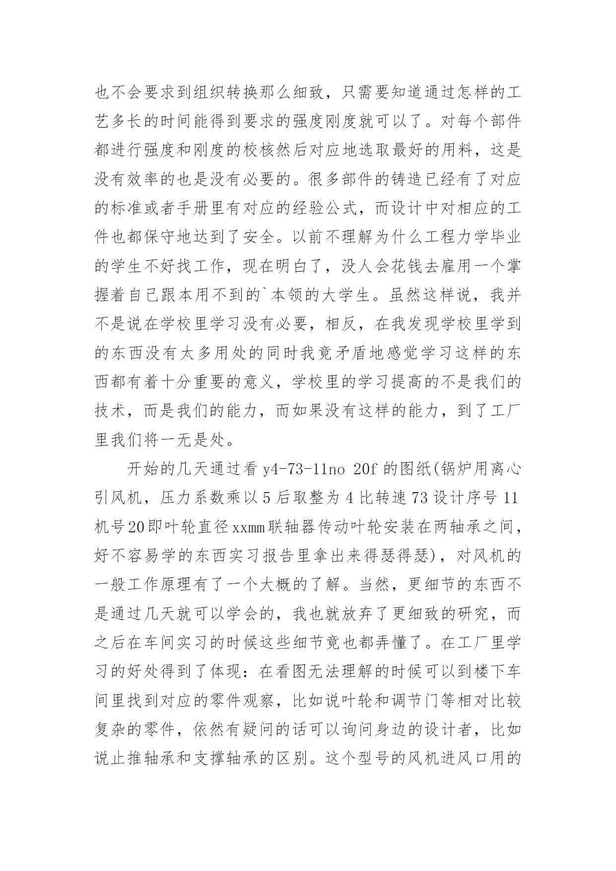 机械实习报告关于机械实习报告集锦七篇在现实生活中,报告的使用成为日常生活的常态,报告中涉及到专业性术语要解释清楚。一听到写报告马上头昏脑涨?下面是小编整理的机械实习报告7篇,欢迎大家分享。机械实习报告篇1实习目的:理论联系实际,在特定机械领域(风机)内了解理论知识在实际生产中的应用实习时间:20xx学年暑假为期20天实习地点:xx省xx中成风机工程有限公司(7月20日迁至辽宁现辽宁金丰风机工程有限公司)实习内容:风机相关的简单内容y4-73-11no20f型锅炉离心引风机设计了解(图纸)风机选用手册学习cad练习机械装配、动平衡调整等实习总结:与以往的师兄师姐们相比,我的这次暑期社会实习可以说幸运得多。在风机厂里我受到了不少照顾而不是像许多师兄师姐所说的那样到工厂里只是搬了一个月的砖头或者其他各样的体力活却没有学到什么更实际的东西。说起来,我想我的实习与其说起来是“实习”,更不如说是“学习”,因为我在学校所学到的知识无论是纯理论还是金工实习的操作在这里都几乎没有用处。前五天我的实习内容大多都是坐在工厂里的办公室里进行的,我相信,不会有哪个同学通过实习学到的东西会比我的更理论。当然,这样的实习也并不轻松,经过了一个月不洗澡不理发每天在自习室里学习14个小时以上的期末复习的煎熬之后在暑假实习,我也同样相信,所有人都宁愿去底下搬砖头。而之后的内容则是到车间里练习装配和平衡调试等工作,虽然都只是拧螺丝之类的打下手的工作(技术工作我也根本作不了),但凡是其中所遇到的相关问题几位师傅都会详细地给我讲解,理论在实际中的应用得到了更透彻的理解,之前在办公室里学到的东西也都起到了很大作用。而且和工人师傅们在一起很开心。通过这次实习,我所认识到的最重要的是:我在学校里学到的东西在工厂里究竟有什么样的用处。在实习刚刚开始的时候,机械原理和材料力学考试才刚刚结束。本来以为这些东西都会给我的实习带来很多帮助,但实际上,它们几乎一点用处都没有(只有机械原理关于动静平衡的知识点在给叶轮做平衡时有助于我的理解和操作)。在工厂里,我们不需要通过复杂的计算去选择用料,起码在我参加实习的工厂里,常用的材料只有q235,16mn,ht250,zg45等几种,钢材常用的也只有槽钢角钢和带钢,带钢在学校的相关课程里还没有学习过。工字钢和t型钢在建筑中可能用的会多一些但是风机这里基本不用,而且槽钢的用处大多是用作支架,不用像材料力学中计算扭转时那样麻烦。而对于钢的热处理,也不会要求到组织转换那么细致,只需要知道通过怎样的工艺多长的时间能得到要求的强度刚度就可以了。对每个部件都进行强度和刚度的校核然后对应地选取最好的用料,这是没有效率的也是没有必要的。很多部件的铸造已经有了对应的标准或者手册里有对应的经验公式,而设计中对相应的工件也都保守地达到了安全。以前不理解为什么工程力学毕业的学生不好找工作,现在明白了,没人会花钱去雇用一个掌握着自己跟本用不到的`本领的大学生。虽然这样说,我并不是说在学校里学习没有必要,相反,在我发现学校里学到的东西没有太多用处的同时我竟矛盾地感觉学习这样的东西都有着十分重要的意义,学校里的学习提高的不是我们的技术,而是我们的能力,而如果没有这样的能力,到了工厂里我们将一无是处。开始的几天通过看y4-73-11no20f的图纸(锅炉用离心引风机,压力系数乘以5后取整为4比转速73设计序号11机号20即叶轮直径xxmm联轴器传动叶轮安装在两轴承之间,好不容易学的东西实习报告里拿出来得瑟得瑟),对风机的一般工作原理有了一个大概的了解。当然,更细节的东西不是通过几天就可以学会的,我也就放弃了更细致的研究,而之后在车间实习的时候这些细节竟也都弄懂了。在工厂里学习的好处得到了体现:在看图无法理解的时候可以到楼下车间里找到对应的零件观察,比如说叶轮和调节门等相对比较复杂的零件,依然有疑问的话可以询问身边的设计者,比如说止推轴承和支撑轴承的区别。这个型号的风机进风口用的是马蹄性状的特殊式样,设计和制作都十分困难,很少应用,在车间里我没有找到对应的部件,只能想象它的样子。工程力学系的工程图学和机械原理学的都是b(似乎08级的课程是a),所以对这样的方面我感觉自己没能更深入的了解更多的只是停留在表层上。当然,拿过一套风机图纸,我已经能完全看懂了。至于实际加工,没学过也没有充足的时间去学,毕竟我读的是吉大而不是“技大”,想学到工人的手艺,师傅们告诉我:“没两年时间下不来。”对《通风机选型实用手册》(孙研主编)的学习,我没能进行得太久,只和之前的图纸对应着看了不到200页,因为里面的东西实在是太过于专业让我短时间内无法理解(说是手册,实际厚度达到了1129页)。在学校学习的时候,我们都觉得教材里的理论部分比公式部分更好理解,而看过专业书籍之后我的感觉正好相反:通过在学校