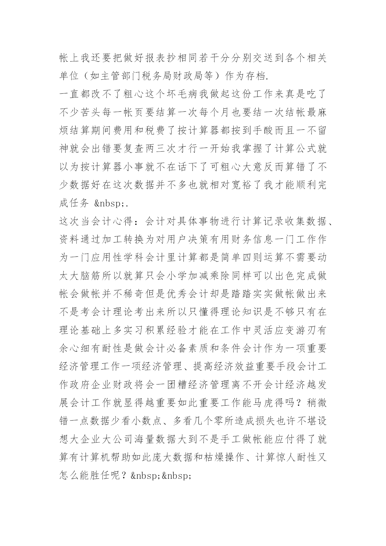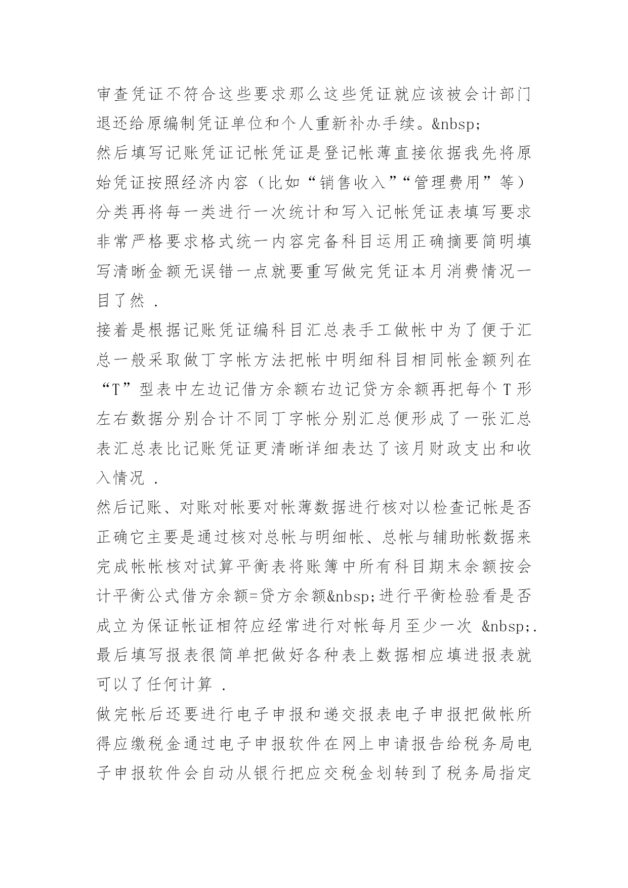 机械实结报告机械实结报告范文这次暑假我在机械厂当了回实习会计近月实习不仅让我掌握了手工做帐还学到了学校学不到会计知识更懂得了工作艰辛.当听我去机械厂实习会计时候妈妈又是惊奇又是高兴妈妈是一位有着几十年工作经验职业会计以前曾想让我继承她会计职业想把几十年宝贵经验悉数传授给我但是一贯都对会计不感兴趣我接受今天见我主动提出去实习会计当然是又惊又喜于是迫不及待给我上起了会计课当妈妈讲到也模糊地方干脆从几层高书柜里翻出当年会计书然后详细讲给我听大概是继了妈妈会计天赋又加上妈妈真传我似乎学得很快。 实习不久到机械厂结月帐时候了面对累积月单位发票我要做同职业会计一样在星期内手工把帐做好.手工做帐包括很多道工序:审核发票填写凭证制作汇总表记账对账填写报表为了把这些帐做好我按照妈妈教方法一一展开起来。 首先审核发票原来发票也叫原始凭证审核发票又分三步:首先审查所采用凭证格式是否符合规定凭证要素是否齐全是否有经办单位签章;其次审查凭证上经济业务是否真实、合法数字计算是否正确、完整大、小写是否一致;最后审查凭证上数字和文字有否涂改、污损和不符合规定更正如果通过审查凭证不符合这些要求那么这些凭证就应该被会计部门退还给原编制凭证单位和个人重新补办手续。 然后填写记账凭证记帐凭证是登记帐薄直接依据我先将原始凭证按照经济内容(比如“销售收入”“管理费用”等)分类再将每一类进行一次统计和写入记帐凭证表填写要求非常严格要求格式统一内容完备科目运用正确摘要简明填写清晰金额无误错一点就要重写做完凭证本月消费情况一目了然.接着是根据记账凭证编科目汇总表手工做帐中为了便于汇总一般采取做丁字帐方法把帐中明细科目相同帐金额列在“T”型表中左边记借方余额右边记贷方余额再把每个T形左右数据分别合计不同丁字帐分别汇总便形成了一张汇总表汇总表比记账凭证更清晰详细表达了该月财政支出和收入情况.然后记账、对账对帐要对帐薄数据进行核对以检查记帐是否正确它主要是通过核对总帐与明细帐、总帐与辅助帐数据来完成帐帐核对试算平衡表将账簿中所有科目期末余额按会计平衡公式借方余额=贷方余额 进行平衡检验看是否成立为保证帐证相符应经常进行对帐每月至少一次 .最后填写报表很简单把做好各种表上数据相应填进报表就可以了任何计算.做完帐后还要进行电子申报和递交报表电子申报把做帐所得应缴税金通过电子申报软件在网上申请报告给税务局电子申报软件会自动从银行把应交税金划转到了税务局指定帐上我还要把做好报表抄相同若干分分别交送到各个相关单位(如主管部门税务局财政局等)作为存档.一直都改不了粗心这个坏毛病我做起这份工作来真是吃了不少苦头每一帐页要结算一次每个月也要结一次结帐最麻烦结算期间费用和税费了按计算器都按到手酸而且一不留神就会出错要复查两三次才行一开始我掌握了计算公式就以为按计算器小事就不在话下了可粗心大意反而算错了不少数据好在这次数据并不多也就相对宽裕了我才能顺利完成任务 .这次当会计心得:会计对具体事物进行计算记录收集数据、资料通过加工转换为对用户决策有用财务信息一门工作作为一门应用性学科会计里计算都是简单四则运算不需要动太大脑筋所以就算只会小学加减乘除同样可以出色完成做帐会做帐并不稀奇但是优秀会计却是踏踏实实做帐做出来不是考会计理论考出来所以只懂得理论知识是不够只有在理论基础上多实习积累经验才能在工作中灵活应变游刃有余心细有耐性是做会计必备素质和条件会计作为一项重要经济管理工作一项经济管理、提高经济效益重要手段会计工作政府企业财政将会一团糟经济管理离不开会计经济越发展会计工作就显得越重要如此重要工作能马虎得吗?稍微错一点数据少看小数点、多看几个零所造成损失也许不堪设想大企业大公司海量数据大到不是手工做帐能应付得了就算有计算机帮助如此庞大数据和枯燥操作、计算惊人耐性又怎么能胜任呢? 其实不仅会计一门工作如此其他任何事情又何尝不是如此呢?在任何领域无论学习科研还是生活中琐事如能保持即心细又有耐性效果一定是事半功倍!