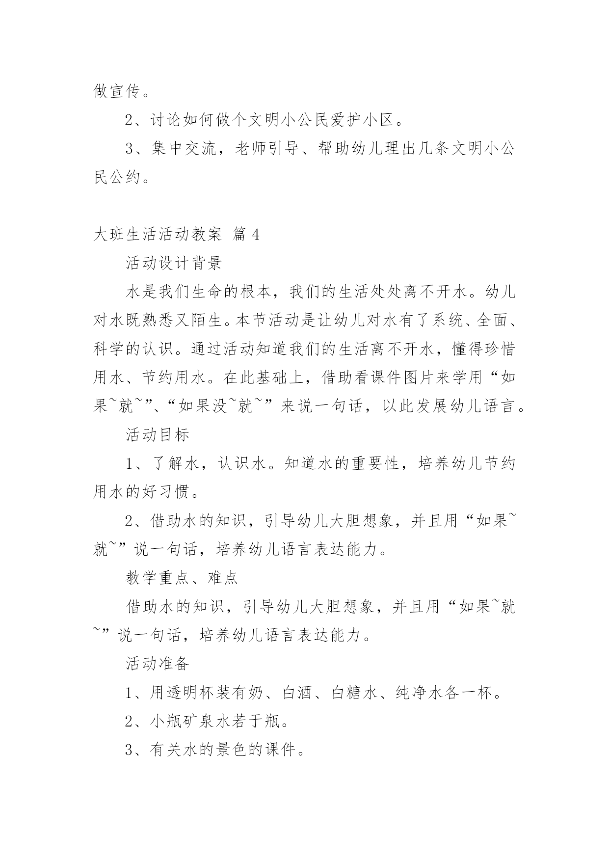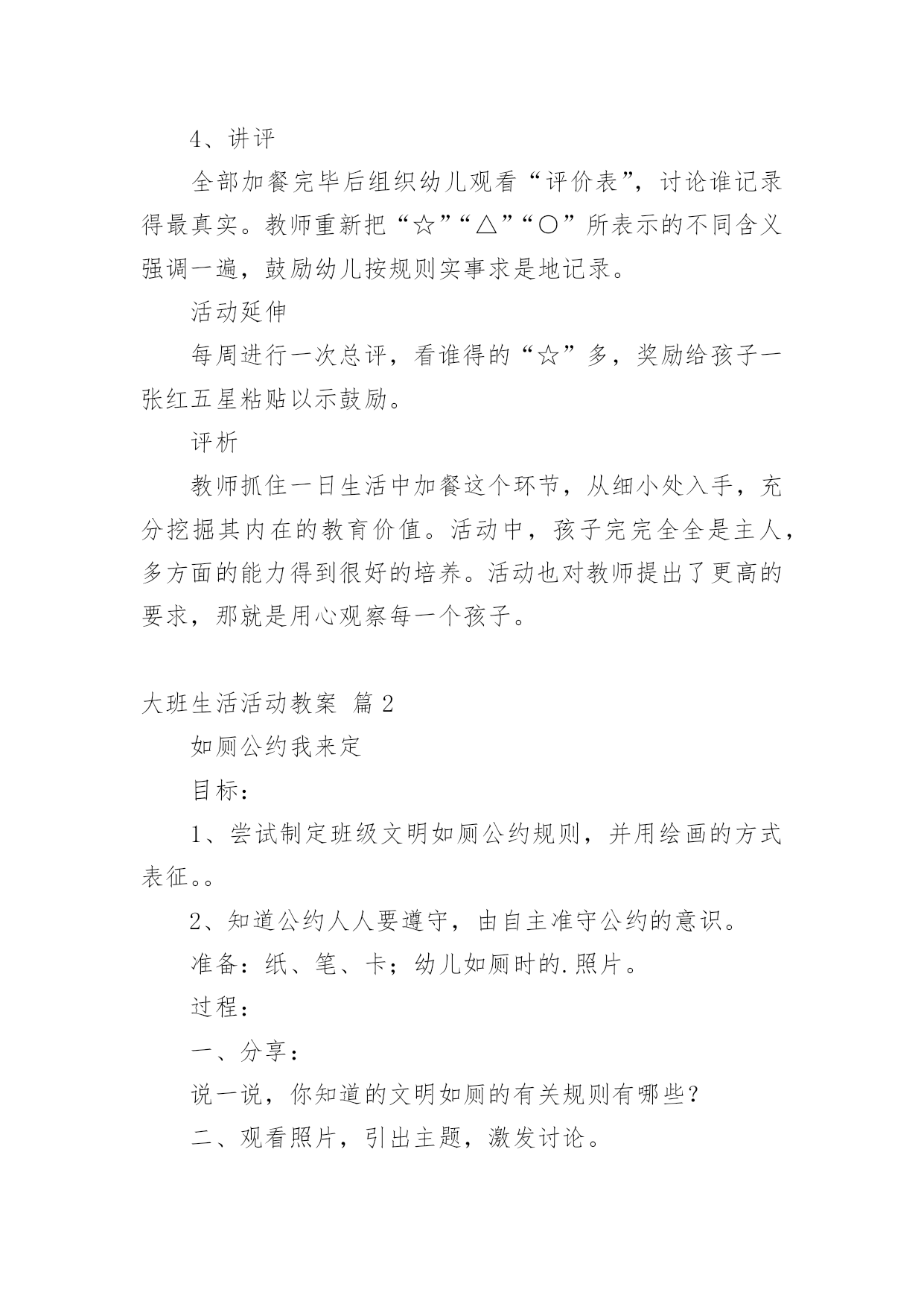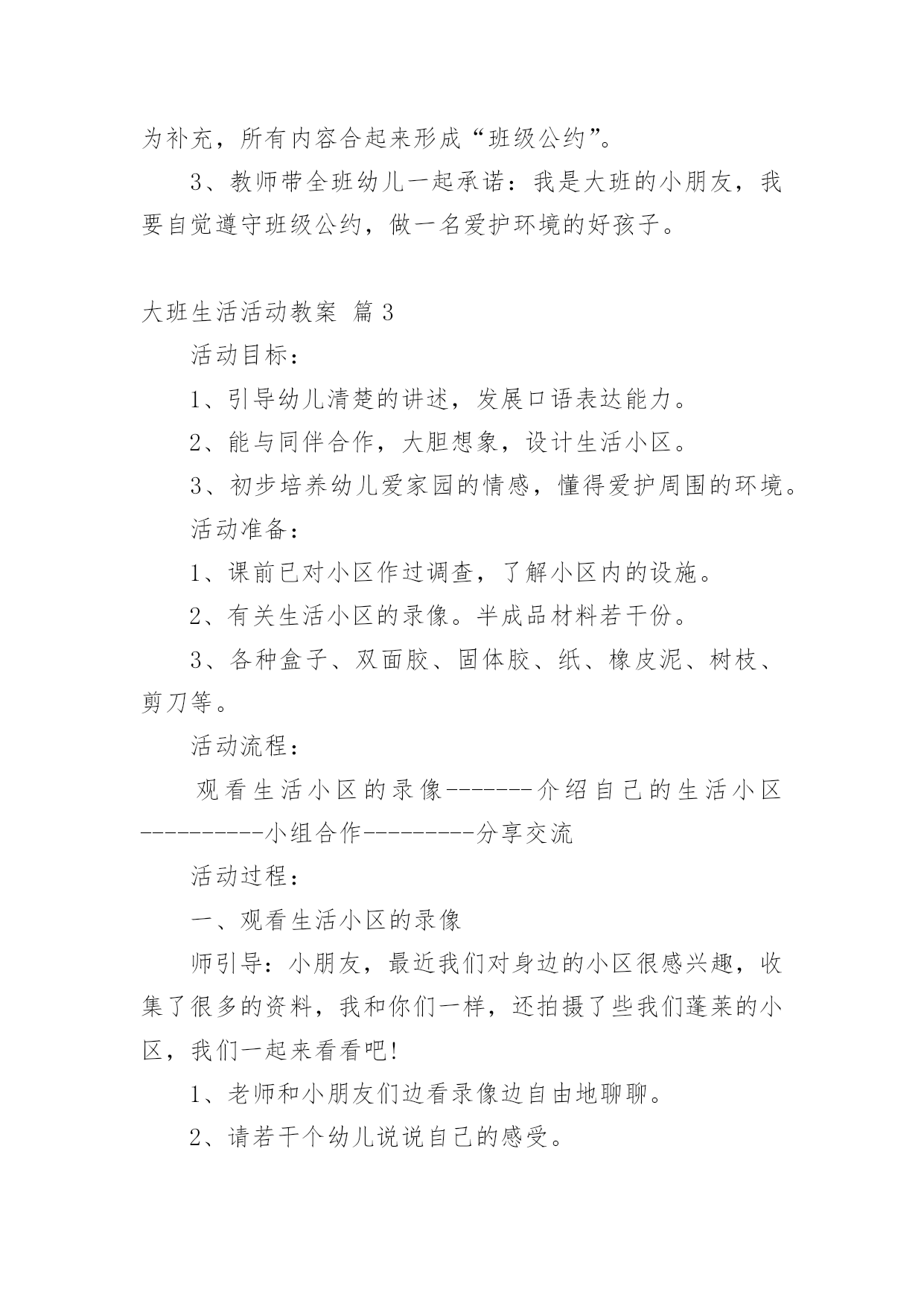 大班生活活动教案大班生活活动教案范文汇总7篇作为一位兢兢业业的人民教师,通常需要准备好一份教案,教案是保证教学取得成功、提高教学质量的基本条件。那么你有了解过教案吗?下面是小编为大家收集的大班生活活动教案8篇,欢迎大家借鉴与参考,希望对大家有所帮助。大班生活活动教案篇1设计意图随着幼教改革的不断深入,我们对《规程》的认识和理解有了一个质的转变,真正树立起“一日生活即课程”的教育观,将一日活动作为幼儿素质教育的主渠道,充分利用幼儿进餐、午睡等生活环境,设计游戏化的教育活动,科学地为幼儿的成长创造有利的条件,引导幼儿养成良好的生活习惯,在健康的生活中愉快、主动地发展。活动目标1、了解牛奶,豆奶及各种水果、点心的名称和营养,懂得它们对人体生长发育的重要性。2、学习评价记录自己的行为,培养初步的自我评价的能力。3、能细致观察,做事积极主动。活动准备加餐情况评价表若干张,辟一空间为加餐区(只能同时容纳8个孩子)。活动过程1、和幼儿一起讨论如何记录“加餐情况自我评价表”先让幼儿讨论,最后达成共识:(1)按时吃完,不掉渣渣,不挑食,能主动收拾餐具的用“☆”表示。(2)需要别人提醒,不主动,掉渣渣,但也能吃完的,用“△”表示。(3)挑食,不按时吃完的,用“○”表示。(4)自己的名字自己写,每天还要写上日期,画上加餐的食品,笔的颜色自己选。2、张贴表格(1)启发幼儿讨论表格应贴到哪儿,最后达成共识:将表贴到一面墙上,大家可随时观看。(2)幼儿贴表格,教师指导幼儿将表格贴平整。3、引导幼儿评价记录自己的加餐情况(1)分发加餐:教师协助值日生把加餐放在“加餐区”中。(2)值日生分别通知正在区角活动的'幼儿开始加餐。(3)孩子们陆续盥洗后加餐。(4)自己评价记录加餐情况,教师细心观察幼儿的记录是否和表现一致,指导幼儿正确评价记录。4、讲评全部加餐完毕后组织幼儿观看“评价表”,讨论谁记录得最真实。教师重新把“☆”“△”“○”所表示的不同含义强调一遍,鼓励幼儿按规则实事求是地记录。活动延伸每周进行一次总评,看谁得的“☆”多,奖励给孩子一张红五星粘贴以示鼓励。评析教师抓住一日生活中加餐这个环节,从细小处入手,充分挖掘其内在的教育价值。活动中,孩子完完全全是主人,多方面的能力得到很好的培养。活动也对教师提出了更高的要求,那就是用心观察每一个孩子。大班生活活动教案篇2如厕公约我来定目标:1、尝试制定班级文明如厕公约规则,并用绘画的方式表征。。2、知道公约人人要遵守,由自主准守公约的意识。准备:纸、笔、卡;幼儿如厕时的.照片。过程:一、分享:说一说,你知道的文明如厕的有关规则有哪些?二、观看照片,引出主题,激发讨论。(1)小朋友上厕所时不文明的行为有哪些?(2)屁股擦不干净是文明行为吗?(3)看到便池周围有尿液、大便时应该怎么做?三、自额上制定班级文明如厕公约,并引导幼儿记录公约内容:(1)如厕时文明的行为有哪些?同意制定这项公约吗?(2)不推人这一条怎么记?为什么这么记?谁愿意来试一试?(3)大小变大后整理衣服又怎么表示?(4)洗手后不要将水滴到地上又怎么表示?等。四、记录后,幼儿集体说一说公约内容。五、活动延伸完成如厕公约,制定保护环境宣传画,张贴在班中合适的地方。2、教师与与幼儿一起协商建立班级公约。(1)讨论:活动室哪些地方更要保持整洁?小朋友怎样做才能保持整洁?(2)幼儿分组绘画,逐条把公约画下来。教师引导幼儿协商分工,有人画,有人出主意等。(3)、教师帮助各组将制定的“班级公约”张贴到黑板上,每组请一名幼儿介绍,第一组介绍完后,其他组介绍时,如有与第一组内容重复的就画掉,内容不一样的就保留。(4)形成班级公约。教师与幼儿协商,以第一小组内容为主,其他组内容作为补充,所有内容合起来形成“班级公约”。3、教师带全班幼儿一起承诺:我是大班的小朋友,我要自觉遵守班级公约,做一名爱护环境的好孩子。大班生活活动教案篇3活动目标:1、引导幼儿清楚的讲述,发展口语表达能力。2、能与同伴合作,大胆想象,设计生活小区。3、初步培养幼儿爱家园的情感,懂得爱护周围的环境。活动准备:1、课前已对小区作过调查,了解小区内的设施。2、有关生活小区的录像。半成品材料若干份。3、各种盒子、双面胶、固体胶、纸、橡皮泥、树枝、剪刀等。活动流程:观看生活小区的录像-------介绍自己的生活小区----------小组合作---------分享交流活动过程:一、观看生活小区的录像师引导:小朋友,最近我们对身边的小区很感兴趣,收集了很多的资料,我和你们一样,还拍摄了些我们蓬莱的小区,我们一起来看看吧!1、老师和小朋友们边看录像边自由地聊聊。2、请若干个幼儿说说自己的感受。小结:我们蓬莱有这么多的小区,有老一些的小区,有新建的小区,蓬莱的变化真是越来越大了,也越来越美了,我知道你们也有自己