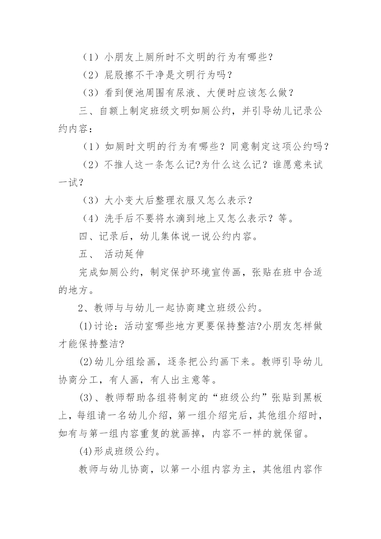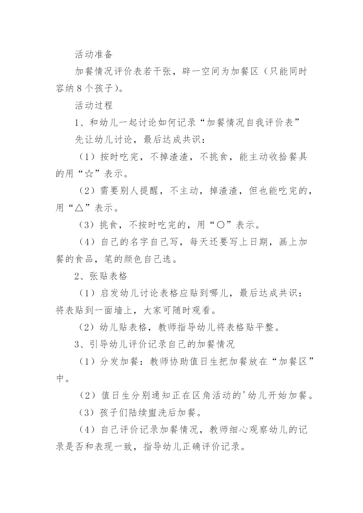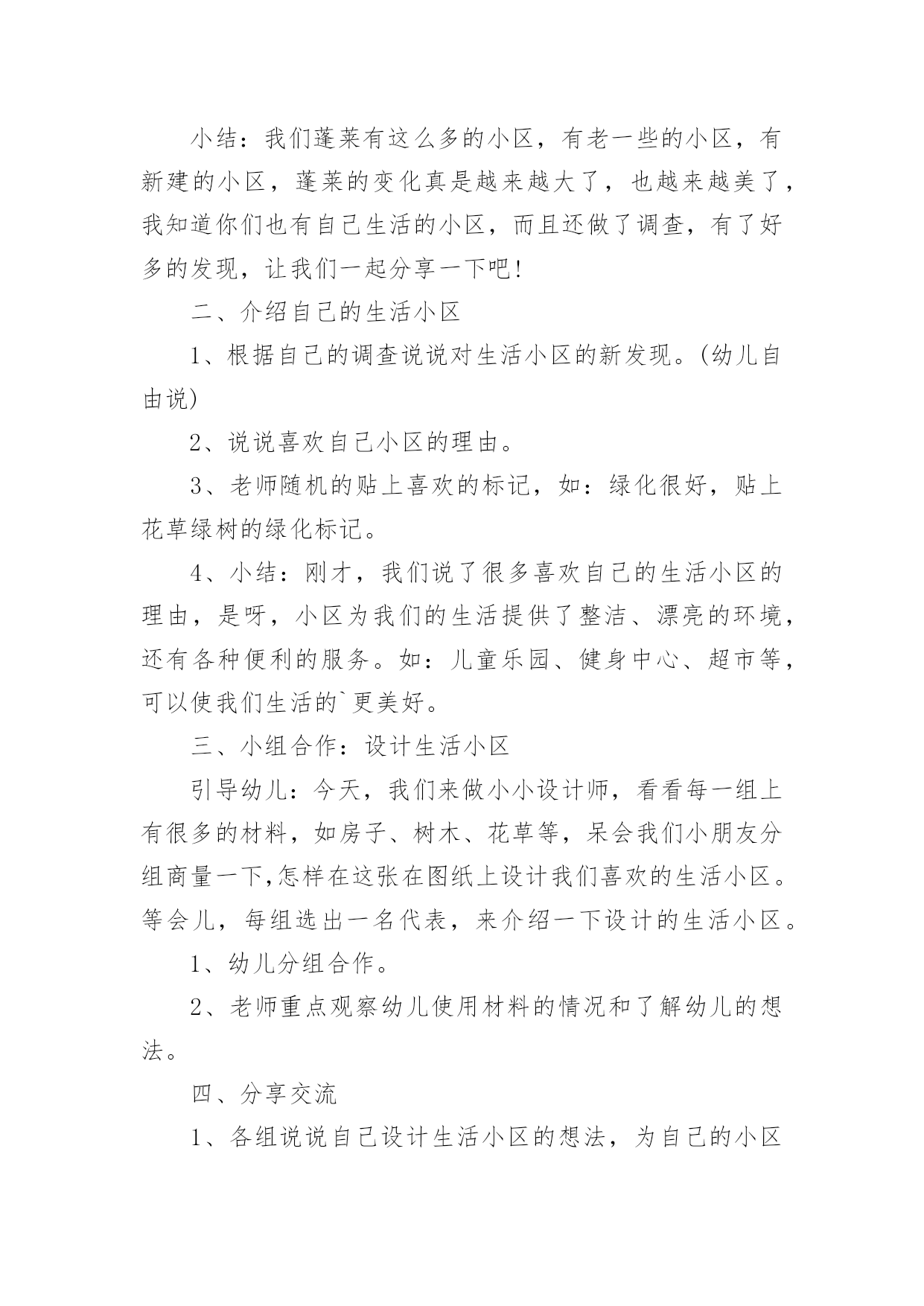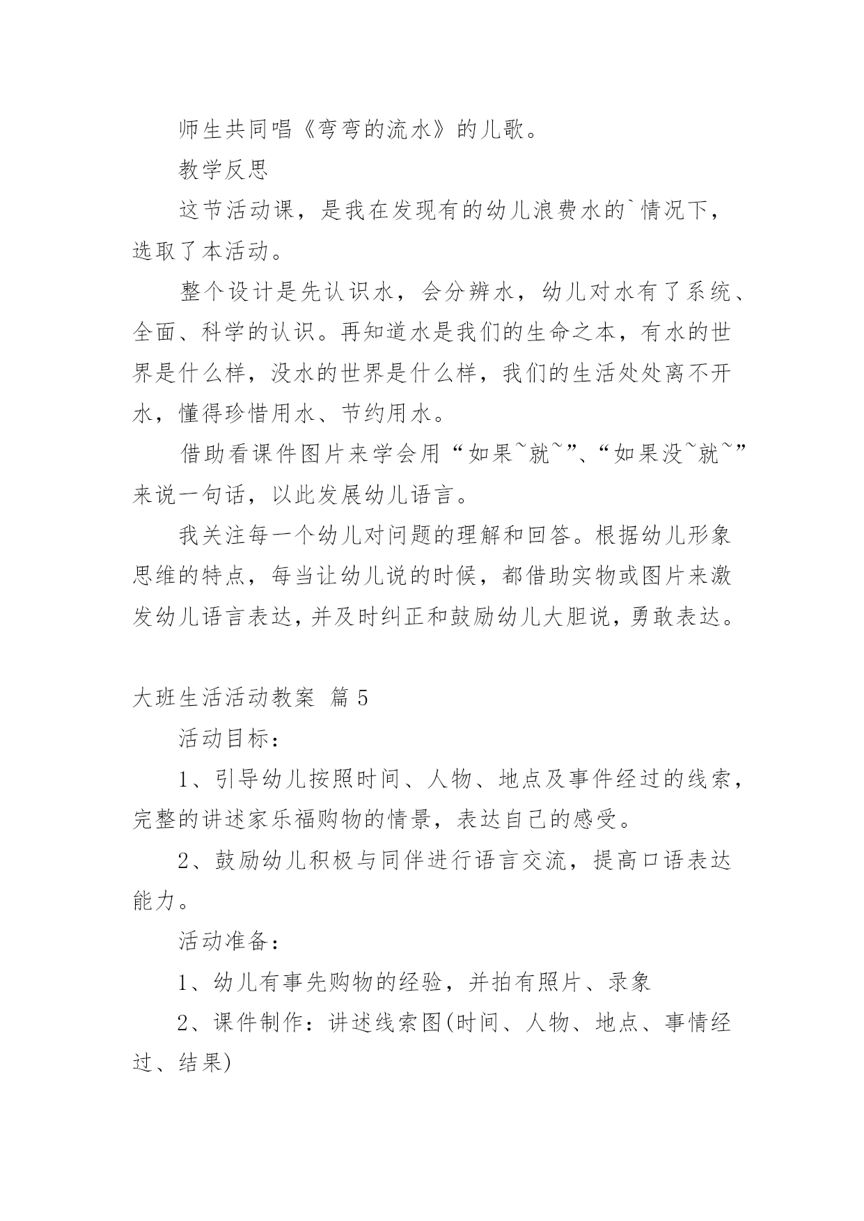 大班生活活动教案大班生活活动教案范文汇总7篇作为一位兢兢业业的人民教师,通常需要准备好一份教案,教案是保证教学取得成功、提高教学质量的基本条件。那么你有了解过教案吗?下面是小编为大家收集的大班生活活动教案8篇,欢迎大家借鉴与参考,希望对大家有所帮助。大班生活活动教案篇1设计意图随着幼教改革的不断深入,我们对《规程》的认识和理解有了一个质的转变,真正树立起“一日生活即课程”的教育观,将一日活动作为幼儿素质教育的主渠道,充分利用幼儿进餐、午睡等生活环境,设计游戏化的教育活动,科学地为幼儿的成长创造有利的条件,引导幼儿养成良好的生活习惯,在健康的生活中愉快、主动地发展。活动目标1、了解牛奶,豆奶及各种水果、点心的名称和营养,懂得它们对人体生长发育的重要性。2、学习评价记录自己的行为,培养初步的自我评价的能力。3、能细致观察,做事积极主动。活动准备加餐情况评价表若干张,辟一空间为加餐区(只能同时容纳8个孩子)。活动过程1、和幼儿一起讨论如何记录“加餐情况自我评价表”先让幼儿讨论,最后达成共识:(1)按时吃完,不掉渣渣,不挑食,能主动收拾餐具的用“☆”表示。(2)需要别人提醒,不主动,掉渣渣,但也能吃完的,用“△”表示。(3)挑食,不按时吃完的,用“○”表示。(4)自己的名字自己写,每天还要写上日期,画上加餐的食品,笔的颜色自己选。2、张贴表格(1)启发幼儿讨论表格应贴到哪儿,最后达成共识:将表贴到一面墙上,大家可随时观看。(2)幼儿贴表格,教师指导幼儿将表格贴平整。3、引导幼儿评价记录自己的加餐情况(1)分发加餐:教师协助值日生把加餐放在“加餐区”中。(2)值日生分别通知正在区角活动的'幼儿开始加餐。(3)孩子们陆续盥洗后加餐。(4)自己评价记录加餐情况,教师细心观察幼儿的记录是否和表现一致,指导幼儿正确评价记录。4、讲评全部加餐完毕后组织幼儿观看“评价表”,讨论谁记录得最真实。教师重新把“☆”“△”“○”所表示的不同含义强调一遍,鼓励幼儿按规则实事求是地记录。活动延伸每周进行一次总评,看谁得的“☆”多,奖励给孩子一张红五星粘贴以示鼓励。评析教师抓住一日生活中加餐这个环节,从细小处入手,充分挖掘其内在的教育价值。活动中,孩子完完全全是主人,多方面的能力得到很好的培养。活动也对教师提出了更高的要求,那就是用心观察每一个孩子。大班生活活动教案篇2如厕公约我来定目标:1、尝试制定班级文明如厕公约规则,并用绘画的方式表征。。2、知道公约人人要遵守,由自主准守公约的意识。准备:纸、笔、卡;幼儿如厕时的.照片。过程:一、分享:说一说,你知道的文明如厕的有关规则有哪些?二、观看照片,引出主题,激发讨论。(1)小朋友上厕所时不文明的行为有哪些?(2)屁股擦不干净是文明行为吗?(3)看到便池周围有尿液、大便时应该怎么做?三、自额上制定班级文明如厕公约,并引导幼儿记录公约内容:(1)如厕时文明的行为有哪些?同意制定这项公约吗?(2)不推人这一条怎么记?为什么这么记?谁愿意来试一试?(3)大小变大后整理衣服又怎么表示?(4)洗手后不要将水滴到地上又怎么表示?等。四、记录后,幼儿集体说一说公约内容。五、活动延伸完成如厕公约,制定保护环境宣传画,张贴在班中合适的地方。2、教师与与幼儿一起协商建立班级公约。(1)讨论:活动室哪些地方更要保持整洁?小朋友怎样做才能保持整洁?(2)幼儿分组绘画,逐条把公约画下来。教师引导幼儿协商分工,有人画,有人出主意等。(3)、教师帮助各组将制定的“班级公约”张贴到黑板上,每组请一名幼儿介绍,第一组介绍完后,其他组介绍时,如有与第一组内容重复的就画掉,内容不一样的就保留。(4)形成班级公约。教师与幼儿协商,以第一小组内容为主,其他组内容作为补充,所有内容合起来形成“班级公约”。3、教师带全班幼儿一起承诺:我是大班的小朋友,我要自觉遵守班级公约,做一名爱护环境的好孩子。大班生活活动教案篇3活动目标:1、引导幼儿清楚的讲述,发展口语表达能力。2、能与同伴合作,大胆想象,设计生活小区。3、初步培养幼儿爱家园的情感,懂得爱护周围的环境。活动准备:1、课前已对小区作过调查,了解小区内的设施。2、有关生活小区的录像。半成品材料若干份。3、各种盒子、双面胶、固体胶、纸、橡皮泥、树枝、剪刀等。活动流程:观看生活小区的录像-------介绍自己的生活小区----------小组合作---------分享交流活动过程:一、观看生活小区的录像师引导:小朋友,最近我们对身边的小区很感兴趣,收集了很多的资料,我和你们一样,还拍摄了些我们蓬莱的小区,我们一起来看看吧!1、老师和小朋友们边看录像边自由地聊聊。2、请若干个幼儿说说自己的感受。小结:我们蓬莱有这么多的小区,有老一些的小区,有新建的小区,蓬莱的变化真是越来越大了,也越来越美了,我知道你们也有自己