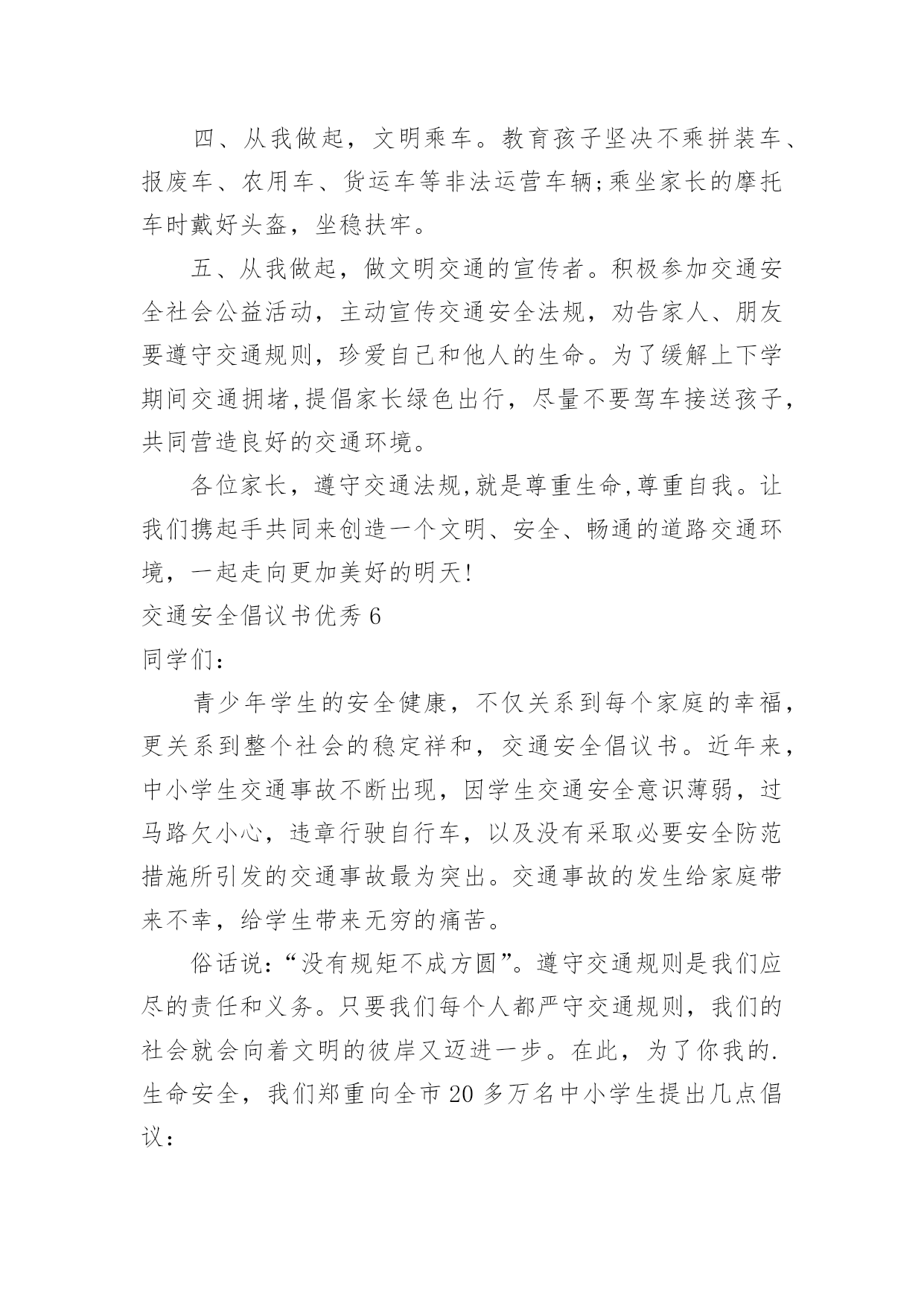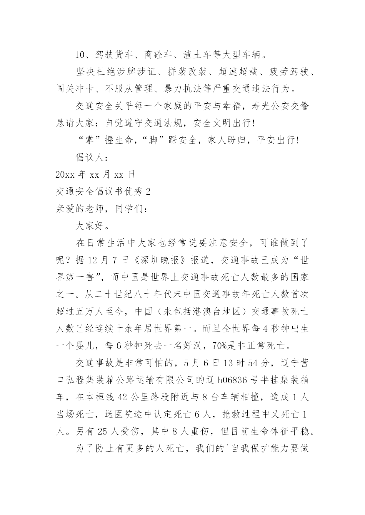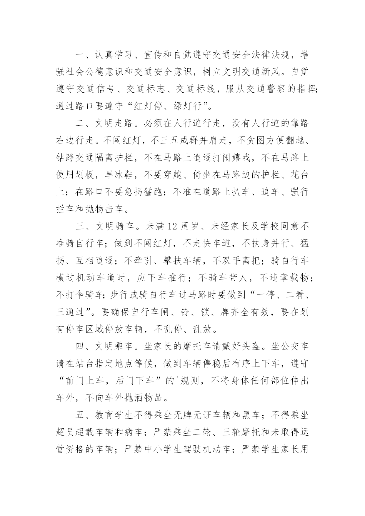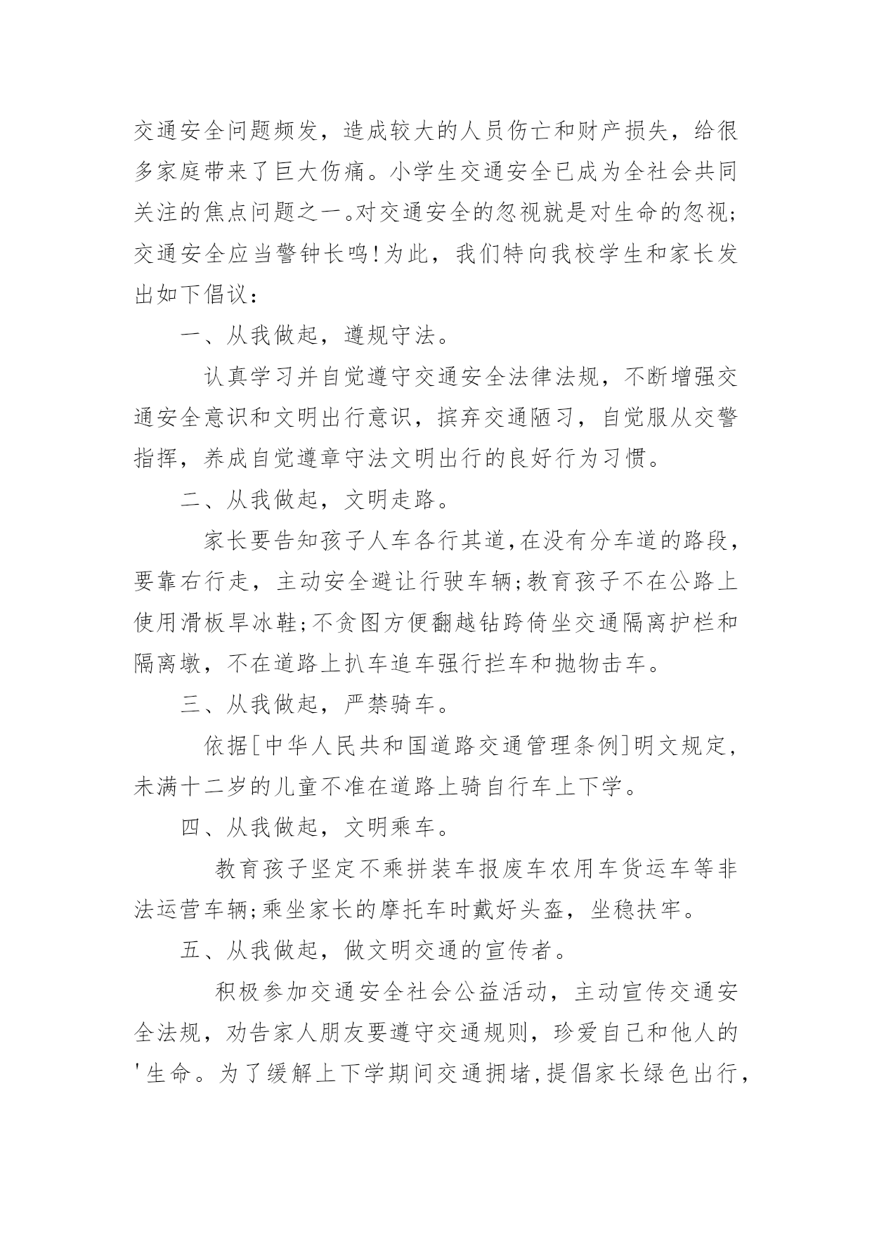 交通安全倡议书优秀交通安全倡议书优秀现如今,倡议书在我们的视野里出现的频率越来越高,倡议书具有响应者不确定性的特征。你所见过的倡议书是什么样的呢?以下是小编精心整理的交通安全倡议书优秀,希望能够帮助到大家。交通安全倡议书优秀1广大市民朋友们:你们好,今年以来,我市共发生涉及电动车、自行车、摩托车的死亡交通事故占死亡事故总数的51.5%,其中60岁以上死亡事故占总数的39.2%;为了您和他人的生命安全,寿光公安交警真诚发出如下倡议:1、行人过马路时,要走人行横道,左右环顾确保安全再通过,千万不要在车辆临近时突然横穿马路。2、成年人驾驶电动车、自行车最多载一人;驾驶其他车辆按照核定人数载人。坚决杜绝拼车超员接送学生。3、自行车、电动车应在非机动车道行驶,且速度不要超过每小时15公里。60岁以上老人尽量减少驾驶自行车、电动车等各种车辆。路上通行坚决不能闯红灯、逆行、乱穿马路。4、驾驶电动车、摩托车上路都要戴安全头盔,关键时刻能救人一命。驾乘自行车上路之前,应检查自行车刹车系统等安全设施是否正常,横过公路应下车推行,左看右看确保安全再通行,路上行走转弯前应当减速慢行,伸手示意,不得突然猛拐。5、拐弯的`机动车、非机动车应当让直行的车辆、行人优先通行。一旦发生交通事故,交警也会按此划分责任。6、千万不要酒后驾驶各种车辆,头脑再清醒,手脚也不一定听指挥。即使侥幸未发生事故,一旦被查获将会受到法律制裁,醉酒驾驶,三代亲人受害,得不偿失。7、坚决不驾乘农用车、载货车、拖拉机、报废车和无牌、无证、无保险的“三无”车辆超员载人或者接送学生。8、不购买乘坐“老年代步车”、“城市内燃观光车”,目前,这两种车辆不符合国家法规要求,不能办理牌证,不准上路行驶。按法律规定:无牌、无证驾驶此类车辆,将视情节轻重处以200至20__元罚款,直至拘留处罚。出了事故还要承担相应赔偿责任。9、驾驶农村面包坚决不能超员、超载、超速,此类车底盘高,质量轻,农村有些路段路况不是很好,车辆在超载超速行驶时,极易导致发生事故。10、驾驶货车、商砼车、渣土车等大型车辆。坚决杜绝涉牌涉证、拼装改装、超速超载、疲劳驾驶、闯关冲卡、不服从管理、暴力抗法等严重交通违法行为。交通安全关乎每一个家庭的平安与幸福,寿光公安交警恳请大家:自觉遵守交通法规,安全文明出行!“掌”握生命,“脚”踩安全,家人盼归,平安出行!倡议人:20xx年xx月xx日交通安全倡议书优秀2亲爱的老师,同学们:大家好。在日常生活中大家也经常说要注意安全,可谁做到了呢?据12月7日《深圳晚报》报道,交通事故已成为“世界第一害”,而中国是世界上交通事故死亡人数最多的国家之一。从二十世纪八十年代末中国交通事故年死亡人数首次超过五万人至今,中国(未包括港澳台地区)交通事故死亡人数已经连续十余年居世界第一。而且全世界每4秒钟出生一个婴儿,每6秒钟死去一名好汉,70%是非正常死亡。交通事故是非常可怕的,5月6日13时54分,辽宁营口弘程集装箱公路运输有限公司的辽h06836号半挂集装箱车,在本桓线42公里路段附近与8台车辆相撞,造成1人当场死亡,送医院途中认定死亡6人,抢救过程中又死亡1人。另有25人受伤,其中8人重伤,但目前生命体征平稳。为了防止有更多的人死亡,我们的'自我保护能力要做到以下几点:1、自觉遵守交通规则的确很普遍,但能做到的人很少;2、过马路要走斑马线;3、过马路不能拥撞。提倡交通安全法规,增强自我保护意识,让中国更加美好!谢谢大家!倡议人:xxx20xx年xx月xx日交通安全倡议书优秀3交通安全,人人有责。随着社会不断发展,汽车、电瓶车走进了千家万户,随之交通事故也与日俱增,许多家庭因交通事故家破人亡;要想做到不被交通事故牵扰和降低事故的发生,我们应该怎么办呢?下面我将自己的观点做一下阐述:一、首先就是要加大宣传力度;政府的宣传不应只停留是电视和报纸上,由于网络的发展,现在每天看新闻和报纸的人已经不多,大家都在低头看手机和玩游戏;政府为什么就不能开发一个关于交通安全知识有奖问答软件的APP,用户可以在任何地方任何事件进行查阅和回答问题,对回答合格者给予移动话费或者保险积分兑换现金等形式的.奖励,这样就可以激发全民学习交通安全知识的高潮。二、通过对社区、村组、工厂、学校发放交通安全知识有奖问答试卷有条件的办理相关知识培训班,对任何参与学习和提交有奖问答试卷的人员给予发放印有交通安全宣传图片或者标语的日常生活器具,此方案是用物质奖励,激发市民学习高潮。三、建议在小学设置交通安全监督员制度,每一个学生为交通安全监督员。政府统一印制交通宣传知识问卷,由学校实施每月发放一次形式,进行家庭交通安全知识问答活动,具体有小朋友和家长一起参与共同做题,由板主任负责批阅,对满分的学生进行学分奖励制。起目的是让小朋友从小参与并学习