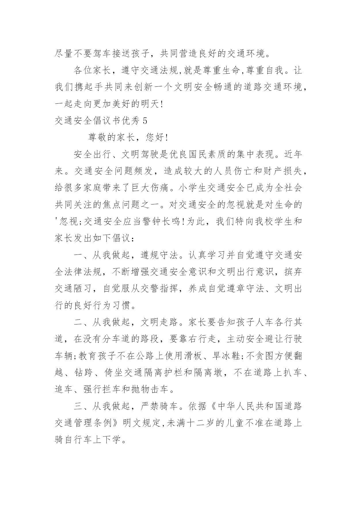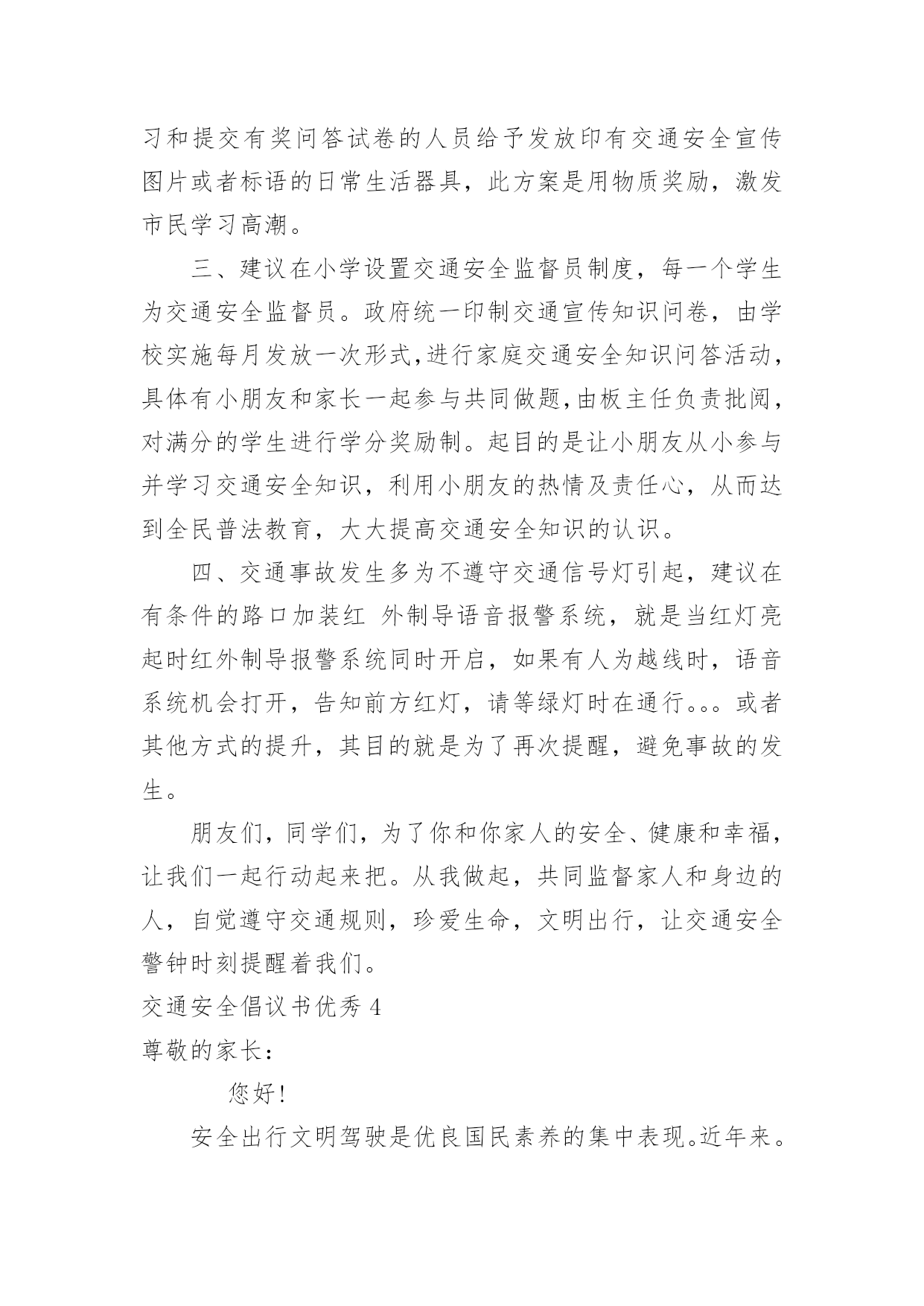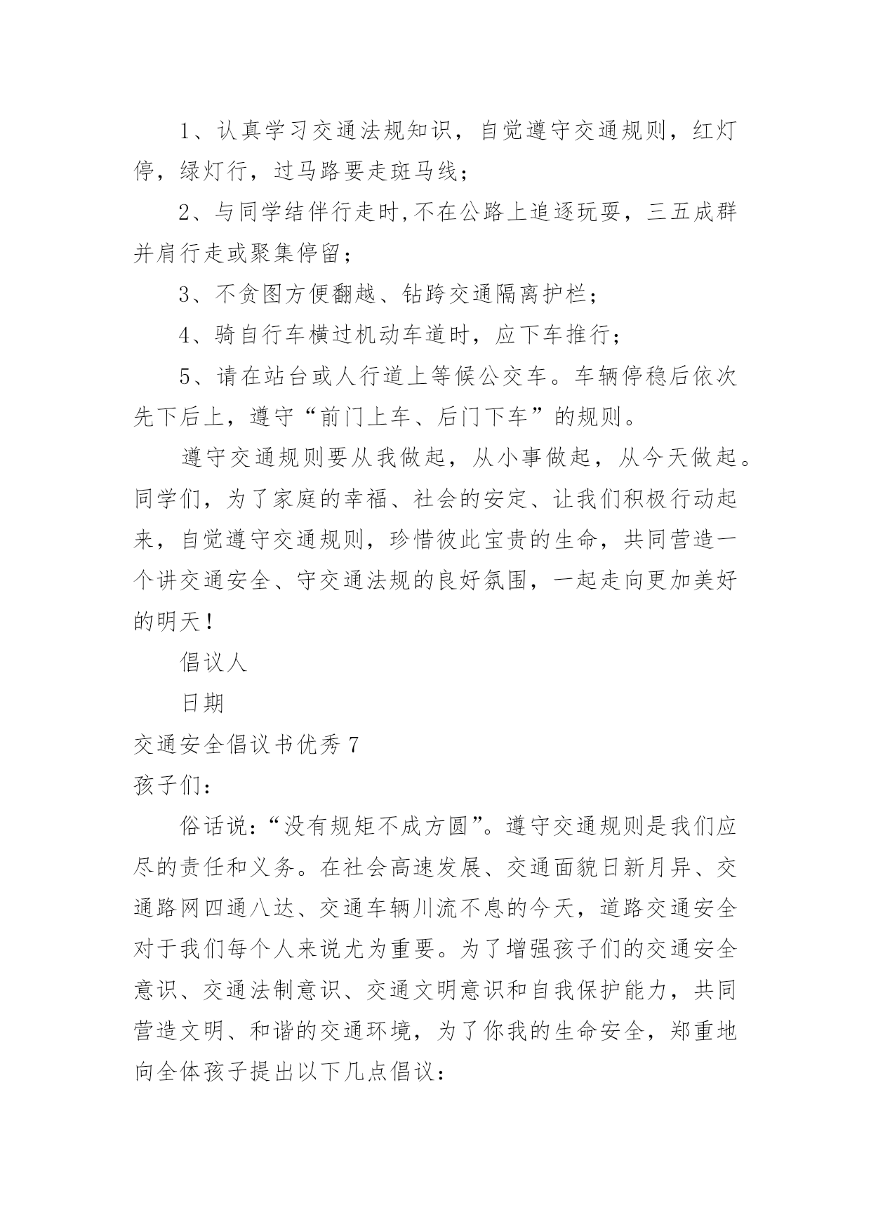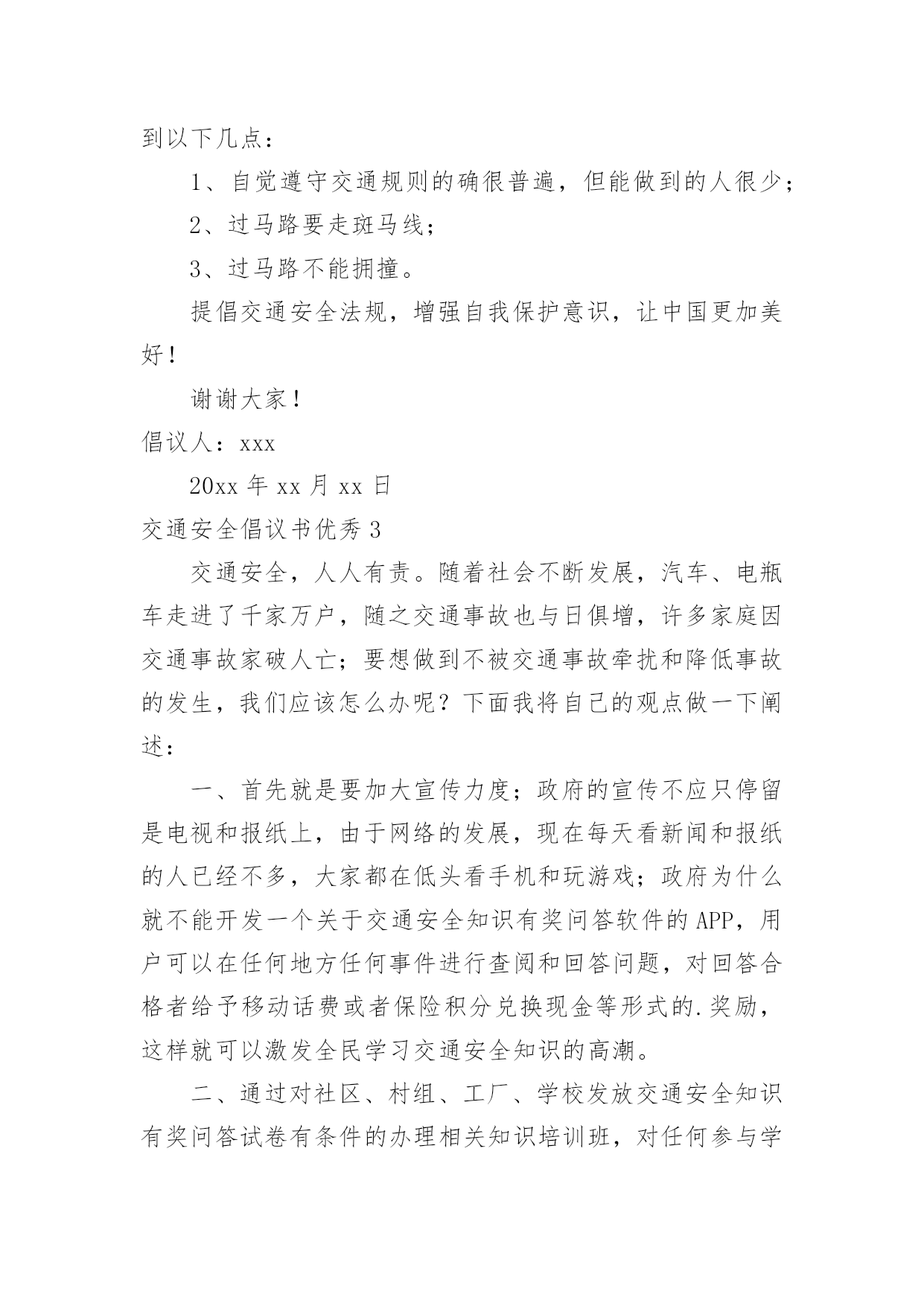 交通安全倡议书优秀交通安全倡议书优秀现如今,倡议书在我们的视野里出现的频率越来越高,倡议书具有响应者不确定性的特征。你所见过的倡议书是什么样的呢?以下是小编精心整理的交通安全倡议书优秀,希望能够帮助到大家。交通安全倡议书优秀1广大市民朋友们:你们好,今年以来,我市共发生涉及电动车、自行车、摩托车的死亡交通事故占死亡事故总数的51.5%,其中60岁以上死亡事故占总数的39.2%;为了您和他人的生命安全,寿光公安交警真诚发出如下倡议:1、行人过马路时,要走人行横道,左右环顾确保安全再通过,千万不要在车辆临近时突然横穿马路。2、成年人驾驶电动车、自行车最多载一人;驾驶其他车辆按照核定人数载人。坚决杜绝拼车超员接送学生。3、自行车、电动车应在非机动车道行驶,且速度不要超过每小时15公里。60岁以上老人尽量减少驾驶自行车、电动车等各种车辆。路上通行坚决不能闯红灯、逆行、乱穿马路。4、驾驶电动车、摩托车上路都要戴安全头盔,关键时刻能救人一命。驾乘自行车上路之前,应检查自行车刹车系统等安全设施是否正常,横过公路应下车推行,左看右看确保安全再通行,路上行走转弯前应当减速慢行,伸手示意,不得突然猛拐。5、拐弯的`机动车、非机动车应当让直行的车辆、行人优先通行。一旦发生交通事故,交警也会按此划分责任。6、千万不要酒后驾驶各种车辆,头脑再清醒,手脚也不一定听指挥。即使侥幸未发生事故,一旦被查获将会受到法律制裁,醉酒驾驶,三代亲人受害,得不偿失。7、坚决不驾乘农用车、载货车、拖拉机、报废车和无牌、无证、无保险的“三无”车辆超员载人或者接送学生。8、不购买乘坐“老年代步车”、“城市内燃观光车”,目前,这两种车辆不符合国家法规要求,不能办理牌证,不准上路行驶。按法律规定:无牌、无证驾驶此类车辆,将视情节轻重处以200至20__元罚款,直至拘留处罚。出了事故还要承担相应赔偿责任。9、驾驶农村面包坚决不能超员、超载、超速,此类车底盘高,质量轻,农村有些路段路况不是很好,车辆在超载超速行驶时,极易导致发生事故。10、驾驶货车、商砼车、渣土车等大型车辆。坚决杜绝涉牌涉证、拼装改装、超速超载、疲劳驾驶、闯关冲卡、不服从管理、暴力抗法等严重交通违法行为。交通安全关乎每一个家庭的平安与幸福,寿光公安交警恳请大家:自觉遵守交通法规,安全文明出行!“掌”握生命,“脚”踩安全,家人盼归,平安出行!倡议人:20xx年xx月xx日交通安全倡议书优秀2亲爱的老师,同学们:大家好。在日常生活中大家也经常说要注意安全,可谁做到了呢?据12月7日《深圳晚报》报道,交通事故已成为“世界第一害”,而中国是世界上交通事故死亡人数最多的国家之一。从二十世纪八十年代末中国交通事故年死亡人数首次超过五万人至今,中国(未包括港澳台地区)交通事故死亡人数已经连续十余年居世界第一。而且全世界每4秒钟出生一个婴儿,每6秒钟死去一名好汉,70%是非正常死亡。交通事故是非常可怕的,5月6日13时54分,辽宁营口弘程集装箱公路运输有限公司的辽h06836号半挂集装箱车,在本桓线42公里路段附近与8台车辆相撞,造成1人当场死亡,送医院途中认定死亡6人,抢救过程中又死亡1人。另有25人受伤,其中8人重伤,但目前生命体征平稳。为了防止有更多的人死亡,我们的'自我保护能力要做到以下几点:1、自觉遵守交通规则的确很普遍,但能做到的人很少;2、过马路要走斑马线;3、过马路不能拥撞。提倡交通安全法规,增强自我保护意识,让中国更加美好!谢谢大家!倡议人:xxx20xx年xx月xx日交通安全倡议书优秀3交通安全,人人有责。随着社会不断发展,汽车、电瓶车走进了千家万户,随之交通事故也与日俱增,许多家庭因交通事故家破人亡;要想做到不被交通事故牵扰和降低事故的发生,我们应该怎么办呢?下面我将自己的观点做一下阐述:一、首先就是要加大宣传力度;政府的宣传不应只停留是电视和报纸上,由于网络的发展,现在每天看新闻和报纸的人已经不多,大家都在低头看手机和玩游戏;政府为什么就不能开发一个关于交通安全知识有奖问答软件的APP,用户可以在任何地方任何事件进行查阅和回答问题,对回答合格者给予移动话费或者保险积分兑换现金等形式的.奖励,这样就可以激发全民学习交通安全知识的高潮。二、通过对社区、村组、工厂、学校发放交通安全知识有奖问答试卷有条件的办理相关知识培训班,对任何参与学习和提交有奖问答试卷的人员给予发放印有交通安全宣传图片或者标语的日常生活器具,此方案是用物质奖励,激发市民学习高潮。三、建议在小学设置交通安全监督员制度,每一个学生为交通安全监督员。政府统一印制交通宣传知识问卷,由学校实施每月发放一次形式,进行家庭交通安全知识问答活动,具体有小朋友和家长一起参与共同做题,由板主任负责批阅,对满分的学生进行学分奖励制。起目的是让小朋友从小参与并学习