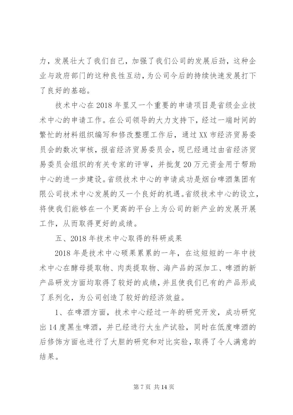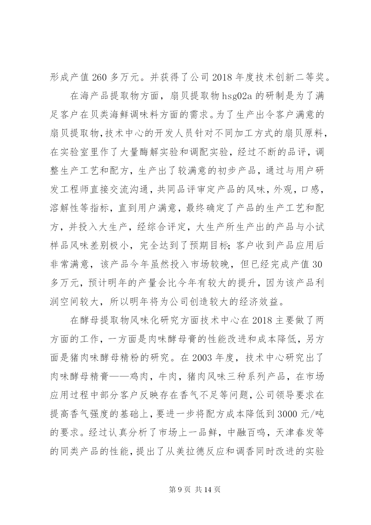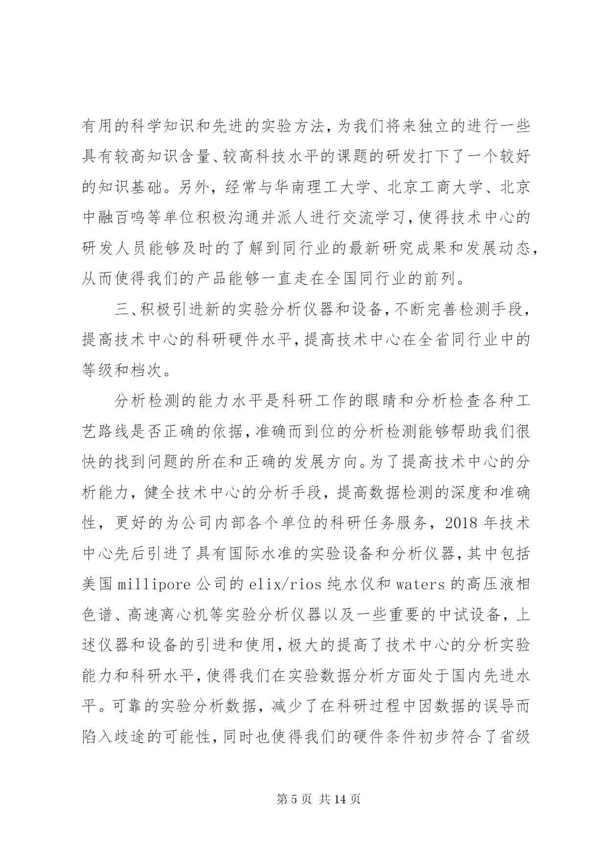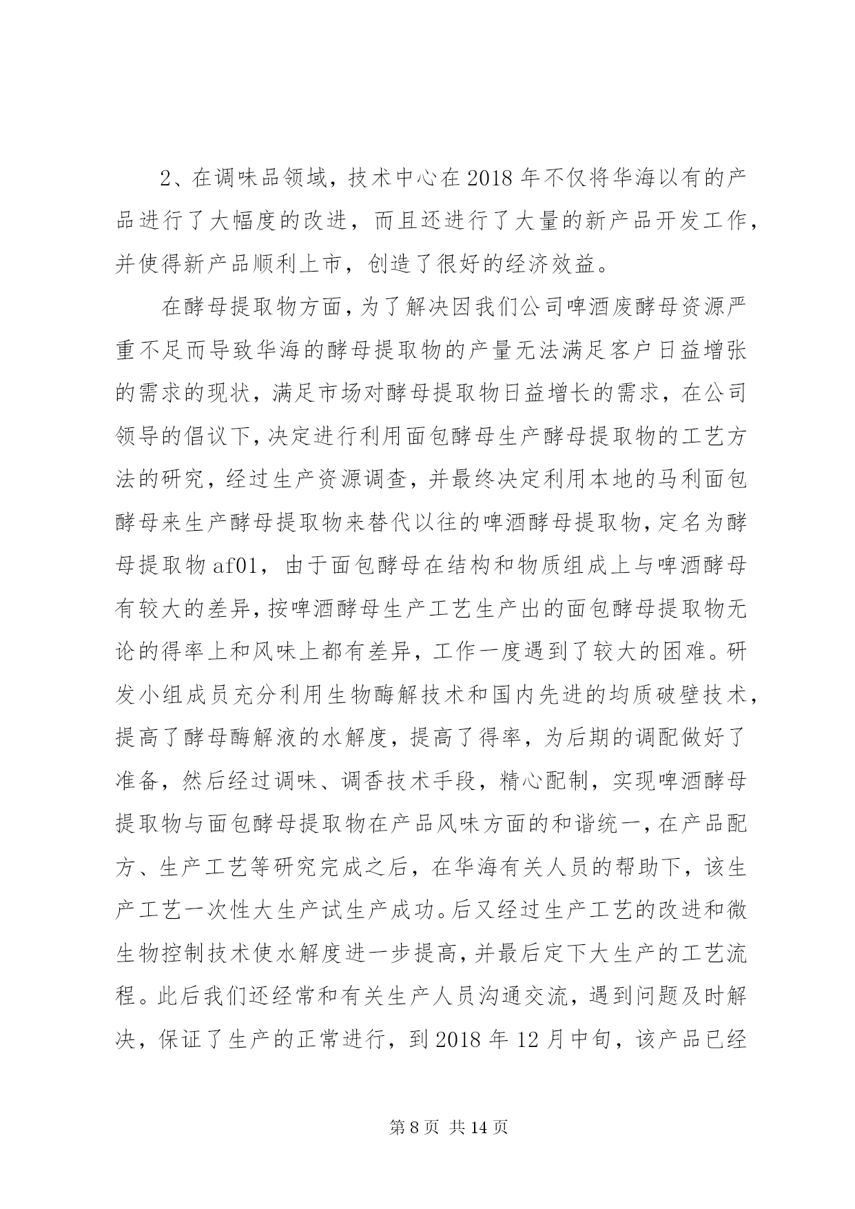 第PAGE\*Arabic\*MERGEFORMAT14页共NUMPAGES\*MERGEFORMAT14页公司技术中心工作总结2018年是技术中心成立以来成果显著的一年,也是较为繁忙、变化较大的一年。在这即将过去的一年里,技术中心全体员工在公司领导们的亲切关怀和指导下,进一步完善了自己内部的管理机制、科研能力和实验手段,同时全面的提高了技术中心科研人员与市场的对接能力,从而使得科研开发与市场的需求能够更好的结合在一起。经过技术中心全体人员的共同努力,全面完成了公司领导安排的各项科研任务,取得了较好的成绩。在2018年里,技术中心在酵母提取物的改进和深加工方面,在海产品提取物的研发及市场开拓方面以及啤酒新品种的研究方面均取得了较好的成绩。其中,在2018年研发成功的酵母提取物新品种af01、扇贝提取物—扇贝精粉和肉味浸膏等目前已经深受市场的欢迎,仅这三个新品种今年的销售额有望突破500万元。同时,经技术中新研究开发的14度黑生啤酒也即将投入市场销售。这些新产品的研究成功,使得技术中心为集团公司在啤酒行业和高新产品和技术领域的全面发展作出了自己的贡献。回顾即将过去的2018年,我们为我们在工作当中所取得的成就而感到欣慰,同时也为我们在工作上的一些不足而着急,为了我们今后能够更好的开展工作,并在工作中更好的发挥我们的长处,改正我们的不足之处,以便在2019年里为集团公司在新的发展领域里能够更好更快的发展,使公司拥有更好的经济效益和发展前景,现将技术中心2018年度的工作做如下的总结;一、进一步完善科研管理制度,加快科研速度,提高效率。在2018年里技术中心在抓管理制度上下了大力气,进一步完善了部门内部的科研管理程序和工作考核制度,使其既与公司的管理规范相符合,又具有与科研部门的特有情况相适应,使得在科研过程中各个科研人员和科研小组之间既分工明确又能够充分的相互协调合作,从而提高工作效率和课题的研发速度,从管理上和制度上保证技术中心的日常工作能够有条不紊的展开,使得技术中心能够快速的发展壮大。具体的工作从以下几个方面展开;1.持续的积极实施并严格执行公司目前推行的月初工作有计划,月末按计划进行工作总结考核的岗位考核管理制度,并将其作为技术中心当月统领全局的纲领性文件去执行。每个人月末要对自己这一个月的工作对照原工作计划做出总结,如有变动应有明确的注解和说明,然后交由部门领导审查确定,以便明确每个人的工作的完成情况是否与技术中心整体的工作进度相吻合,如有不符之处将作出相应的调整。同时每个人都须对自己下个月的工作制定详尽的计划,该计划应与部门的整体工作打算相一致,并交由部门领导审批后认真按计划执行。这样可以明确自己的工作内容和工作方向,使得技术中心的所有工作人员紧紧围绕在技术中心的工作主线周围,使得大家目标明确,有劲向一块使,避免日常工作的盲目性和随意性,从而大大提高了工作效率。2.实施按科研项目划分不同的科研小组,各个科研小组各自责任明确,有利于加快课题的研究开发进度。同时积极推行周工作计划管理办法和周例会制度,以便更好的进行任务细分以及各个课题组之间的交流与沟通。为了更好的使用人力资源,使得诸多的科研项目能够较好的同时全面展开,技术中心在部门内部以科研人员的各自技术特长划分了不同的科研课题组,这样大家各司其职,目标明确,并相互协调,使得技术中心的各项工作能够协调的快速展开。同时,为了更好的执行月工作计划,使每日的工作安排更具体细致。在技术中心内部实施了周工作计划管理办法,这样使每一人的工作安排时间更短、更具体、更具有可操作性,从而有利于开发工作的督促检查和研究开发工作进度的控制,使得工作能够进可量的向前赶,有利于提前完成公司和客户徼给科研开发任务。另外,为了更好的加强各研发小组之间以及研发小组内部的相互交流,认真执行每周一一次的周五例会制度,交流各个科研小组的本周的工作情况,及时汇报工作进展以及在工作中取得的经验和遇到的困难,以便于大家一起协商解决。同时各个小组相互通报各自的下周具工作体安排情况,以便于大家在工作上相互协调,彼此配合,从而加快研究进度,提高工作效率。4.严格实验设备和分析仪器的管理,加大大型实验分析仪器操作人员的培训力度,确保分析人员能够进行熟练的操作和进行简单的设备维护。技术中心拥有公司最好、最精密实验分析仪器和设备,这些设备不但结构复杂,操作精密烦琐,而且价格昂贵,需要精心操作和维护保养,为了保证操作人员能够熟练的进行操作和设备维护,进而保证操作人员的安全和仪器设备的准确性及设备完好率,在2018年里进一步加大了对设备操作人员的培训力度,同时将各个设备责任落实到人,大型的精密仪器和设备由专人进行操作就、和维护保养,严禁不熟悉的人员进行盲目操作,并编写了详细而具体的设备仪器操作规程,严格执