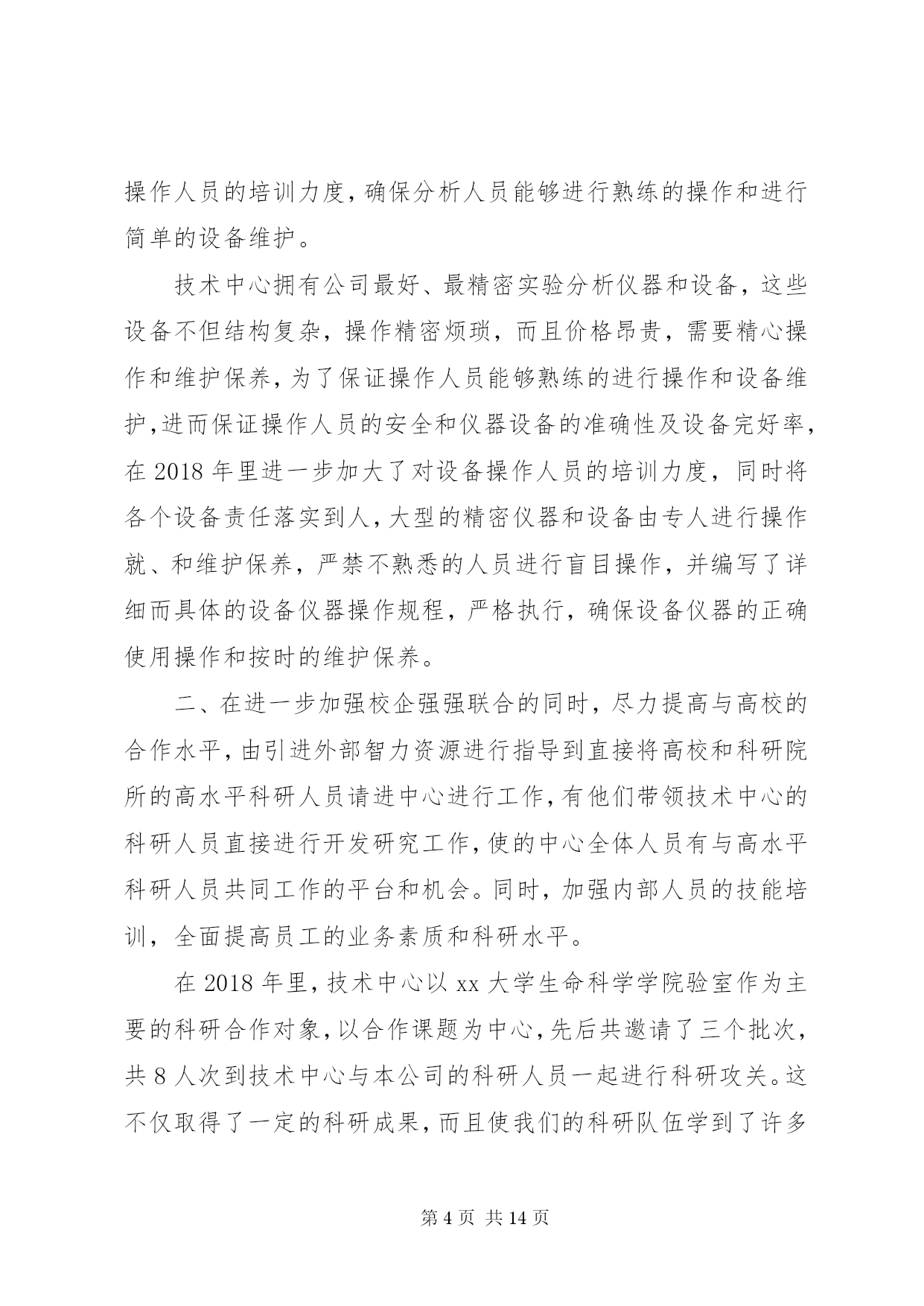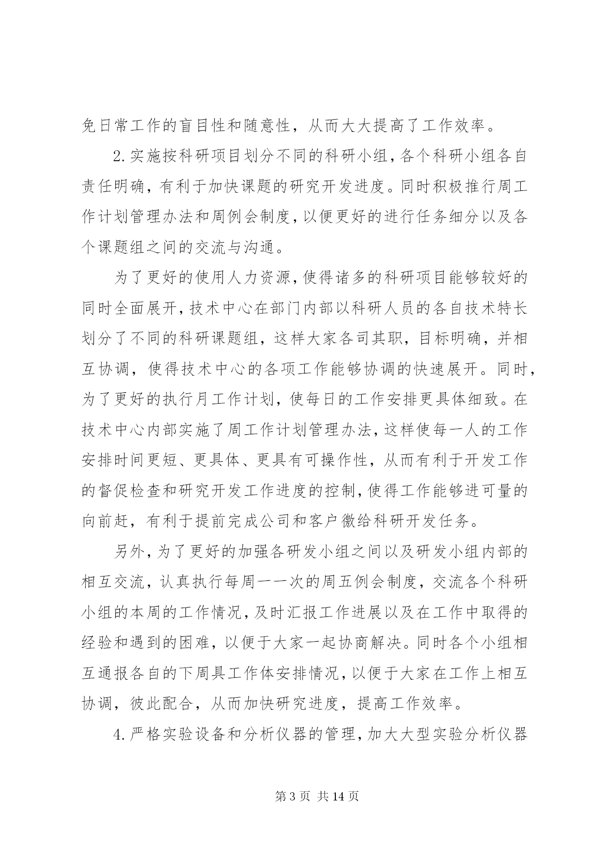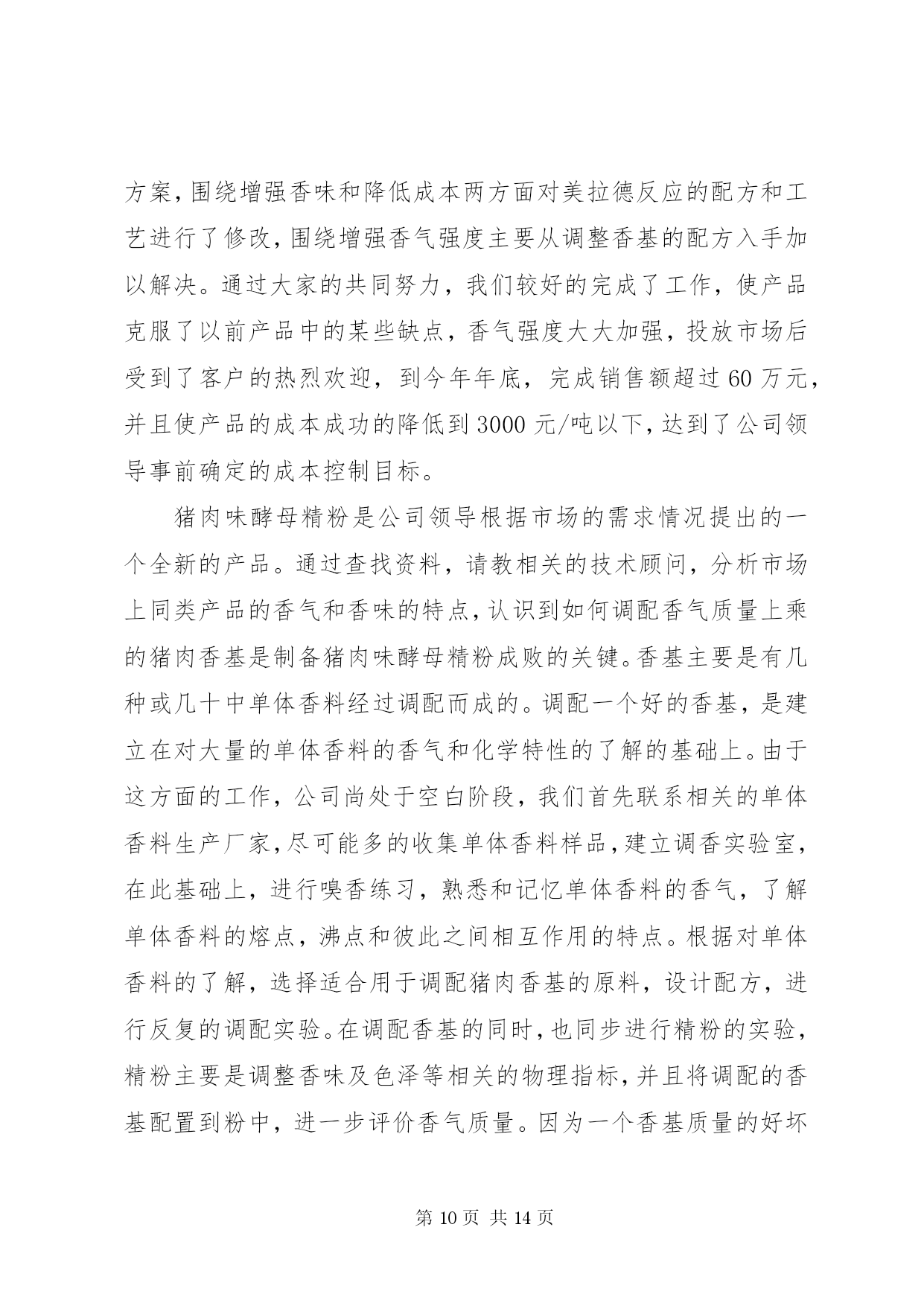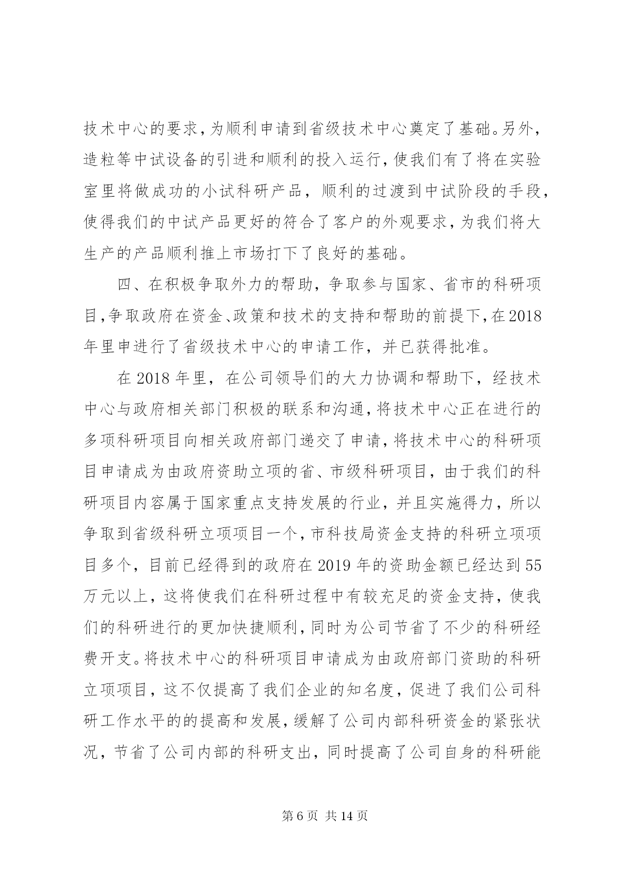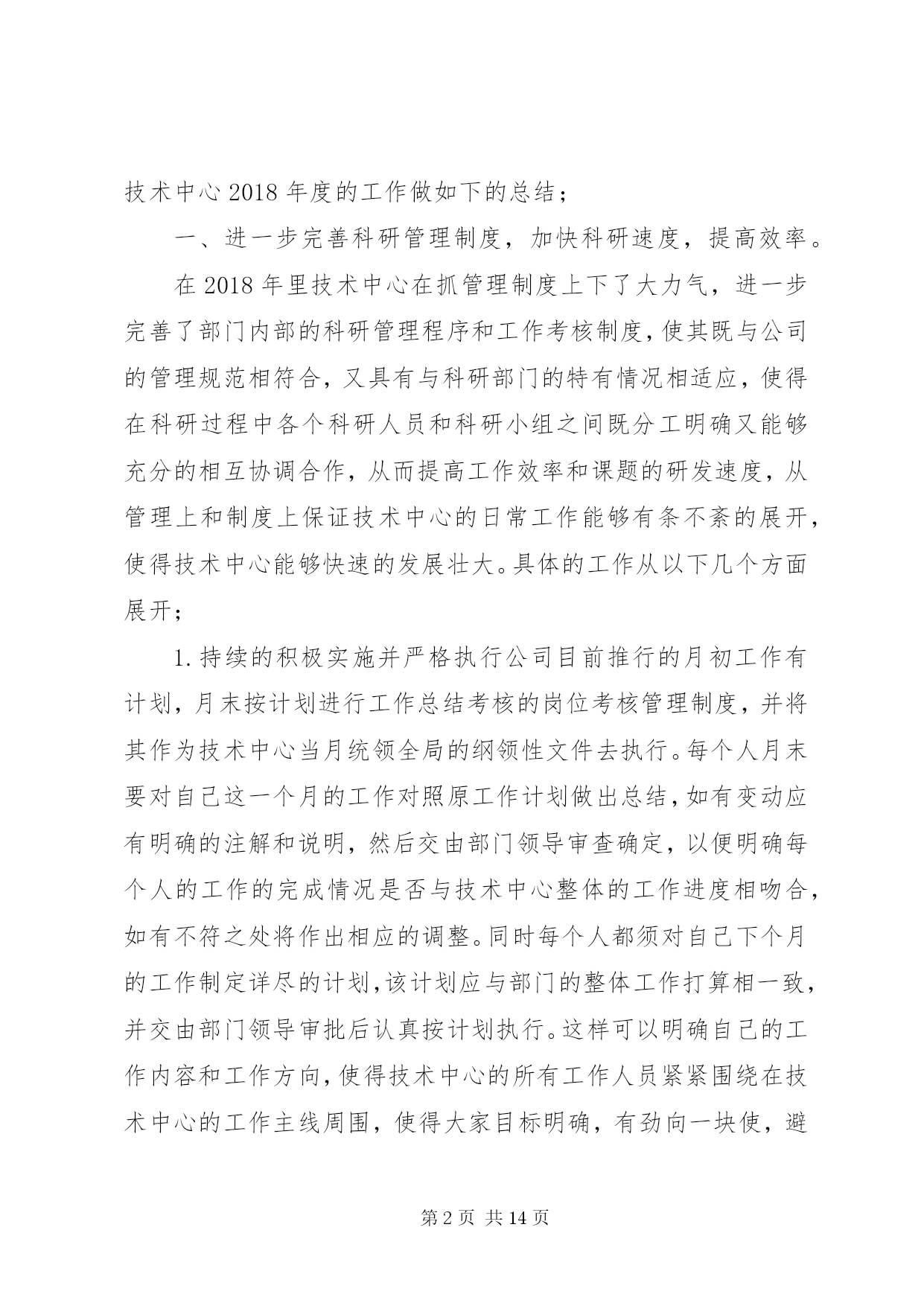 第PAGE\*Arabic\*MERGEFORMAT14页共NUMPAGES\*MERGEFORMAT14页公司技术中心工作总结2018年是技术中心成立以来成果显著的一年,也是较为繁忙、变化较大的一年。在这即将过去的一年里,技术中心全体员工在公司领导们的亲切关怀和指导下,进一步完善了自己内部的管理机制、科研能力和实验手段,同时全面的提高了技术中心科研人员与市场的对接能力,从而使得科研开发与市场的需求能够更好的结合在一起。经过技术中心全体人员的共同努力,全面完成了公司领导安排的各项科研任务,取得了较好的成绩。在2018年里,技术中心在酵母提取物的改进和深加工方面,在海产品提取物的研发及市场开拓方面以及啤酒新品种的研究方面均取得了较好的成绩。其中,在2018年研发成功的酵母提取物新品种af01、扇贝提取物—扇贝精粉和肉味浸膏等目前已经深受市场的欢迎,仅这三个新品种今年的销售额有望突破500万元。同时,经技术中新研究开发的14度黑生啤酒也即将投入市场销售。这些新产品的研究成功,使得技术中心为集团公司在啤酒行业和高新产品和技术领域的全面发展作出了自己的贡献。回顾即将过去的2018年,我们为我们在工作当中所取得的成就而感到欣慰,同时也为我们在工作上的一些不足而着急,为了我们今后能够更好的开展工作,并在工作中更好的发挥我们的长处,改正我们的不足之处,以便在2019年里为集团公司在新的发展领域里能够更好更快的发展,使公司拥有更好的经济效益和发展前景,现将技术中心2018年度的工作做如下的总结;一、进一步完善科研管理制度,加快科研速度,提高效率。在2018年里技术中心在抓管理制度上下了大力气,进一步完善了部门内部的科研管理程序和工作考核制度,使其既与公司的管理规范相符合,又具有与科研部门的特有情况相适应,使得在科研过程中各个科研人员和科研小组之间既分工明确又能够充分的相互协调合作,从而提高工作效率和课题的研发速度,从管理上和制度上保证技术中心的日常工作能够有条不紊的展开,使得技术中心能够快速的发展壮大。具体的工作从以下几个方面展开;1.持续的积极实施并严格执行公司目前推行的月初工作有计划,月末按计划进行工作总结考核的岗位考核管理制度,并将其作为技术中心当月统领全局的纲领性文件去执行。每个人月末要对自己这一个月的工作对照原工作计划做出总结,如有变动应有明确的注解和说明,然后交由部门领导审查确定,以便明确每个人的工作的完成情况是否与技术中心整体的工作进度相吻合,如有不符之处将作出相应的调整。同时每个人都须对自己下个月的工作制定详尽的计划,该计划应与部门的整体工作打算相一致,并交由部门领导审批后认真按计划执行。这样可以明确自己的工作内容和工作方向,使得技术中心的所有工作人员紧紧围绕在技术中心的工作主线周围,使得大家目标明确,有劲向一块使,避免日常工作的盲目性和随意性,从而大大提高了工作效率。2.实施按科研项目划分不同的科研小组,各个科研小组各自责任明确,有利于加快课题的研究开发进度。同时积极推行周工作计划管理办法和周例会制度,以便更好的进行任务细分以及各个课题组之间的交流与沟通。为了更好的使用人力资源,使得诸多的科研项目能够较好的同时全面展开,技术中心在部门内部以科研人员的各自技术特长划分了不同的科研课题组,这样大家各司其职,目标明确,并相互协调,使得技术中心的各项工作能够协调的快速展开。同时,为了更好的执行月工作计划,使每日的工作安排更具体细致。在技术中心内部实施了周工作计划管理办法,这样使每一人的工作安排时间更短、更具体、更具有可操作性,从而有利于开发工作的督促检查和研究开发工作进度的控制,使得工作能够进可量的向前赶,有利于提前完成公司和客户徼给科研开发任务。另外,为了更好的加强各研发小组之间以及研发小组内部的相互交流,认真执行每周一一次的周五例会制度,交流各个科研小组的本周的工作情况,及时汇报工作进展以及在工作中取得的经验和遇到的困难,以便于大家一起协商解决。同时各个小组相互通报各自的下周具工作体安排情况,以便于大家在工作上相互协调,彼此配合,从而加快研究进度,提高工作效率。4.严格实验设备和分析仪器的管理,加大大型实验分析仪器操作人员的培训力度,确保分析人员能够进行熟练的操作和进行简单的设备维护。技术中心拥有公司最好、最精密实验分析仪器和设备,这些设备不但结构复杂,操作精密烦琐,而且价格昂贵,需要精心操作和维护保养,为了保证操作人员能够熟练的进行操作和设备维护,进而保证操作人员的安全和仪器设备的准确性及设备完好率,在2018年里进一步加大了对设备操作人员的培训力度,同时将各个设备责任落实到人,大型的精密仪器和设备由专人进行操作就、和维护保养,严禁不熟悉的人员进行盲目操作,并编写了详细而具体的设备仪器操作规程,严格执