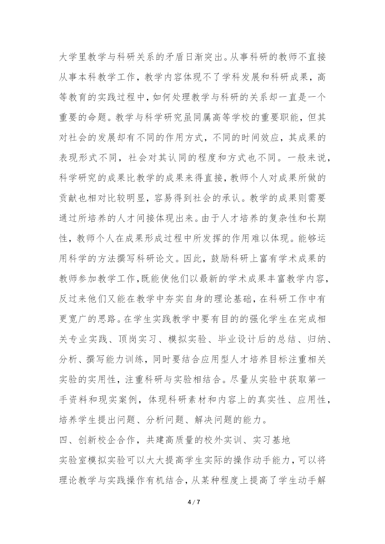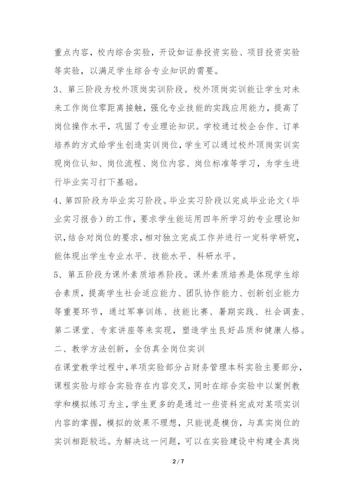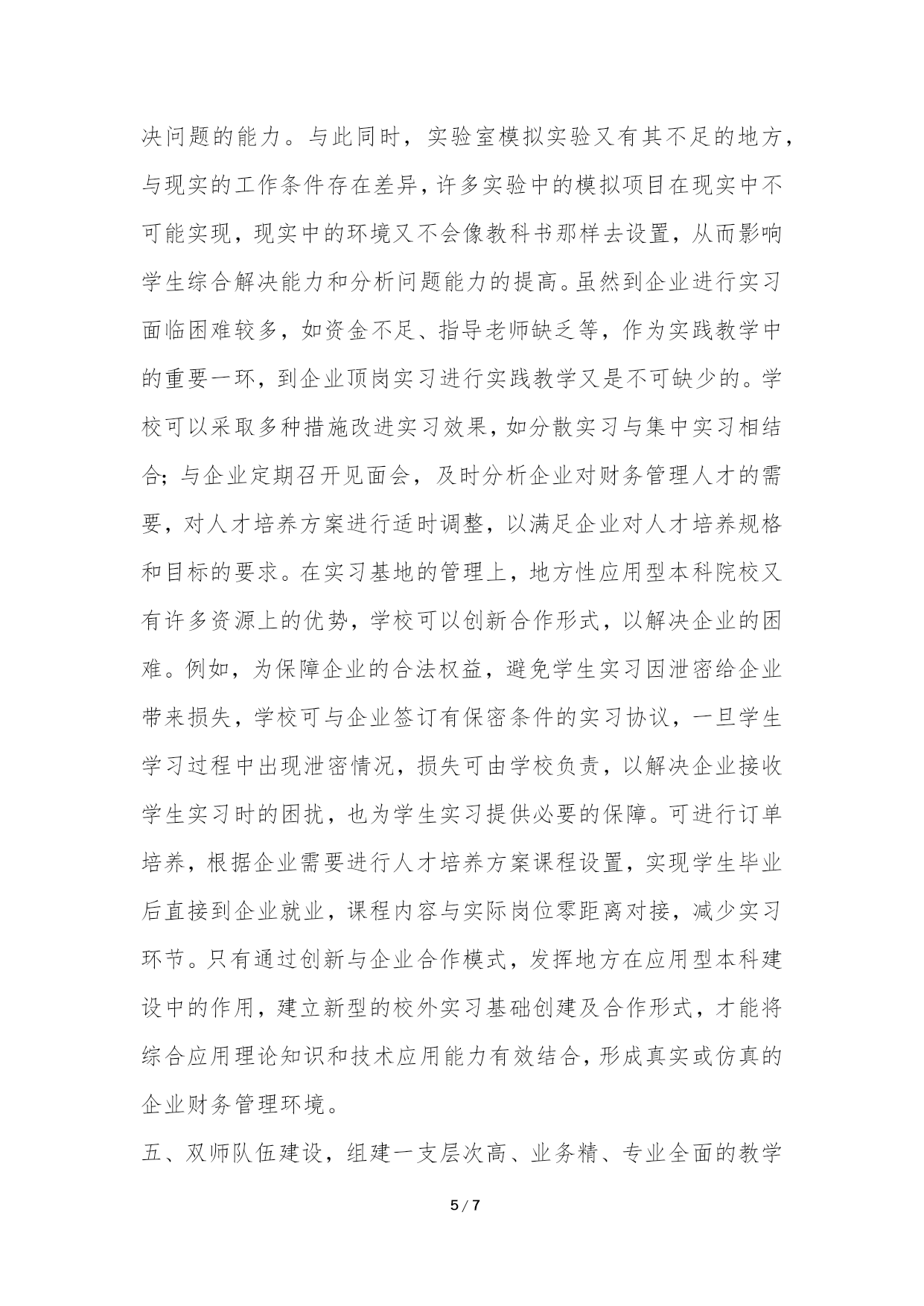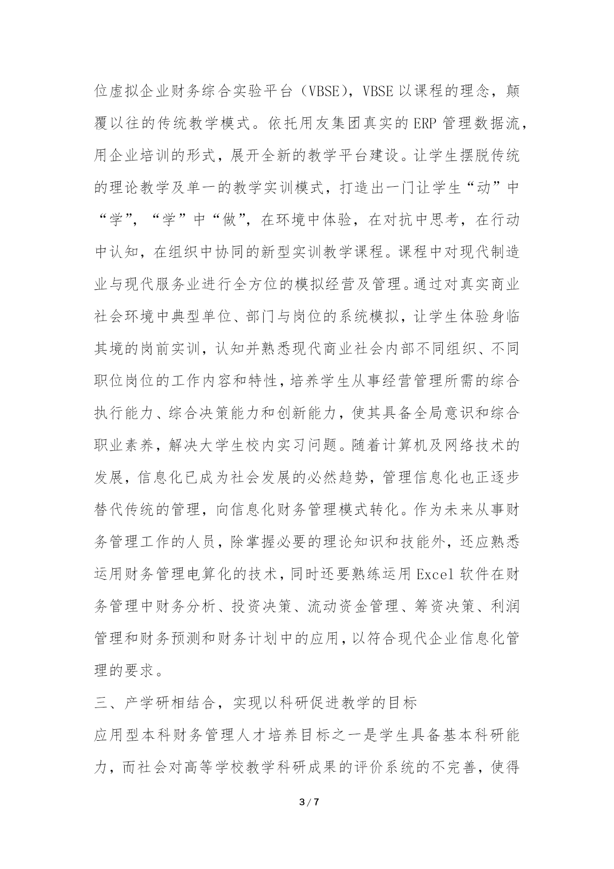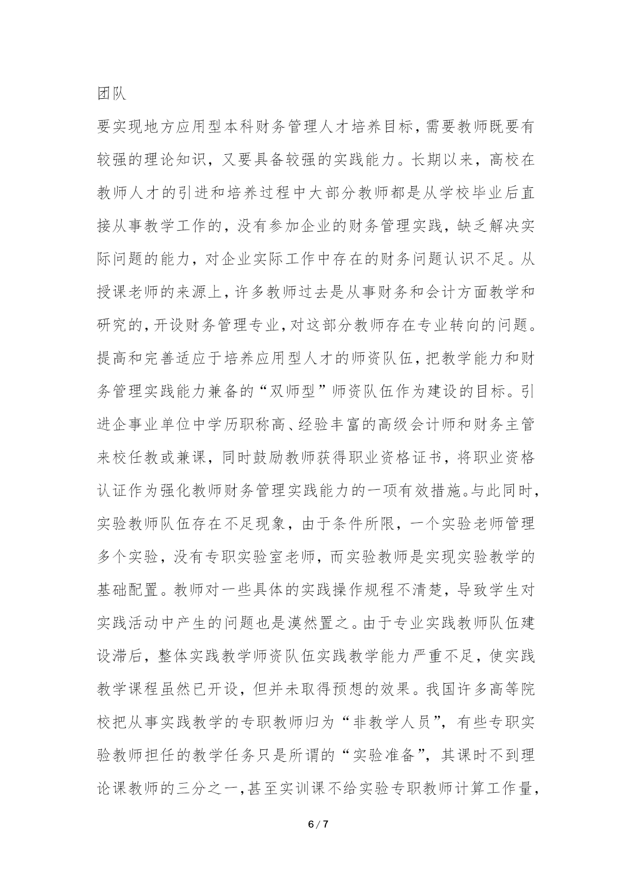 PAGE7/NUMPAGES7地方院校财务管理论文一、分阶段开设实践课程,形成科学合理的实践课程体系基于应用型本科财务管理人才培养目标要求,突出实践课程体系构建就是要将理论知识、专业技能和综合素质有机融合起来,协调通识课程和专业课程关系、素质教育和能力培养关系、课堂实验和校外实训的关系。以构建主义教育理念,注意分阶段开设相关实践课程:1、第一阶段为专业基础实验阶段。学生初入职场,所从事的工作一般为专业基础性工作,从事工作内容为简单、单一工作,如出纳岗位、会计岗位。随着工作年限、经验的累积逐步走上财务管理岗位。针对这一现实,在基础实验阶段以会计、出纳岗位工作内容为依据,开设相关岗位实验模块,如凭证处理、电算化操作等课程。2、第二阶段为校内综合实验阶段。财务管理主要工作内容是考虑市场经济的客观环境和公司制度的主要特征,以公司财务管理目标作为理论研究的起点,以财务决策为核心方法,围绕公司财务活动的基本内容,运用货币时间价值、现金流量和风险报酬等基本理财观念,全面阐述财务计划、财务决策与财务控制、财务分析以及财务评价等方法的应用,并着重对筹资决策、投资决策和营运管理等三大内容进行分析与研究。结合财务管理工作岗位重点内容,校内综合实验,开设如证券投资实验、项目投资实验等实验,以满足学生综合专业知识的需要。3、第三阶段为校外顶岗实训阶段。校外顶岗实训能让学生对未来工作岗位零距离接触,强化专业技能的实践应用能力,提高了岗位操作水平,巩固了专业理论知识。学校通过校企合作、订单培养的方式给学生创造实训岗位,学生可以通过校外顶岗实训实现岗位认知、岗位流程、岗位内容、岗位标准等学习,为学生进行毕业实习打下基础。4、第四阶段为毕业实习阶段。毕业实习阶段以完成毕业论文(毕业实习报告)的工作,要求学生能运用四年所学习的专业理论知识,结合对岗位的要求,相对独立完成工作并进行一定科学研究,能体现出学生专业水平、技能水平、科研水平。5、第五阶段为课外素质培养阶段。课外素质培养是体现学生综合素质,提高学生社会适应能力、团队协作能力、创新创业能力等重要环节,通过军事训练、技能比赛、暑期实践、社会调查、第二课堂、专家讲座等来实现,塑造学生良好品质和健康人格。二、教学方法创新,全仿真全岗位实训在课堂教学过程中,单项实验部分占财务管理本科实验主要部分,课程实验与综合实验存在内容交叉,同时在综合实验中以案例教学和模拟练习为主,学生更多的是通过一些资料完成对某项实训内容的掌握,模拟的效果不理想,只能说是模仿,与真实岗位的实训相距较远。为解决这一问题,可以在实验建设中构建全真岗位虚拟企业财务综合实验平台(VBSE),VBSE以课程的理念,颠覆以往的传统教学模式。依托用友集团真实的ERP管理数据流,用企业培训的形式,展开全新的教学平台建设。让学生摆脱传统的理论教学及单一的教学实训模式,打造出一门让学生“动”中“学”,“学”中“做”,在环境中体验,在对抗中思考,在行动中认知,在组织中协同的新型实训教学课程。课程中对现代制造业与现代服务业进行全方位的模拟经营及管理。通过对真实商业社会环境中典型单位、部门与岗位的系统模拟,让学生体验身临其境的岗前实训,认知并熟悉现代商业社会内部不同组织、不同职位岗位的工作内容和特性,培养学生从事经营管理所需的综合执行能力、综合决策能力和创新能力,使其具备全局意识和综合职业素养,解决大学生校内实习问题。随着计算机及网络技术的发展,信息化已成为社会发展的必然趋势,管理信息化也正逐步替代传统的管理,向信息化财务管理模式转化。作为未来从事财务管理工作的人员,除掌握必要的理论知识和技能外,还应熟悉运用财务管理电算化的技术,同时还要熟练运用Excel软件在财务管理中财务分析、投资决策、流动资金管理、筹资决策、利润管理和财务预测和财务计划中的应用,以符合现代企业信息化管理的要求。三、产学研相结合,实现以科研促进教学的目标应用型本科财务管理人才培养目标之一是学生具备基本科研能力,而社会对高等学校教学科研成果的评价系统的不完善,使得大学里教学与科研关系的矛盾日渐突出。从事科研的教师不直接从事本科教学工作,教学内容体现不了学科发展和科研成果,高等教育的实践过程中,如何处理教学与科研的关系却一直是一个重要的命题。教学与科学研究虽同属高等学校的重要职能,但其对社会的发展却有不同的作用方式,不同的时间效应,其成果的表现形式不同,社会对其认同的程度和方式也不同。一般来说,科学研究的成果比教学的成果来得直接,教师个人对成果所做的贡献也相对比较明显,容易得到社会的承认。教学的成果则需要通过所培养的人才间接体现出来。由于人才培养的复杂性和长期性,教师个人在成果形成过程中所发挥的作用难以体现。能够运用科学的方法撰写科研论文。因此,鼓励科研上富有学术成果的教师参加教