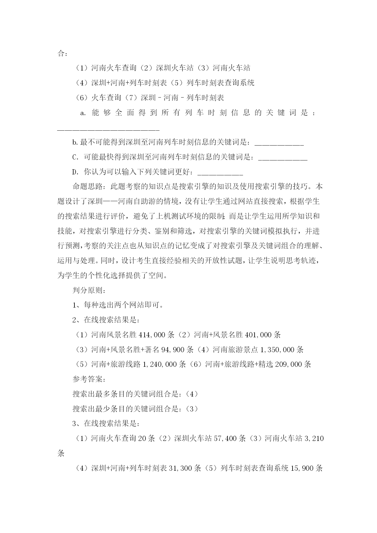 试题案例《自助旅游搜索》试题案例《自助旅游搜索》设计者:万士杰单位:深圳市文锦中学E-MAIL:wanshijie@163.com适用范围:七年级信息技术基础题干:小王、小明等同学决定利用假期从深圳去河南自肋旅游,他们想通过互联网先了解一下交通、风景名胜等信息.1、下表提供了一些常用的搜索引擎,请你帮忙筛选!(每题两个网址):a.可以搜索风景图片的有:_____________________________________b.可以搜索视频动画的有:_____________________________________c.可以搜索MP3音频的有:______________________________________d.目录索引类搜索引擎有:______________________________________e.全文检索类搜索引擎有:______________________________________f.其它专用搜索引擎:________________________________,______________________________。2、小王分工收集河南的风景名胜以及旅游线路,他在google搜索引擎中分别输入下列关键词。(1)河南风景名胜(2)河南+风景名胜(3)河南+风景名胜+著名(4)河南旅游景点;(5)河南+旅游线路(6)河南+旅游线路+精选小王得到的反馈结果中,你认为:a.搜索出最多条目的关键词组合是:______________________________________,因为:______________________________________。a.搜索出最少条目的关键词组合是:______________________________________,因为:______________________________________。1、小明分工查找交通信息,他在百度搜索引擎中分别输入了下列关键词组合:(1)河南火车查询(2)深圳火车站(3)河南火车站(4)深圳+河南+列车时刻表(5)列车时刻表查询系统(6)火车查询(7)深圳–河南–列车时刻表a.能够全面得到所有列车时刻信息的关键词是:___________________________b.最不可能得到深圳至河南列车时刻信息的关键词是:_____________C.可能最快得到深圳至河南列车时刻信息的关键词是:_____________D.你认为可以输入下列关键词更好:____________命题思路:此题考察的知识点是搜索引擎的知识及使用搜索引擎的技巧。本题设计了深圳——河南自助游的情境,没有让学生通过网站直接搜索,根据学生的搜索结果进行评价,避免了上机测试环境的限制;而是让学生运用所学知识和技能,对搜索引擎进行分类、鉴别和筛选,对搜索引擎的关键词模拟执行,并进行预测,考察的关注点也从知识点的记忆变成了对搜索引擎及关键词组合的理解、运用与处理。同时,设计考生直接经验相关的开放性试题,让学生说明思考轨迹,为学生的个性化选择提供了空间。判分原则:1、每种选出两个网站即可。2、在线搜索结果是:(1)河南风景名胜414,000条(2)河南+风景名胜401,000条(3)河南+风景名胜+著名94,900条(4)河南旅游景点1,350,000条(5)河南+旅游线路1,240,000条(6)河南+旅游线路+精选209,000条参考答案:搜索出最多条目的关键词组合是:(4)搜索出最少条目的关键词组合是:(3)3、在线搜索结果是:(1)河南火车查询20条(2)深圳火车站57,400条(3)河南火车站3,210条(4)深圳+河南+列车时刻表31,300条(5)列车时刻表查询系统15,900条(6)火车查询1,380,000条(7)深圳–河南–列车时刻表0条参考答案:能够全面得到所有列车时刻信息的关键词是:(5)最不可能得到深圳至河南列车时刻信息的关键词是:(7)可能最快得到深圳至河南列车时刻信息的关键词是:(4)你认为可以输入下列关键词更好:深圳+郑州+火车时刻表