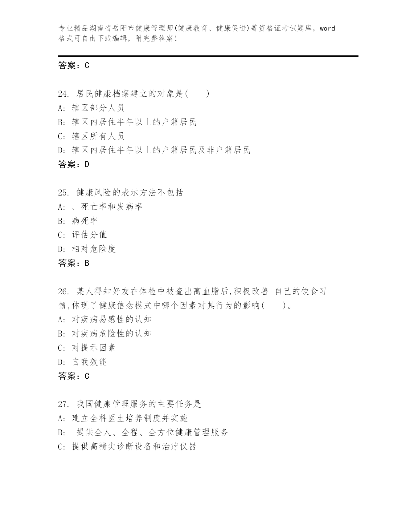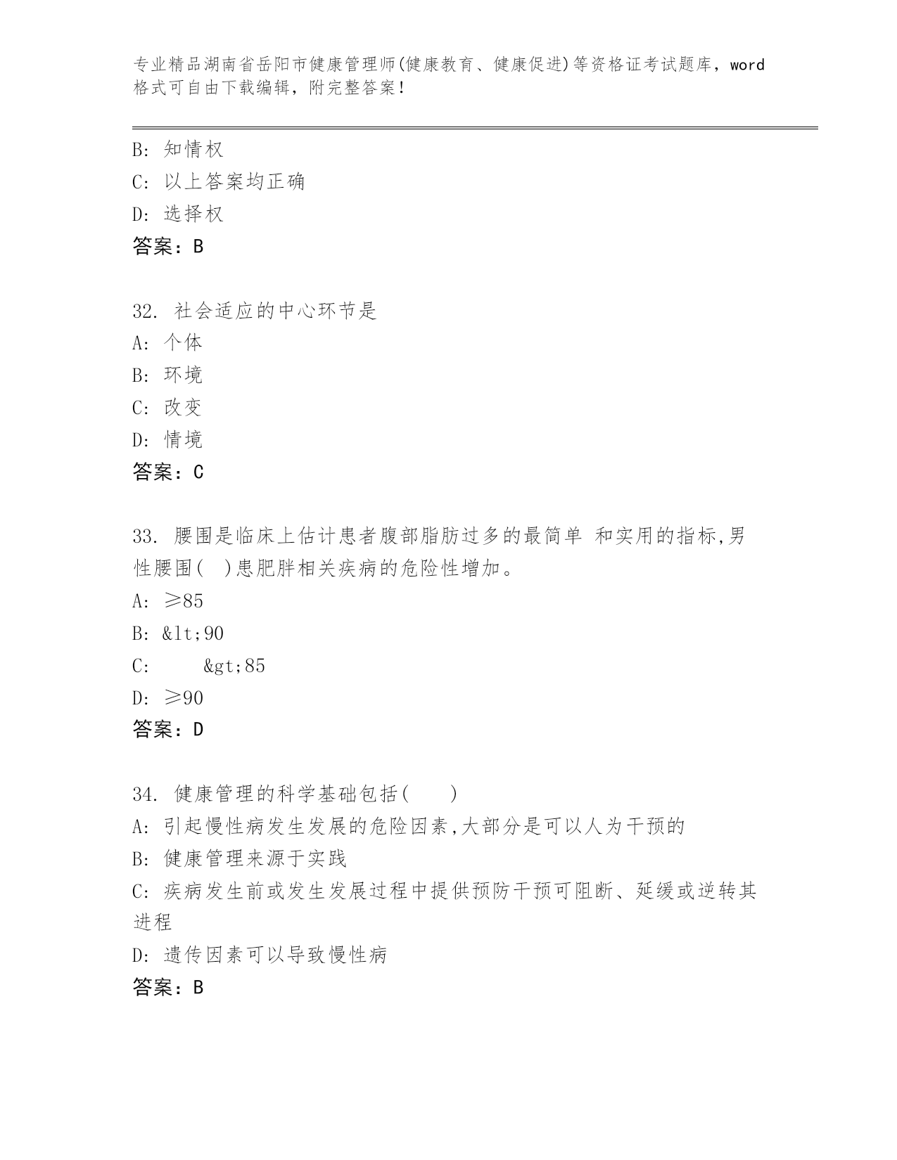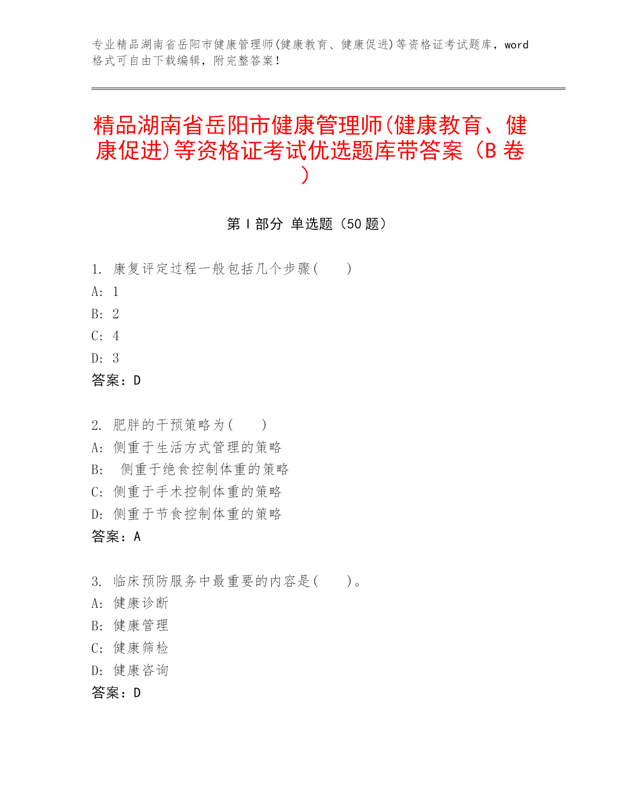 精品湖南省岳阳市健康管理师(健康教育、健康促进)等资格证考试优选题库带答案(B卷).docx