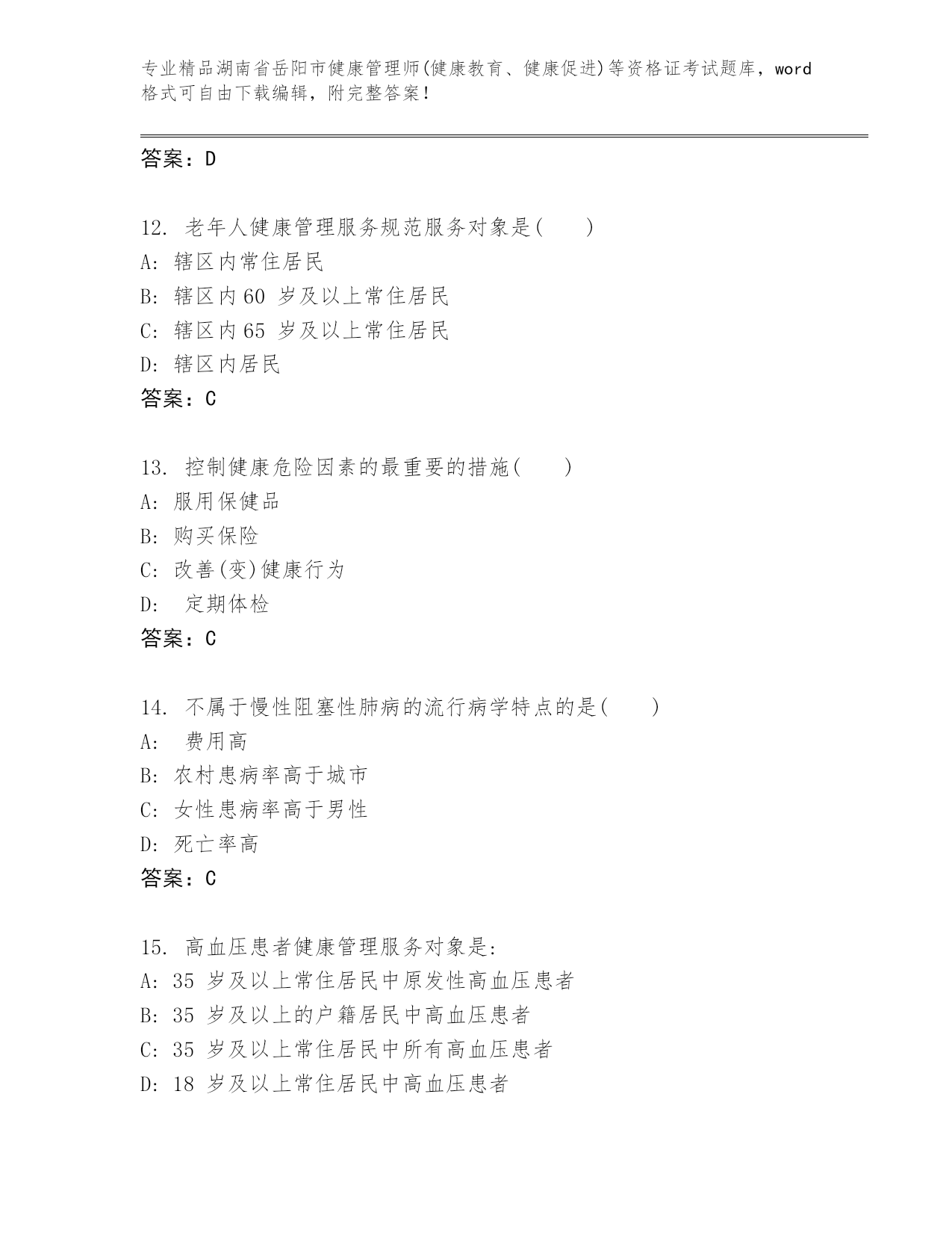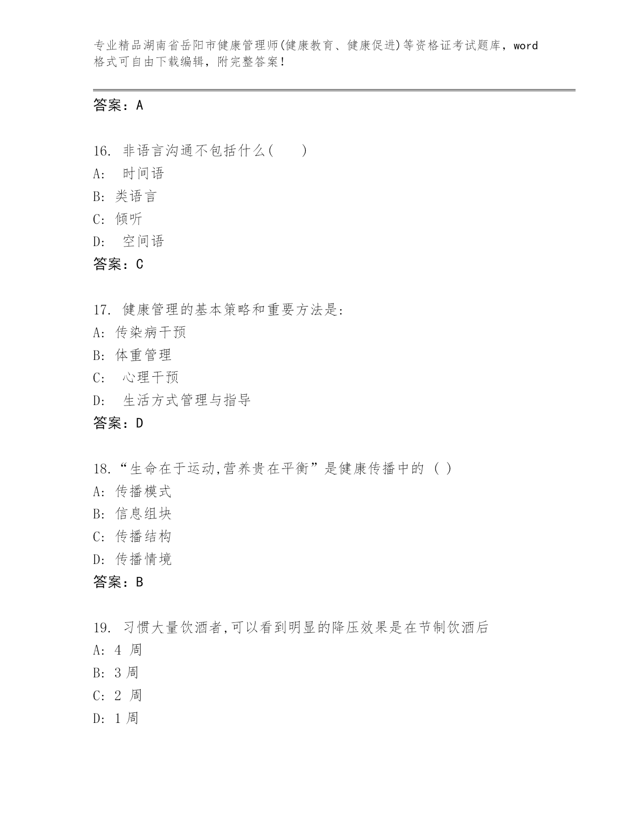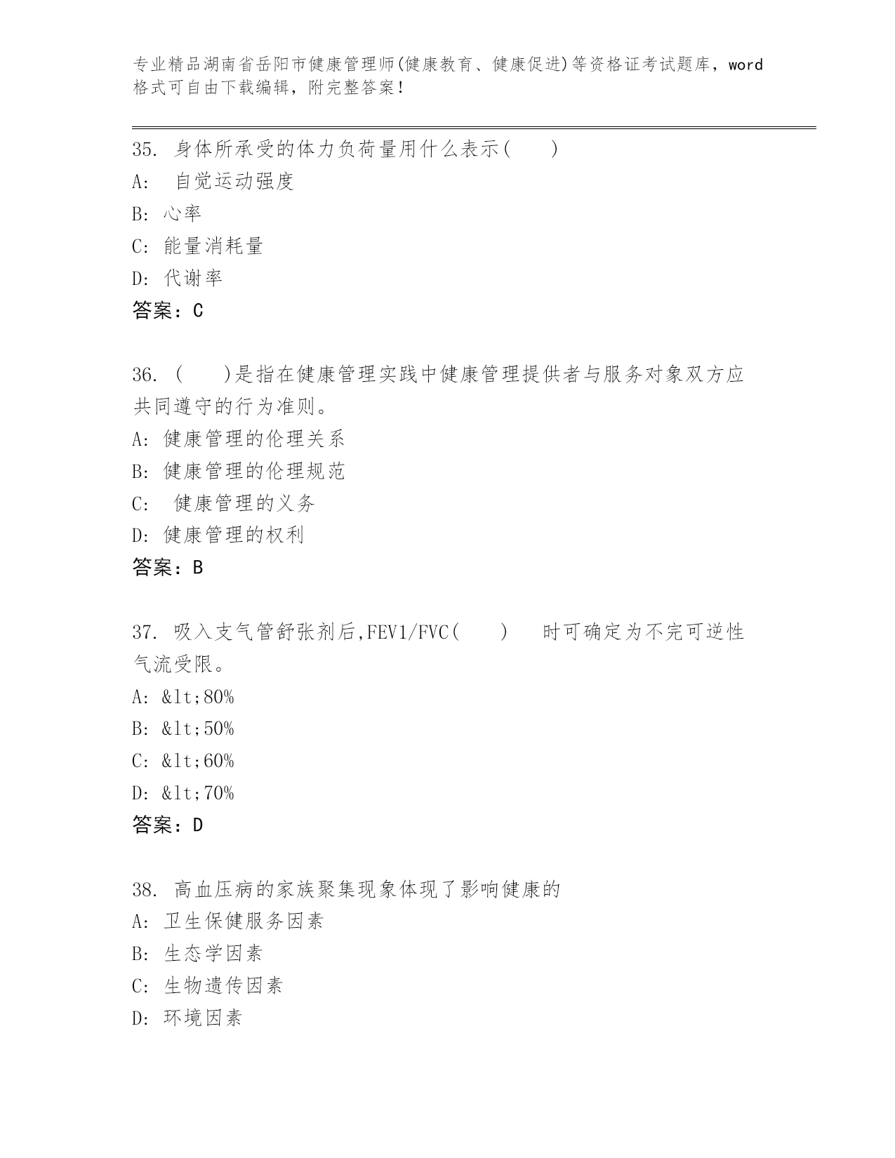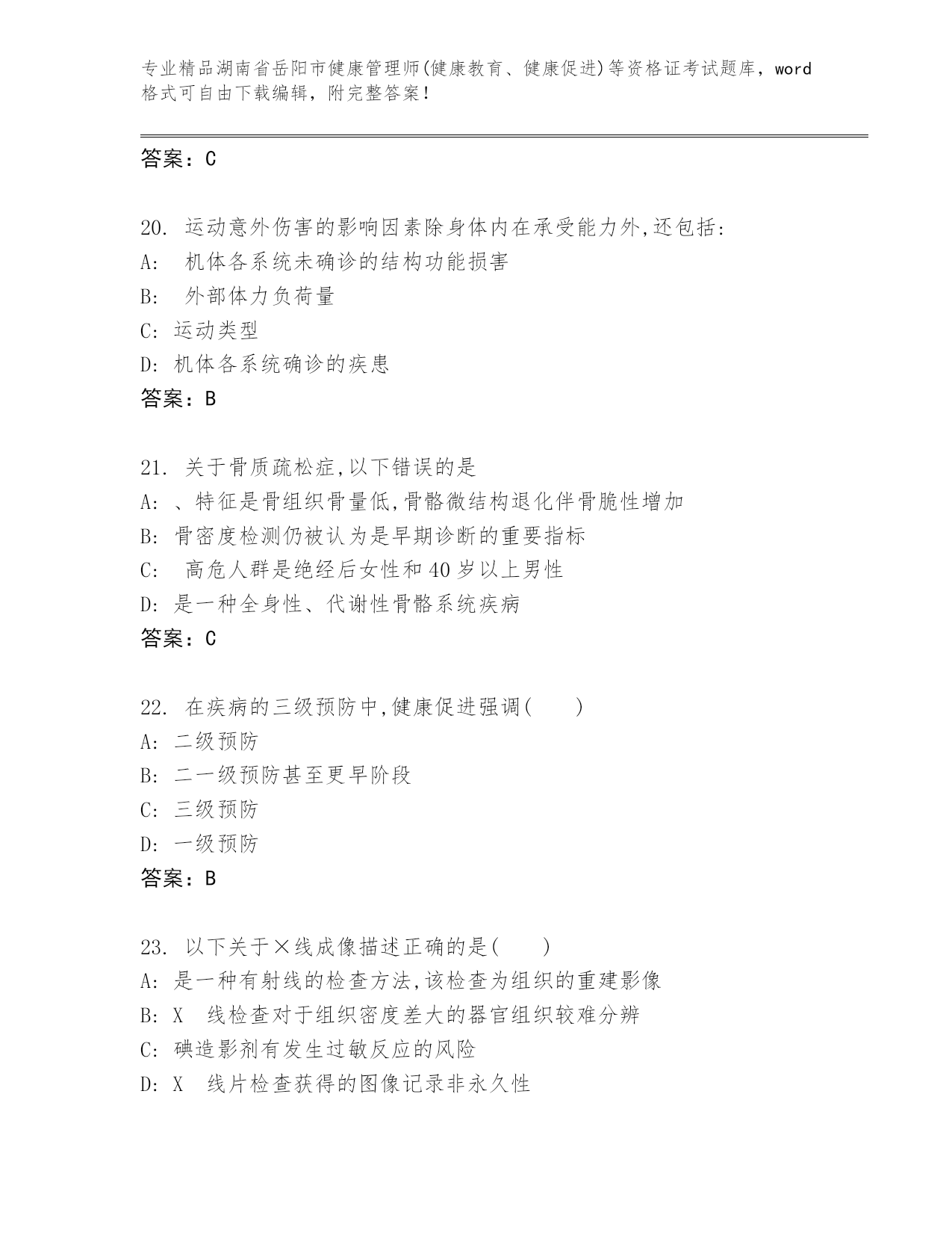 精品湖南省岳阳市健康管理师(健康教育、健康促进)等资格证考试优选题库带答案(B卷).docx