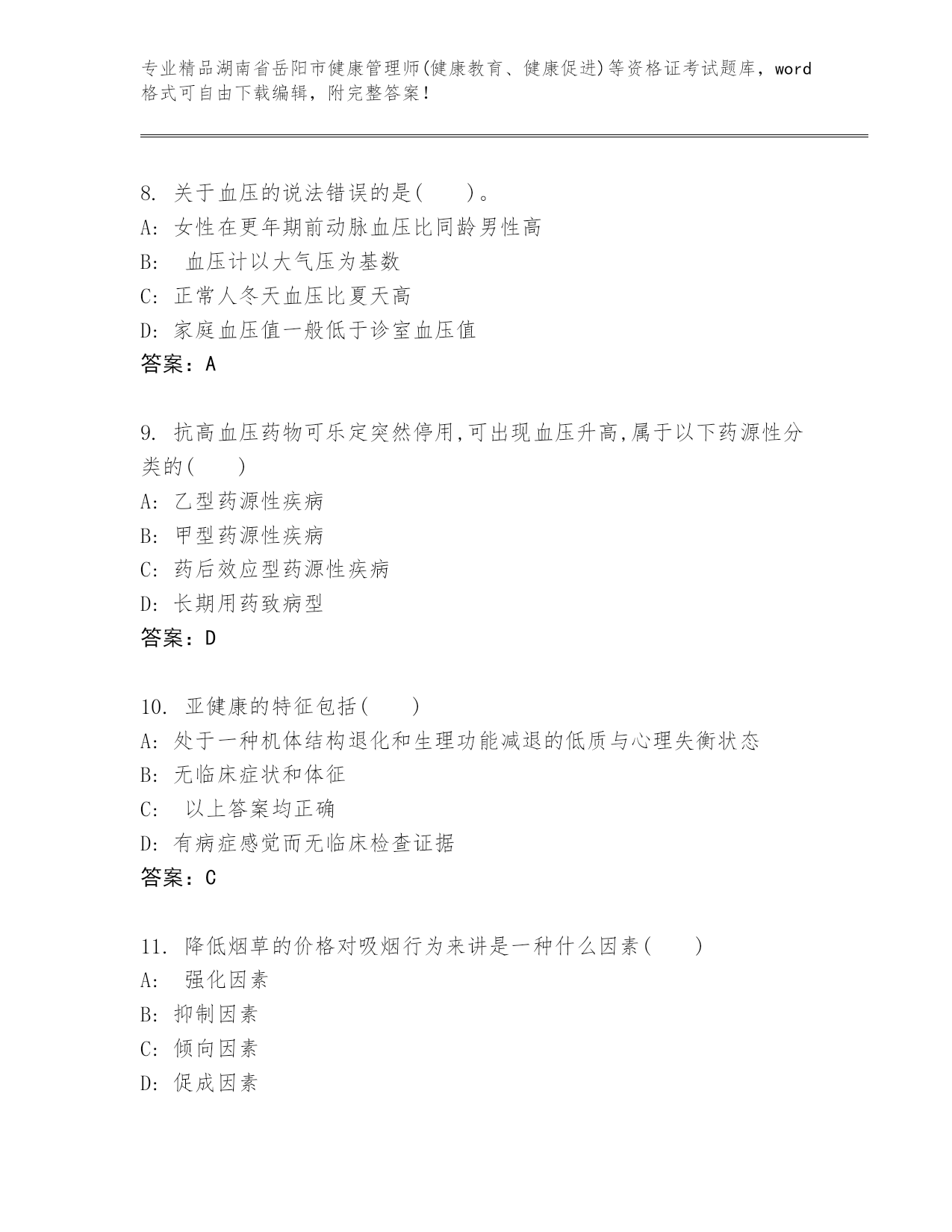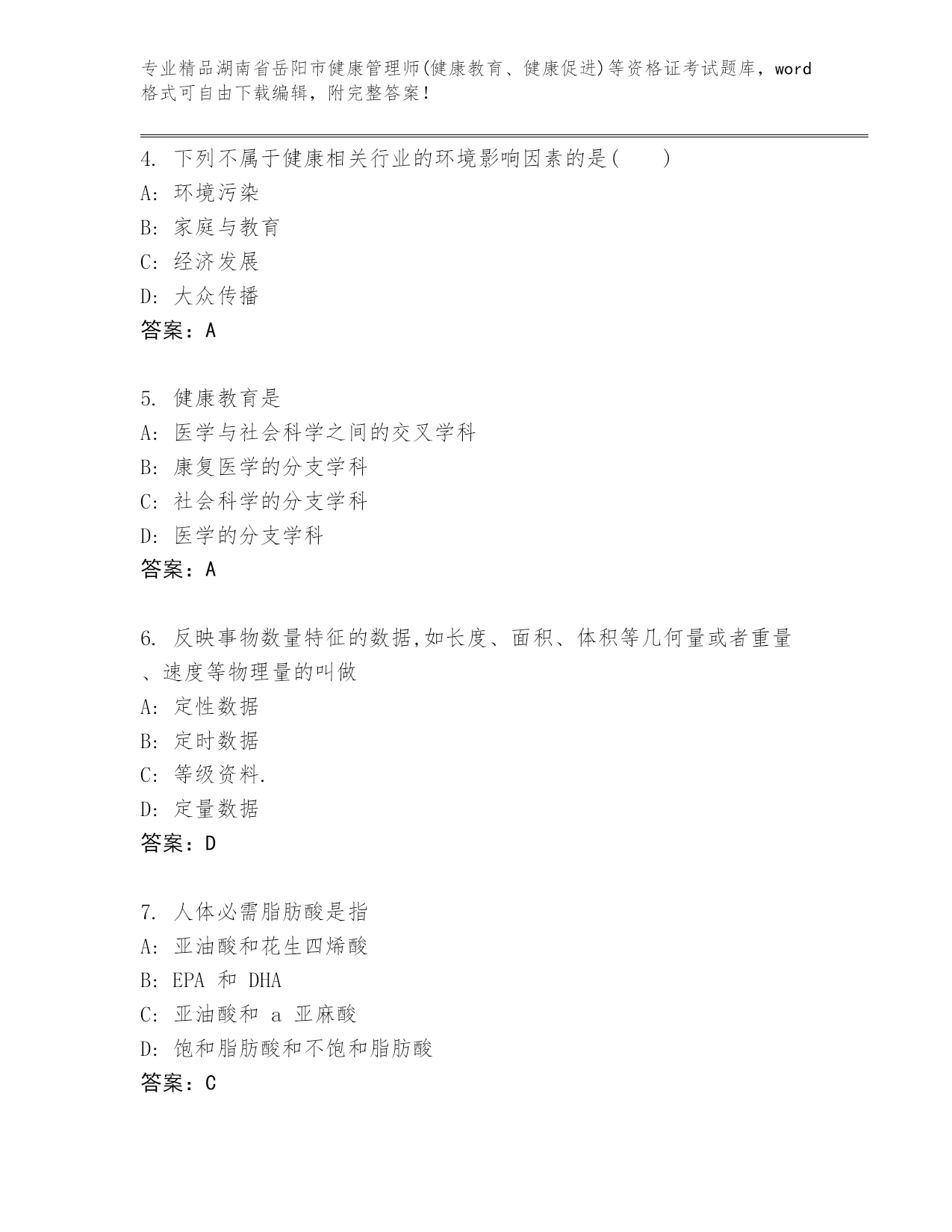 精品湖南省岳阳市健康管理师(健康教育、健康促进)等资格证考试优选题库带答案(B卷)