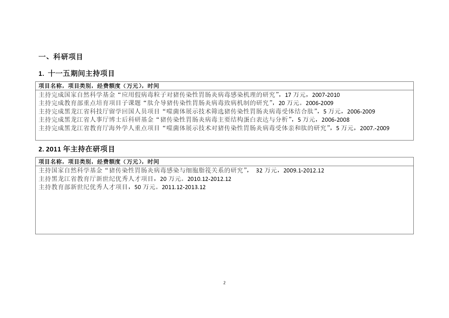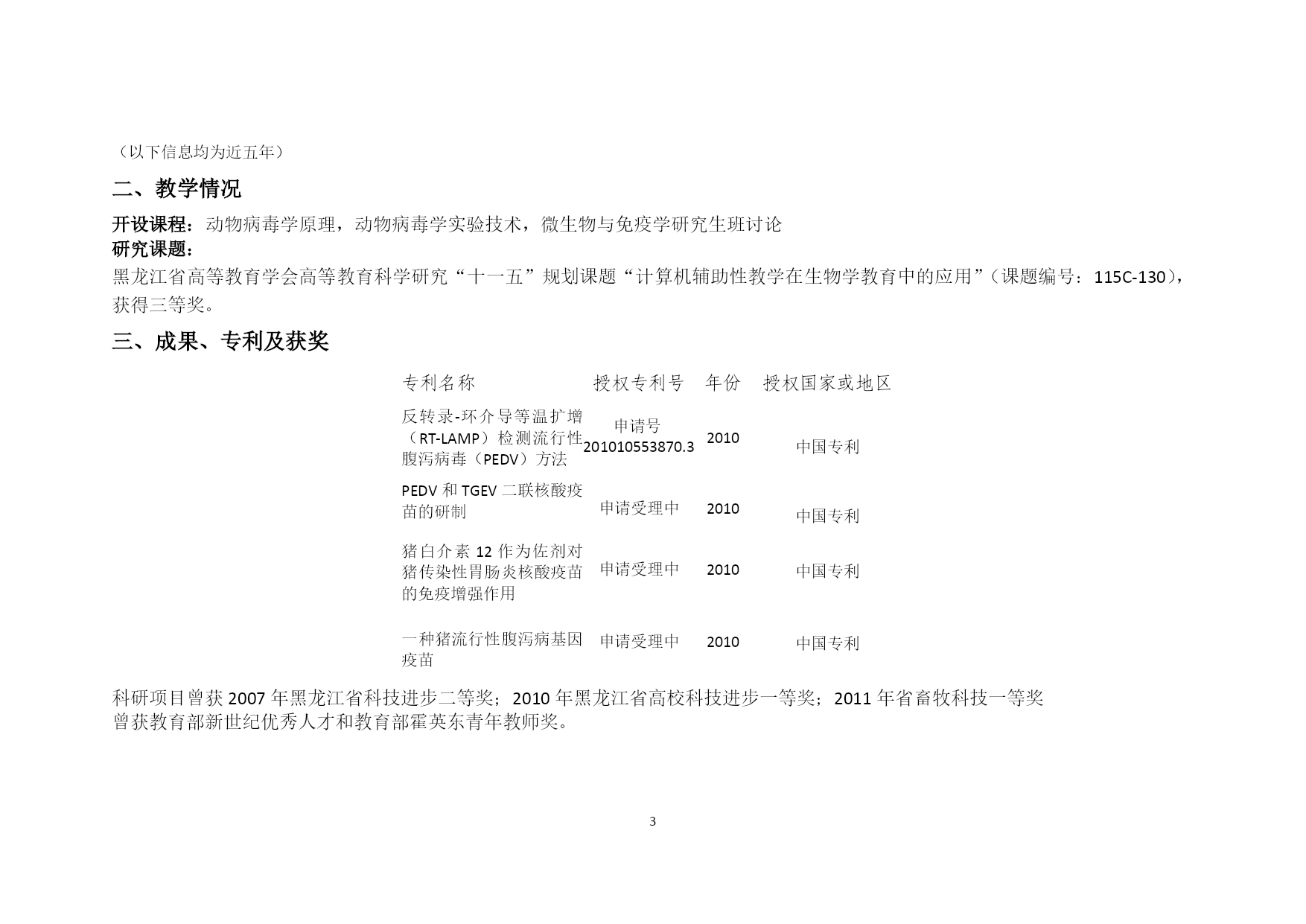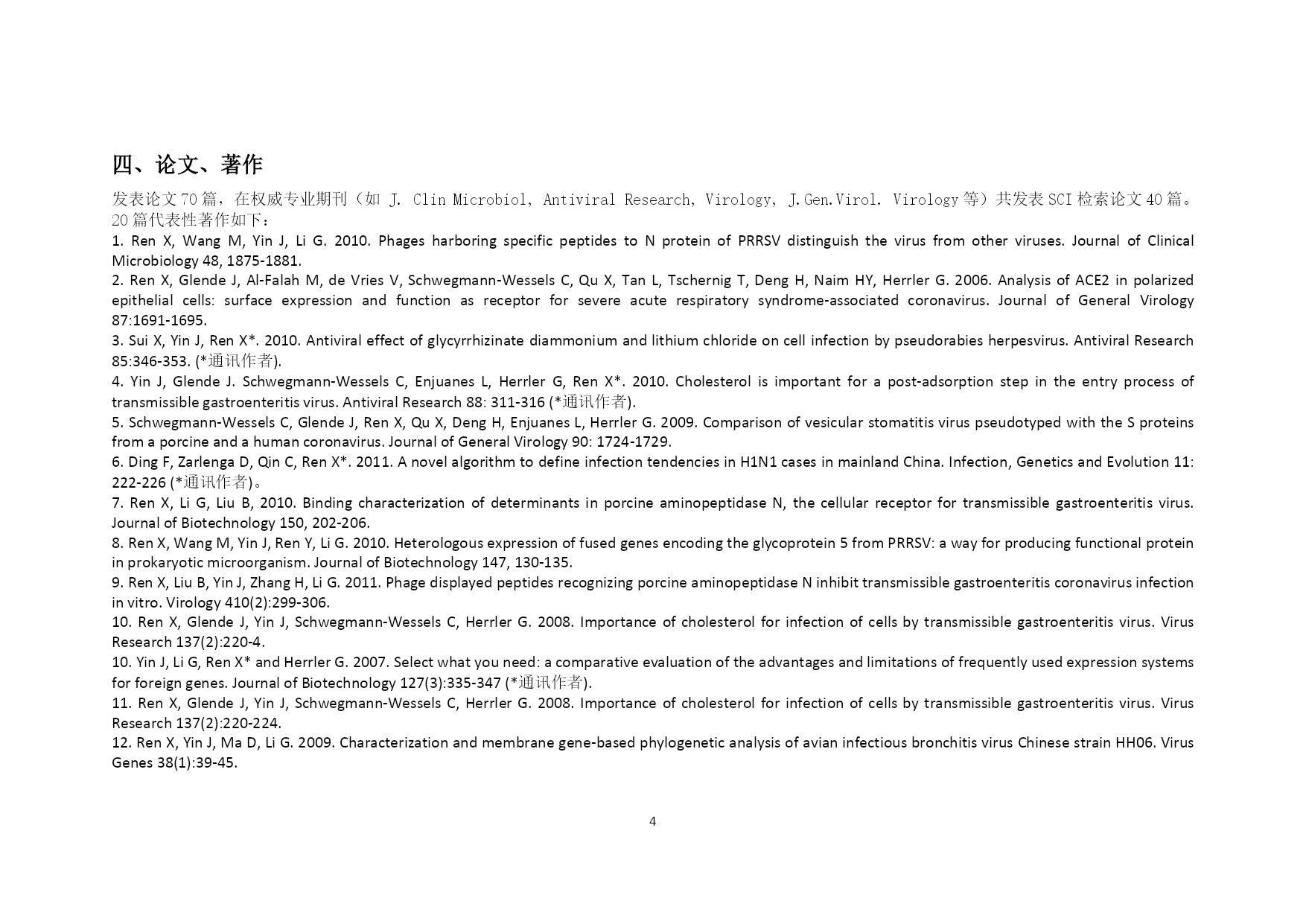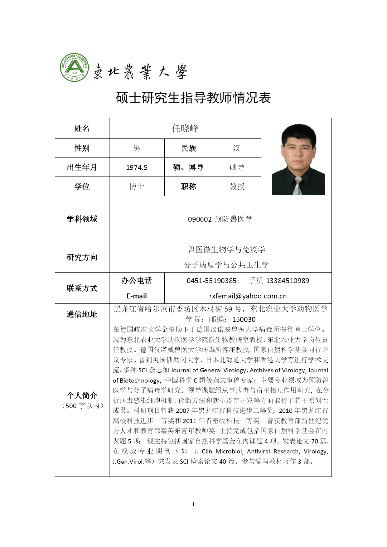 PAGE\*MERGEFORMAT5硕士研究生指导教师情况表姓名任晓峰电子照片性别男民族汉出生年月1974.5硕、博导硕导学位博士职称教授学科领域090602预防兽医学研究方向兽医微生物学与免疫学分子病原学与公共卫生学联系方式办公电话0451-55190385;手机13384510989E-mailrxfemail@yahoo.com.cn通信地址黑龙江省哈尔滨市香坊区木材街59号,东北农业大学动物医学学院;邮编:150030个人简介(500字以内)在德国政府奖学金资助下于德国汉诺威兽医大学病毒所获得博士学位。现为东北农业大学动物医学学院微生物教研室教授,东北农业大学岗位责任教授。德国汉诺威兽医大学病毒所客座教授;国家自然科学基金同行评议专家。曾到美国俄勒冈大学、日本北海道大学和香港大学等进行学术交流。多种SCI杂志如JournalofGeneralVirology,ArchivesofVirology,JournalofBiotechnology,中国科学C辑等杂志审稿专家;主要专业领域为预防兽医学与分子病毒学研究。领导课题组从事病毒与宿主相互作用研究,在分析病毒感染细胞机制、诊断方法和新型疫苗开发等方面取得了若干原创性成果。科研项目曾获2007年黑龙江省科技进步二等奖;2010年黑龙江省高校科技进步一等奖和2011年省畜牧科技一等奖。曾获教育部新世纪优秀人才和教育部霍英东青年教师奖。主持完成包括国家自然科学基金在内课题5项;现主持包括国家自然科学基金在内课题4项。发表论文70篇,在权威专业期刊(如J.ClinMicrobiol,AntiviralResearch,Virology,J.Gen.Virol.等)共发表SCI检索论文40篇。参与编写教材著作3部。一、科研项目1.十一五期间主持项目项目名称,项目类别,经费额度(万元),时间主持完成国家自然科学基金“应用假病毒粒子对猪传染性胃肠炎病毒感染机理的研究”,17万元,2007-2010主持完成教育部重点培育项目子课题“肽介导猪传染性胃肠炎病毒致病机制的研究”,20万元。2006-2009主持完成黑龙江省科技厅留学回国人员项目“噬菌体展示技术筛选猪传染性胃肠炎病毒受体结合肽”,5万元,2006-2009主持完成黑龙江省人事厅博士后科研基金“猪传染性胃肠炎病毒主要结构蛋白表达与分析”,5万元,2006-2008主持完成黑龙江省教育厅海外学人重点项目“噬菌体展示技术对猪传染性胃肠炎病毒受体亲和肽的研究”,5万元,2007.-20092.2011年主持在研项目项目名称,项目类别,经费额度(万元),时间主持国家自然科学基金“猪传染性胃肠炎病毒感染与细胞脂筏关系的研究”,32万元,2009.1-2012.12主持黑龙江省教育厅新世纪优秀人才项目,20万元。2010.12-2012.12主持教育部新世纪优秀人才项目,50万元。2011.12-2013.12(以下信息均为近五年)二、教学情况开设课程:动物病毒学原理,动物病毒学实验技术,微生物与免疫学研究生班讨论研究课题:黑龙江省高等教育学会高等教育科学研究“十一五”规划课题“计算机辅助性教学在生物学教育中的应用”(课题编号:115C-130),获得三等奖。三、成果、专利及获奖专利名称授权专利号年份授权国家或地区反转录-环介导等温扩增(RT-LAMP)检测流行性腹泻病毒(PEDV)方法申请号201010553870.32010中国专利PEDV和TGEV二联核酸疫苗的研制申请受理中2010中国专利猪白介素12作为佐剂对猪传染性胃肠炎核酸疫苗的免疫增强作用申请受理中2010中国专利一种猪流行性腹泻病基因疫苗申请受理中2010中国专利科研项目曾获2007年黑龙江省科技进步二等奖;2010年黑龙江省高校科技进步一等奖;2011年省畜牧科技一等奖曾获教育部新世纪优秀人才和教育部霍英东青年教师奖。四、论文、著作发表论文70篇,在权威专业期刊(如J.ClinMicrobiol,AntiviralResearch,Virology,J.Gen.Virol.Virology等)共发表SCI检索论文40篇。20篇代表性著作如下:1.RenX,WangM,YinJ,LiG.2010.PhagesharboringspecificpeptidestoNproteinofPRRSVdistinguishthevirusfromotherviruses.JournalofClinicalMicrobiology48,1875-1881.2.RenX,GlendeJ,Al-FalahM,deVriesV,Schwegmann-WesselsC,QuX,TanL,TschernigT,De