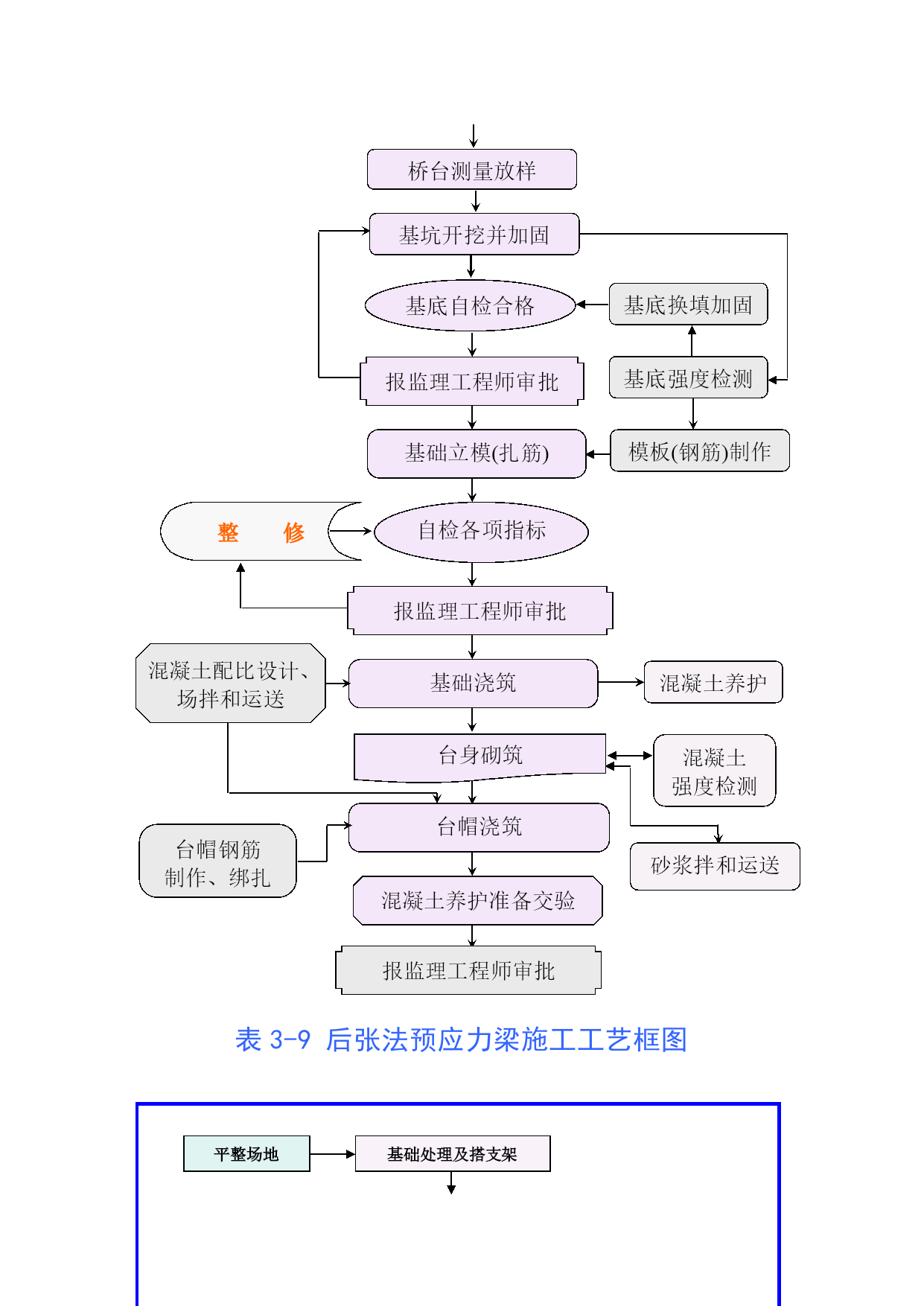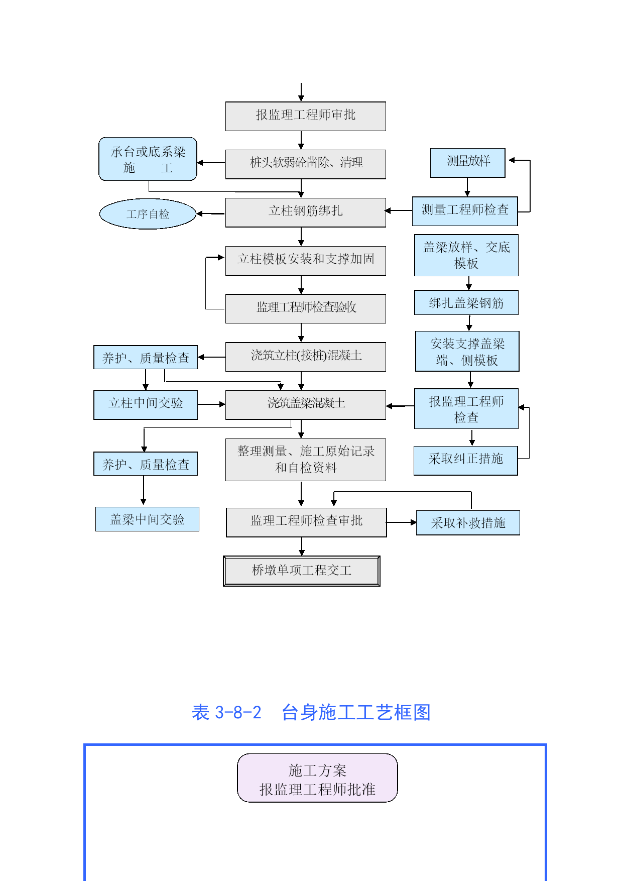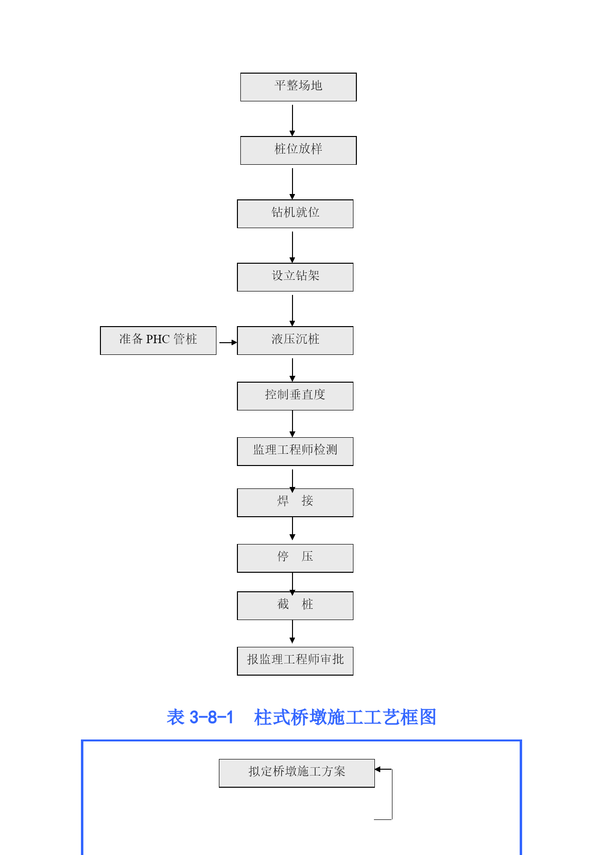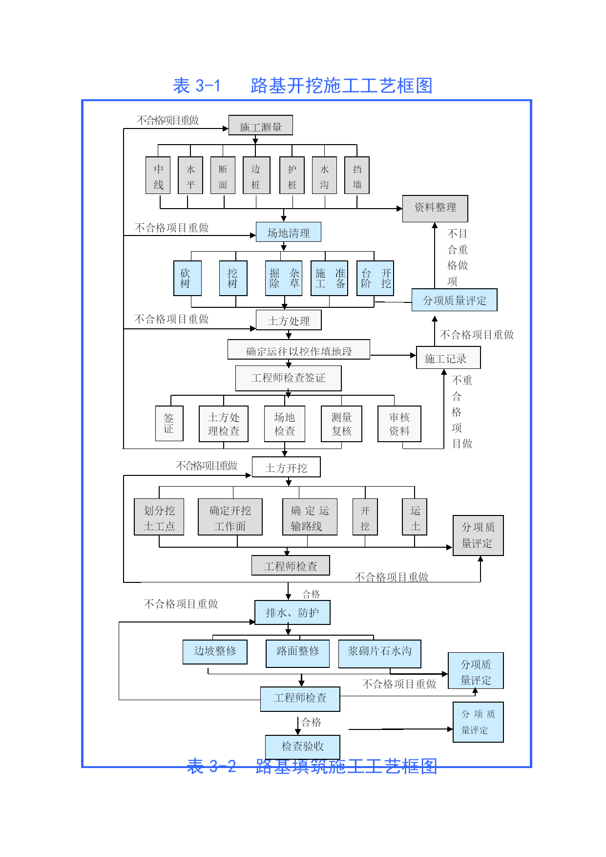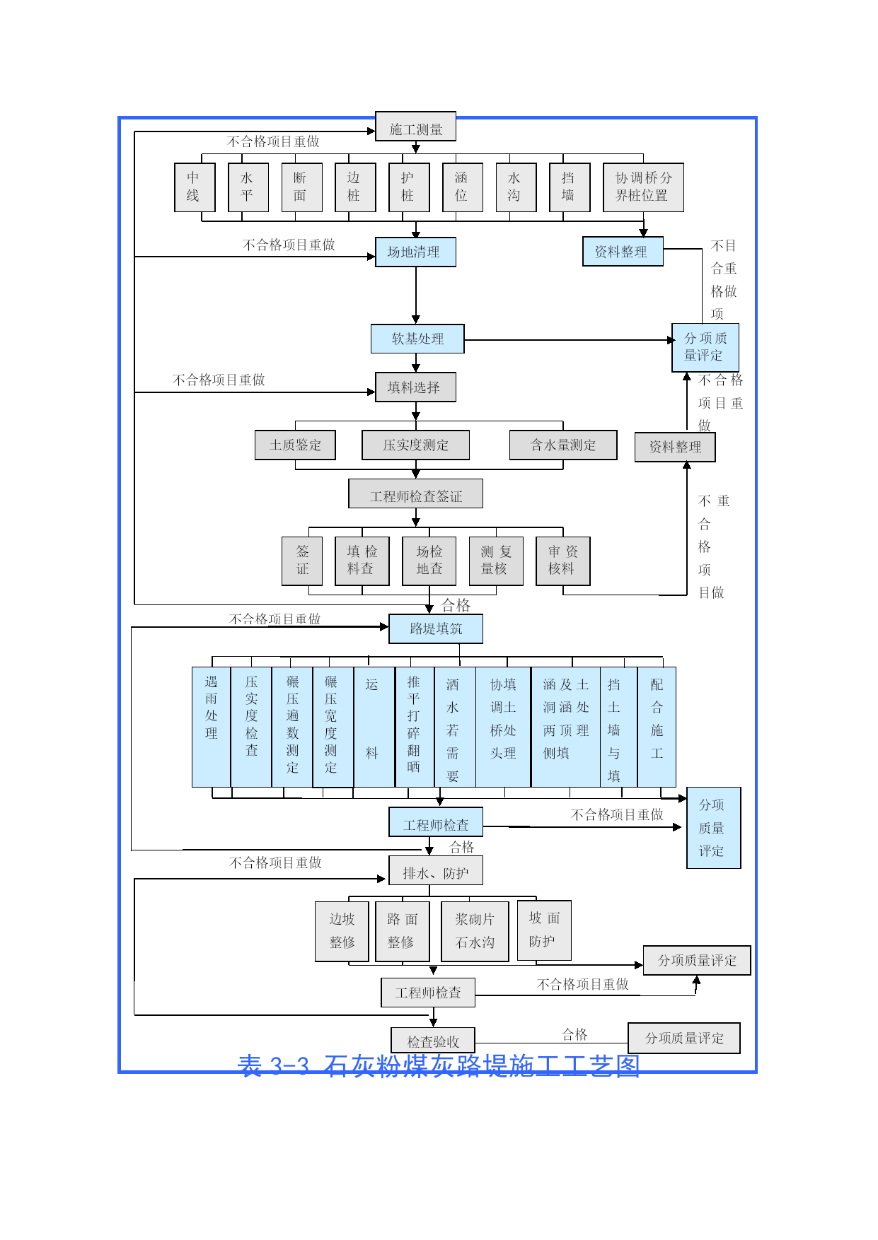 表3-1路基开挖施工工艺框图施工测量不合格项目重做断面护桩水沟挡墙边桩水平中线资料整理不合格项目重做场地清理不目合重格做项准备施工开挖台阶杂草掘除挖树砍树分项质量评定土方处理不合格项目重做不合格项目重做施工记录确定运往以挖作填地段工程师检查签证不重合格项目做审核资料测量复核土方处理检查场地检查签证土方开挖不合格项目重做运土开挖确定运输路线确定开挖工作面划分挖土工点分项质量评定工程师检查不合格项目重做排水、防护不合格项目重做合格浆砌片石水沟路面整修边坡整修分项质量评定不合格项目重做分项质量评定工程师检查合格检查验收表3-2路基填筑施工工艺框图不合格项目重做施工测量协调桥分界桩位置挡墙水沟涵位护桩边桩断面水平中线不合格项目重做资料整理场地清理不目合重格做项软基处理分项质量评定不合格项目重做填料选择不合格项目重做资料整理含水量测定压实度测定土质鉴定工程师检查签证不重合格项目做审资核料测复量核场检地查填检料查签证合格不合格项目重做路堤填筑配合施工运料碾压宽度测定涵及土洞涵处两顶理侧填协填调土桥处头理挡土墙与填土洒水若需要推平打碎翻晒碾压遍数测定压实度检查遇雨处理分项质量评定工程师检查不合格项目重做合格排水、防护不合格项目重做边坡整修路面整修浆砌片石水沟坡面防护分项质量评定工程师检查不合格项目重做分项质量评定合格检查验收表3-3石灰粉煤灰路堤施工工艺图材料准备内边修直路肩放样人工整平路肩土推土机初平平地机精平备石灰布粉煤灰、稳压计量布石灰检测灰剂量检查含水量路拌机拌和压路机碾压报监理工程师审批养生覆盖养生石灰消解过筛表3-4石灰稳定土施工工艺框图准备下承层备石灰原材料选定试验选定土场石灰消解过筛配合比设计取土坑掺灰拌和扪料施工测量放样运料摊铺计量布灰检查含水量检测石灰剂量路拌机拌和推土机初平平地机精平洒水养生压路机碾压CBR值检测报监理工程师审批进入下道工序表3-5粉煤灰三渣基层施工工艺框图配合比设计备料报监理工程师审批混合料搅拌混和料运输高程控制铺筑试验段监理工程师检测组合调整高程控制摊铺碾压养生试验检测鉴证表3-6钻孔灌注桩工艺框图平整场地桩位放样制作护筒下沉、埋设护筒设立钻架和其他设备制作钻架钻机就位制作钻头供水向钻孔注清水或泥浆钻进测量钻孔深度、斜度、直径泥浆沉淀池泥浆池掏渣卸土焊钻头必要时设吊装骨架和导管的设备泥浆备料设立泥浆泵钻孔完成后必要时移走钻架设立钢筋骨架运输吊装钢筋骨架设立清孔设备清孔制作钢筋骨架制作模板设立必要的模板测量淤泥厚度制作导管试拼装检验导管设立导管混凝土检验设立溜槽储料斗测量混凝土面高度灌注水下混凝土制备混凝土输送混凝土需要拔除护筒保护层厚度导向钢管时拔除之混凝土养生拆除模板拔除护筒等设立拌和站混凝土备料表3-7PHC管桩施工工艺框图平整场地桩位放样钻机就位设立钻架准备PHC管桩液压沉桩控制垂直度监理工程师检测焊接停压截桩报监理工程师审批表3-8-1柱式桥墩施工工艺框图拟定桥墩施工方案报监理工程师审批承台或底系梁施工测量放样桩头软弱砼凿除、清理测量工程师检查工序自检立柱钢筋绑扎立柱模板安装和支撑加固绑扎盖梁钢筋监理工程师检查验收盖梁放样、交底模板安装支撑盖梁端、侧模板养护、质量检查浇筑立柱(接桩)混凝土报监理工程师检查立柱中间交验浇筑盖梁混凝土采