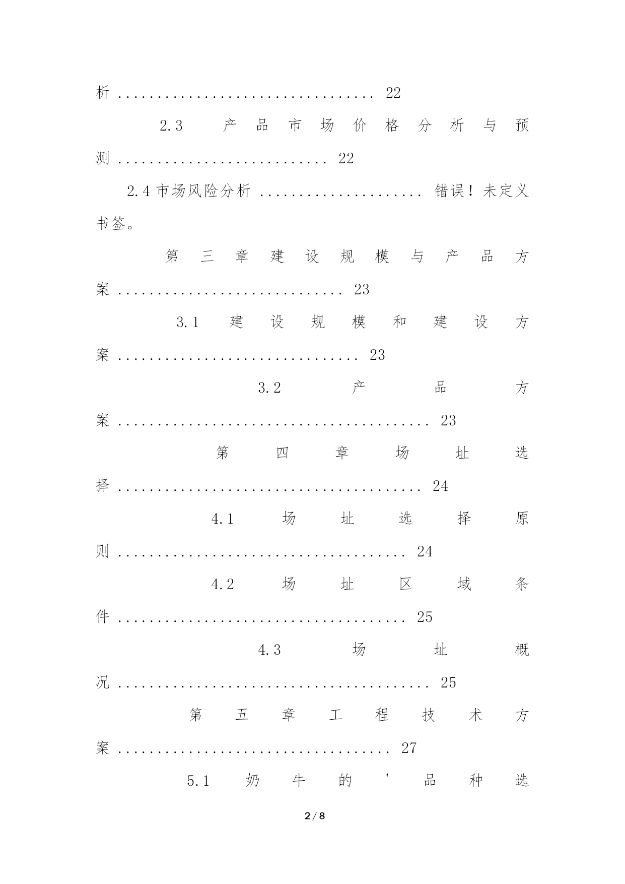 PAGE8/NUMPAGES8奶牛养殖场商业计划书目录奶牛养殖场商业计划书目录篇一:奶牛养殖场商业计划书目录第一章总论............................................61.1项目背景.........................................61.2项目概况........................................111.3问题与建议.......................................16第二章市场预测.......................................182.1产品市场供应预测.................................182.2产品目标市场分析.................................222.3产品市场价格分析与预测...........................222.4市场风险分析.....................错误!未定义书签。第三章建设规模与产品方案.............................233.1建设规模和建设方案...............................233.2产品方案........................................23第四章场址选择.......................................244.1场址选择原则.....................................244.2场址区域条件.....................................254.3场址概况........................................25第五章工程技术方案...................................275.1奶牛的'品种选择...................................275.2奶牛养殖规模及分群数量...........错误!未定义书签。5.3主要技术标准.....................错误!未定义书签。5.4奶牛繁育技术.....................错误!未定义书签。5.5挤奶方式........................错误!未定义书签。5.6设备方案........................错误!未定义书签。5.7工程方案........................错误!未定义书签。第六章主要原材料、燃料供应...........................386.1种畜供应........................................386.2饲料供应........................................386.3燃料供应........................................386.4原材料燃料需求表.................................38第七章总图运输及公用工程.............................407.1布臵原则........................................407.2场地分区与布臵...................................407.3运输............................................417.4公用辅助工程.....................................42第八章节能措施.......................................458.1节能措施........................................458.2能耗指标........................................46第九章防疫技术设施与保障体系.........................479.1防疫体系的建设目标...............................479.2奶牛疫病预防及控制技术...........................479.3防疫体系的构建...................................49第十章畜污无害化处理工程.............................5010.1无害化处理工艺...........