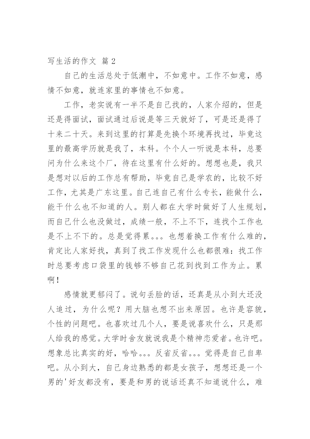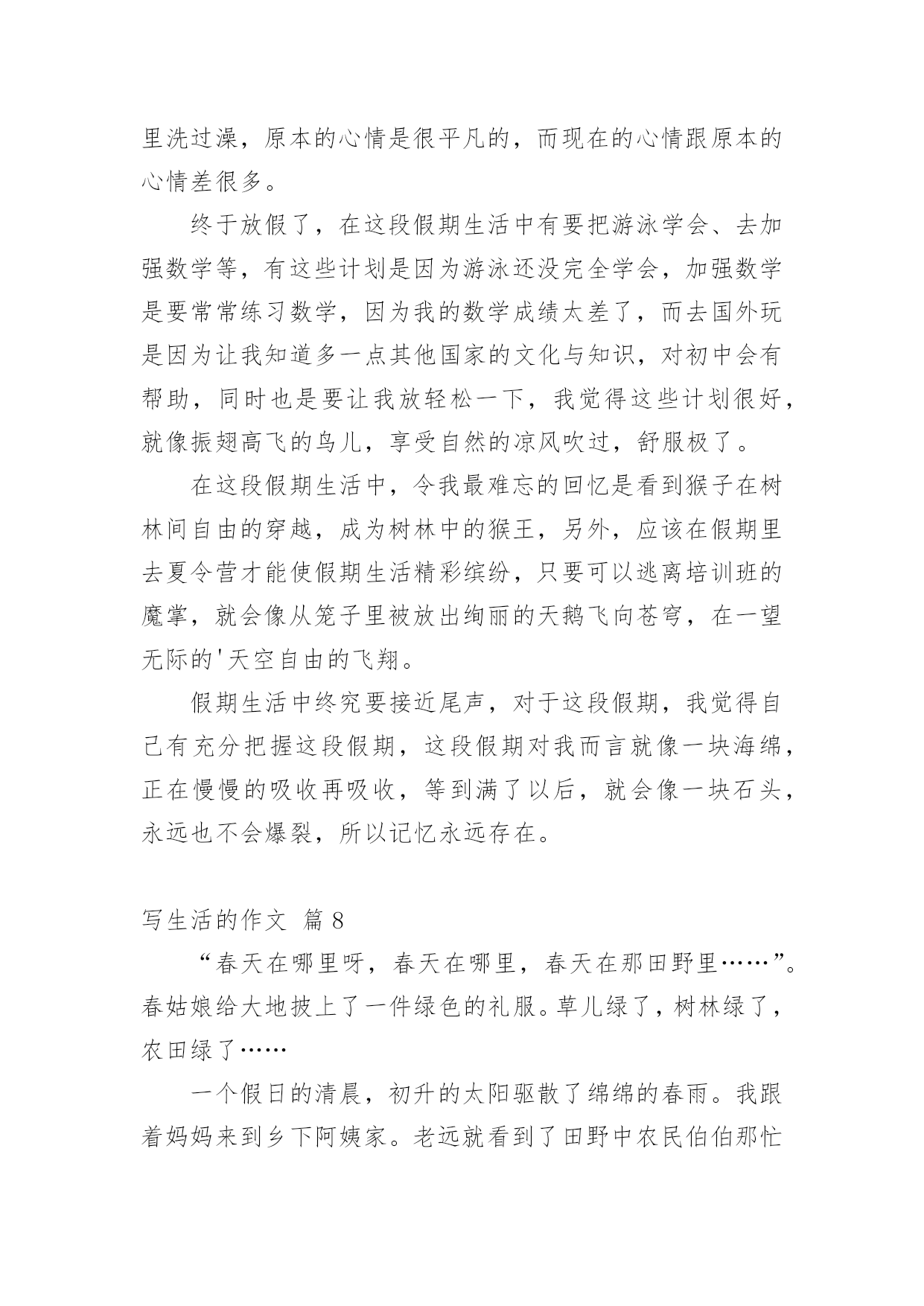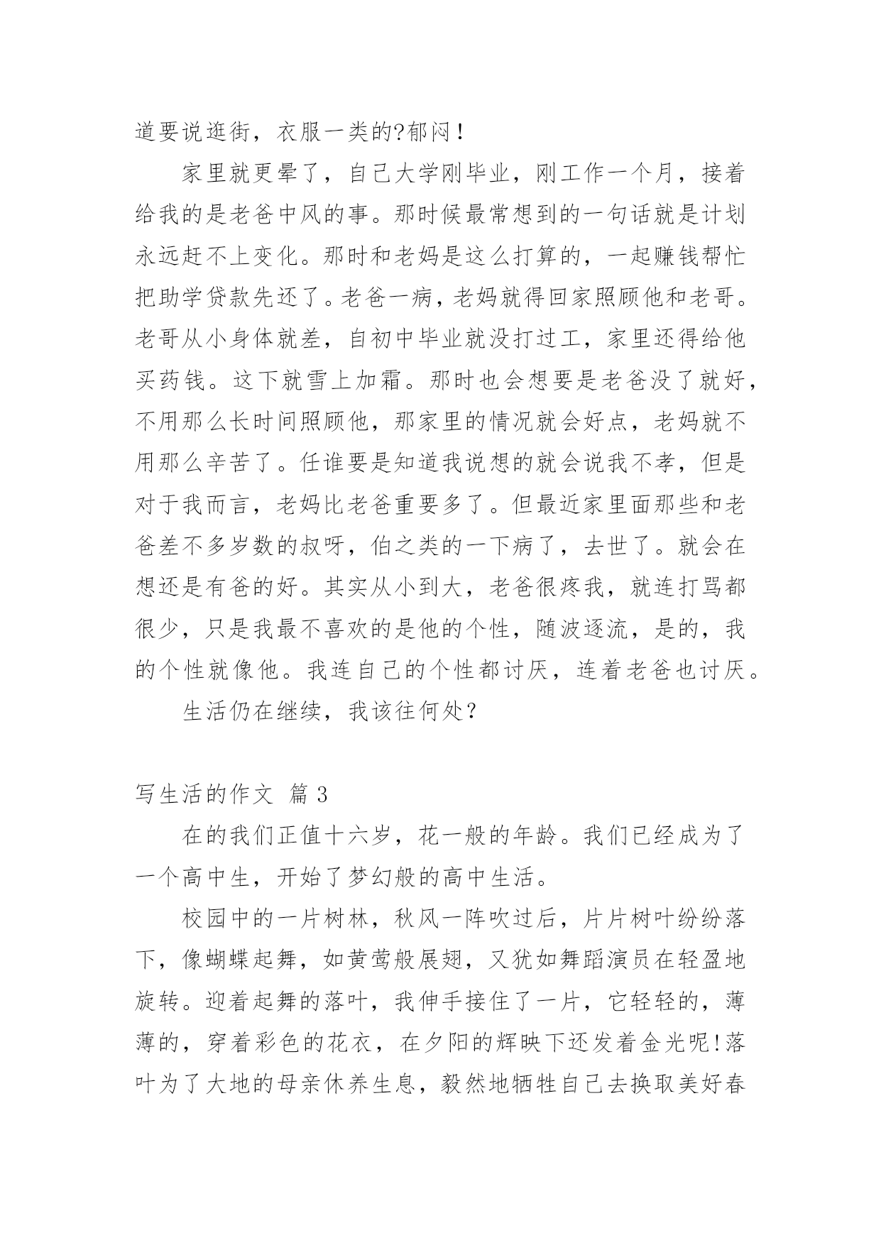 写生活的作文【必备】写生活的作文八篇无论是在学校还是在社会中,大家都不可避免地会接触到作文吧,作文是人们以书面形式表情达意的言语活动。一篇什么样的作文才能称之为优秀作文呢?下面是小编为大家收集的写生活的作文9篇,仅供参考,希望能够帮助到大家。写生活的作文篇1翻翻自己的课余生活记录,再回忆一下,我觉得自己的课余生活是丰富多彩的,很有趣,很有意义的。星期天,我完成各项作业之后,就主动打开电脑,玩游戏、上网看动画,看我的或者别人的博客,爸爸说小孩子不能长时间上网,那样对眼睛不好,我听了之后,不生气,不着急,把电脑让给爸爸,自己到楼下去找小朋友玩。这就是我的课余生活之一。下面还有我的课余生活之二。我上过许多兴趣班,有舞蹈班,英语班和书画班。但我最喜欢书画班。每到星期六,我都会兴高采烈,因为这是我上书画班的'日子。上午,我们在老师的指导下认真的练习书法,虽然练写字很辛苦,但是,听到老师和家长夸我字写得越来越好的时候,我心里总是乐滋滋的。这就是我丰富多彩的,又有意义的课余生活。你呢?让我们都来说说自己的课余生活吧!写生活的作文篇2自己的生活总处于低潮中,不如意中。工作不如意,感情不如意,就连家里的事情也不如意。工作,老实说有一半不是自己找的,人家介绍的,但是还是得面试,面试通过后说是等三天就好了,可是还是得了十来二十天。来到这里的打算是先换个环境再找过,毕竟这里的最高学历就是我了,本科。个个人一听说是本科,总要问为什么来这个厂,待在这里有什么好的。想想也是,我只是想对以后的工作总有帮助,毕竟自己是学农的,比较不好工作,尤其是广东这里。自己连自己有什么专长,能做什么,能干什么也不知道的人。别人都在大学时做好了人生规划,而自己什么也没做过,成绩一般,不上不下,连找个工作也是不上不下的。总是觉得累。。。也想着换工作有什么难的,肯定比人家好找,真到了找工作发现什么也都很难:找工作时总要考虑口袋里的钱够不够自己花到找到工作为止。累啊!感情就更郁闷了。说句丢脸的话,还真是从小到大还没人追过,为什么呢?用大脑也想不出来原因。也许是容貌,个性的问题吧。也喜欢过几个人,要是说喜欢什么,只是那人给我的感觉。大学时舍友就说我是个精神恋爱者。也许吧。想象总比真实的好,哈哈。。。反省反省。。。觉得是自己自卑吧。从小到大,自己身边熟悉的都是女孩子,想想还是一个男的'好友都没有,要是和男的说话还真不知道说什么,难道要说逛街,衣服一类的?郁闷!家里就更晕了,自己大学刚毕业,刚工作一个月,接着给我的是老爸中风的事。那时候最常想到的一句话就是计划永远赶不上变化。那时和老妈是这么打算的,一起赚钱帮忙把助学贷款先还了。老爸一病,老妈就得回家照顾他和老哥。老哥从小身体就差,自初中毕业就没打过工,家里还得给他买药钱。这下就雪上加霜。那时也会想要是老爸没了就好,不用那么长时间照顾他,那家里的情况就会好点,老妈就不用那么辛苦了。任谁要是知道我说想的就会说我不孝,但是对于我而言,老妈比老爸重要多了。但最近家里面那些和老爸差不多岁数的叔呀,伯之类的一下病了,去世了。就会在想还是有爸的好。其实从小到大,老爸很疼我,就连打骂都很少,只是我最不喜欢的是他的个性,随波逐流,是的,我的个性就像他。我连自己的个性都讨厌,连着老爸也讨厌。生活仍在继续,我该往何处?写生活的作文篇3在的我们正值十六岁,花一般的年龄。我们已经成为了一个高中生,开始了梦幻般的高中生活。校园中的一片树林,秋风一阵吹过后,片片树叶纷纷落下,像蝴蝶起舞,如黄莺般展翅,又犹如舞蹈演员在轻盈地旋转。迎着起舞的落叶,我伸手接住了一片,它轻轻的,薄薄的,穿着彩色的花衣,在夕阳的辉映下还发着金光呢!落叶为了大地的母亲休养生息,毅然地牺牲自己去换取美好春光的精神是多么令人敬佩啊!我们就是在这样一片美景之下的校园开始了丰富多彩的校园生活。每天,我们都会迎着朝阳的升起,而按时上操。最有趣的是,我们由做操而站着在那儿一动不动而改变的吧!跑操不仅使不爱锻炼的人得到了运动,而且也使得运动细胞活跃的同学得到了运动。最重要的是,使我们的身体素质得到了进一步的提升与保障。最精彩的还在后面。高中的生活节奏不仅比初中的生活节奏快,而且其生活形式比初中的丰富多了。高中部成立了许多文学社,许多学长学姐们都来征集许多学员报名参加文学社。而被录取的人则有机会进文学社进行写作。这不仅激发了许多文学安好者的写作兴趣,而且也使我们增长了见识,扩大了视野,使我们懂得了什么才是高中生活,也使我们充分认识到高中与初中的区别。我们每天都在不停地忙碌与奔波着,虽然很辛苦,但也为以后步入社会生活打下了坚实的基础。除了文学社,还成立了如蓝球、排球、足球等各类球赛。这不仅丰富了学生的.业余生活,也为某些球类爱好着提供了一个平台,让他们有了展示才能的机会。许多爱好者一放学,就开始在球场上尽情