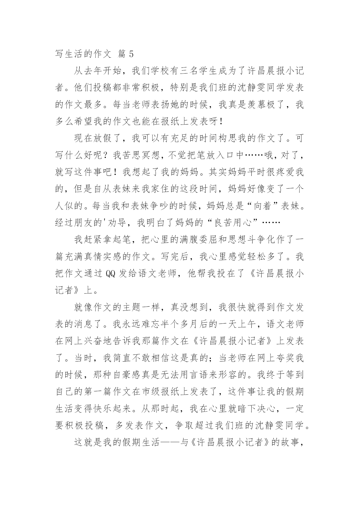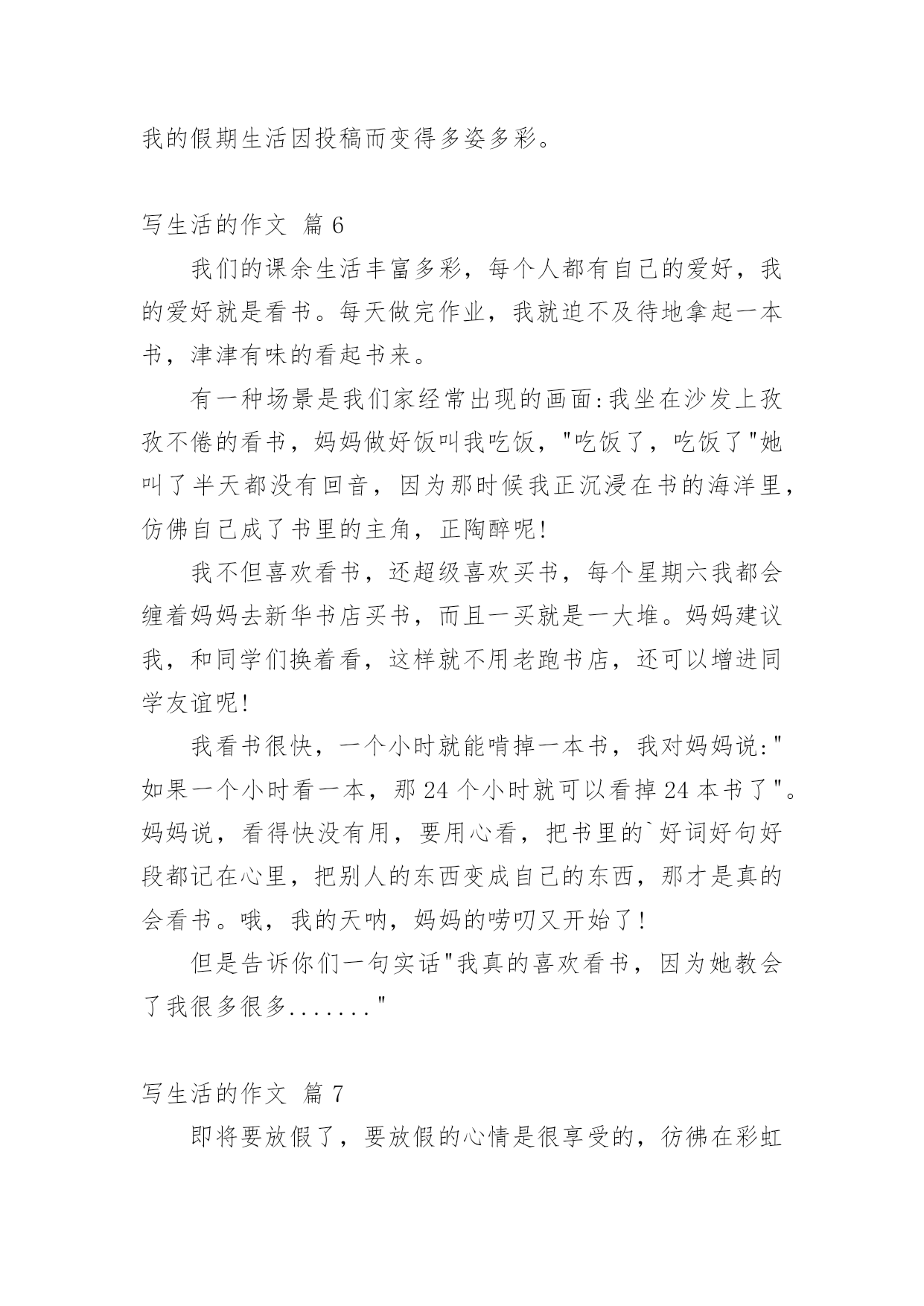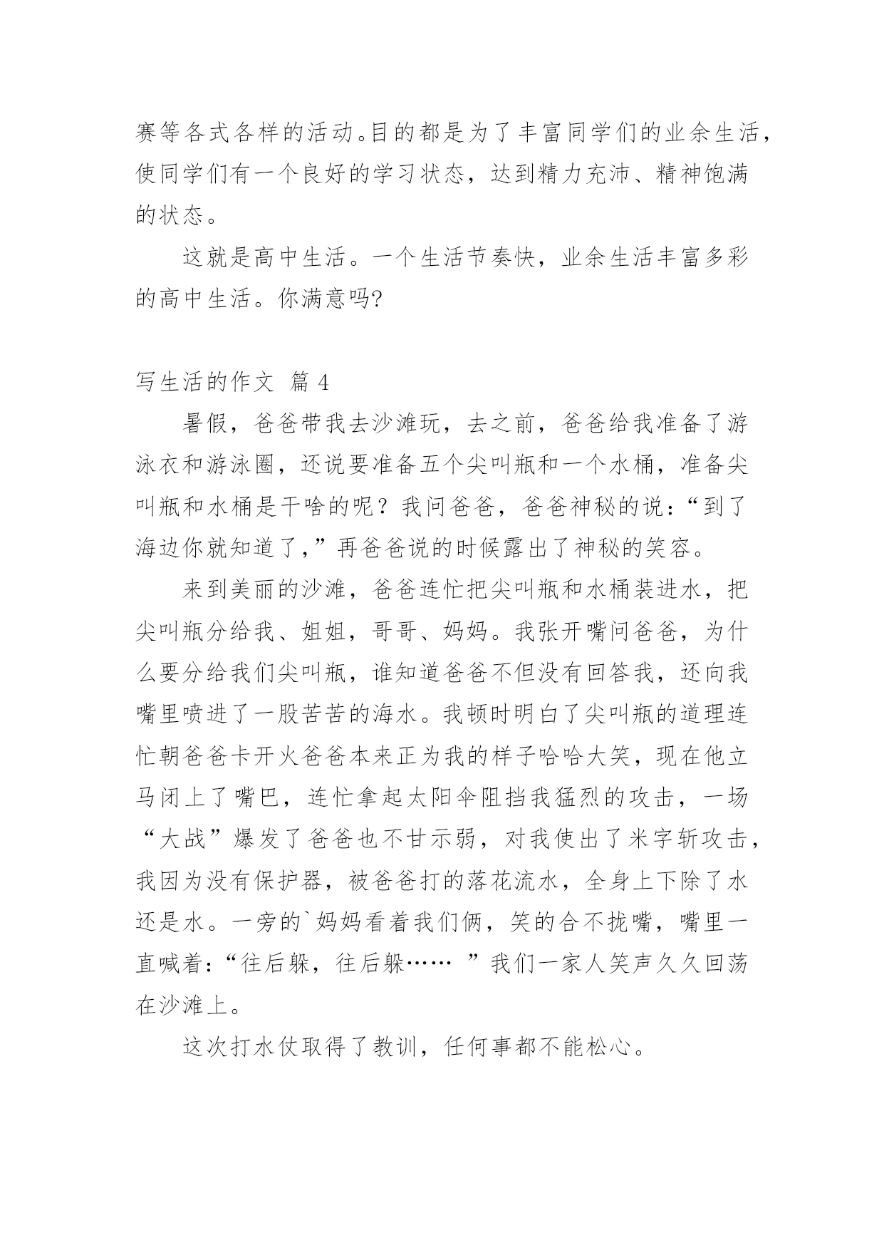 写生活的作文【必备】写生活的作文八篇无论是在学校还是在社会中,大家都不可避免地会接触到作文吧,作文是人们以书面形式表情达意的言语活动。一篇什么样的作文才能称之为优秀作文呢?下面是小编为大家收集的写生活的作文9篇,仅供参考,希望能够帮助到大家。写生活的作文篇1翻翻自己的课余生活记录,再回忆一下,我觉得自己的课余生活是丰富多彩的,很有趣,很有意义的。星期天,我完成各项作业之后,就主动打开电脑,玩游戏、上网看动画,看我的或者别人的博客,爸爸说小孩子不能长时间上网,那样对眼睛不好,我听了之后,不生气,不着急,把电脑让给爸爸,自己到楼下去找小朋友玩。这就是我的课余生活之一。下面还有我的课余生活之二。我上过许多兴趣班,有舞蹈班,英语班和书画班。但我最喜欢书画班。每到星期六,我都会兴高采烈,因为这是我上书画班的'日子。上午,我们在老师的指导下认真的练习书法,虽然练写字很辛苦,但是,听到老师和家长夸我字写得越来越好的时候,我心里总是乐滋滋的。这就是我丰富多彩的,又有意义的课余生活。你呢?让我们都来说说自己的课余生活吧!写生活的作文篇2自己的生活总处于低潮中,不如意中。工作不如意,感情不如意,就连家里的事情也不如意。工作,老实说有一半不是自己找的,人家介绍的,但是还是得面试,面试通过后说是等三天就好了,可是还是得了十来二十天。来到这里的打算是先换个环境再找过,毕竟这里的最高学历就是我了,本科。个个人一听说是本科,总要问为什么来这个厂,待在这里有什么好的。想想也是,我只是想对以后的工作总有帮助,毕竟自己是学农的,比较不好工作,尤其是广东这里。自己连自己有什么专长,能做什么,能干什么也不知道的人。别人都在大学时做好了人生规划,而自己什么也没做过,成绩一般,不上不下,连找个工作也是不上不下的。总是觉得累。。。也想着换工作有什么难的,肯定比人家好找,真到了找工作发现什么也都很难:找工作时总要考虑口袋里的钱够不够自己花到找到工作为止。累啊!感情就更郁闷了。说句丢脸的话,还真是从小到大还没人追过,为什么呢?用大脑也想不出来原因。也许是容貌,个性的问题吧。也喜欢过几个人,要是说喜欢什么,只是那人给我的感觉。大学时舍友就说我是个精神恋爱者。也许吧。想象总比真实的好,哈哈。。。反省反省。。。觉得是自己自卑吧。从小到大,自己身边熟悉的都是女孩子,想想还是一个男的'好友都没有,要是和男的说话还真不知道说什么,难道要说逛街,衣服一类的?郁闷!家里就更晕了,自己大学刚毕业,刚工作一个月,接着给我的是老爸中风的事。那时候最常想到的一句话就是计划永远赶不上变化。那时和老妈是这么打算的,一起赚钱帮忙把助学贷款先还了。老爸一病,老妈就得回家照顾他和老哥。老哥从小身体就差,自初中毕业就没打过工,家里还得给他买药钱。这下就雪上加霜。那时也会想要是老爸没了就好,不用那么长时间照顾他,那家里的情况就会好点,老妈就不用那么辛苦了。任谁要是知道我说想的就会说我不孝,但是对于我而言,老妈比老爸重要多了。但最近家里面那些和老爸差不多岁数的叔呀,伯之类的一下病了,去世了。就会在想还是有爸的好。其实从小到大,老爸很疼我,就连打骂都很少,只是我最不喜欢的是他的个性,随波逐流,是的,我的个性就像他。我连自己的个性都讨厌,连着老爸也讨厌。生活仍在继续,我该往何处?写生活的作文篇3在的我们正值十六岁,花一般的年龄。我们已经成为了一个高中生,开始了梦幻般的高中生活。校园中的一片树林,秋风一阵吹过后,片片树叶纷纷落下,像蝴蝶起舞,如黄莺般展翅,又犹如舞蹈演员在轻盈地旋转。迎着起舞的落叶,我伸手接住了一片,它轻轻的,薄薄的,穿着彩色的花衣,在夕阳的辉映下还发着金光呢!落叶为了大地的母亲休养生息,毅然地牺牲自己去换取美好春光的精神是多么令人敬佩啊!我们就是在这样一片美景之下的校园开始了丰富多彩的校园生活。每天,我们都会迎着朝阳的升起,而按时上操。最有趣的是,我们由做操而站着在那儿一动不动而改变的吧!跑操不仅使不爱锻炼的人得到了运动,而且也使得运动细胞活跃的同学得到了运动。最重要的是,使我们的身体素质得到了进一步的提升与保障。最精彩的还在后面。高中的生活节奏不仅比初中的生活节奏快,而且其生活形式比初中的丰富多了。高中部成立了许多文学社,许多学长学姐们都来征集许多学员报名参加文学社。而被录取的人则有机会进文学社进行写作。这不仅激发了许多文学安好者的写作兴趣,而且也使我们增长了见识,扩大了视野,使我们懂得了什么才是高中生活,也使我们充分认识到高中与初中的区别。我们每天都在不停地忙碌与奔波着,虽然很辛苦,但也为以后步入社会生活打下了坚实的基础。除了文学社,还成立了如蓝球、排球、足球等各类球赛。这不仅丰富了学生的.业余生活,也为某些球类爱好着提供了一个平台,让他们有了展示才能的机会。许多爱好者一放学,就开始在球场上尽情