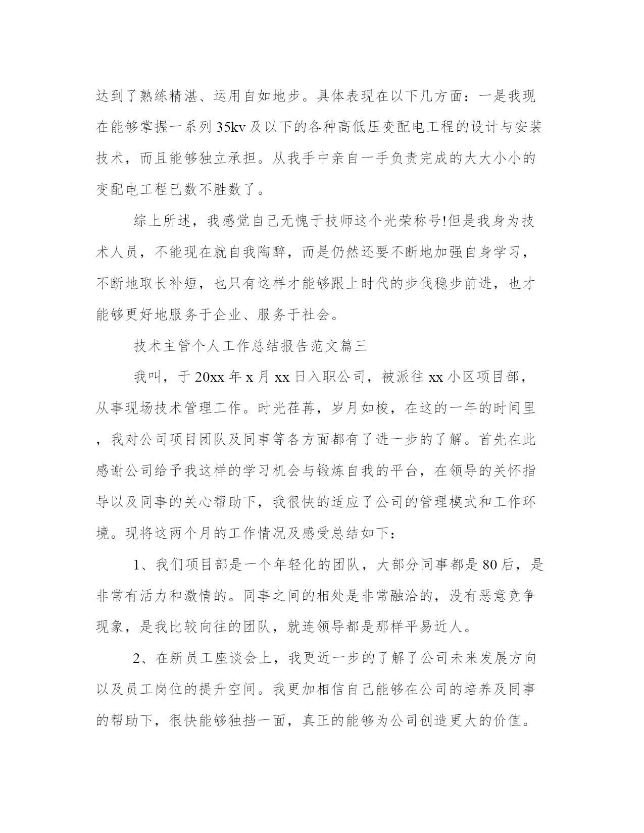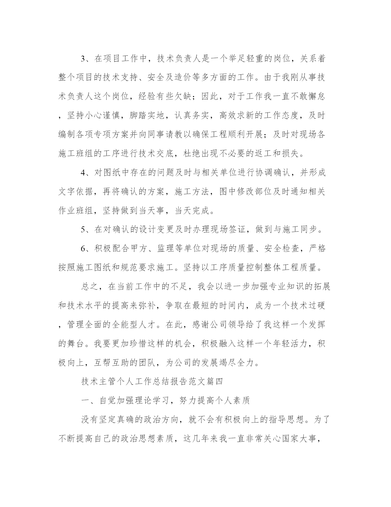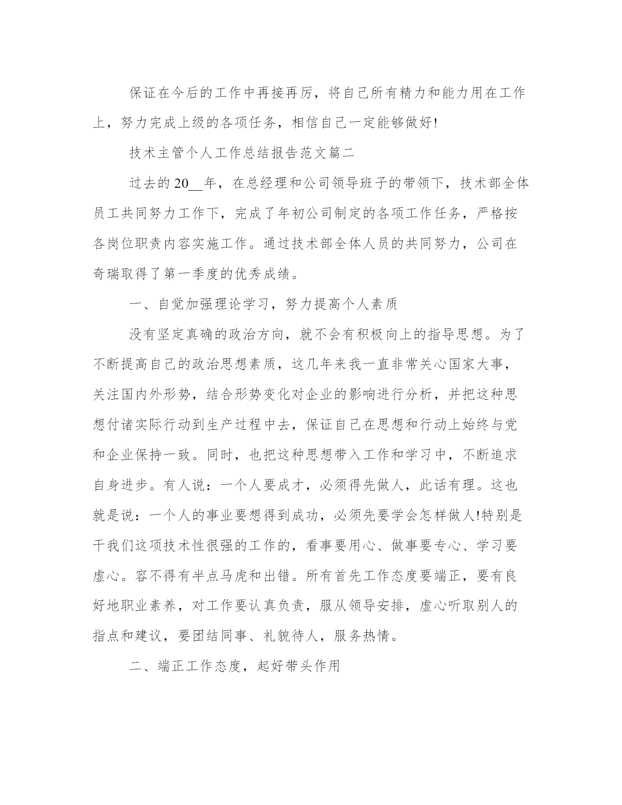 技术主管个人工作总结报告范文(十二篇)在经济发展迅速的今天,报告不再是罕见的东西,报告中提到的所有信息应该是准确无误的。那么报告应该怎么制定才合适呢?以下是我为大家搜集的报告范文,仅供参考,一起来看看吧技术主管个人工作总结报告范文篇一一、端正工作态度,提高思想认识。在夏阔坦项目部负责技术工作近两年了,虽然我的职位始终没有解决,我仍然以百分百的热情投入到工作中去,严以律己,严格要求自己,摆正心态,时刻保持“谦虚、谨慎、律己”工作态度,在领导关心培养和同事们的帮助下,努力提高自我,认真完成任务,履行好岗位职责。20__年9月之前,夏阔坦项目部包括我在内只有3名技术人员,我们共同负责项目部的测量放线,措施编制,技术指导,地质预测等工作,严格把握施工质量,做好各类软件资料的收集整理等,特别是在主副斜井井筒相继触底后,技术上的要求更加严格,更加广泛深入,对二期施工的通风系统、提升系统、排矸系统、设备选型等问题,积极从技术方面协助项目部领导做好计划安排,当好参谋,当好助手。二、加强学习,提高技术能力。在去年通过努力,我顺利考上了武汉科技大学的本科函授矿建专业,在平时工作之余,对与煤矿相关的安全、生产、规范、规定等方面的内容仔细分析,为指导规范施工做好基础工作。揭煤防突工作是我们以前在施工中很少遇到的问题,思想汇报专题在主副井揭煤期间,充分抓住这次机会,积极向煤科院的专业人员学习这方面知识,记录防治突出的有效措施和全过程,增强这方面技能。三、关注生产,参与生产,提高管理能力。密切关注生产,参与生产,参与项目部的日常管理工作,做到对工作面施工情况了然于心,熟知每道工序安排,人员调整,提高个人管理能力。四、与项目部全体职工团结一致,共同努力,将主、副斜井井筒平平安安施工完成,并且顺利转至二期巷道施工。五、由于工作性质原因,我在平时的工作中与矿方和监理的联系最为频繁,总体上保持了与矿方和监理方良好的沟通,充分尊重矿方和监理方的意愿,准确将我们的要求反应给矿方,保证项目部正常施工。回顾一年来的工作,既取得了一些成绩,还存在着一些不足:专业知识不足,技术相对不够过硬,还学要继续加强学习;工作中存在拖拉倾向等等。在今后工作中,我会不断强化自己工作能力,把不利因素在自己以后工作中排除,我相信通过我的努力和同事们的支持,以及领导们的指导,我会成为一名优秀员工,充分发挥我个人能力。同时也感谢领导给我这样一个锻炼人的工作位置,让我能为公司做出自己贡献的同时,也快速提高了个人能力。保证在今后的工作中再接再厉,将自己所有精力和能力用在工作上,努力完成上级的各项任务,相信自己一定能够做好!技术主管个人工作总结报告范文篇二过去的20__年,在总经理和公司领导班子的带领下,技术部全体员工共同努力工作下,完成了年初公司制定的各项工作任务,严格按各岗位职责内容实施工作。通过技术部全体人员的共同努力,公司在奇瑞取得了第一季度的优秀成绩。一、自觉加强理论学习,努力提高个人素质没有坚定真确的政治方向,就不会有积极向上的指导思想。为了不断提高自己的政治思想素质,这几年来我一直非常关心国家大事,关注国内外形势,结合形势变化对企业的影响进行分析,并把这种思想付诸实际行动到生产过程中去,保证自己在思想和行动上始终与党和企业保持一致。同时,也把这种思想带入工作和学习中,不断追求自身进步。有人说:一个人要成才,必须得先做人,此话有理。这也就是说:一个人的事业要想得到成功,必须先要学会怎样做人!特别是干我们这项技术性很强的工作的,看事要用心、做事要专心、学习要虚心。容不得有半点马虎和出错。所有首先工作态度要端正,要有良好地职业素养,对工作要认真负责,服从领导安排,虚心听取别人的指点和建议,要团结同事、礼貌待人,服务热情。二、端正工作态度,起好带头作用自从进入公司参加工作开始,我就从事所有了所有的机电事务,包括所有基建时期的安全和质量的监督巡查。我深知机电管理工作在建设期间的重要性,特别是含有大部分隐形的电器基础设施与工程,要随时监督检查,发现问题就必须解决问题,决不能草草了事,否则后患无穷且再无法根除,这就摆机我们作机电管理的面前是一种考验和责任。作为我是一位机电班班长和一名电工技师,身上的责任和重担我义不容辞。因此,在平时的工作中,我不仅要求自己班组成员在监督巡查时,要认真仔细,做到一丝不苟,而且自己还深知打铁还须自身硬的道理。我对我自己做出了这样一些严格要求:一要在遇到脏累苦险的工作时抢在工人前头干,而且要比工人干的多、下得力;二要在遇到技术性难题是挺身而出,尽自己的努力攻克技术难关;我始终坚持以尽我努力做好每件事,以公司利益为重。包括建成后的生产过程中,有时是抢时间争分夺秒地处理了大大小小的电气设备故障有几十起,为公司赢取了宝贵的生产时间,为公司的发