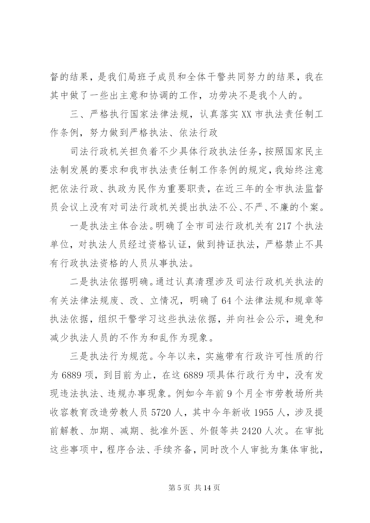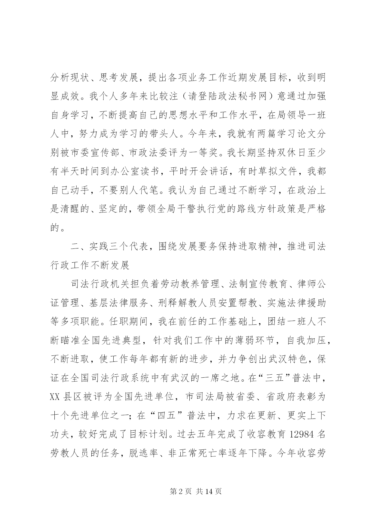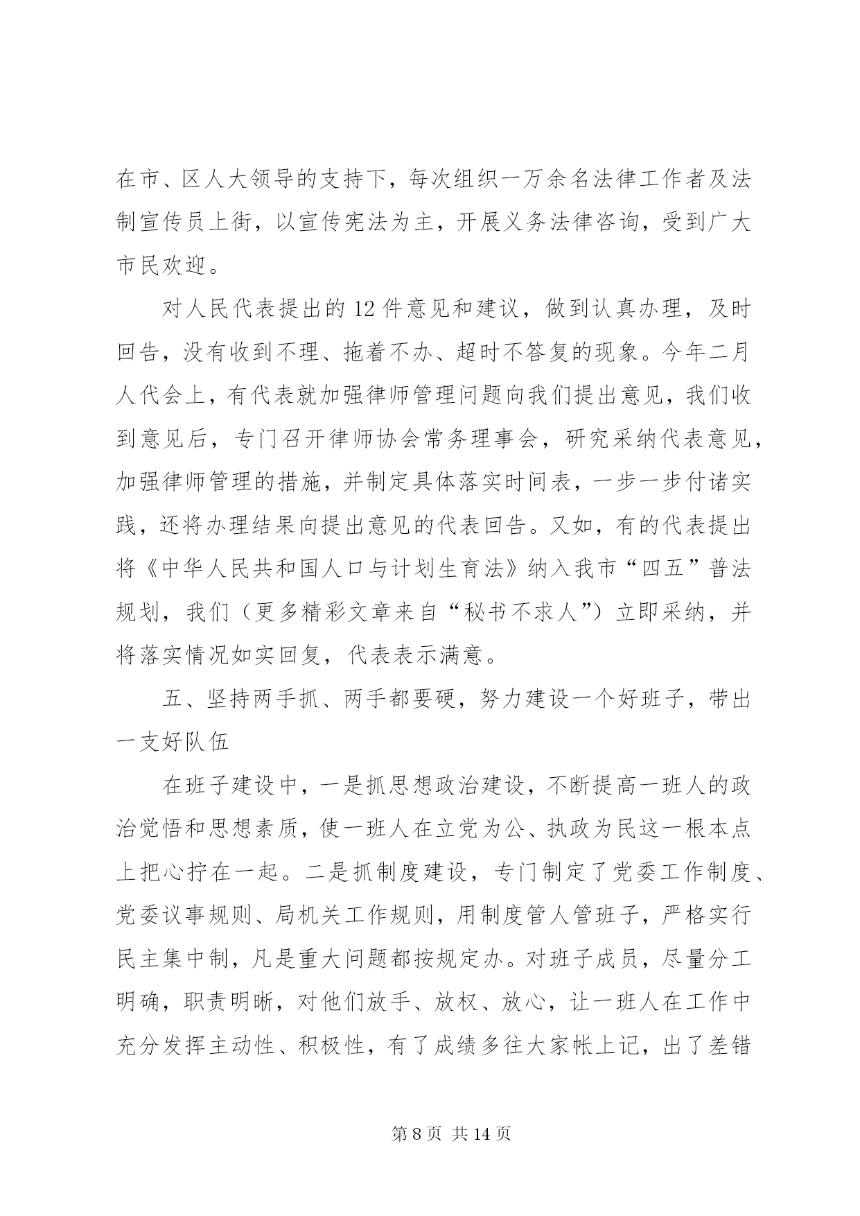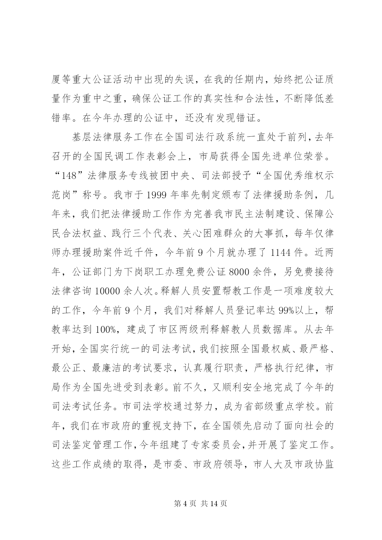 第PAGE\*Arabic\*MERGEFORMAT14页共NUMPAGES\*MERGEFORMAT14页述职报告(司法局)述职报告(司法局)主任、各位副主任、秘书长、各位委员4:我是在上届任市司法局局长五年期满后,本届继续任市司法局局长的。任职期间,在市委、市政府的领导下,在市人大和市政协的监督下,我做了一些工作,但也存在比较明显的问题。现在我作如下述职报告,请予评议。一、认真学习马列主义、毛泽东思想、邓小平理论和三个代表重要思想,自觉保持政治上的清醒和坚定我深知作为市司法局局长,肩负的任务繁重,责任重大,工作千头万绪。为了不辜负人民的重托,必须把努力学习和认真实践马列主义、毛泽东思想、邓小平理论和三个代表重要思想放在头等重要的位置,不断保持政治上的清醒与坚定,带领全市司法行政干警认真贯彻党的路线、方针、政策,与党中央保持一致,保证司法行政工作朝着正确的方向努力和发展;不管是在上届任期还是本届履职以来,我都是这样想、这样做的。在全党开展的“三讲”教育中,我们不走过场,注重实效,曾在全市大会上介绍了我们的经验和体会。党委中心组的学习情况曾两次在市委宣传部组织的经验交流会上发言。今年中央倡导进一步掀起学习三个代表重要思想新高潮,我们在过去学习的基础上,围绕深刻领会和认真实践执政为民这个主题,结合司法行政工作实际,认真分析现状、思考发展,提出各项业务工作近期发展目标,收到明显成效。我个人多年来比较注(请登陆政法秘书网)意通过加强自身学习,不断提高自己的思想水平和工作水平,在局领导一班人中,努力成为学习的带头人。今年来,我就有两篇学习论文分别被市委宣传部、市政法委评为一等奖。我长期坚持双休日至少有半天时间到办公室读书,平时开会讲话,有时草拟文件,我都自己动手,不要别人代笔。我认为自己通过不断学习,在政治上是清醒的、坚定的,带领全局干警执行党的路线方针政策是严格的。二、实践三个代表,围绕发展要务保持进取精神,推进司法行政工作不断发展司法行政机关担负着劳动教养管理、法制宣传教育、律师公证管理、基层法律服务、刑释解教人员安置帮教、实施法律援助等多项职能。任职期间,我在前任的工作基础上,团结一班人不断瞄准全国先进典型,针对我们工作中的薄弱环节,自我加压,不断进取,使工作每年都有新的进步,并力争创出武汉特色,保证在全国司法行政系统中有武汉的一席之地。在“三五”普法中,XX县区被评为全国先进单位,市司法局被省委、省政府表彰为十个先进单位之一;在“四五”普法中,力求在更新、更实上下功夫,较好完成了目标计划。过去五年完成了收容教育12984名劳教人员的任务,脱逃率、非正常死亡率逐年下降。今年收容劳教人员5720名,到目前为止脱逃率、非正常死亡率和事故率为零,创历史最好水平。在与×××邪教作斗争中,共收容教育“×××”劳教人员754名,没有发生一起死、伤、残、逃事故,转化率达到95%以上,受到司法部表彰。今年,按照司法部提出的劳教工作改革的思路,大胆在全省、全国率先试点,以强化人性化管理为基本特征,改变过去劳教管理近似监狱管理的模式,创办劳教工作特色。在十月份全国劳教工作会议上,我们介绍了经验,十一月份又在司法部召开的大会上介绍了经验。五个劳教所中有一个全国文明劳教所,一个省级文明劳教所。近年来,我们顺利完成了全市律师事务所从国办所转为合伙所、合作所的改制任务,律师从业人数、办理的法律事务逐年上升,到目前为止,市、区律师达到800余人,担任2200余家的法律顾问,每年办理法律事务近2万件。我们组织律师捐款近30万元,在XX县区建起一所律师希望小学。得伟律师事务所荣获部级文明律师事务所和全国青年文明号称号。今年,我们针对我市政法战线出现的几起案件所暴露出的律师在执业中违法违纪的问题,在全市律师队伍中开展为期半年的教育整顿,对整顿情况一个所一个所的进行检查验收,对揭露出的问题,正在逐一核实,将依法依纪严肃处理。公证工作不断适应市场经济发展,服务领域不断拓宽。近年来,全市每年办证10万余件,今年前9个月办证89419件,市公证处是全国现代化文明公证处。针对过去公证工作在青年大厦等重大公证活动中出现的失误,在我的任期内,始终把公证质量作为重中之重,确保公证工作的真实性和合法性,不断降低差错率。在今年办理的公证中,还没有发现错证。基层法律服务工作在全国司法行政系统一直处于前列,去年召开的全国民调工作表彰会上,市局获得全国先进单位荣誉。“148”法律服务专线被团中央、司法部授予“全国优秀维权示范岗”称号。我市于1999年率先制定颁布了法律援助条例,几年来,我们把法律援助工作作为完善我市民主法制建设、保障公民合法权益、践行三个代表、关心困难群众的大事抓,每年仅律师办理援助案件近千件,今年前9个月就办理了1144件。近两年,公证部门为下岗