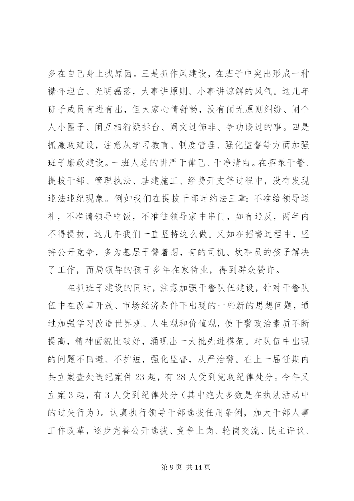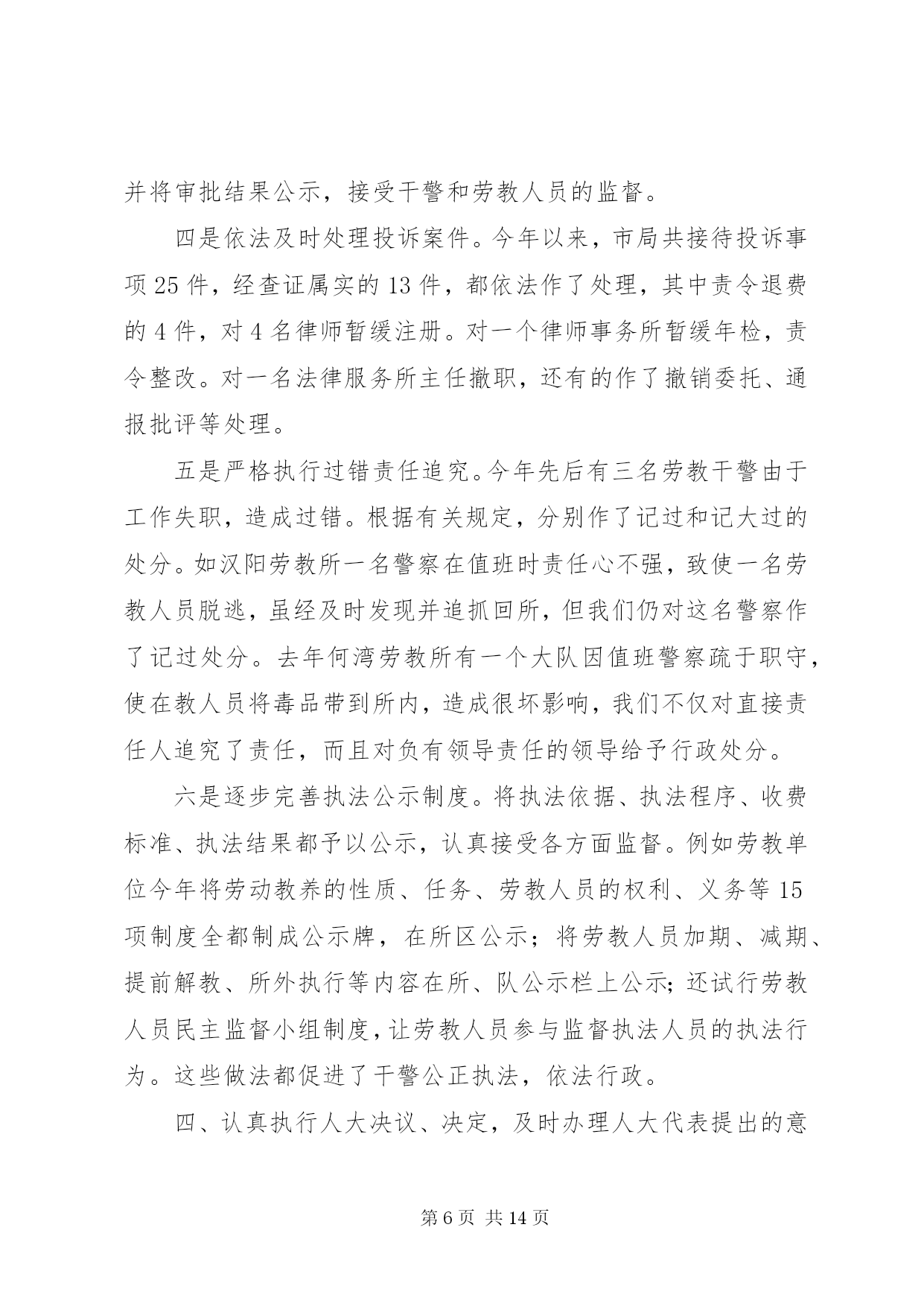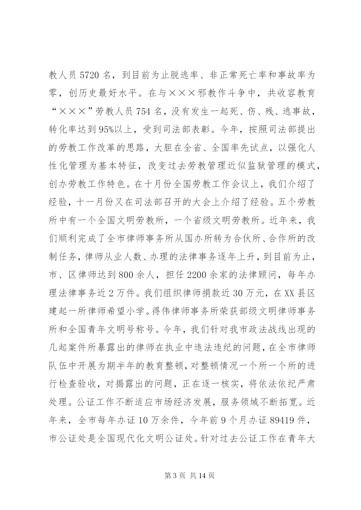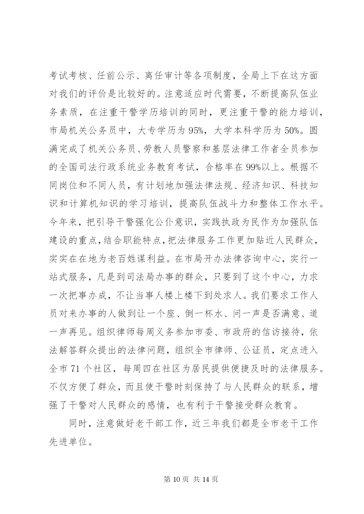 第PAGE\*Arabic\*MERGEFORMAT14页共NUMPAGES\*MERGEFORMAT14页述职报告(司法局)述职报告(司法局)主任、各位副主任、秘书长、各位委员4:我是在上届任市司法局局长五年期满后,本届继续任市司法局局长的。任职期间,在市委、市政府的领导下,在市人大和市政协的监督下,我做了一些工作,但也存在比较明显的问题。现在我作如下述职报告,请予评议。一、认真学习马列主义、毛泽东思想、邓小平理论和三个代表重要思想,自觉保持政治上的清醒和坚定我深知作为市司法局局长,肩负的任务繁重,责任重大,工作千头万绪。为了不辜负人民的重托,必须把努力学习和认真实践马列主义、毛泽东思想、邓小平理论和三个代表重要思想放在头等重要的位置,不断保持政治上的清醒与坚定,带领全市司法行政干警认真贯彻党的路线、方针、政策,与党中央保持一致,保证司法行政工作朝着正确的方向努力和发展;不管是在上届任期还是本届履职以来,我都是这样想、这样做的。在全党开展的“三讲”教育中,我们不走过场,注重实效,曾在全市大会上介绍了我们的经验和体会。党委中心组的学习情况曾两次在市委宣传部组织的经验交流会上发言。今年中央倡导进一步掀起学习三个代表重要思想新高潮,我们在过去学习的基础上,围绕深刻领会和认真实践执政为民这个主题,结合司法行政工作实际,认真分析现状、思考发展,提出各项业务工作近期发展目标,收到明显成效。我个人多年来比较注(请登陆政法秘书网)意通过加强自身学习,不断提高自己的思想水平和工作水平,在局领导一班人中,努力成为学习的带头人。今年来,我就有两篇学习论文分别被市委宣传部、市政法委评为一等奖。我长期坚持双休日至少有半天时间到办公室读书,平时开会讲话,有时草拟文件,我都自己动手,不要别人代笔。我认为自己通过不断学习,在政治上是清醒的、坚定的,带领全局干警执行党的路线方针政策是严格的。二、实践三个代表,围绕发展要务保持进取精神,推进司法行政工作不断发展司法行政机关担负着劳动教养管理、法制宣传教育、律师公证管理、基层法律服务、刑释解教人员安置帮教、实施法律援助等多项职能。任职期间,我在前任的工作基础上,团结一班人不断瞄准全国先进典型,针对我们工作中的薄弱环节,自我加压,不断进取,使工作每年都有新的进步,并力争创出武汉特色,保证在全国司法行政系统中有武汉的一席之地。在“三五”普法中,XX县区被评为全国先进单位,市司法局被省委、省政府表彰为十个先进单位之一;在“四五”普法中,力求在更新、更实上下功夫,较好完成了目标计划。过去五年完成了收容教育12984名劳教人员的任务,脱逃率、非正常死亡率逐年下降。今年收容劳教人员5720名,到目前为止脱逃率、非正常死亡率和事故率为零,创历史最好水平。在与×××邪教作斗争中,共收容教育“×××”劳教人员754名,没有发生一起死、伤、残、逃事故,转化率达到95%以上,受到司法部表彰。今年,按照司法部提出的劳教工作改革的思路,大胆在全省、全国率先试点,以强化人性化管理为基本特征,改变过去劳教管理近似监狱管理的模式,创办劳教工作特色。在十月份全国劳教工作会议上,我们介绍了经验,十一月份又在司法部召开的大会上介绍了经验。五个劳教所中有一个全国文明劳教所,一个省级文明劳教所。近年来,我们顺利完成了全市律师事务所从国办所转为合伙所、合作所的改制任务,律师从业人数、办理的法律事务逐年上升,到目前为止,市、区律师达到800余人,担任2200余家的法律顾问,每年办理法律事务近2万件。我们组织律师捐款近30万元,在XX县区建起一所律师希望小学。得伟律师事务所荣获部级文明律师事务所和全国青年文明号称号。今年,我们针对我市政法战线出现的几起案件所暴露出的律师在执业中违法违纪的问题,在全市律师队伍中开展为期半年的教育整顿,对整顿情况一个所一个所的进行检查验收,对揭露出的问题,正在逐一核实,将依法依纪严肃处理。公证工作不断适应市场经济发展,服务领域不断拓宽。近年来,全市每年办证10万余件,今年前9个月办证89419件,市公证处是全国现代化文明公证处。针对过去公证工作在青年大厦等重大公证活动中出现的失误,在我的任期内,始终把公证质量作为重中之重,确保公证工作的真实性和合法性,不断降低差错率。在今年办理的公证中,还没有发现错证。基层法律服务工作在全国司法行政系统一直处于前列,去年召开的全国民调工作表彰会上,市局获得全国先进单位荣誉。“148”法律服务专线被团中央、司法部授予“全国优秀维权示范岗”称号。我市于1999年率先制定颁布了法律援助条例,几年来,我们把法律援助工作作为完善我市民主法制建设、保障公民合法权益、践行三个代表、关心困难群众的大事抓,每年仅律师办理援助案件近千件,今年前9个月就办理了1144件。近两年,公证部门为下岗