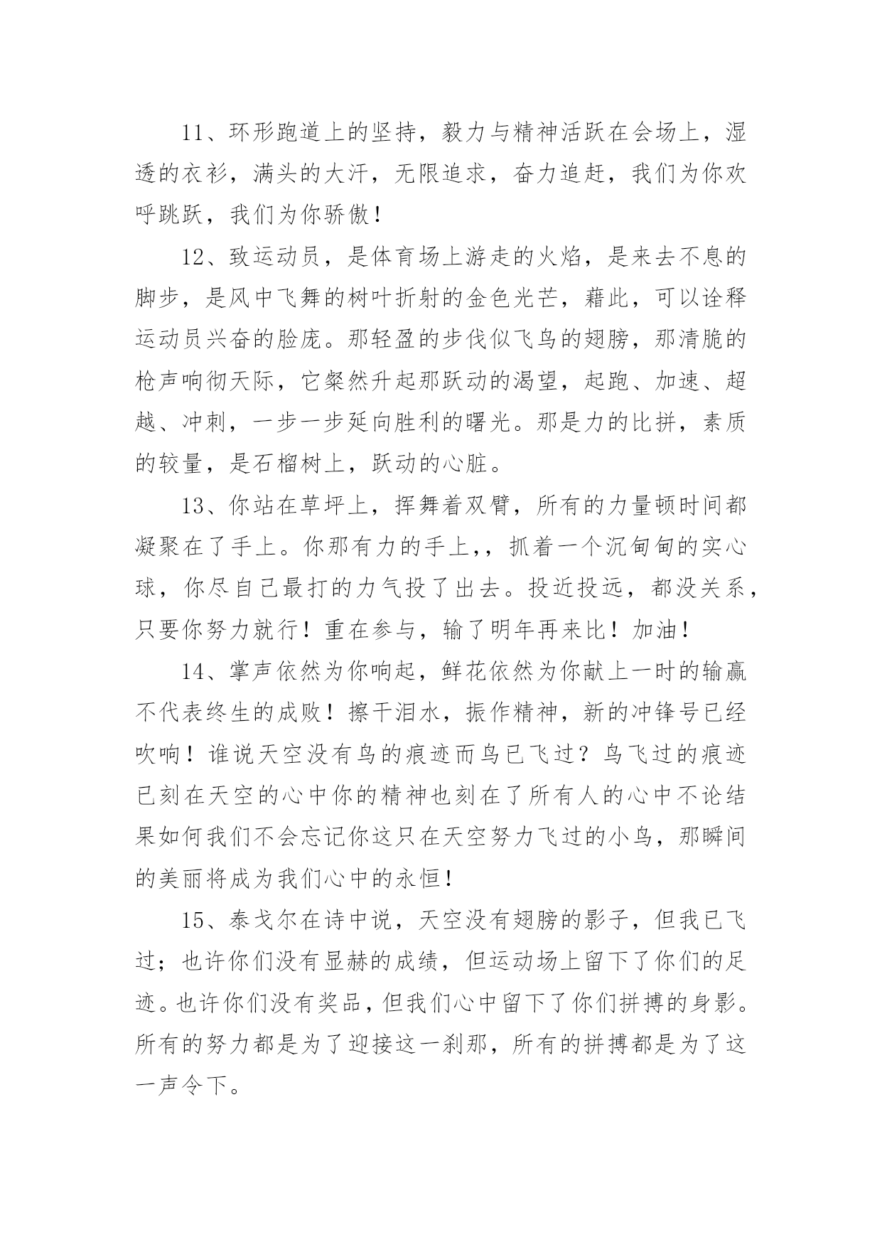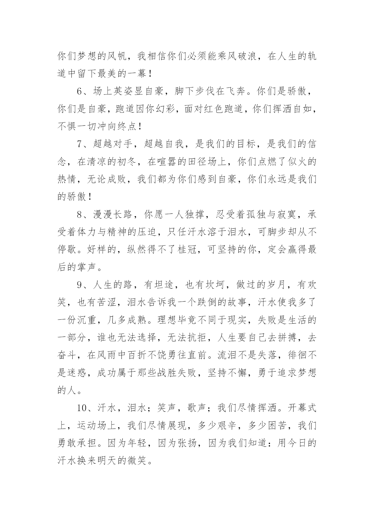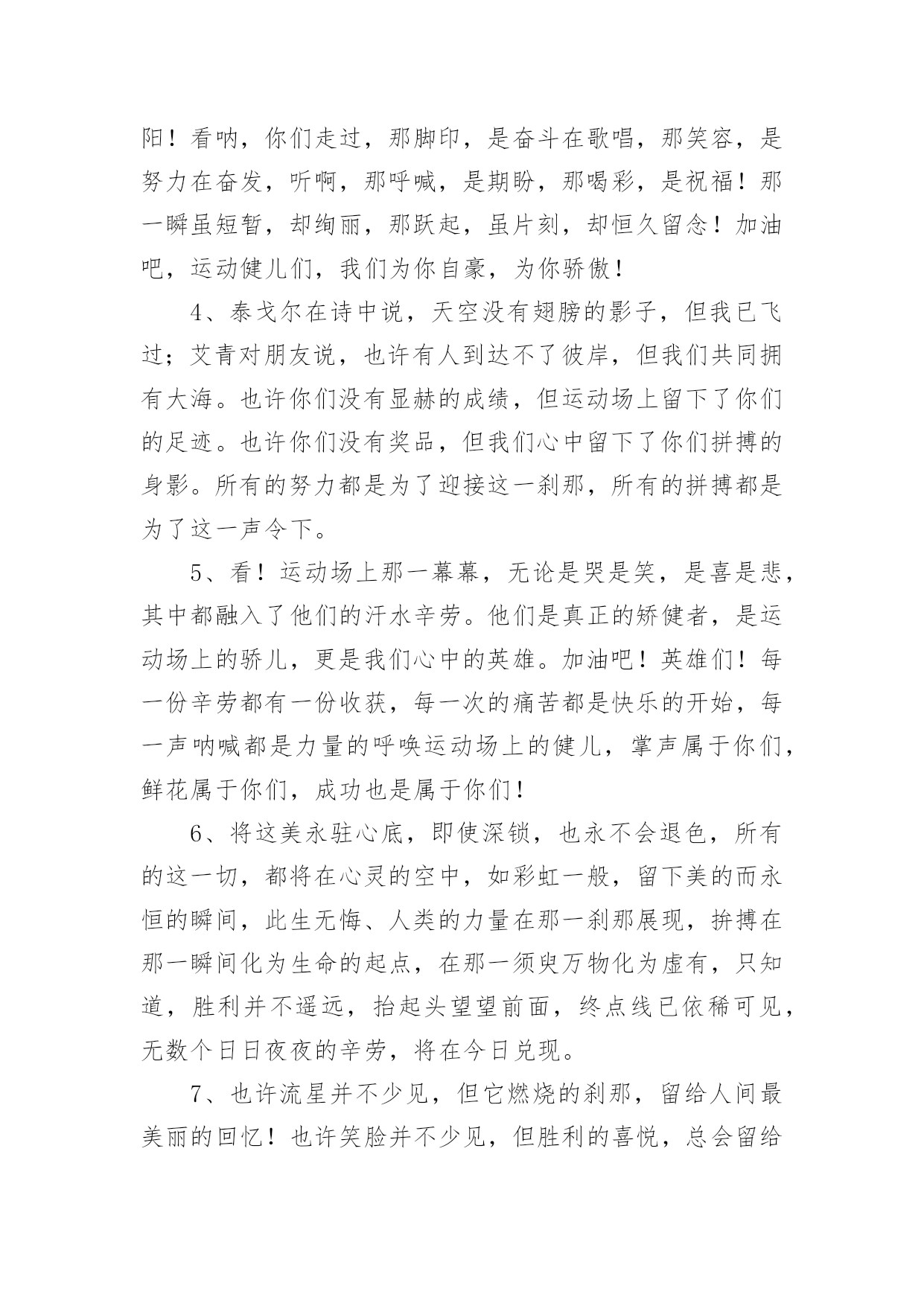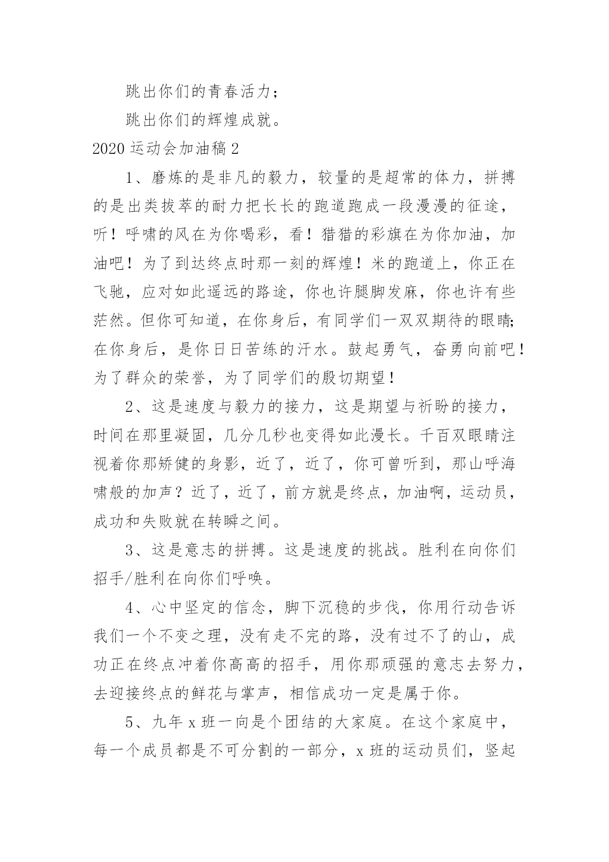 运动会加油稿2020运动会加油稿在日常生活和工作中,我们都可能会用到加油稿,加油稿可以起到活跃气氛的作用。你知道加油稿怎样才能写的好吗?以下是小编整理的2020运动会加油稿,仅供参考,希望能够帮助到大家。2020运动会加油稿1大地属于你,蓝天属于你,在你一跃的瞬间,同时跃出了我们的希望。草儿欣赏你,白云欢迎你,身轻如燕,飞跃蓝天,奥林匹克精神在你身上体现,跳吧,跳出你的自信,跳出你的顶尖,跳出你的胜利山颠。跳出你们的英姿飒爽;跳出你们的活力四射;跳出你们的无限激情;跳出你们的青春活力;跳出你们的辉煌成就。2020运动会加油稿21、磨炼的是非凡的毅力,较量的是超常的体力,拼搏的是出类拔萃的耐力把长长的跑道跑成一段漫漫的征途,听!呼啸的风在为你喝彩,看!猎猎的彩旗在为你加油,加油吧!为了到达终点时那一刻的辉煌!米的跑道上,你正在飞驰,应对如此遥远的路途,你也许腿脚发麻,你也许有些茫然。但你可知道,在你身后,有同学们一双双期待的眼睛;在你身后,是你日日苦练的汗水。鼓起勇气,奋勇向前吧!为了群众的荣誉,为了同学们的殷切期望!2、这是速度与毅力的接力,这是期望与祈盼的接力,时间在那里凝固,几分几秒也变得如此漫长。千百双眼睛注视着你那矫健的身影,近了,近了,你可曾听到,那山呼海啸般的加声?近了,近了,前方就是终点,加油啊,运动员,成功和失败就在转瞬之间。3、这是意志的拼搏。这是速度的挑战。胜利在向你们招手/胜利在向你们呼唤。4、心中坚定的信念,脚下沉稳的步伐,你用行动告诉我们一个不变之理,没有走不完的路,没有过不了的山,成功正在终点冲着你高高的招手,用你那顽强的意志去努力,去迎接终点的鲜花与掌声,相信成功一定是属于你。5、九年x班一向是个团结的大家庭。在这个家庭中,每一个成员都是不可分割的一部分,x班的运动员们,竖起你们梦想的风帆,我相信你们必须能乘风破浪,在人生的轨道中留下最美的一幕!6、场上英姿显自豪,脚下步伐在飞奔。你们是骄傲,你们是自豪,跑道因你幻彩,面对红色跑道,你们挥洒自如,不惧一切冲向终点!7、超越对手,超越自我,是我们的目标,是我们的信念,在清凉的初冬,在喧嚣的田径场上,你们点燃了似火的热情,无论成败,我们都为你们感到自豪,你们永远是我们的骄傲!8、漫漫长路,你愿一人独撑,忍受着孤独与寂寞,承受着体力与精神的压迫,只任汗水溶于泪水,可脚步却从不停歇。好样的,纵然得不了桂冠,可坚持的你,定会赢得最后的掌声。9、人生的路,有坦途,也有坎坷,做过的岁月,有欢笑,也有苦涩,泪水告诉我一个跌倒的故事,汗水使我多了一份沉重,几多成熟。理想毕竟不同于现实,失败是生活的一部分,谁也无法选择,无法抗拒,人生要自己去拼搏,去奋斗,在风雨中百折不饶勇往直前。流泪不是失落,徘徊不是迷惑,成功属于那些战胜失败,坚持不懈,勇于追求梦想的人。10、汗水,泪水;笑声,歌声;我们尽情挥洒。开幕式上,运动场上,我们尽情展现,多少艰辛,多少困苦,我们勇敢承担。因为年轻,因为张扬,因为我们知道:用今日的汗水换来明天的微笑。11、环形跑道上的坚持,毅力与精神活跃在会场上,湿透的衣衫,满头的大汗,无限追求,奋力追赶,我们为你欢呼跳跃,我们为你骄傲!12、致运动员,是体育场上游走的火焰,是来去不息的脚步,是风中飞舞的树叶折射的金色光芒,藉此,可以诠释运动员兴奋的脸庞。那轻盈的步伐似飞鸟的翅膀,那清脆的枪声响彻天际,它粲然升起那跃动的渴望,起跑、加速、超越、冲刺,一步一步延向胜利的曙光。那是力的比拼,素质的较量,是石榴树上,跃动的心脏。13、你站在草坪上,挥舞着双臂,所有的力量顿时间都凝聚在了手上。你那有力的手上,,抓着一个沉甸甸的实心球,你尽自己最打的力气投了出去。投近投远,都没关系,只要你努力就行!重在参与,输了明年再来比!加油!14、掌声依然为你响起,鲜花依然为你献上一时的输赢不代表终生的成败!擦干泪水,振作精神,新的冲锋号已经吹响!谁说天空没有鸟的痕迹而鸟已飞过?鸟飞过的痕迹已刻在天空的心中你的精神也刻在了所有人的心中不论结果如何我们不会忘记你这只在天空努力飞过的小鸟,那瞬间的美丽将成为我们心中的永恒!15、泰戈尔在诗中说,天空没有翅膀的影子,但我已飞过;也许你们没有显赫的成绩,但运动场上留下了你们的足迹。也许你们没有奖品,但我们心中留下了你们拼搏的身影。所有的努力都是为了迎接这一刹那,所有的拼搏都是为了这一声令下。16、生活中,我们每一天都在尝试尝试中,我们走向成功品味失败,走过心灵的阴雨晴空运动员们,不要放下尝试无论失败与否重要的是你勇于参与的精神,付出的背后是胜利无论是否成功,我们永远赞美你,你们永远是我们的骄傲。17、坚定,执着,耐力与期望,在延伸的白色跑道中点点凝聚!力量,信念,拼搏与奋斗,在遥远的终点线上渐渐明亮!时代的强音正在你的脚下踏响。18