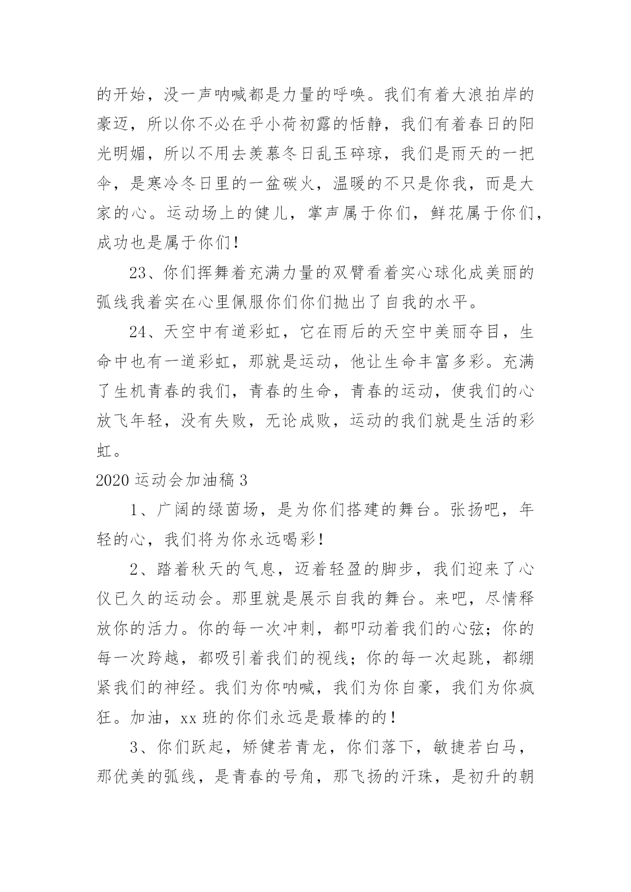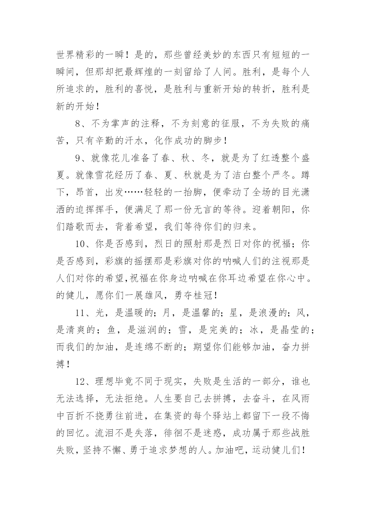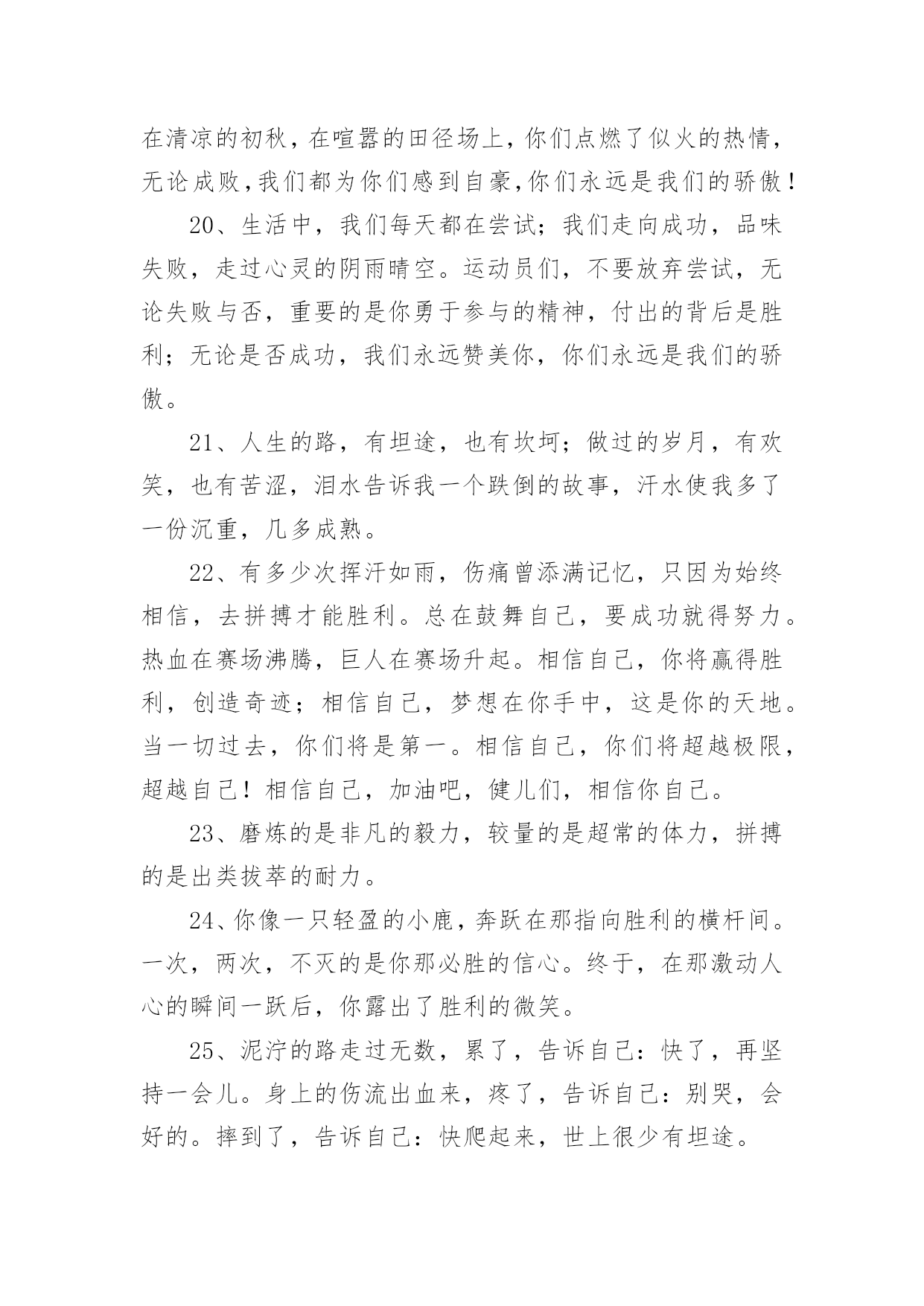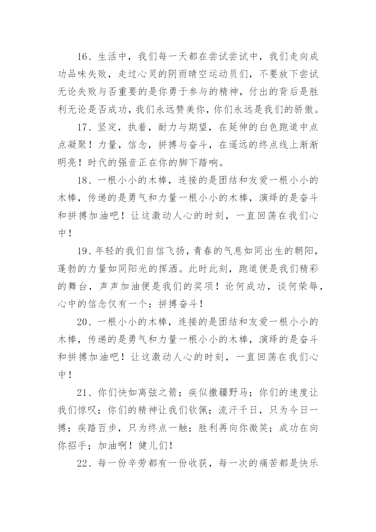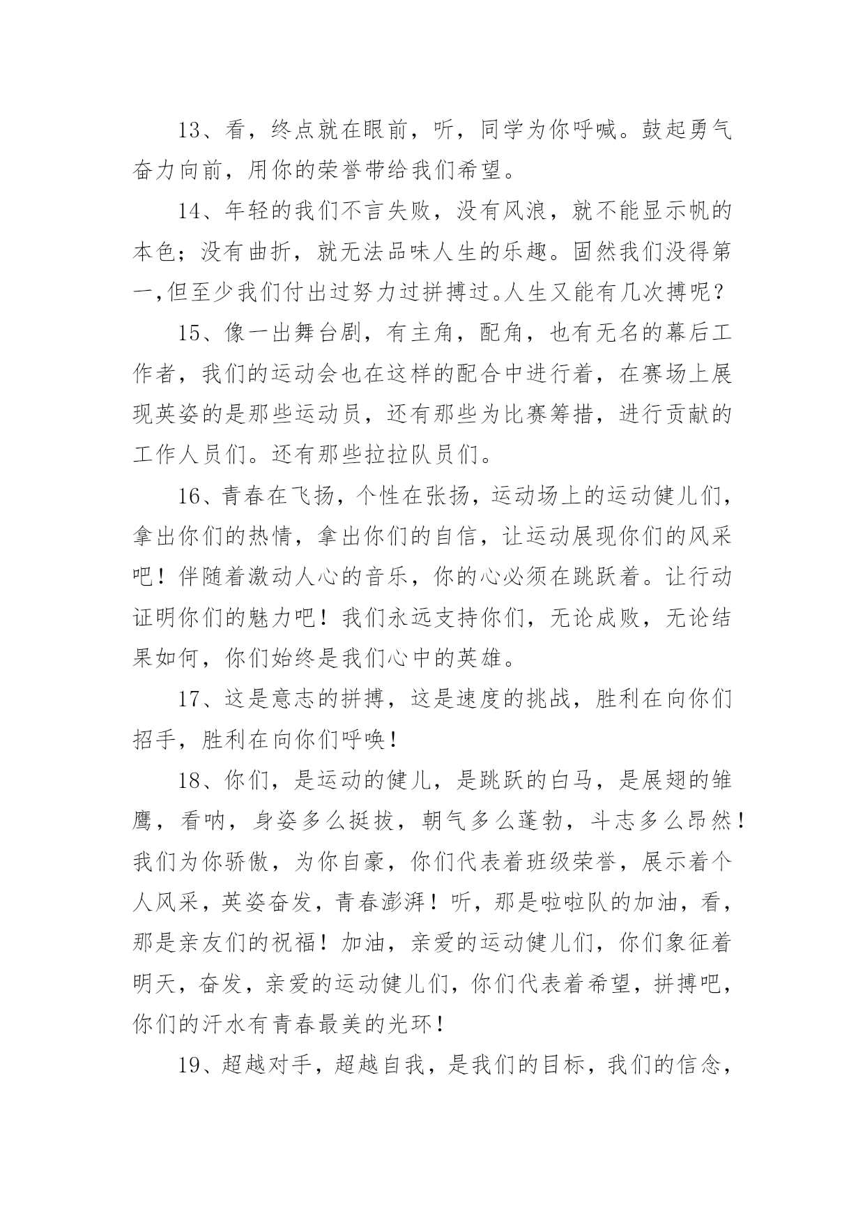 运动会加油稿2020运动会加油稿在日常生活和工作中,我们都可能会用到加油稿,加油稿可以起到活跃气氛的作用。你知道加油稿怎样才能写的好吗?以下是小编整理的2020运动会加油稿,仅供参考,希望能够帮助到大家。2020运动会加油稿1大地属于你,蓝天属于你,在你一跃的瞬间,同时跃出了我们的希望。草儿欣赏你,白云欢迎你,身轻如燕,飞跃蓝天,奥林匹克精神在你身上体现,跳吧,跳出你的自信,跳出你的顶尖,跳出你的胜利山颠。跳出你们的英姿飒爽;跳出你们的活力四射;跳出你们的无限激情;跳出你们的青春活力;跳出你们的辉煌成就。2020运动会加油稿21、磨炼的是非凡的毅力,较量的是超常的体力,拼搏的是出类拔萃的耐力把长长的跑道跑成一段漫漫的征途,听!呼啸的风在为你喝彩,看!猎猎的彩旗在为你加油,加油吧!为了到达终点时那一刻的辉煌!米的跑道上,你正在飞驰,应对如此遥远的路途,你也许腿脚发麻,你也许有些茫然。但你可知道,在你身后,有同学们一双双期待的眼睛;在你身后,是你日日苦练的汗水。鼓起勇气,奋勇向前吧!为了群众的荣誉,为了同学们的殷切期望!2、这是速度与毅力的接力,这是期望与祈盼的接力,时间在那里凝固,几分几秒也变得如此漫长。千百双眼睛注视着你那矫健的身影,近了,近了,你可曾听到,那山呼海啸般的加声?近了,近了,前方就是终点,加油啊,运动员,成功和失败就在转瞬之间。3、这是意志的拼搏。这是速度的挑战。胜利在向你们招手/胜利在向你们呼唤。4、心中坚定的信念,脚下沉稳的步伐,你用行动告诉我们一个不变之理,没有走不完的路,没有过不了的山,成功正在终点冲着你高高的招手,用你那顽强的意志去努力,去迎接终点的鲜花与掌声,相信成功一定是属于你。5、九年x班一向是个团结的大家庭。在这个家庭中,每一个成员都是不可分割的一部分,x班的运动员们,竖起你们梦想的风帆,我相信你们必须能乘风破浪,在人生的轨道中留下最美的一幕!6、场上英姿显自豪,脚下步伐在飞奔。你们是骄傲,你们是自豪,跑道因你幻彩,面对红色跑道,你们挥洒自如,不惧一切冲向终点!7、超越对手,超越自我,是我们的目标,是我们的信念,在清凉的初冬,在喧嚣的田径场上,你们点燃了似火的热情,无论成败,我们都为你们感到自豪,你们永远是我们的骄傲!8、漫漫长路,你愿一人独撑,忍受着孤独与寂寞,承受着体力与精神的压迫,只任汗水溶于泪水,可脚步却从不停歇。好样的,纵然得不了桂冠,可坚持的你,定会赢得最后的掌声。9、人生的路,有坦途,也有坎坷,做过的岁月,有欢笑,也有苦涩,泪水告诉我一个跌倒的故事,汗水使我多了一份沉重,几多成熟。理想毕竟不同于现实,失败是生活的一部分,谁也无法选择,无法抗拒,人生要自己去拼搏,去奋斗,在风雨中百折不饶勇往直前。流泪不是失落,徘徊不是迷惑,成功属于那些战胜失败,坚持不懈,勇于追求梦想的人。10、汗水,泪水;笑声,歌声;我们尽情挥洒。开幕式上,运动场上,我们尽情展现,多少艰辛,多少困苦,我们勇敢承担。因为年轻,因为张扬,因为我们知道:用今日的汗水换来明天的微笑。11、环形跑道上的坚持,毅力与精神活跃在会场上,湿透的衣衫,满头的大汗,无限追求,奋力追赶,我们为你欢呼跳跃,我们为你骄傲!12、致运动员,是体育场上游走的火焰,是来去不息的脚步,是风中飞舞的树叶折射的金色光芒,藉此,可以诠释运动员兴奋的脸庞。那轻盈的步伐似飞鸟的翅膀,那清脆的枪声响彻天际,它粲然升起那跃动的渴望,起跑、加速、超越、冲刺,一步一步延向胜利的曙光。那是力的比拼,素质的较量,是石榴树上,跃动的心脏。13、你站在草坪上,挥舞着双臂,所有的力量顿时间都凝聚在了手上。你那有力的手上,,抓着一个沉甸甸的实心球,你尽自己最打的力气投了出去。投近投远,都没关系,只要你努力就行!重在参与,输了明年再来比!加油!14、掌声依然为你响起,鲜花依然为你献上一时的输赢不代表终生的成败!擦干泪水,振作精神,新的冲锋号已经吹响!谁说天空没有鸟的痕迹而鸟已飞过?鸟飞过的痕迹已刻在天空的心中你的精神也刻在了所有人的心中不论结果如何我们不会忘记你这只在天空努力飞过的小鸟,那瞬间的美丽将成为我们心中的永恒!15、泰戈尔在诗中说,天空没有翅膀的影子,但我已飞过;也许你们没有显赫的成绩,但运动场上留下了你们的足迹。也许你们没有奖品,但我们心中留下了你们拼搏的身影。所有的努力都是为了迎接这一刹那,所有的拼搏都是为了这一声令下。16、生活中,我们每一天都在尝试尝试中,我们走向成功品味失败,走过心灵的阴雨晴空运动员们,不要放下尝试无论失败与否重要的是你勇于参与的精神,付出的背后是胜利无论是否成功,我们永远赞美你,你们永远是我们的骄傲。17、坚定,执着,耐力与期望,在延伸的白色跑道中点点凝聚!力量,信念,拼搏与奋斗,在遥远的终点线上渐渐明亮!时代的强音正在你的脚下踏响。18