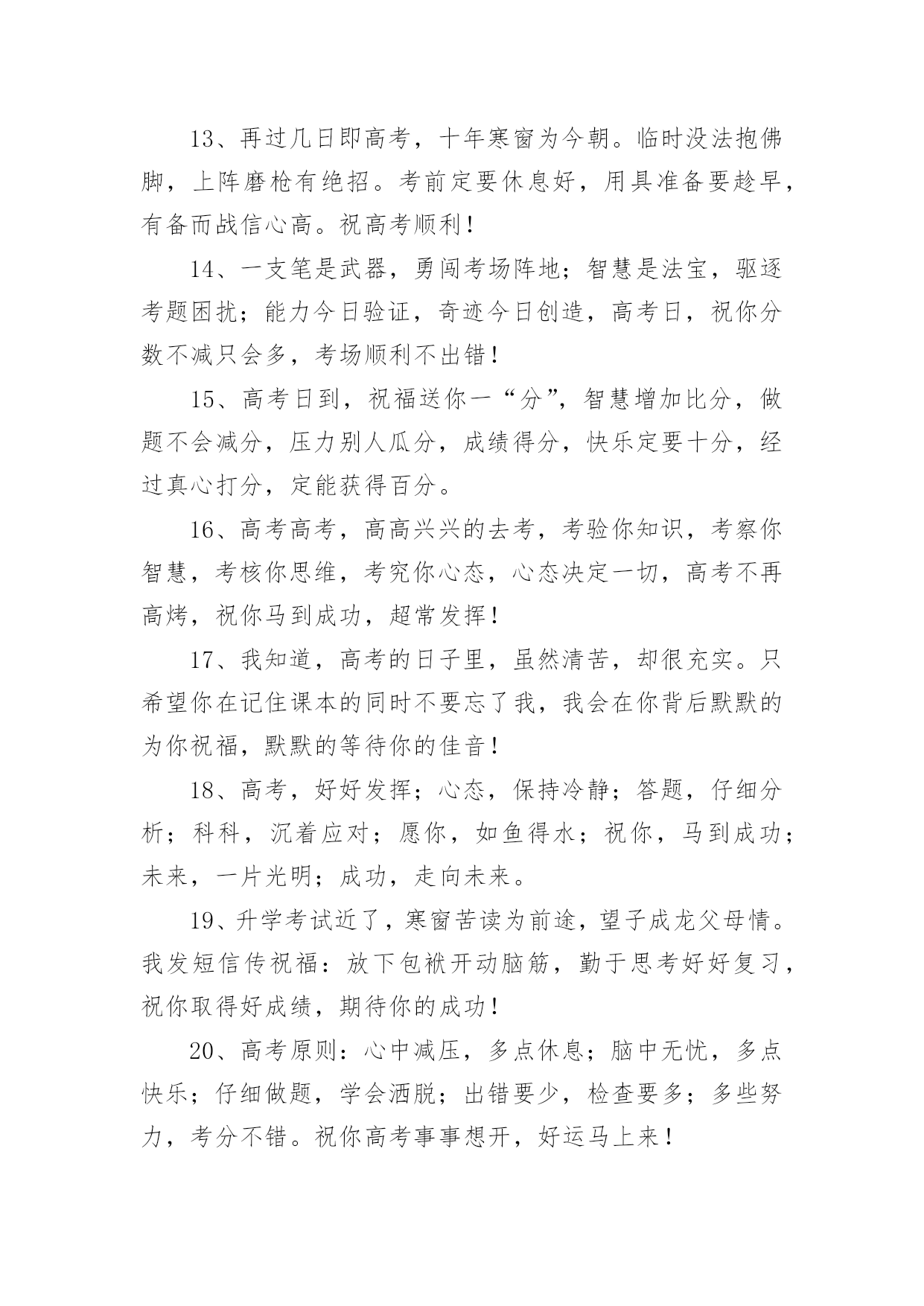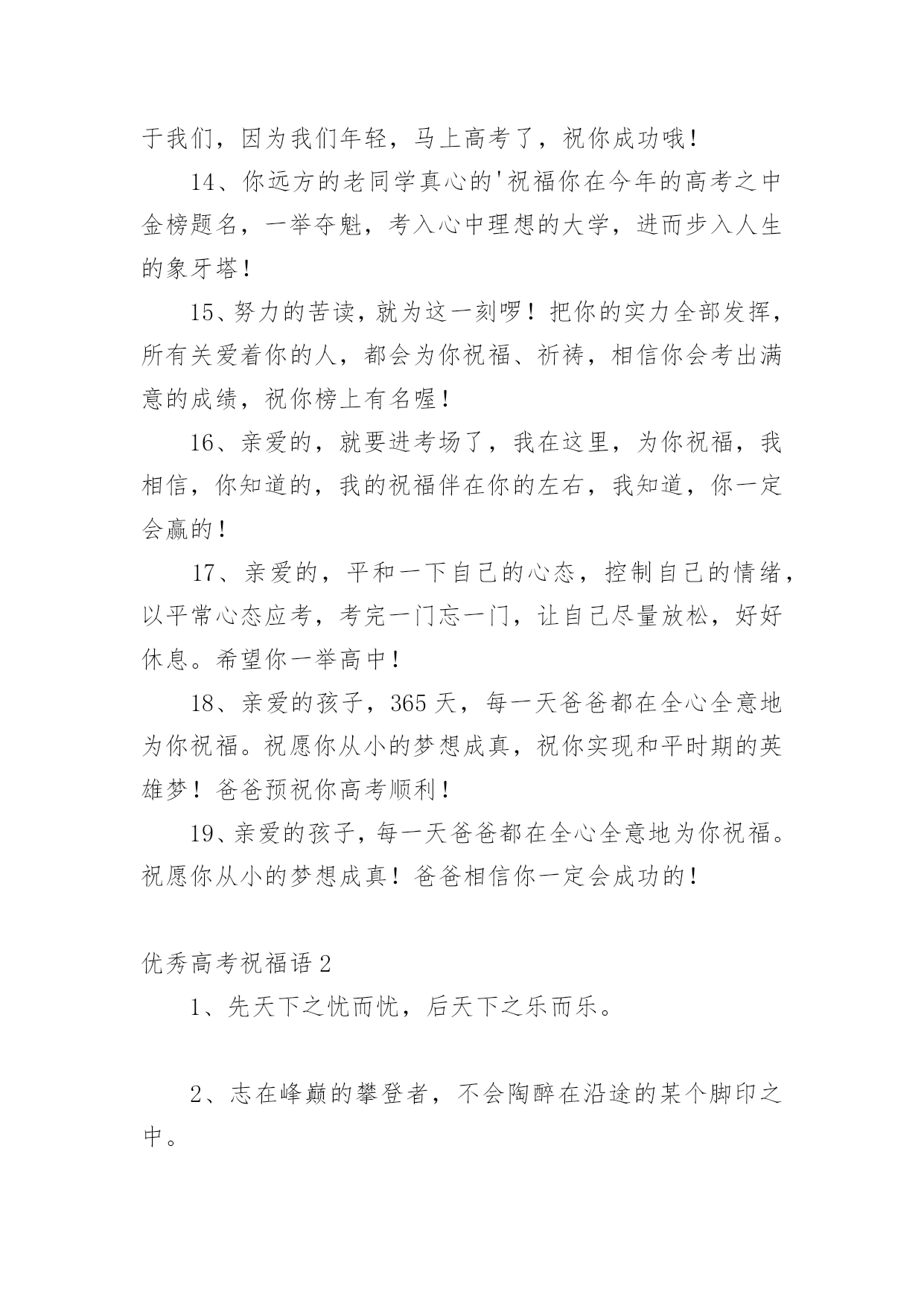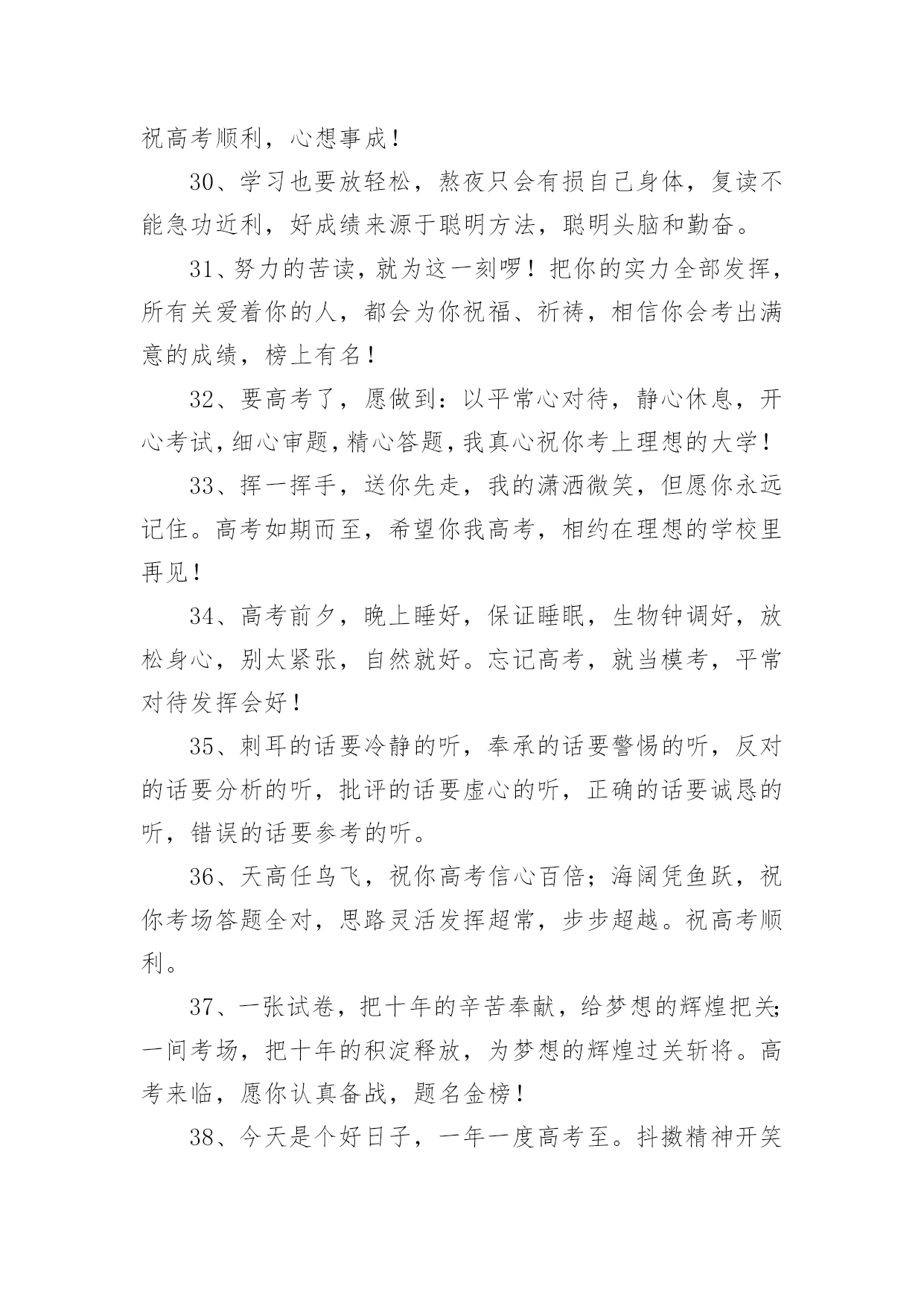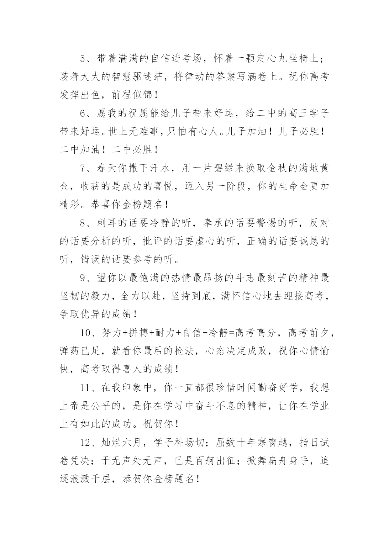 优秀高考祝福语在日常学习、工作或生活中,许多人都有过写祝福语的经历,对祝福语都不陌生吧,借助祝福语人们可以表达自己对他人的美好祝愿。你所见过的祝福语是什么样的呢?以下是小编为大家收集的优秀高考祝福语,仅供参考,欢迎大家阅读。优秀高考祝福语11、没有目标就没有方向,每一个学习阶段都应该给自己树立一个目标,就要高考了,祝你进入理想的大学哦!2、面对高考,保持你心灵的善良与纯洁;保持你情感的热情与丰富;保持你精神的进取与激昂,祝你成功!3、高考你准备好了吗?不要害怕,我一直都会陪在你的身边。默默地支持你。在这个世界你也许是渺小的。但在我心中你却是无比重要的,也是最棒的,我坚信这次你一定能金榜题名!相信哥的直觉,也相信你自己,好吗?不要焦虑,成功的大门正在为你开启!4、明天高考啦,以后不用点起床啦,以后可以天天游泳啦,明天是新生活的开始,一定不能愁眉苦脸,今晚做个好梦哦!5、明天进行的只是高考而已,心静就一定可以发挥好的,哥哥支持你,大学其实就像空气,松开手就属于你了,放心的考吧,没有人可以有100%的把握的,信心才会是成功的关键!6、明天就高考了,此时的你应该很紧张吧?身为朋友的我,此时也不知道说些什么好,腦子裏真的一片空白……还是那句。永远支持你,祝福你,找到你心中理想的大学!相信自己,你将赢得胜利创造奇迹!相信自己。梦想在你手中这是你的天地!相信自己,你将超越极限超越自己!相信自己,当这一切过去你将是第一!相信自己。你是最棒的哦!7、明天就是高考了,希望在这最后的日子,你能满怀着信心,发挥出你最好的水平,考出最好的成绩!加油~~~好好发挥,我们支持你!8、明天我们就要上战场拉,祝大家能考个好成绩,回家不挨凑!~呵呵```考完见!~~~9、我的宝贝,你是我的骄傲,妈妈为你自豪。在这收获的季节里,相信自己,就是胜利。愿你实现心中的梦想,放飞妈妈的希望。爸爸妈妈永远支持你!祝你高考成功!10、你笔下拥有一个色彩绚丽的世界:愿你,也相信你,拥有另一个笔下灿烂的图景,高考成功!11、你还好吧,你远方的老同学真心的祝福你在今年的高考之中金榜题名,一举夺魁,考入心中理想的大学,进而步入人生的象牙塔哦!12、你就要高考了,我在百度搜出千百条祝福语,在搜狗找到无数句吉祥话,但我觉得都太俗。我只想真诚地对你说:得心应手高考顺利,十年努力今日成功!13、你有你的赤橙黄绿,我有我的青蓝靛紫,天空同属于我们,因为我们年轻,马上高考了,祝你成功哦!14、你远方的老同学真心的'祝福你在今年的高考之中金榜题名,一举夺魁,考入心中理想的大学,进而步入人生的象牙塔!15、努力的苦读,就为这一刻啰!把你的实力全部发挥,所有关爱着你的人,都会为你祝福、祈祷,相信你会考出满意的成绩,祝你榜上有名喔!16、亲爱的,就要进考场了,我在这里,为你祝福,我相信,你知道的,我的祝福伴在你的左右,我知道,你一定会赢的!17、亲爱的,平和一下自己的心态,控制自己的情绪,以平常心态应考,考完一门忘一门,让自己尽量放松,好好休息。希望你一举高中!18、亲爱的孩子,365天,每一天爸爸都在全心全意地为你祝福。祝愿你从小的梦想成真,祝你实现和平时期的英雄梦!爸爸预祝你高考顺利!19、亲爱的孩子,每一天爸爸都在全心全意地为你祝福。祝愿你从小的梦想成真!爸爸相信你一定会成功的!优秀高考祝福语21、先天下之忧而忧,后天下之乐而乐。2、志在峰巅的攀登者,不会陶醉在沿途的某个脚印之中。3、愿知识之泉,经书籍而奔流,流进你的心田!4、不要轻言放弃否则对不起自己。5、人生充满着期待,梦想连接着未来。6、不是抓紧每一分钟学习,而是抓紧学习的每一分钟。7、拼两个春夏秋冬,博高考无怨无悔。8、只要有信心,人永远不会挫败。9、因害怕失败而不敢放手一搏,永远不会成功。10、宁可战死,不可吓死。今朝不搏,更待何时?11、横下一条心,坚决要出线。12、高考金榜题名,高考成功晋级,人生总是有那么多的'参考才。13、一路风雨前程磨砺意志;百日苦乐同享铸就辉煌。14、行者常至,为者常成。15、心中有了理想的山峰,每个脚印都是成功的路标。16、只有在高考这个加油站加好油,才有资本在以后的道路上疾驰。17、高考即将来临,展示自我的时刻:有信心而无胆怯,有动力而无压力,莫紧张无焦虑,答题迅速不慌乱!愿你马到成功,金笔提名!18、生命对某些人来说是美丽的,这些人的一生都为某个目标而奋斗。高考,加油!19、高考是一个实现人生的省力杠杆,此时是你撬动它的时机,并且以后你的人生会呈弧线上升。20、高考请记得:身份证,准考证,2B铅笔,中性笔,橡皮,尺子,垫板,水瓶,面巾纸,自信,还有微笑。优秀高考祝福语31、明天高考啦,以后不用点起床啦,以后可以天天游泳啦,明天是新生活的开始,一定不能愁眉苦脸,今晚做个好梦!2、昨日撒下勤奋种,今朝一