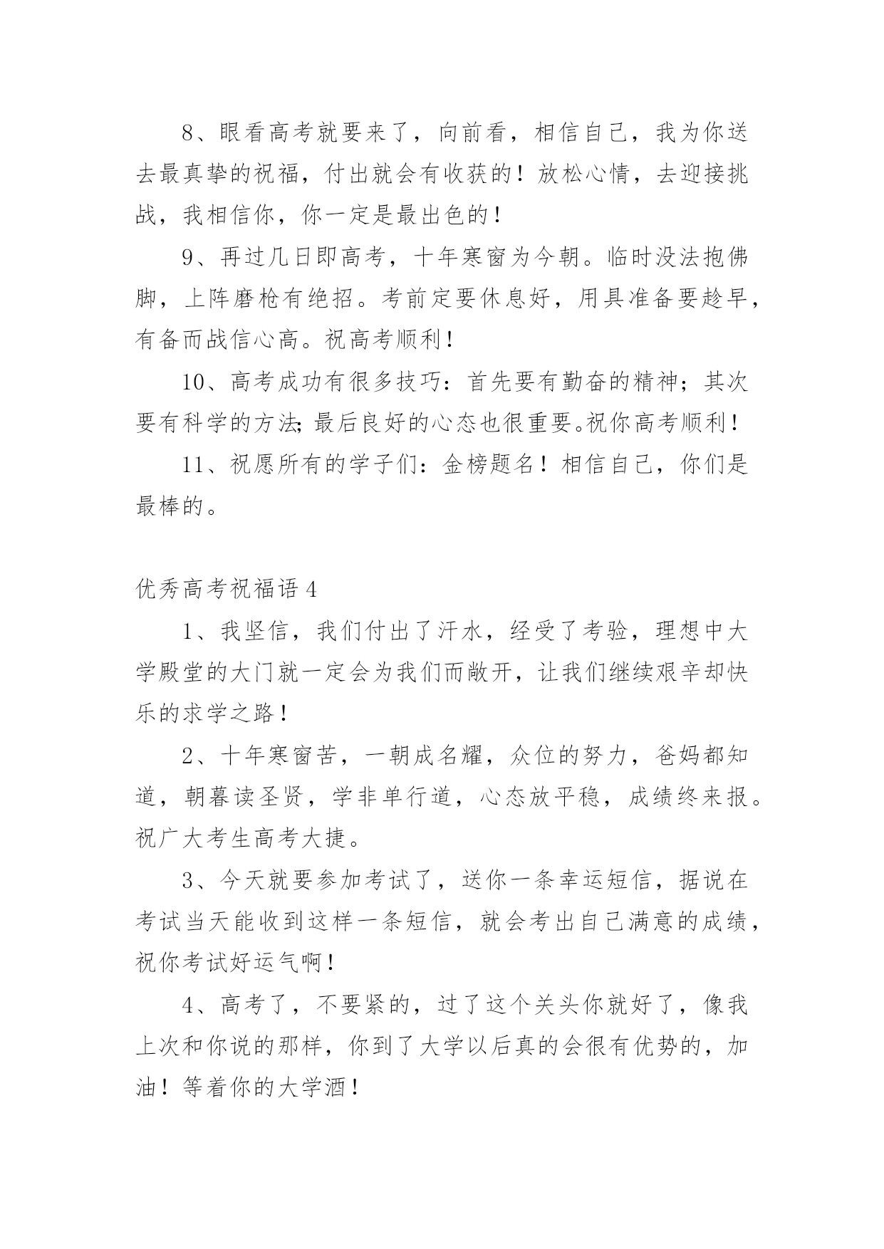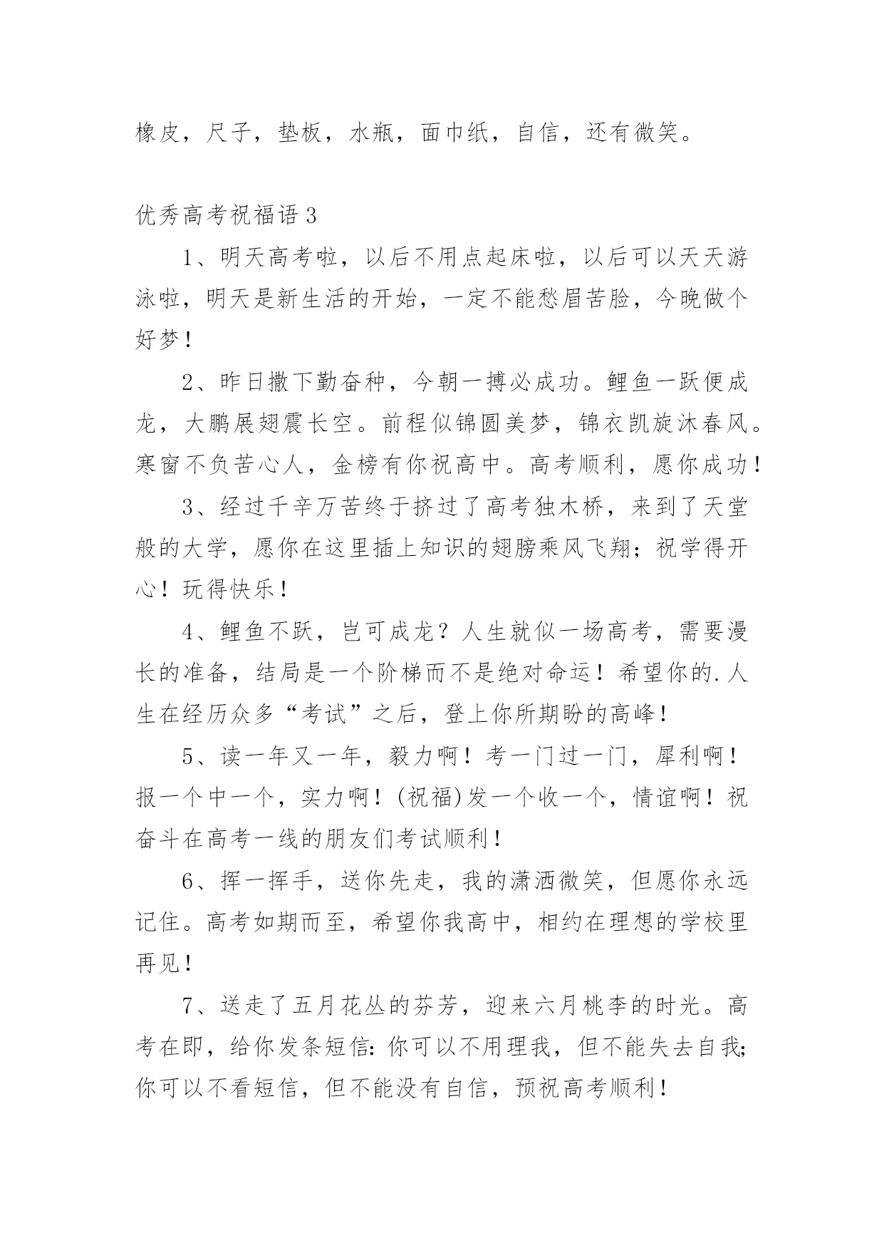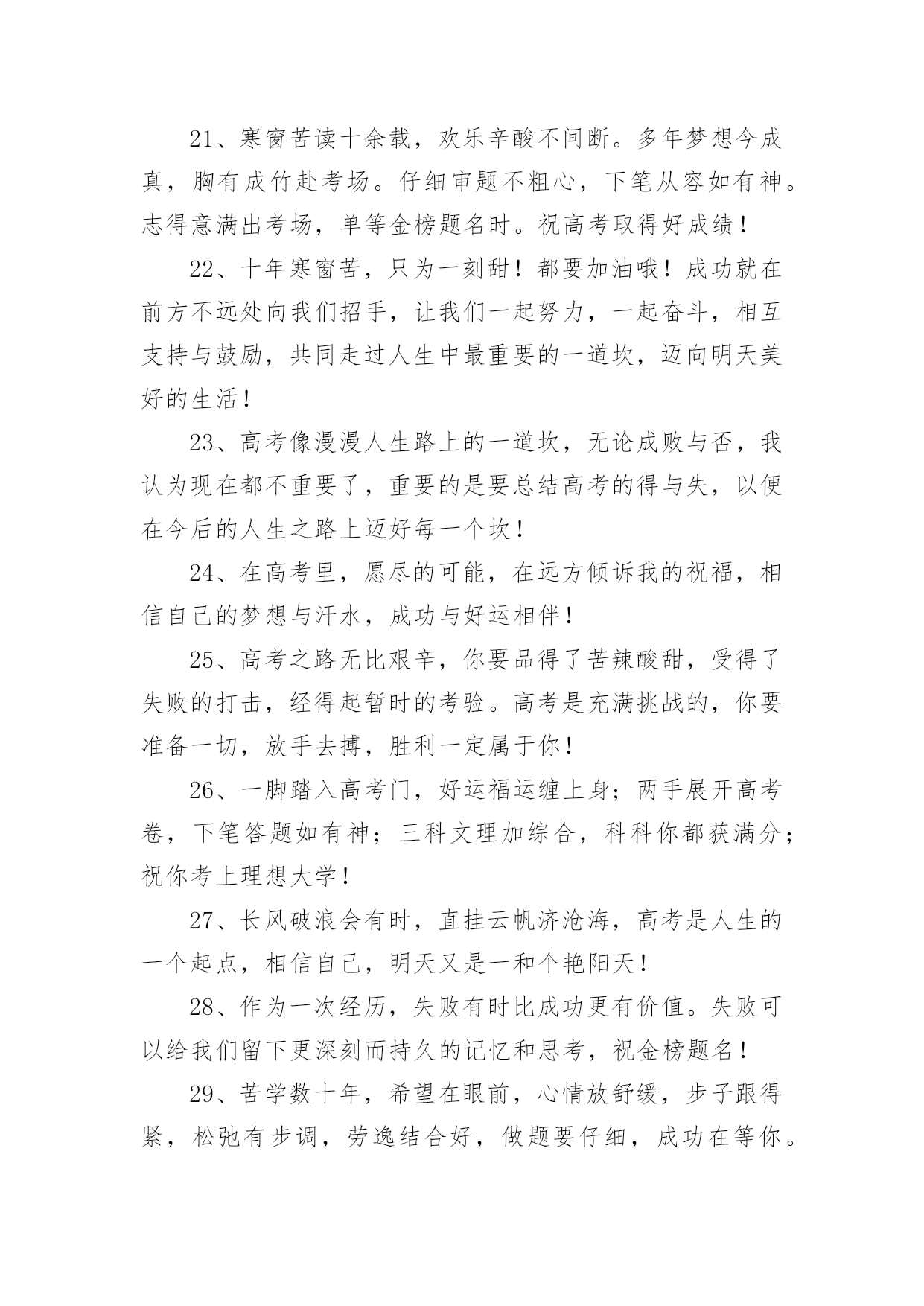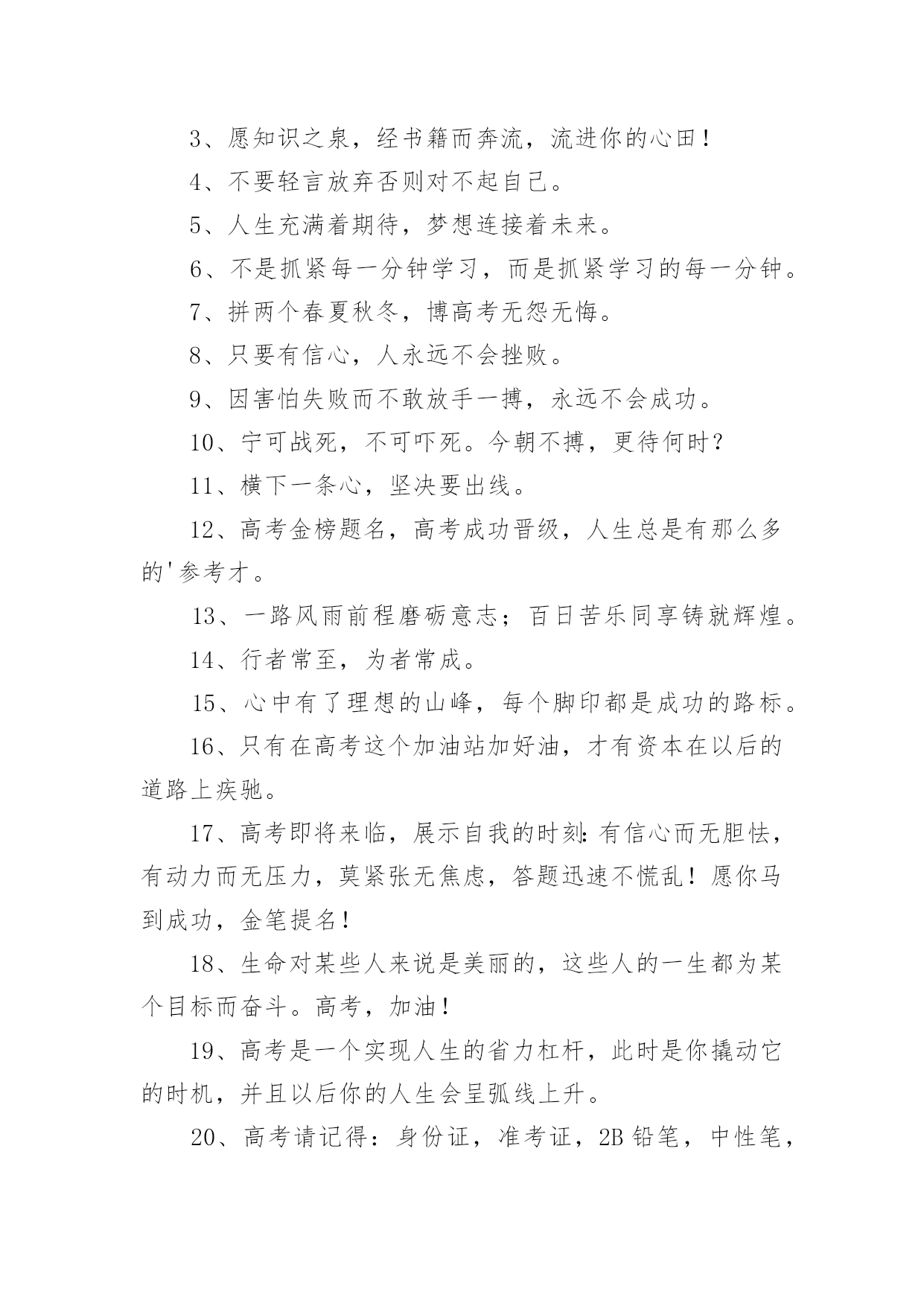 优秀高考祝福语在日常学习、工作或生活中,许多人都有过写祝福语的经历,对祝福语都不陌生吧,借助祝福语人们可以表达自己对他人的美好祝愿。你所见过的祝福语是什么样的呢?以下是小编为大家收集的优秀高考祝福语,仅供参考,欢迎大家阅读。优秀高考祝福语11、没有目标就没有方向,每一个学习阶段都应该给自己树立一个目标,就要高考了,祝你进入理想的大学哦!2、面对高考,保持你心灵的善良与纯洁;保持你情感的热情与丰富;保持你精神的进取与激昂,祝你成功!3、高考你准备好了吗?不要害怕,我一直都会陪在你的身边。默默地支持你。在这个世界你也许是渺小的。但在我心中你却是无比重要的,也是最棒的,我坚信这次你一定能金榜题名!相信哥的直觉,也相信你自己,好吗?不要焦虑,成功的大门正在为你开启!4、明天高考啦,以后不用点起床啦,以后可以天天游泳啦,明天是新生活的开始,一定不能愁眉苦脸,今晚做个好梦哦!5、明天进行的只是高考而已,心静就一定可以发挥好的,哥哥支持你,大学其实就像空气,松开手就属于你了,放心的考吧,没有人可以有100%的把握的,信心才会是成功的关键!6、明天就高考了,此时的你应该很紧张吧?身为朋友的我,此时也不知道说些什么好,腦子裏真的一片空白……还是那句。永远支持你,祝福你,找到你心中理想的大学!相信自己,你将赢得胜利创造奇迹!相信自己。梦想在你手中这是你的天地!相信自己,你将超越极限超越自己!相信自己,当这一切过去你将是第一!相信自己。你是最棒的哦!7、明天就是高考了,希望在这最后的日子,你能满怀着信心,发挥出你最好的水平,考出最好的成绩!加油~~~好好发挥,我们支持你!8、明天我们就要上战场拉,祝大家能考个好成绩,回家不挨凑!~呵呵```考完见!~~~9、我的宝贝,你是我的骄傲,妈妈为你自豪。在这收获的季节里,相信自己,就是胜利。愿你实现心中的梦想,放飞妈妈的希望。爸爸妈妈永远支持你!祝你高考成功!10、你笔下拥有一个色彩绚丽的世界:愿你,也相信你,拥有另一个笔下灿烂的图景,高考成功!11、你还好吧,你远方的老同学真心的祝福你在今年的高考之中金榜题名,一举夺魁,考入心中理想的大学,进而步入人生的象牙塔哦!12、你就要高考了,我在百度搜出千百条祝福语,在搜狗找到无数句吉祥话,但我觉得都太俗。我只想真诚地对你说:得心应手高考顺利,十年努力今日成功!13、你有你的赤橙黄绿,我有我的青蓝靛紫,天空同属于我们,因为我们年轻,马上高考了,祝你成功哦!14、你远方的老同学真心的'祝福你在今年的高考之中金榜题名,一举夺魁,考入心中理想的大学,进而步入人生的象牙塔!15、努力的苦读,就为这一刻啰!把你的实力全部发挥,所有关爱着你的人,都会为你祝福、祈祷,相信你会考出满意的成绩,祝你榜上有名喔!16、亲爱的,就要进考场了,我在这里,为你祝福,我相信,你知道的,我的祝福伴在你的左右,我知道,你一定会赢的!17、亲爱的,平和一下自己的心态,控制自己的情绪,以平常心态应考,考完一门忘一门,让自己尽量放松,好好休息。希望你一举高中!18、亲爱的孩子,365天,每一天爸爸都在全心全意地为你祝福。祝愿你从小的梦想成真,祝你实现和平时期的英雄梦!爸爸预祝你高考顺利!19、亲爱的孩子,每一天爸爸都在全心全意地为你祝福。祝愿你从小的梦想成真!爸爸相信你一定会成功的!优秀高考祝福语21、先天下之忧而忧,后天下之乐而乐。2、志在峰巅的攀登者,不会陶醉在沿途的某个脚印之中。3、愿知识之泉,经书籍而奔流,流进你的心田!4、不要轻言放弃否则对不起自己。5、人生充满着期待,梦想连接着未来。6、不是抓紧每一分钟学习,而是抓紧学习的每一分钟。7、拼两个春夏秋冬,博高考无怨无悔。8、只要有信心,人永远不会挫败。9、因害怕失败而不敢放手一搏,永远不会成功。10、宁可战死,不可吓死。今朝不搏,更待何时?11、横下一条心,坚决要出线。12、高考金榜题名,高考成功晋级,人生总是有那么多的'参考才。13、一路风雨前程磨砺意志;百日苦乐同享铸就辉煌。14、行者常至,为者常成。15、心中有了理想的山峰,每个脚印都是成功的路标。16、只有在高考这个加油站加好油,才有资本在以后的道路上疾驰。17、高考即将来临,展示自我的时刻:有信心而无胆怯,有动力而无压力,莫紧张无焦虑,答题迅速不慌乱!愿你马到成功,金笔提名!18、生命对某些人来说是美丽的,这些人的一生都为某个目标而奋斗。高考,加油!19、高考是一个实现人生的省力杠杆,此时是你撬动它的时机,并且以后你的人生会呈弧线上升。20、高考请记得:身份证,准考证,2B铅笔,中性笔,橡皮,尺子,垫板,水瓶,面巾纸,自信,还有微笑。优秀高考祝福语31、明天高考啦,以后不用点起床啦,以后可以天天游泳啦,明天是新生活的开始,一定不能愁眉苦脸,今晚做个好梦!2、昨日撒下勤奋种,今朝一
