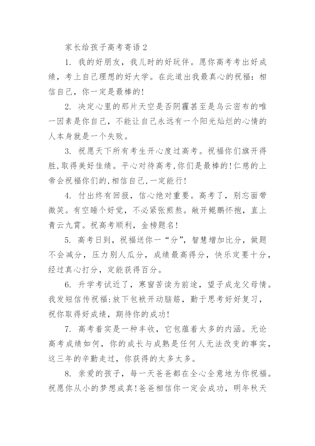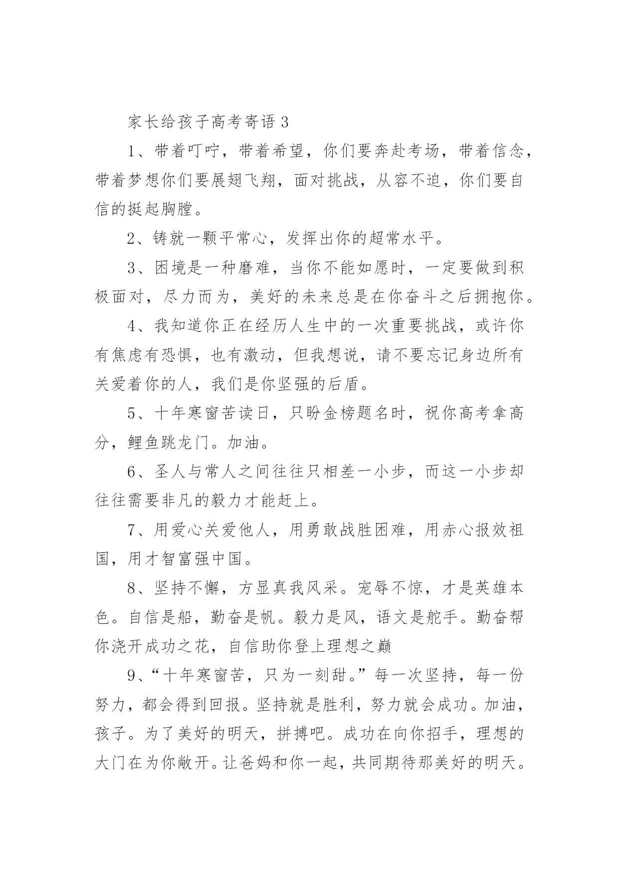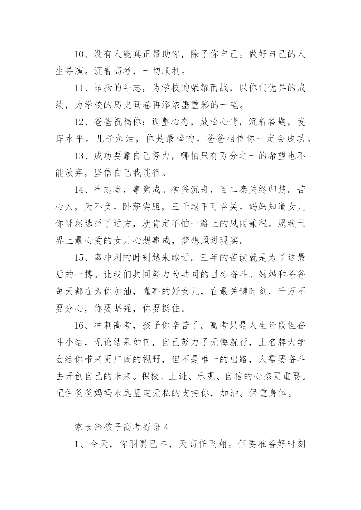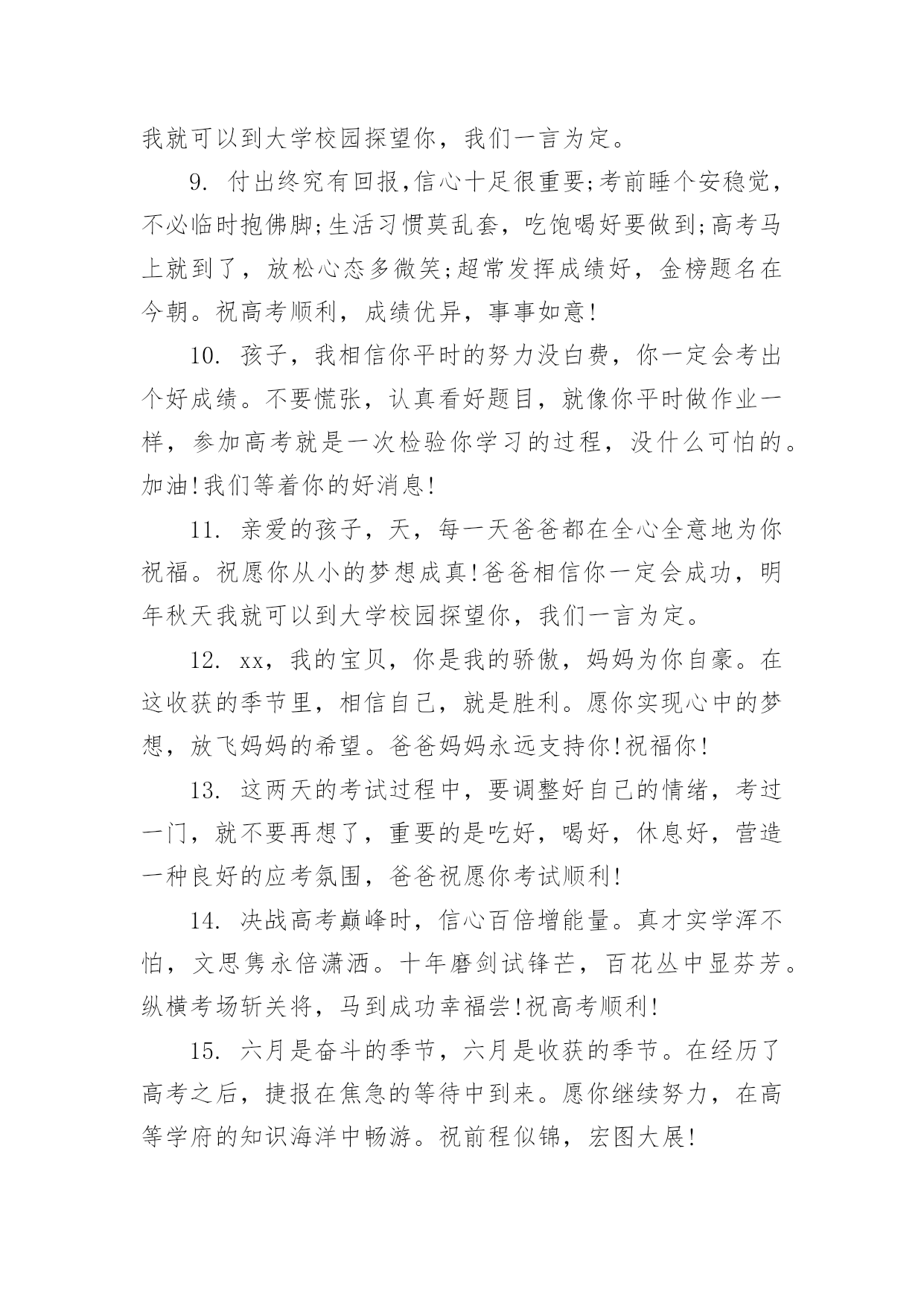 家长给孩子高考寄语1家长给孩子高考寄语高考不是你一个人在奋斗,家长也在背后默默的为你奋斗,那么家长给孩子高考寄语有哪些呢?下面是小编给大家整理的家长给孩子高考寄语,供大家参阅!家长给孩子高考寄语11.十年寒窗苦读日,只盼金榜题名时,祝你高考拿高分,鲤鱼跳龙门!加油。2.圣人与常人之间往往只相差一小步,而这一小步却往往需要非凡的毅力才能赶上。3.生命之中最快乐的是拼搏,而非成功,生命之中最痛苦的是懒散,而非失败。4.孩子,没有人能真正帮助你,除了你自己!做好自己的人生导演!沉着高考,一切顺利!5.孩子你是爸妈的希望,高考一定要沉着应战,心要平静,爸妈相信你能行的!6.孩子:面对高考,保持你心灵的善良与纯洁;保持你情感的热情与丰富;保持你精神的进取与激昂!7.孩子:高考是一个实现人生的省力杠杆,此时是你撬动它的最佳时机,并且以后你的人生会呈弧线上升。8.明天就是高考了,希望在这最后的日子,你能满怀着信心,发挥出你最好的水平,考出最好的成绩!!加油!!祝你马到成功鹏程四海!!9.努力的苦读,就为这一刻啰!把你的实力全部发挥,所有关爱着你的人,都会为你祝福、祈祷,相信你会考出满意的成绩,榜上有名!10.高考,好好发挥;心态,保持冷静;答题,仔细分析;科科,沉着应对;努力,定能成功;梦想,变为现实;愿你,如鱼得水;祝你,马到成功。11.决定心里的那片天空是否阴霾甚至是乌云密布的唯一因素是你自己,不能让自己永远有一个阳光灿烂的心情的人本身就是一个失败。12.努力的苦读,就为这一刻啰!把你的实力全部发挥,所有关爱着你的人,都会为你祝福、祈祷,相信你会考出满意的成绩,榜上有名喔!13.高考在即,紧张难免;适量放松,方位上策;书本暂放,好好休息;临阵磨枪,效果甚微;心态良好,至关重要;平常心待,万事皆宜,愿你高考,取得佳绩!14.高考高考,心态要好,保持冷静,基础打好,莫要烦躁,开开心心,早睡早起,精神十足,考上大学,实现梦想,相信自己,一定最好。15.静静的是你的心情,急急的是你的笔锋,满满的是你的信心,亮亮的是你的成绩,默默的是我的祝福,又是一年高考时,祝金榜题名!家长给孩子高考寄语21.我的好朋友,我儿时的好玩伴。愿你高考考出好成绩,考上自己理想的好大学。在此道出我最真心的祝福:相信自己,你一定是最棒的!2.决定心里的那片天空是否阴霾甚至是乌云密布的唯一因素是你自己,不能让自己永远有一个阳光灿烂的心情的人本身就是一个失败。3.祝愿天下所有考生开心度过高考。祝福你们旗开得胜,取得美好佳绩。平心对待高考,你们是最棒的!仁慈的上帝会祝福你们的,相信自己,一定能行!4.付出终有回报,信心绝对重要。高考了,别忘面带微笑。有空睡个好觉,不必紧张煎熬。敞开鲲鹏怀抱,直上青云九霄。祝高考顺利,金榜题名!5.高考日到,祝福送你一“分”,智慧增加比分,做题不会减分,压力别人瓜分,成绩最高得分,快乐定要十分,经过真心打分,定能获得百分。6.升学考试近了,寒窗苦读为前途,望子成龙父母情。我发短信传祝福:放下包袱开动脑筋,勤于思考好好复习,祝你取得好成绩,期待你的成功!7.高考着实是一种丰收,它包蕴着太多的内涵。无论高考成绩如何,你的成长与成熟是任何人无法改变的事实,这三年的辛勤走过,你获得的太多太多。8.亲爱的孩子,每一天爸爸都在全心全意地为你祝福。祝愿你从小的梦想成真!爸爸相信你一定会成功,明年秋天我就可以到大学校园探望你,我们一言为定。9.付出终究有回报,信心十足很重要;考前睡个安稳觉,不必临时抱佛脚;生活习惯莫乱套,吃饱喝好要做到;高考马上就到了,放松心态多微笑;超常发挥成绩好,金榜题名在今朝。祝高考顺利,成绩优异,事事如意!10.孩子,我相信你平时的努力没白费,你一定会考出个好成绩。不要慌张,认真看好题目,就像你平时做作业一样,参加高考就是一次检验你学习的过程,没什么可怕的。加油!我们等着你的好消息!11.亲爱的孩子,天,每一天爸爸都在全心全意地为你祝福。祝愿你从小的梦想成真!爸爸相信你一定会成功,明年秋天我就可以到大学校园探望你,我们一言为定。12.xx,我的宝贝,你是我的骄傲,妈妈为你自豪。在这收获的季节里,相信自己,就是胜利。愿你实现心中的梦想,放飞妈妈的希望。爸爸妈妈永远支持你!祝福你!13.这两天的考试过程中,要调整好自己的情绪,考过一门,就不要再想了,重要的是吃好,喝好,休息好,营造一种良好的应考氛围,爸爸祝愿你考试顺利!14.决战高考巅峰时,信心百倍增能量。真才实学浑不怕,文思隽永倍潇洒。十年磨剑试锋芒,百花丛中显芬芳。纵横考场斩关将,马到成功幸福尝!祝高考顺利!15.六月是奋斗的季节,六月是收获的季节。在经历了高考之后,捷报在焦急的等待中到来。愿你继续努力,在高等学府的知识海洋中畅游。祝前程似锦,宏图大展!家长给孩子高考寄语31、带着