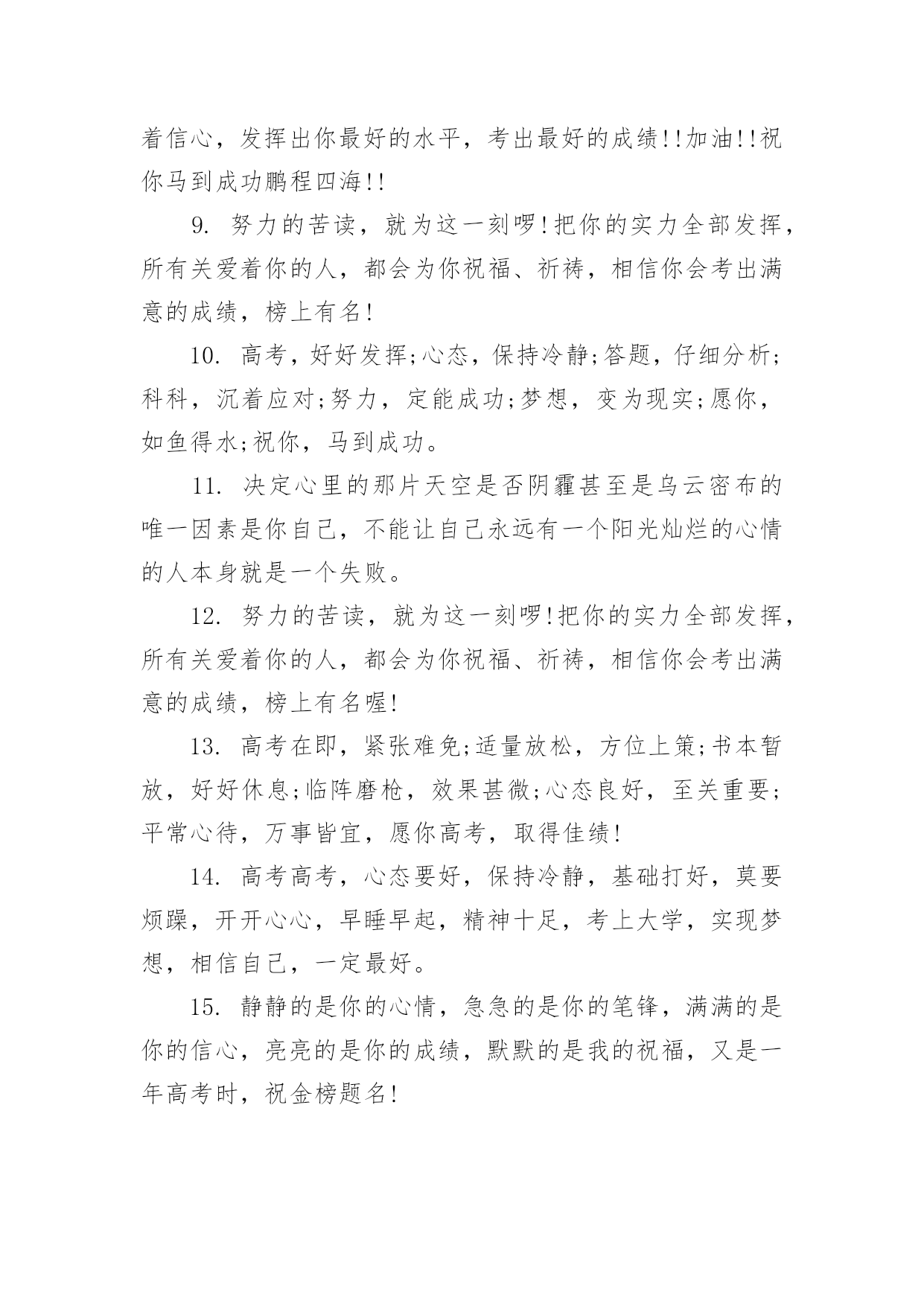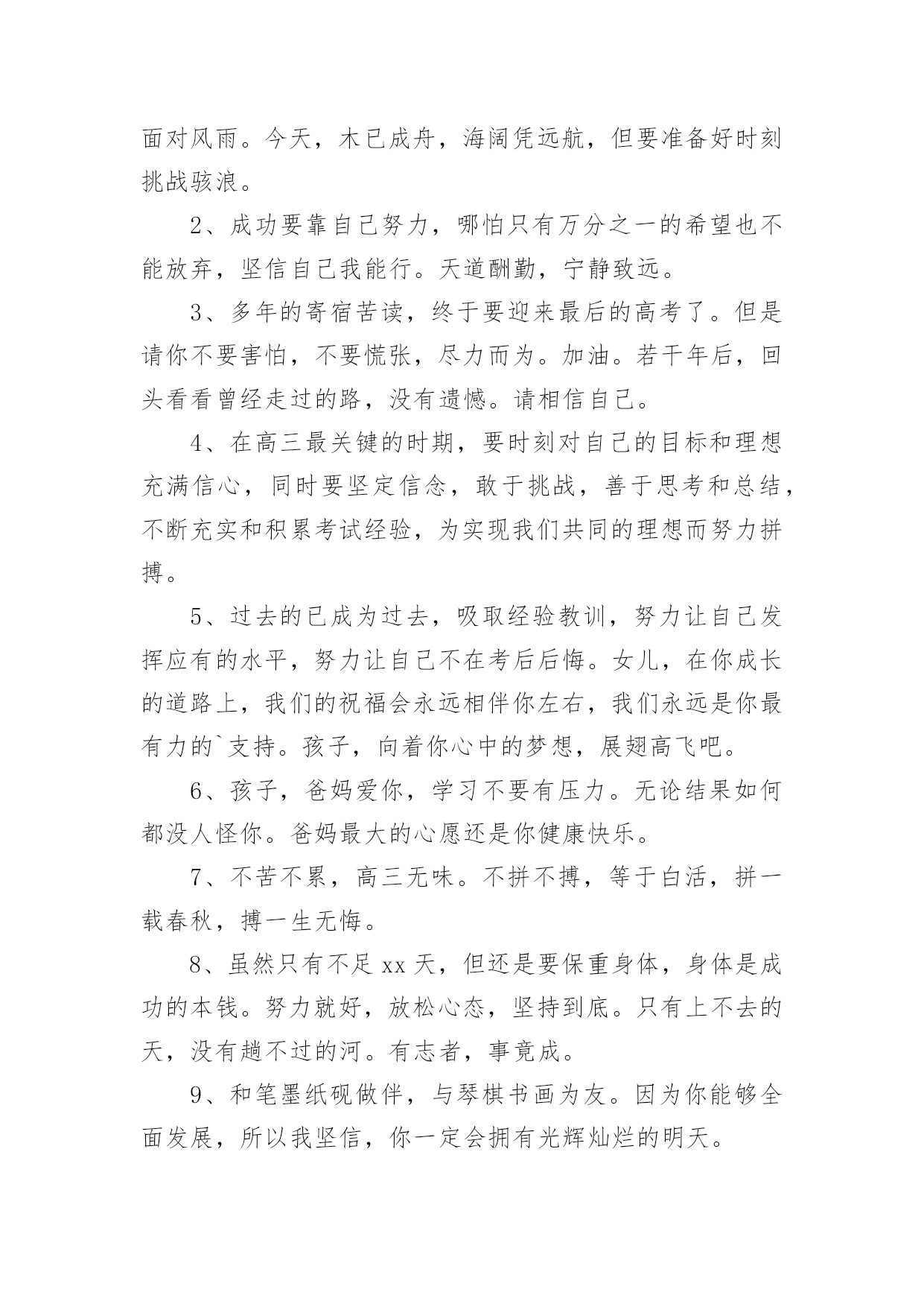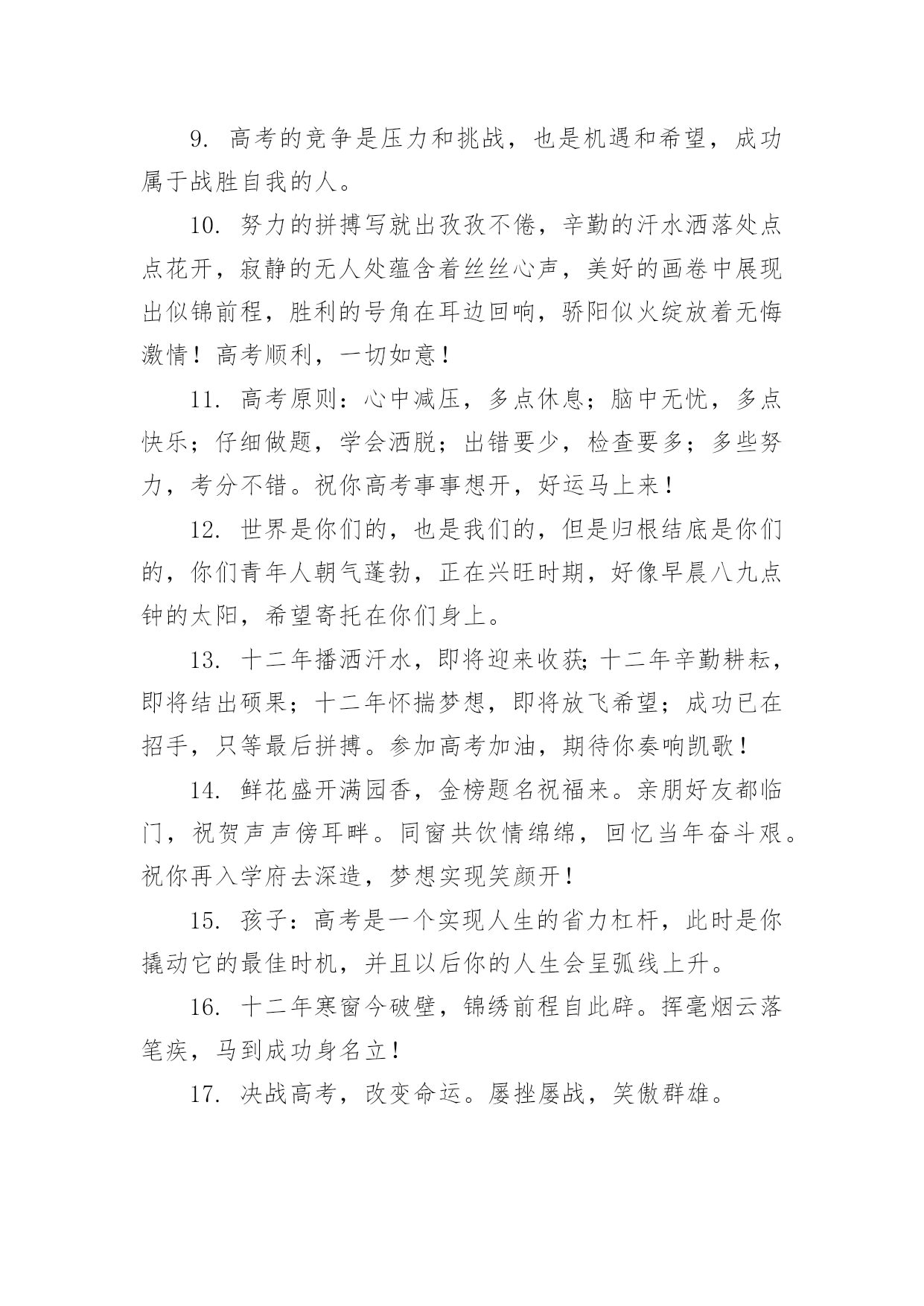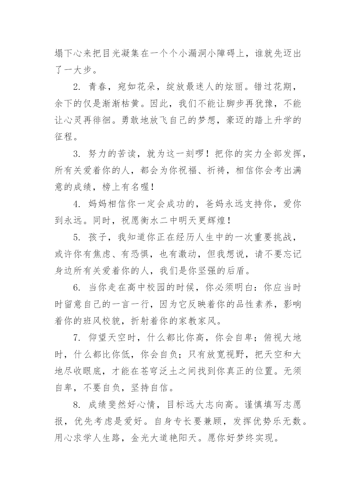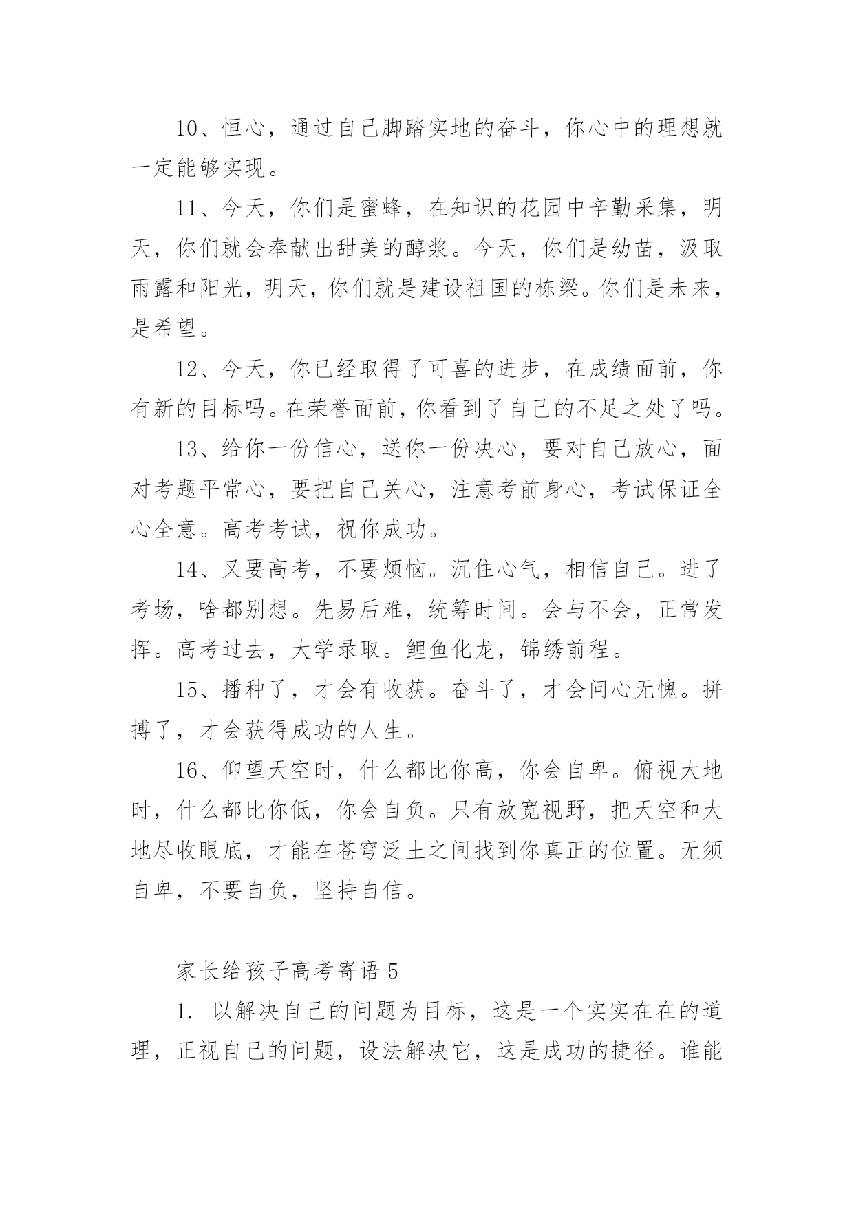 家长给孩子高考寄语1家长给孩子高考寄语高考不是你一个人在奋斗,家长也在背后默默的为你奋斗,那么家长给孩子高考寄语有哪些呢?下面是小编给大家整理的家长给孩子高考寄语,供大家参阅!家长给孩子高考寄语11.十年寒窗苦读日,只盼金榜题名时,祝你高考拿高分,鲤鱼跳龙门!加油。2.圣人与常人之间往往只相差一小步,而这一小步却往往需要非凡的毅力才能赶上。3.生命之中最快乐的是拼搏,而非成功,生命之中最痛苦的是懒散,而非失败。4.孩子,没有人能真正帮助你,除了你自己!做好自己的人生导演!沉着高考,一切顺利!5.孩子你是爸妈的希望,高考一定要沉着应战,心要平静,爸妈相信你能行的!6.孩子:面对高考,保持你心灵的善良与纯洁;保持你情感的热情与丰富;保持你精神的进取与激昂!7.孩子:高考是一个实现人生的省力杠杆,此时是你撬动它的最佳时机,并且以后你的人生会呈弧线上升。8.明天就是高考了,希望在这最后的日子,你能满怀着信心,发挥出你最好的水平,考出最好的成绩!!加油!!祝你马到成功鹏程四海!!9.努力的苦读,就为这一刻啰!把你的实力全部发挥,所有关爱着你的人,都会为你祝福、祈祷,相信你会考出满意的成绩,榜上有名!10.高考,好好发挥;心态,保持冷静;答题,仔细分析;科科,沉着应对;努力,定能成功;梦想,变为现实;愿你,如鱼得水;祝你,马到成功。11.决定心里的那片天空是否阴霾甚至是乌云密布的唯一因素是你自己,不能让自己永远有一个阳光灿烂的心情的人本身就是一个失败。12.努力的苦读,就为这一刻啰!把你的实力全部发挥,所有关爱着你的人,都会为你祝福、祈祷,相信你会考出满意的成绩,榜上有名喔!13.高考在即,紧张难免;适量放松,方位上策;书本暂放,好好休息;临阵磨枪,效果甚微;心态良好,至关重要;平常心待,万事皆宜,愿你高考,取得佳绩!14.高考高考,心态要好,保持冷静,基础打好,莫要烦躁,开开心心,早睡早起,精神十足,考上大学,实现梦想,相信自己,一定最好。15.静静的是你的心情,急急的是你的笔锋,满满的是你的信心,亮亮的是你的成绩,默默的是我的祝福,又是一年高考时,祝金榜题名!家长给孩子高考寄语21.我的好朋友,我儿时的好玩伴。愿你高考考出好成绩,考上自己理想的好大学。在此道出我最真心的祝福:相信自己,你一定是最棒的!2.决定心里的那片天空是否阴霾甚至是乌云密布的唯一因素是你自己,不能让自己永远有一个阳光灿烂的心情的人本身就是一个失败。3.祝愿天下所有考生开心度过高考。祝福你们旗开得胜,取得美好佳绩。平心对待高考,你们是最棒的!仁慈的上帝会祝福你们的,相信自己,一定能行!4.付出终有回报,信心绝对重要。高考了,别忘面带微笑。有空睡个好觉,不必紧张煎熬。敞开鲲鹏怀抱,直上青云九霄。祝高考顺利,金榜题名!5.高考日到,祝福送你一“分”,智慧增加比分,做题不会减分,压力别人瓜分,成绩最高得分,快乐定要十分,经过真心打分,定能获得百分。6.升学考试近了,寒窗苦读为前途,望子成龙父母情。我发短信传祝福:放下包袱开动脑筋,勤于思考好好复习,祝你取得好成绩,期待你的成功!7.高考着实是一种丰收,它包蕴着太多的内涵。无论高考成绩如何,你的成长与成熟是任何人无法改变的事实,这三年的辛勤走过,你获得的太多太多。8.亲爱的孩子,每一天爸爸都在全心全意地为你祝福。祝愿你从小的梦想成真!爸爸相信你一定会成功,明年秋天我就可以到大学校园探望你,我们一言为定。9.付出终究有回报,信心十足很重要;考前睡个安稳觉,不必临时抱佛脚;生活习惯莫乱套,吃饱喝好要做到;高考马上就到了,放松心态多微笑;超常发挥成绩好,金榜题名在今朝。祝高考顺利,成绩优异,事事如意!10.孩子,我相信你平时的努力没白费,你一定会考出个好成绩。不要慌张,认真看好题目,就像你平时做作业一样,参加高考就是一次检验你学习的过程,没什么可怕的。加油!我们等着你的好消息!11.亲爱的孩子,天,每一天爸爸都在全心全意地为你祝福。祝愿你从小的梦想成真!爸爸相信你一定会成功,明年秋天我就可以到大学校园探望你,我们一言为定。12.xx,我的宝贝,你是我的骄傲,妈妈为你自豪。在这收获的季节里,相信自己,就是胜利。愿你实现心中的梦想,放飞妈妈的希望。爸爸妈妈永远支持你!祝福你!13.这两天的考试过程中,要调整好自己的情绪,考过一门,就不要再想了,重要的是吃好,喝好,休息好,营造一种良好的应考氛围,爸爸祝愿你考试顺利!14.决战高考巅峰时,信心百倍增能量。真才实学浑不怕,文思隽永倍潇洒。十年磨剑试锋芒,百花丛中显芬芳。纵横考场斩关将,马到成功幸福尝!祝高考顺利!15.六月是奋斗的季节,六月是收获的季节。在经历了高考之后,捷报在焦急的等待中到来。愿你继续努力,在高等学府的知识海洋中畅游。祝前程似锦,宏图大展!家长给孩子高考寄语31、带着