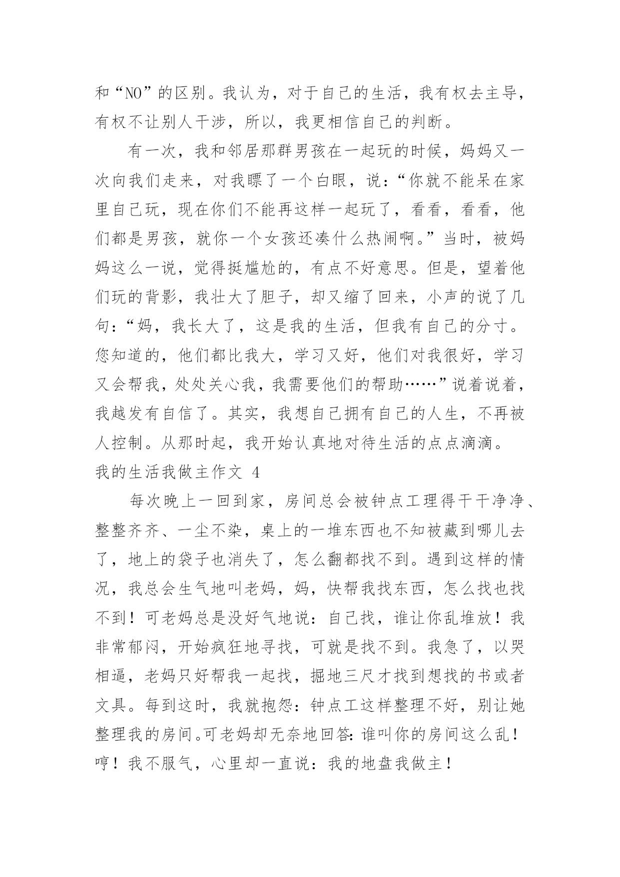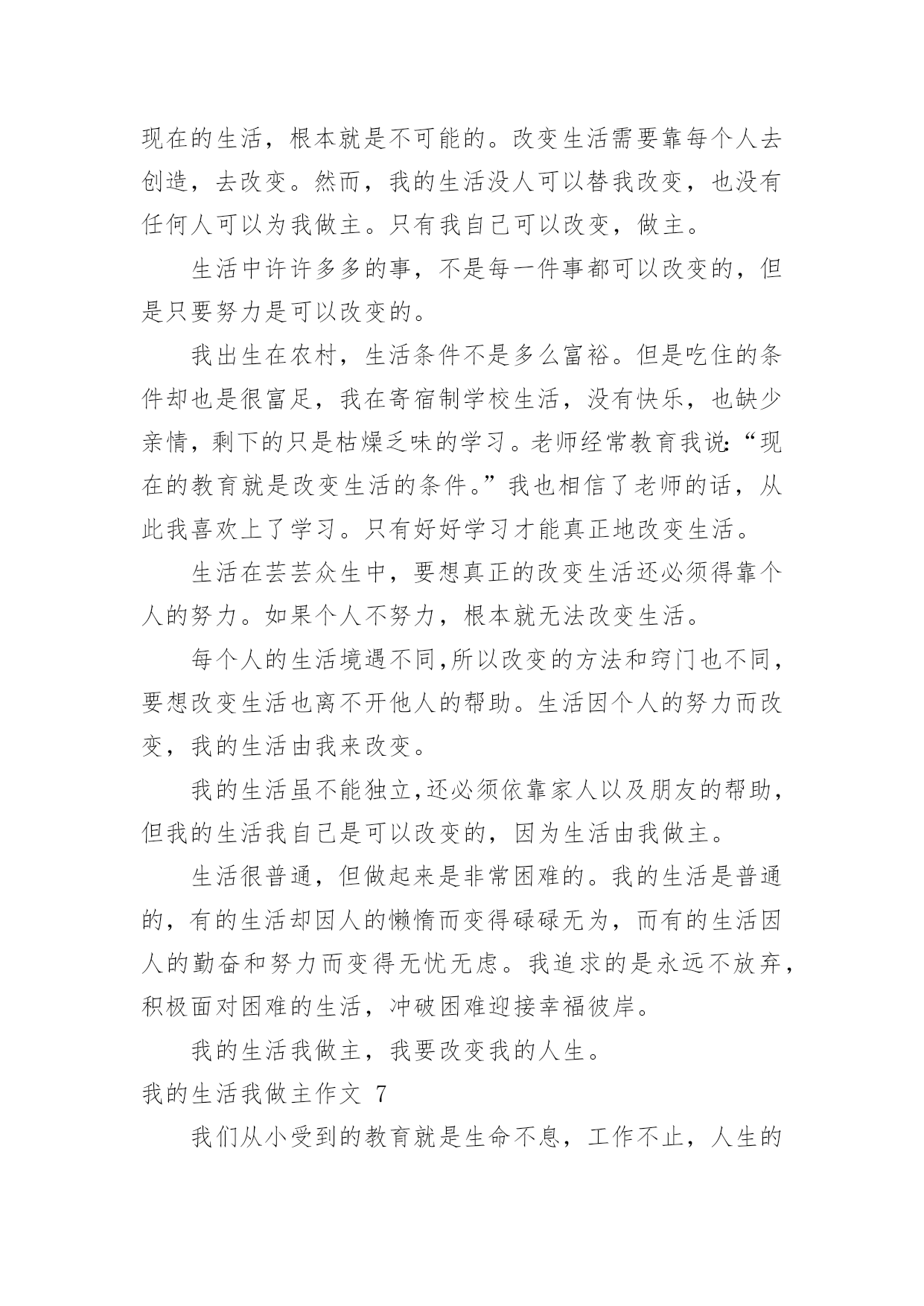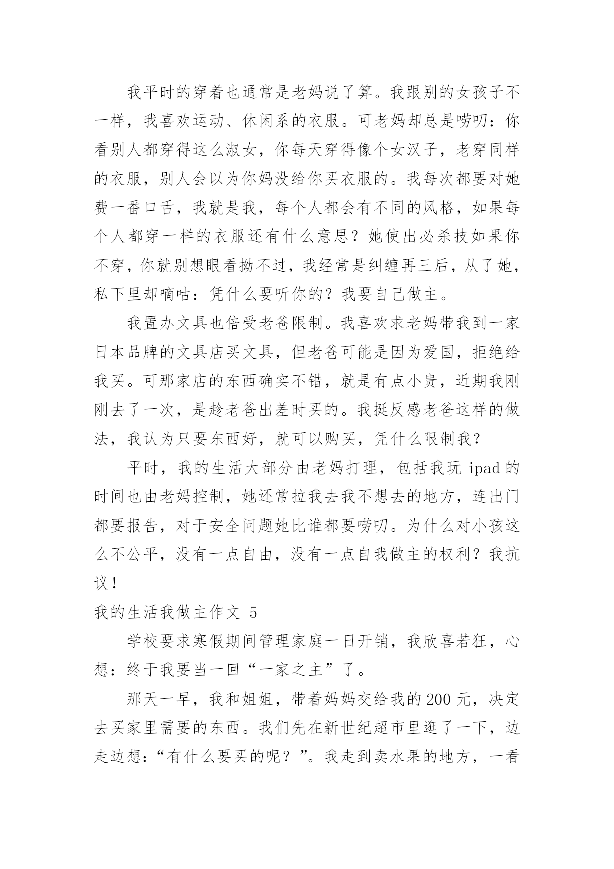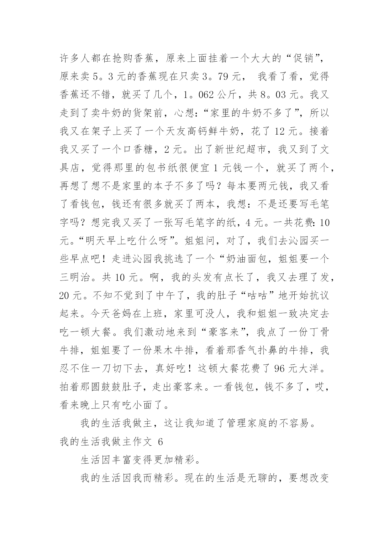 我的生活我做主作文我的生活我做主作文在日常学习、工作和生活中,许多人都写过作文吧,写作文可以锻炼我们的独处习惯,让自己的心静下来,思考自己未来的方向。那么,怎么去写作文呢?下面是小编为大家整理的我的生活我做主作文,仅供参考,希望能够帮助到大家。我的生活我做主作文1每当妈妈又打来电话,提醒我吃些什么可以更营养时,我都会“嗯”、“好”表示在听,其实我的内心里,真正想的却是“我的生活我做主!”开始为我的生活做主。我的爸爸妈妈因为工作的原因,去了离家不算远但也不算近的邻城上班,我则寄宿在学校。不过,到了暑假里,我的生活就变成了我一个人的生活,每月领着爸妈给我的生活费,在家里锻炼着自己的独立能力,也锻炼着自己的厨艺。所以每一次妈妈打来电话“要求”我的时刻,都会变成我不愿意反驳便装作听话的时刻,只因我心里边始终想着“我的生活我做主!”我喜欢“我的生活我做主!”那种感觉,我喜欢自己每天的作息时间都由自己来决定,更喜欢自己可以决定自己一日三餐可以吃些什么,而不是父母离我如此远,却还是能够电话遥控我必须做什么和怎么做!我的生活我做主,我可以早晨六七点起,也可以早晨九十点起,我可以早餐吃馒头包子,也可以早餐自己煮面条,我可以起得早的时候去菜市场买菜回来做午餐和晚餐,也可以宅在家里读书写字画画睡大觉,等到饿了再想吃饭这样的事情。现在还只是暑假,我的生活可以这样由我做主,那么我未来的生活呢?有时候我会忍不住想自己未来的生活,我未来的生活能不能也由我做主呢?我未来的生活,父母应该跟我在一起吧?和我一起生活是好的,是幸福的,但我还是希望着我的生活能够由我做主,而不是妈妈用“要求”的语气让我听她的话,无法决定自己今天几点起床和吃什么,更无法决定今天明天每一天我能做什么。我未来的生活,一定也要是我做主啊!我的生活我做主作文2不知不觉间,我已是四年的学生了!从到四年级这四年的时间里,我学会了很多,不仅仅是知识的提升,更多的是在老师和家长的共同培育下,学会了如何在一个陌生崭新的环境中快速的适应生活,和周围的人和睦的相处!记得刚进学校的时候,早晨起床随手将被子一折就去教室了,是班主任老师手把手的耐心的教导我,一遍遍的示范,让我学会了如何在短时间内将被子叠的板板正正!这个时候同宿舍的还有没学会叠被子的同伴,于是我就将我学到的耐心的示范给同伴同学,不仅如此,我还教导同学晚上睡觉前要进行洗刷,对于那些还不习惯这种生活的同学我还主动帮他们打洗脸刷牙水,和她们聊天沟通,使她们能尽快的融入到离开爸妈自己生活的环境!早晨我会比其他同学早起一会,挨着叫起还在睡梦中的同学,带领着同学清扫宿舍卫生,按时到教室参加新一天的学习生活!在我的带领下,我们宿舍的整体卫生状况都比其他宿舍的要略高一筹!放假回家的时候,在爸爸妈妈的正确引导下我培养了良好的生活习惯!回家后自己将自己的衣物整理干净,洗刷整齐,将力所能及的事情自己完成!吃完饭后帮妈妈洗洗碗,扫扫地,擦擦桌子!第二天不赖床,按时将老师布置的作业完成!利用完成作业的空闲,陪爷爷奶奶的聊聊天,下下棋!有时候姑姑家的妹妹会来我的'家里找我玩,我会和她一起先将她的作业做完,并且我会检查一遍,然后将自己的玩具,课外书本借给她玩,因此我们会在玩中学习!作为新世纪的少先队员,我应该不断的学习创新,做好老师的得力小助手,做好爸妈的好女儿!我的生活我做主作文3生活,不可或缺方向盘,更不可或缺控制方向盘的人。——题记我属于自由派,一个不喜欢受人约束的女孩。有天真的笑容,有春接的理念,有坚持不懈的目标,然而,现实生活中,我却处处地受别人掌控。家中的乖乖女,这是被大家所认可的。父母说什么就是什么,没有半句怨言,也从不拒绝,这是从小的我。现在,我学会说“NO”但是我不会是不懂事的孩子,会懂得“YES”和“NO”的区别。我认为,对于自己的生活,我有权去主导,有权不让别人干涉,所以,我更相信自己的判断。有一次,我和邻居那群男孩在一起玩的时候,妈妈又一次向我们走来,对我瞟了一个白眼,说:“你就不能呆在家里自己玩,现在你们不能再这样一起玩了,看看,看看,他们都是男孩,就你一个女孩还凑什么热闹啊。”当时,被妈妈这么一说,觉得挺尴尬的,有点不好意思。但是,望着他们玩的背影,我壮大了胆子,却又缩了回来,小声的说了几句:“妈,我长大了,这是我的生活,但我有自己的分寸。您知道的,他们都比我大,学习又好,他们对我很好,学习又会帮我,处处关心我,我需要他们的帮助……”说着说着,我越发有自信了。其实,我想自己拥有自己的人生,不再被人控制。从那时起,我开始认真地对待生活的点点滴滴。我的生活我做主作文4每次晚上一回到家,房间总会被钟点工理得干干净净、整整齐齐、一尘不染,桌上的一堆东西也不知被藏到哪儿去了,地上的袋子也消失了,怎么翻都找不到。遇到这样的情况,我总会生气地叫老妈,妈,快帮我