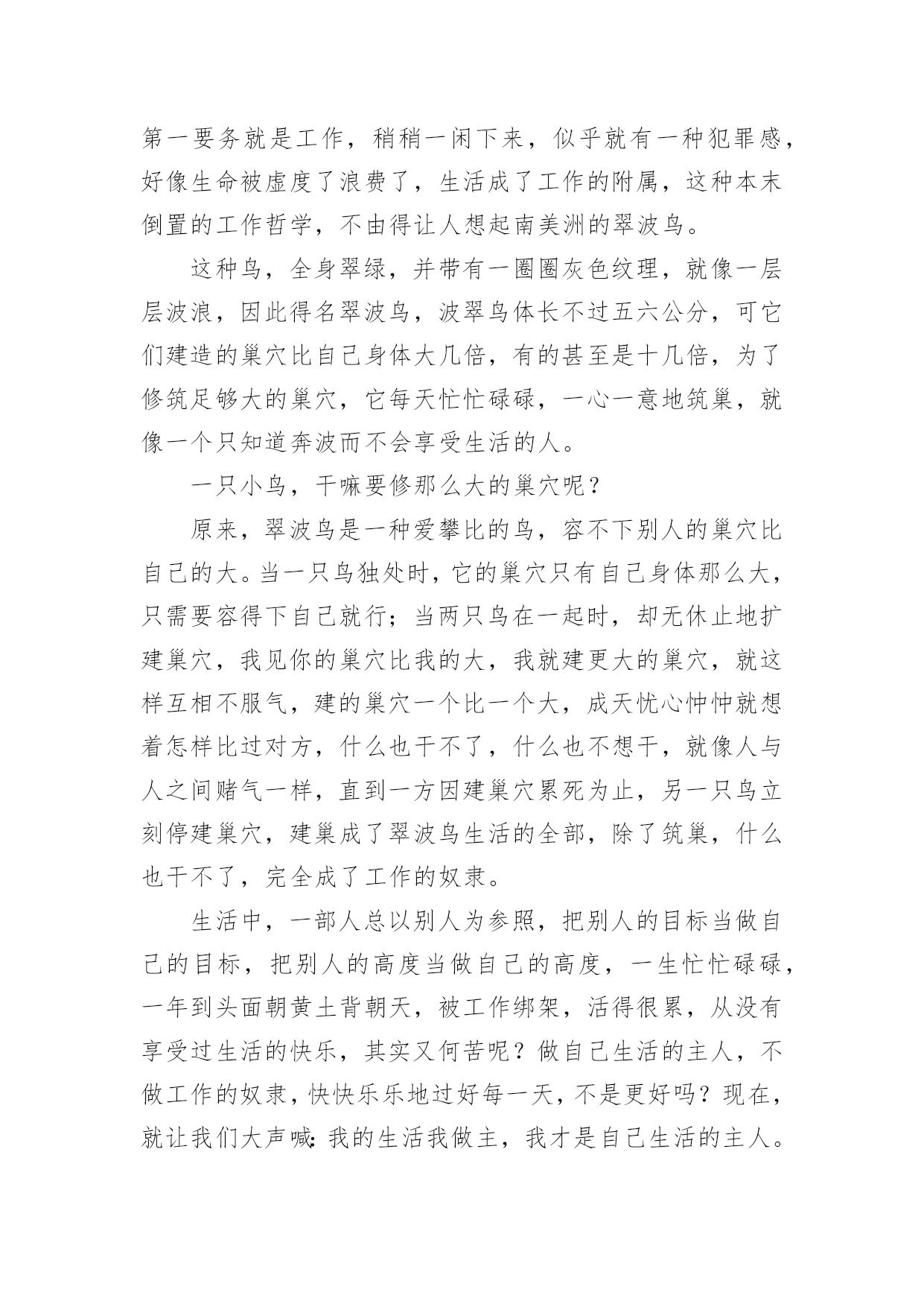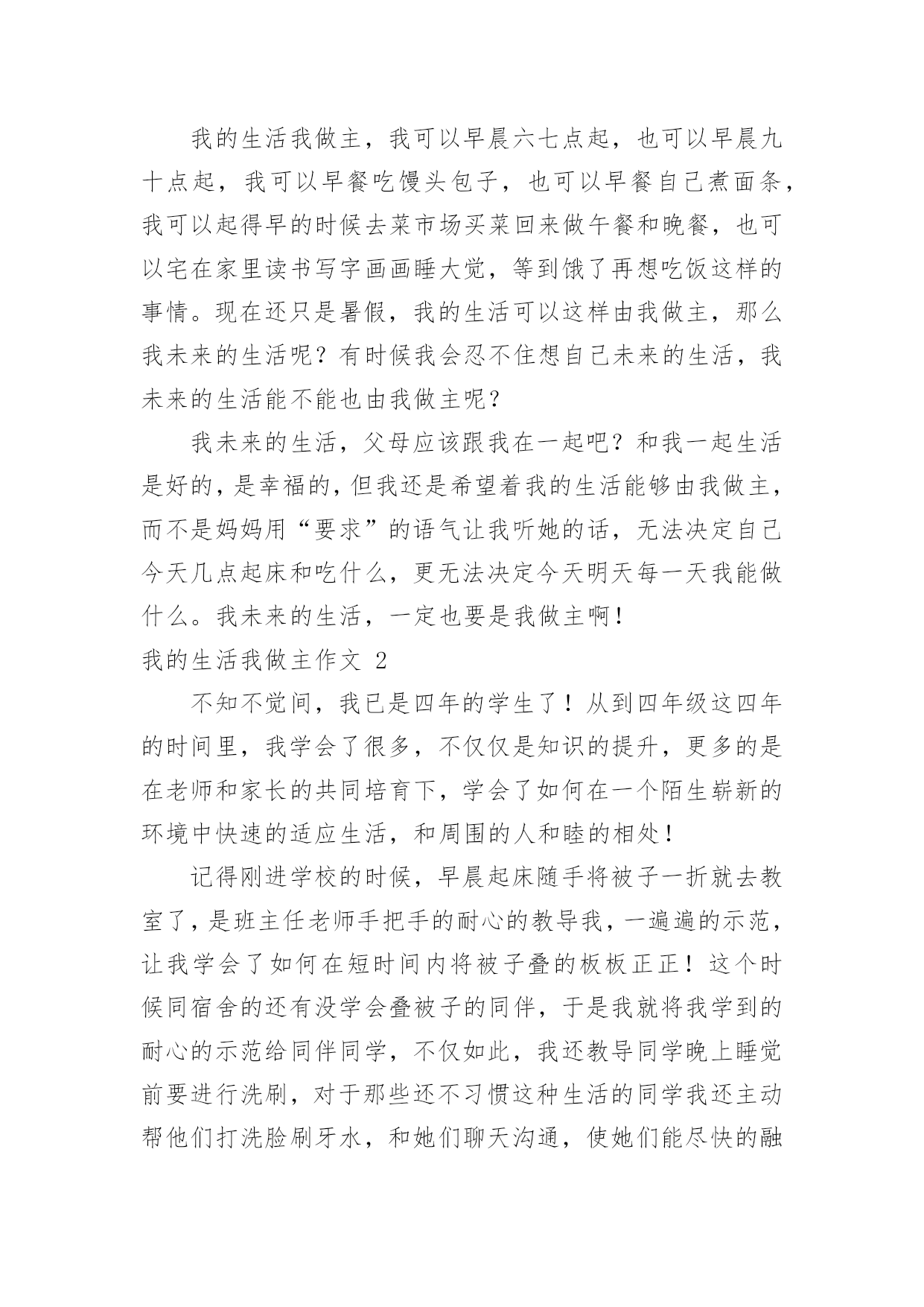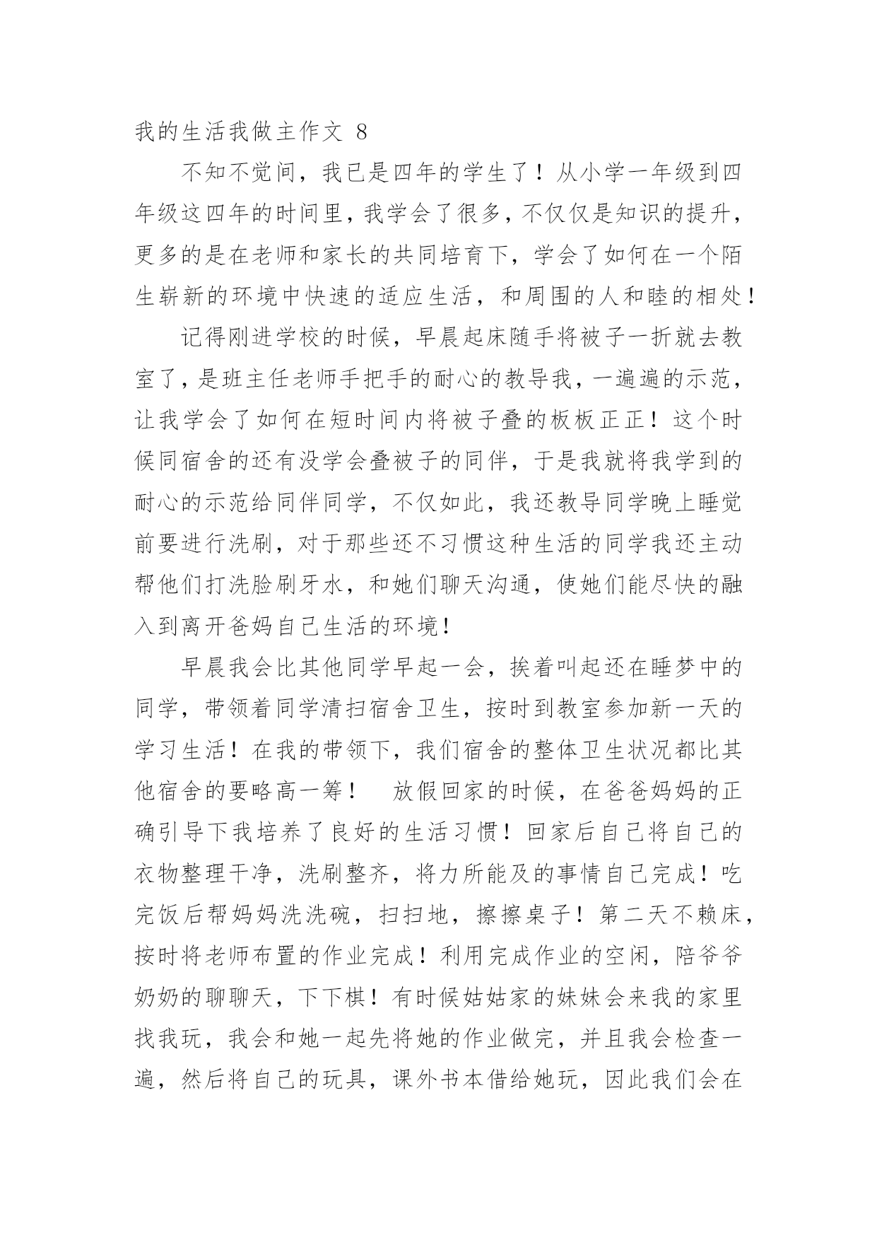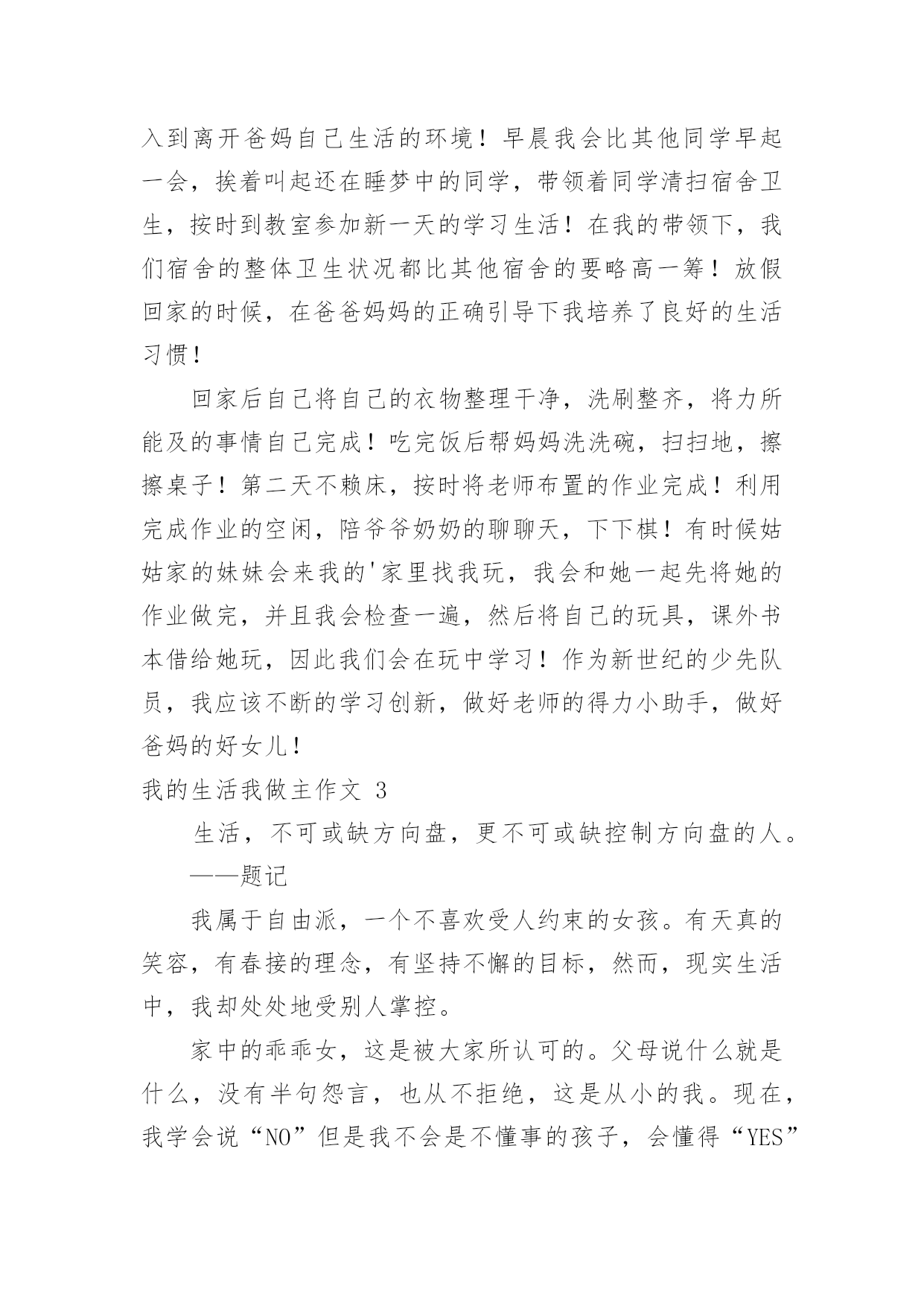 我的生活我做主作文我的生活我做主作文在日常学习、工作和生活中,许多人都写过作文吧,写作文可以锻炼我们的独处习惯,让自己的心静下来,思考自己未来的方向。那么,怎么去写作文呢?下面是小编为大家整理的我的生活我做主作文,仅供参考,希望能够帮助到大家。我的生活我做主作文1每当妈妈又打来电话,提醒我吃些什么可以更营养时,我都会“嗯”、“好”表示在听,其实我的内心里,真正想的却是“我的生活我做主!”开始为我的生活做主。我的爸爸妈妈因为工作的原因,去了离家不算远但也不算近的邻城上班,我则寄宿在学校。不过,到了暑假里,我的生活就变成了我一个人的生活,每月领着爸妈给我的生活费,在家里锻炼着自己的独立能力,也锻炼着自己的厨艺。所以每一次妈妈打来电话“要求”我的时刻,都会变成我不愿意反驳便装作听话的时刻,只因我心里边始终想着“我的生活我做主!”我喜欢“我的生活我做主!”那种感觉,我喜欢自己每天的作息时间都由自己来决定,更喜欢自己可以决定自己一日三餐可以吃些什么,而不是父母离我如此远,却还是能够电话遥控我必须做什么和怎么做!我的生活我做主,我可以早晨六七点起,也可以早晨九十点起,我可以早餐吃馒头包子,也可以早餐自己煮面条,我可以起得早的时候去菜市场买菜回来做午餐和晚餐,也可以宅在家里读书写字画画睡大觉,等到饿了再想吃饭这样的事情。现在还只是暑假,我的生活可以这样由我做主,那么我未来的生活呢?有时候我会忍不住想自己未来的生活,我未来的生活能不能也由我做主呢?我未来的生活,父母应该跟我在一起吧?和我一起生活是好的,是幸福的,但我还是希望着我的生活能够由我做主,而不是妈妈用“要求”的语气让我听她的话,无法决定自己今天几点起床和吃什么,更无法决定今天明天每一天我能做什么。我未来的生活,一定也要是我做主啊!我的生活我做主作文2不知不觉间,我已是四年的学生了!从到四年级这四年的时间里,我学会了很多,不仅仅是知识的提升,更多的是在老师和家长的共同培育下,学会了如何在一个陌生崭新的环境中快速的适应生活,和周围的人和睦的相处!记得刚进学校的时候,早晨起床随手将被子一折就去教室了,是班主任老师手把手的耐心的教导我,一遍遍的示范,让我学会了如何在短时间内将被子叠的板板正正!这个时候同宿舍的还有没学会叠被子的同伴,于是我就将我学到的耐心的示范给同伴同学,不仅如此,我还教导同学晚上睡觉前要进行洗刷,对于那些还不习惯这种生活的同学我还主动帮他们打洗脸刷牙水,和她们聊天沟通,使她们能尽快的融入到离开爸妈自己生活的环境!早晨我会比其他同学早起一会,挨着叫起还在睡梦中的同学,带领着同学清扫宿舍卫生,按时到教室参加新一天的学习生活!在我的带领下,我们宿舍的整体卫生状况都比其他宿舍的要略高一筹!放假回家的时候,在爸爸妈妈的正确引导下我培养了良好的生活习惯!回家后自己将自己的衣物整理干净,洗刷整齐,将力所能及的事情自己完成!吃完饭后帮妈妈洗洗碗,扫扫地,擦擦桌子!第二天不赖床,按时将老师布置的作业完成!利用完成作业的空闲,陪爷爷奶奶的聊聊天,下下棋!有时候姑姑家的妹妹会来我的'家里找我玩,我会和她一起先将她的作业做完,并且我会检查一遍,然后将自己的玩具,课外书本借给她玩,因此我们会在玩中学习!作为新世纪的少先队员,我应该不断的学习创新,做好老师的得力小助手,做好爸妈的好女儿!我的生活我做主作文3生活,不可或缺方向盘,更不可或缺控制方向盘的人。——题记我属于自由派,一个不喜欢受人约束的女孩。有天真的笑容,有春接的理念,有坚持不懈的目标,然而,现实生活中,我却处处地受别人掌控。家中的乖乖女,这是被大家所认可的。父母说什么就是什么,没有半句怨言,也从不拒绝,这是从小的我。现在,我学会说“NO”但是我不会是不懂事的孩子,会懂得“YES”和“NO”的区别。我认为,对于自己的生活,我有权去主导,有权不让别人干涉,所以,我更相信自己的判断。有一次,我和邻居那群男孩在一起玩的时候,妈妈又一次向我们走来,对我瞟了一个白眼,说:“你就不能呆在家里自己玩,现在你们不能再这样一起玩了,看看,看看,他们都是男孩,就你一个女孩还凑什么热闹啊。”当时,被妈妈这么一说,觉得挺尴尬的,有点不好意思。但是,望着他们玩的背影,我壮大了胆子,却又缩了回来,小声的说了几句:“妈,我长大了,这是我的生活,但我有自己的分寸。您知道的,他们都比我大,学习又好,他们对我很好,学习又会帮我,处处关心我,我需要他们的帮助……”说着说着,我越发有自信了。其实,我想自己拥有自己的人生,不再被人控制。从那时起,我开始认真地对待生活的点点滴滴。我的生活我做主作文4每次晚上一回到家,房间总会被钟点工理得干干净净、整整齐齐、一尘不染,桌上的一堆东西也不知被藏到哪儿去了,地上的袋子也消失了,怎么翻都找不到。遇到这样的情况,我总会生气地叫老妈,妈,快帮我