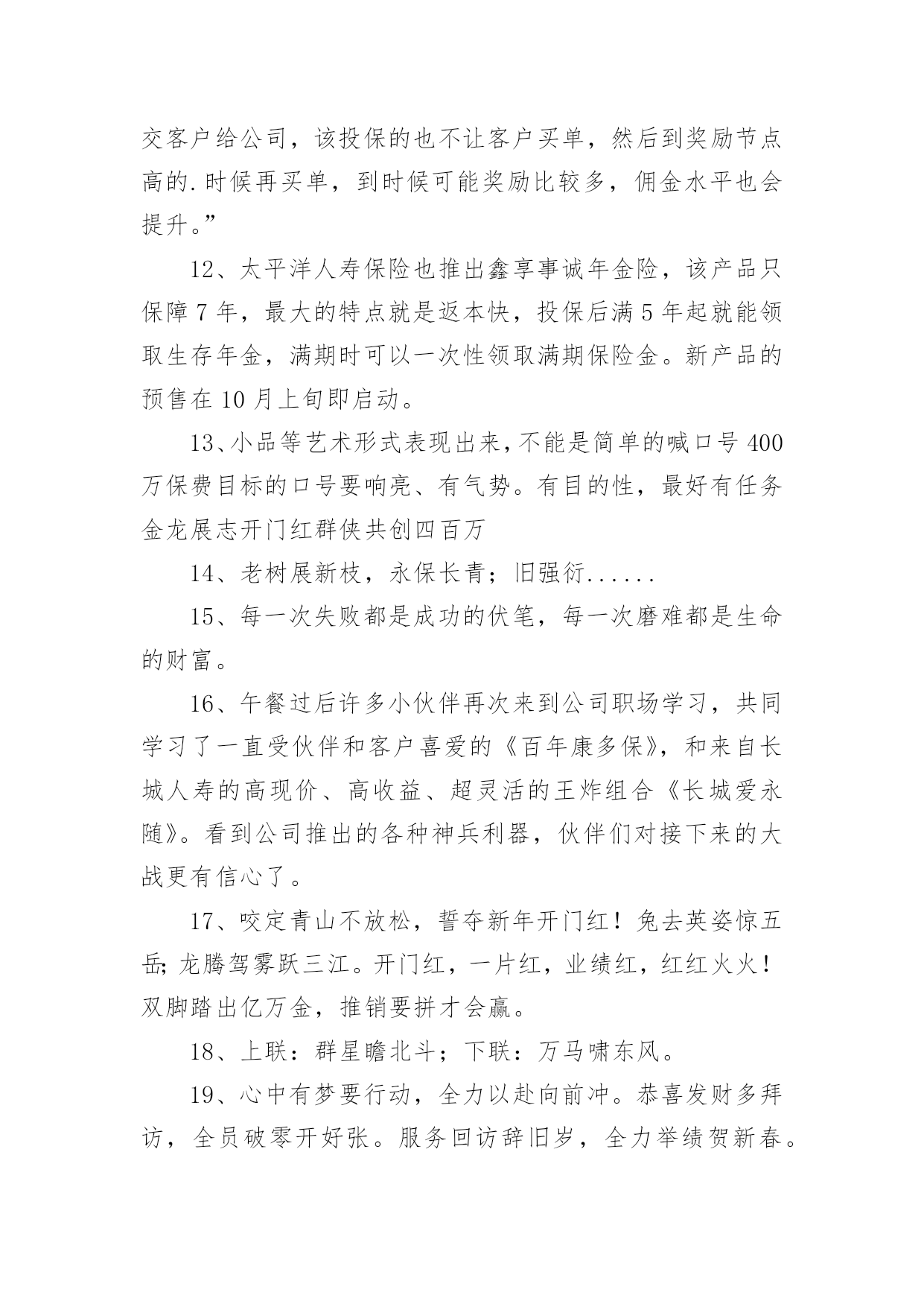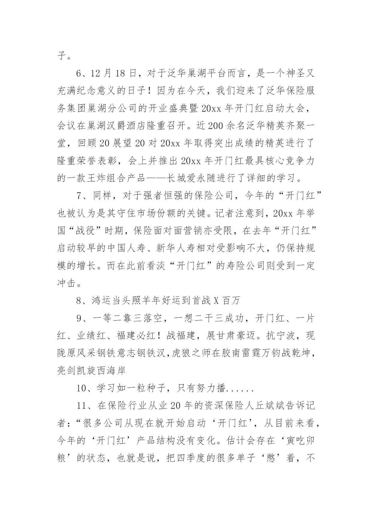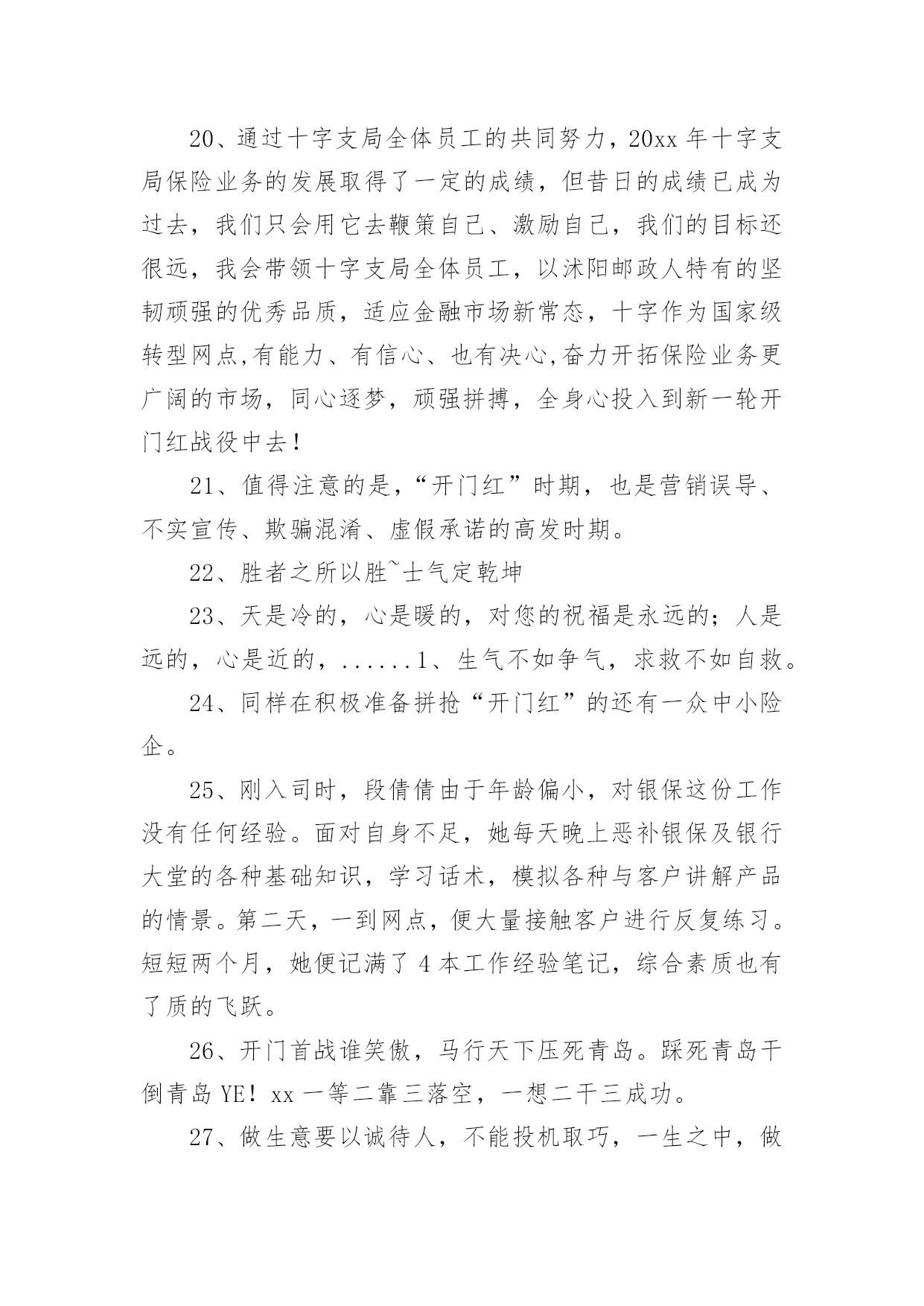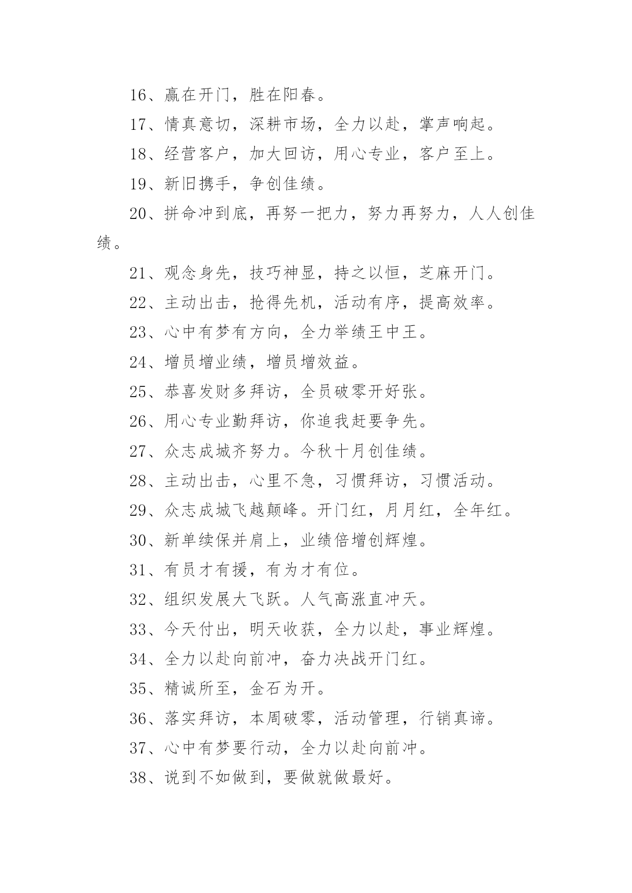 保险开门红口号保险开门红口号14篇在学习、工作乃至生活中,大家肯定对各类口号都很熟悉吧,高效的口号具有针对性,时效性,鼓动性和简洁性的特点。你知道什么样的口号才能算得上是好的口号吗?以下是小编整理的保险开门红口号,欢迎大家分享。保险开门红口号篇11、今日不为增员作努力,明日必为业绩掉眼泪。2、心中有梦不认命,全员实动一条心。3、服务三一五,回访老客户。4、坚定信念,行销一生。5、红五月里拜访忙,业绩过半心不慌。6、不怕增员难,就怕不增员。7、势如朝阳,斗志昂扬。8、时不我待,努力举绩,一鼓作气,挑战佳绩。9、行销起步,天天拜访,事业发展,用心学习。10、全员齐动,风起云涌,每日拜访,铭记心中。11、赢在开门,胜在阳春。12、将士不怕攻城难,万水千山只等闲。13、用心专业,身先神显,季度达标,奋再向前。14、有员才有援,有为才有位15、三心二意,扬鞭奋蹄,四面出击,勇争第一。16、赢在开门,胜在阳春。17、情真意切,深耕市场,全力以赴,掌声响起。18、经营客户,加大回访,用心专业,客户至上。19、新旧携手,争创佳绩。20、拼命冲到底,再努一把力,努力再努力,人人创佳绩。21、观念身先,技巧神显,持之以恒,芝麻开门。22、主动出击,抢得先机,活动有序,提高效率。23、心中有梦有方向,全力举绩王中王。24、增员增业绩,增员增效益。25、恭喜发财多拜访,全员破零开好张。26、用心专业勤拜访,你追我赶要争先。27、众志成城齐努力。今秋十月创佳绩。28、主动出击,心里不急,习惯拜访,习惯活动。29、众志成城飞越颠峰。开门红,月月红,全年红。30、新单续保并肩上,业绩倍增创辉煌。31、有员才有援,有为才有位。32、组织发展大飞跃。人气高涨直冲天。33、今天付出,明天收获,全力以赴,事业辉煌。34、全力以赴向前冲,奋力决战开门红。35、精诚所至,金石为开。36、落实拜访,本周破零,活动管理,行销真谛。37、心中有梦要行动,全力以赴向前冲。38、说到不如做到,要做就做最好。39、谁敢横刀立马,唯我张大将军。40、服务回访辞旧岁,全力举绩贺新春。41、开门红,一片红,业绩红,红红火火。42、增员是根,活动为枝,业绩是果。43、率先举绩,抢占先机。44、你增我增大家增,团队发展舞春风。45、从业有缘,惜福感恩。46、善用职场,广开人际。47、一步先,步步先;开门红,月月红。48、扛起战旗剑出鞘,规模效益一起要。49、争分夺秒勤拜访,广积客户备战忙。50、组织成长,增员第一。51、改变突破,止成至功。52、组织兴衰,荣辱与共。53、全力以赴I荣誉,踏平陕西展湘魂。54、马踏映骄阳,冀风我飞扬,完胜黑龙江,对抗我最强。强强强。55、一马当先,全员举绩,梅开二度,业绩保底。56、新老携手多举绩,平安夜里大狂欢。57、奇迹靠人创造,机遇靠人争取。58、新单续保并肩上,全力冲刺创辉煌。59、人人心中有目标,失败成功我都要。60、攻守并重,全员实动,活动目标,服务导向。61、停止增员,等于停止生机。62、改变思路,再获成功。63、业绩靠士气,人才靠培育。64、服务客户,播种金钱,增加信任,稳定续收。65、争取转介绍,举绩两不误。66、坚持出勤,专业提升,分享交流,为您分忧。67、市场练兵;心里有底,团结拼搏,勇争第一。68、业务规划,重在管理,坚持不懈,永葆佳绩。保险开门红口号篇21、借势渠道,专业经营超越梦想,北京必胜!马踏映骄阳,满堂开门红新疆将士越天山,力压北分战熬头2、人的一生其实很短,如白驹过隙,弹指一瞬间。3、焦作中支马村支公司经理李芳4、20xx年12月18日,泛华保险马鞍山分公司在鸿泰国际大酒店成功迎来了机构首个开门红启动会,并圆满举办。300余名泛华精英齐聚一堂,回顾20展望20作为一家全省最年轻新筹机构,20xx年华保费跻身到全省第二的位置。20xx年坚决贯彻执行泛华模式:“以销售组织建设为核心,大力发展寿险,坚定不移构建‘全面金融、科技领先’竞争优势,马鞍山全体泛华精英将以满腔热情迎接新一年的挑战,再创新的辉煌。5、你若不想做,总会找到借口;你若想做,总会找到方法。沙子是废物,水泥也是废物,但他们混在一起是混凝土,就是精品;大米是精品,汽油也是精品,但他们混在一起就是废......1、去过你想过的日子,别去想你过了的日子。6、12月18日,对于泛华巢湖平台而言,是一个神圣又充满纪念意义的日子!因为在今天,我们迎来了泛华保险服务集团巢湖分公司的开业盛典暨20xx年开门红启动大会,会议在巢湖汉爵酒店隆重召开。近200余名泛华精英齐聚一堂,回顾20展望20对20xx年取得突出成绩的精英进行了隆重荣誉表彰,会上并推出20xx年开门红最具核心竞争力的一款王炸组合产品——长城爱永随进行了详细的学习。7、同样,对于强者恒强的保险公司,今年的“开门红