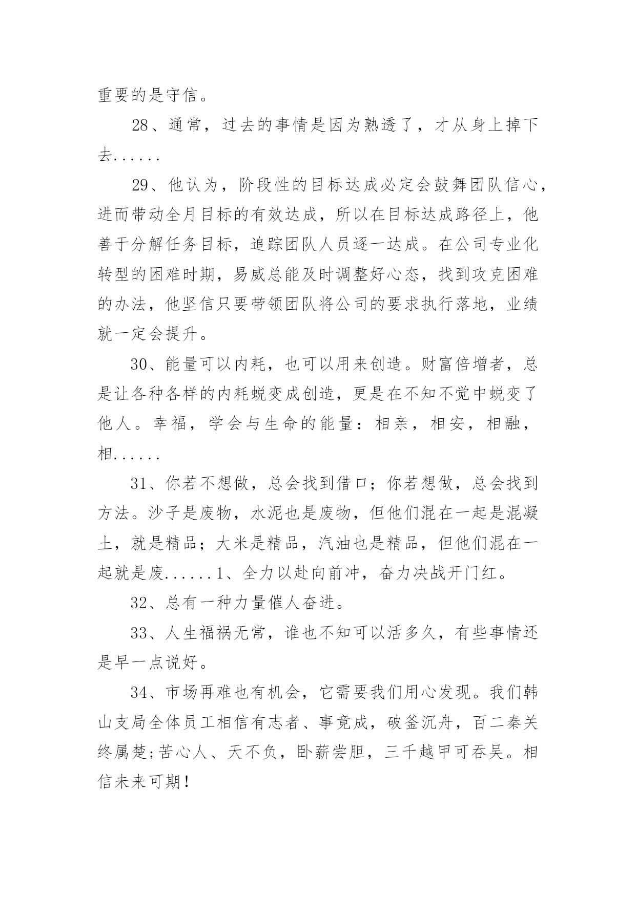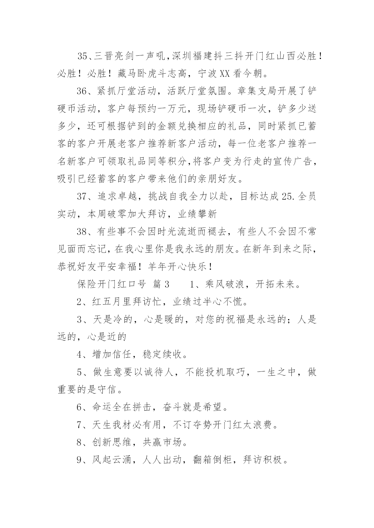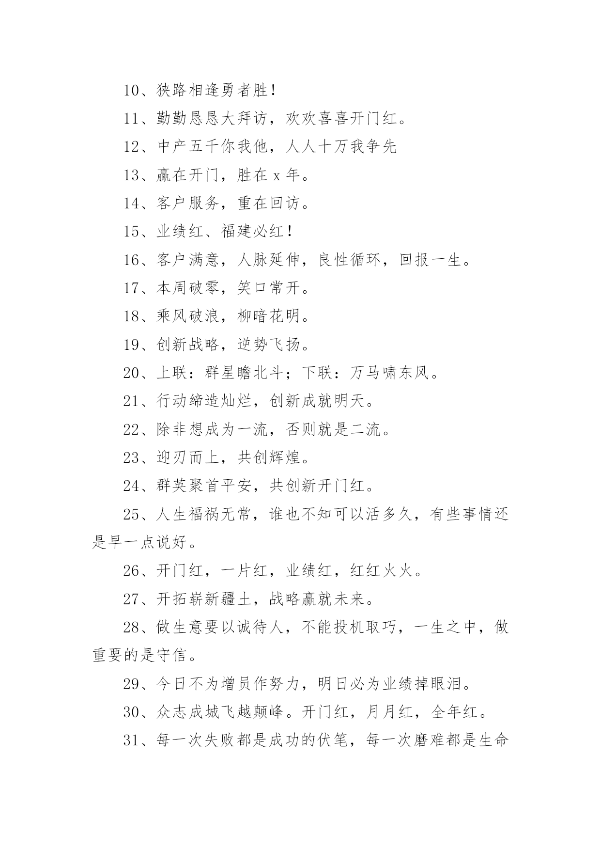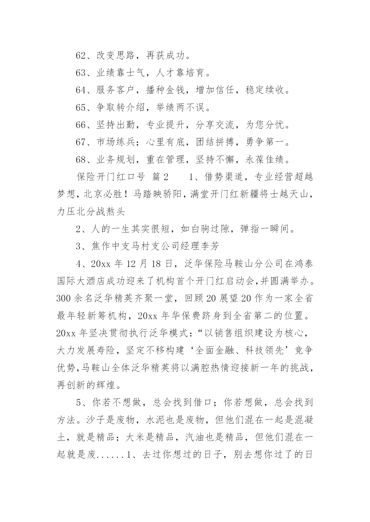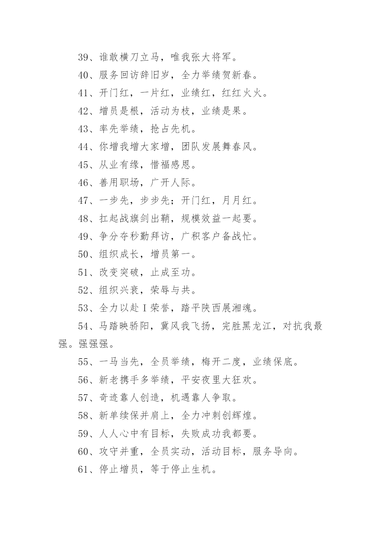 保险开门红口号保险开门红口号14篇在学习、工作乃至生活中,大家肯定对各类口号都很熟悉吧,高效的口号具有针对性,时效性,鼓动性和简洁性的特点。你知道什么样的口号才能算得上是好的口号吗?以下是小编整理的保险开门红口号,欢迎大家分享。保险开门红口号篇11、今日不为增员作努力,明日必为业绩掉眼泪。2、心中有梦不认命,全员实动一条心。3、服务三一五,回访老客户。4、坚定信念,行销一生。5、红五月里拜访忙,业绩过半心不慌。6、不怕增员难,就怕不增员。7、势如朝阳,斗志昂扬。8、时不我待,努力举绩,一鼓作气,挑战佳绩。9、行销起步,天天拜访,事业发展,用心学习。10、全员齐动,风起云涌,每日拜访,铭记心中。11、赢在开门,胜在阳春。12、将士不怕攻城难,万水千山只等闲。13、用心专业,身先神显,季度达标,奋再向前。14、有员才有援,有为才有位15、三心二意,扬鞭奋蹄,四面出击,勇争第一。16、赢在开门,胜在阳春。17、情真意切,深耕市场,全力以赴,掌声响起。18、经营客户,加大回访,用心专业,客户至上。19、新旧携手,争创佳绩。20、拼命冲到底,再努一把力,努力再努力,人人创佳绩。21、观念身先,技巧神显,持之以恒,芝麻开门。22、主动出击,抢得先机,活动有序,提高效率。23、心中有梦有方向,全力举绩王中王。24、增员增业绩,增员增效益。25、恭喜发财多拜访,全员破零开好张。26、用心专业勤拜访,你追我赶要争先。27、众志成城齐努力。今秋十月创佳绩。28、主动出击,心里不急,习惯拜访,习惯活动。29、众志成城飞越颠峰。开门红,月月红,全年红。30、新单续保并肩上,业绩倍增创辉煌。31、有员才有援,有为才有位。32、组织发展大飞跃。人气高涨直冲天。33、今天付出,明天收获,全力以赴,事业辉煌。34、全力以赴向前冲,奋力决战开门红。35、精诚所至,金石为开。36、落实拜访,本周破零,活动管理,行销真谛。37、心中有梦要行动,全力以赴向前冲。38、说到不如做到,要做就做最好。39、谁敢横刀立马,唯我张大将军。40、服务回访辞旧岁,全力举绩贺新春。41、开门红,一片红,业绩红,红红火火。42、增员是根,活动为枝,业绩是果。43、率先举绩,抢占先机。44、你增我增大家增,团队发展舞春风。45、从业有缘,惜福感恩。46、善用职场,广开人际。47、一步先,步步先;开门红,月月红。48、扛起战旗剑出鞘,规模效益一起要。49、争分夺秒勤拜访,广积客户备战忙。50、组织成长,增员第一。51、改变突破,止成至功。52、组织兴衰,荣辱与共。53、全力以赴I荣誉,踏平陕西展湘魂。54、马踏映骄阳,冀风我飞扬,完胜黑龙江,对抗我最强。强强强。55、一马当先,全员举绩,梅开二度,业绩保底。56、新老携手多举绩,平安夜里大狂欢。57、奇迹靠人创造,机遇靠人争取。58、新单续保并肩上,全力冲刺创辉煌。59、人人心中有目标,失败成功我都要。60、攻守并重,全员实动,活动目标,服务导向。61、停止增员,等于停止生机。62、改变思路,再获成功。63、业绩靠士气,人才靠培育。64、服务客户,播种金钱,增加信任,稳定续收。65、争取转介绍,举绩两不误。66、坚持出勤,专业提升,分享交流,为您分忧。67、市场练兵;心里有底,团结拼搏,勇争第一。68、业务规划,重在管理,坚持不懈,永葆佳绩。保险开门红口号篇21、借势渠道,专业经营超越梦想,北京必胜!马踏映骄阳,满堂开门红新疆将士越天山,力压北分战熬头2、人的一生其实很短,如白驹过隙,弹指一瞬间。3、焦作中支马村支公司经理李芳4、20xx年12月18日,泛华保险马鞍山分公司在鸿泰国际大酒店成功迎来了机构首个开门红启动会,并圆满举办。300余名泛华精英齐聚一堂,回顾20展望20作为一家全省最年轻新筹机构,20xx年华保费跻身到全省第二的位置。20xx年坚决贯彻执行泛华模式:“以销售组织建设为核心,大力发展寿险,坚定不移构建‘全面金融、科技领先’竞争优势,马鞍山全体泛华精英将以满腔热情迎接新一年的挑战,再创新的辉煌。5、你若不想做,总会找到借口;你若想做,总会找到方法。沙子是废物,水泥也是废物,但他们混在一起是混凝土,就是精品;大米是精品,汽油也是精品,但他们混在一起就是废......1、去过你想过的日子,别去想你过了的日子。6、12月18日,对于泛华巢湖平台而言,是一个神圣又充满纪念意义的日子!因为在今天,我们迎来了泛华保险服务集团巢湖分公司的开业盛典暨20xx年开门红启动大会,会议在巢湖汉爵酒店隆重召开。近200余名泛华精英齐聚一堂,回顾20展望20对20xx年取得突出成绩的精英进行了隆重荣誉表彰,会上并推出20xx年开门红最具核心竞争力的一款王炸组合产品——长城爱永随进行了详细的学习。7、同样,对于强者恒强的保险公司,今年的“开门红
