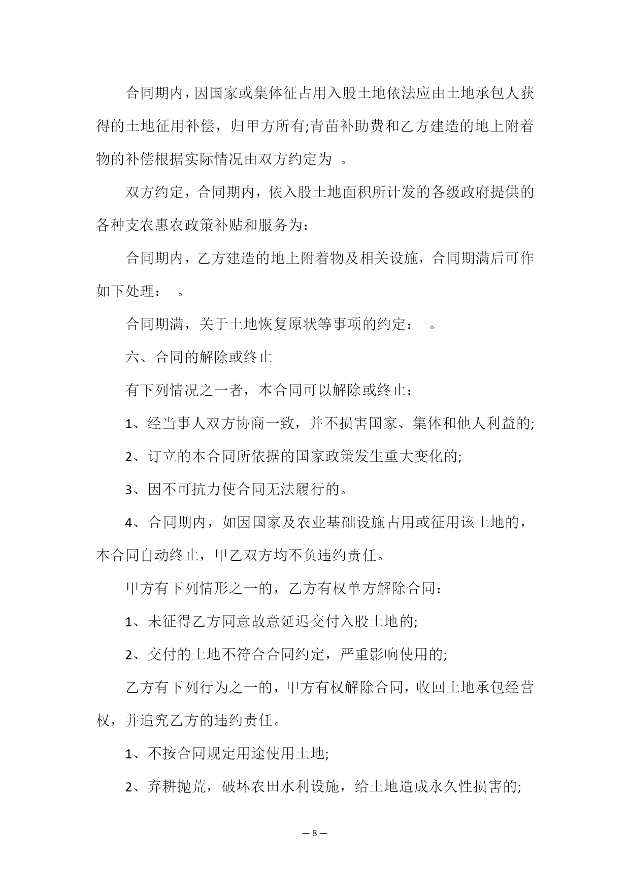 —PAGE\*MERGEFORMAT30—入股经营合同10篇入股经营合同1甲方:__________乙方:__________甲乙双方在平等自愿的基础上,经友好协商订立本协议,双方共同遵照执行。第一条:甲方以为其所持有的____________专利所有权作为无形资产入股乙方____________公司,双方同意以协商作价的形式确定该专利价值元,占公司总资本的20%。第二条:甲方保证所持专利技术的合法性和完整性,并处于有效期内。第三条:甲方应及时办理权利转移手续,提供有关的技术资料,进行技术指导、传授技术诀窍,使该专利顺利转移给乙方____________公司并被公司完全掌握。第四条:乙方承诺对甲方因本次专利入股而提供、披露的任何技术秘密及专有资讯承担严格的保密责任,不以任何方式提供给任何第三方占有或者使用,任何股东不得用于自营业务。第五条:专利入股后,甲方取得股东地位,持有公司20%的股份,该专利所有权由乙方公司享有。第六条:甲方可随时行使《中华人民共和国公司法》规定的有限责任公司股东之权利而不受非法干涉,但应保守公司秘密。第七条:该专利应用后公司撤资两次或者任意两个月出现连续亏损,则甲方有权决定该协议是否解除;协议解除后甲方不承担因乙方其他股东的过错导致的公司债务,乙方亦无权继续使用该专利。第八条:专利应用后,基于该专利的'改进而产生的新成果在合同存续期间归公司所有,合同解除后归甲方所有,甲方应给予乙方适当补偿。第九条:一方违反本协议之约定的,应当支付对方违约金元,给对方造成损失的还应赔偿对方损失,因一方严重违约造成协议不能继续履行的,对方有权解除合同。第十条:凡因履行本协议所发生的或者与本协议有关的一切争议双方均应当通过友好协商解决,如协商不成,应在协议签订地人民法院诉讼解决。第十一条:本协议经双方签字盖章后生效,本协议正本一式份,协议各方各执一份,具有同等效力。甲方××乡〔年份〕第号甲方:联系电话:甲方住所:原土地承包合同编号:原土地承包经营权证书编号:乙方:联系电话:乙方住所:为了保障双方当事人的合法权益,根据国家有关法律、法规和政策规定,甲乙双方本着平等协商、自愿、有偿的原则,经双方协商一致,订立本合同。一、入股土地面积、位置及用途甲方自愿以其拥有土地承包经营权的土地亩向乙方入股,入股土地的面积、位置及用途详见下表:二、入股期限期限年,自年月日起至年月日止。三、股金分红及支付方式甲方入股土地的折股方式及份额:股金分红约定:股金分红的支付方式和支付时间:其他约定。四、权利和义务甲方的权利和义务1、甲方有权按照合同规定收取土地股金分红;按照合同约定的期限到期收回入股的土地。2、甲方作为原承包方与发包方的承包合同仍然有效,应继续履行相应的义务。3、甲方有权监督乙方经营土地和保护土地的情况,并要求乙方按约履行合同义务。4、甲方在土地承包经营权流转后,应报发包方备案。5、甲方应协助乙方按合同约定行使土地使用权,不得干预乙方依法进行的生产经营活动。乙方的权利和义务1、乙方有权要求甲方按合同约定交付入股土地,要求甲方全面履行合同义务。2、乙方在受让地块上具有使用权、生产经营自主权、产品处置权和收益权。3、乙方在国家法律法规和政策允许范围内从事生产经营活动,依照合同约定按时足额支付股金分红。加强安全生产,防止事故发生,造成损失的,乙方自行承担责任。4、乙方应依法保护和合理利用土地,不得擅自改变土地规定用途,不得进行掠夺性经营,不得弃耕抛荒,不得给土地造成永久性损害。5、乙方在入股期限内未经甲方同意,不得擅自将土地流转给他人。入股土地不得进行抵押。五、违约责任流转期内,如一方违约,违约方应向对方支付违约金元,造成损失的,依法予以赔偿。因国家法律、法规和政策调整等不可抗力影响,需要变更或解除合同的,按相关规定执行。六、纠纷解决方法流转期内发生纠纷的,双方当事人可以协商解决,也可以请求村民委员会、乡镇人民政府等调解解决。当事人不愿协商、调解或者协商、调解不成的,可以向本辖区农村土地承包仲裁委员会申请仲裁,也可以直接向人民法院起诉。七、双方约定的其他事项1、入股合同到期后地上附着物及相关设施的处理约定:当前地上附着物及相关设施统计:。当前地上附着物及相关设施作价和归属约定:。到期后地上附着物及相关设施的处理约定:。2、有关国家政策性补贴归属的约定:。3、入股土地被征收、占用依法应获得补偿费归属的约定:。八、本合同自双方签字盖章之日起生效。流转当事人可以向乡镇农村土地承包管理部门申请鉴证。九、本合同如有变更或未尽事宜,由甲乙双方共同协商,作出补充约定。补充约定与本合同具有同等效力。十、本合同一式四份,甲乙双方