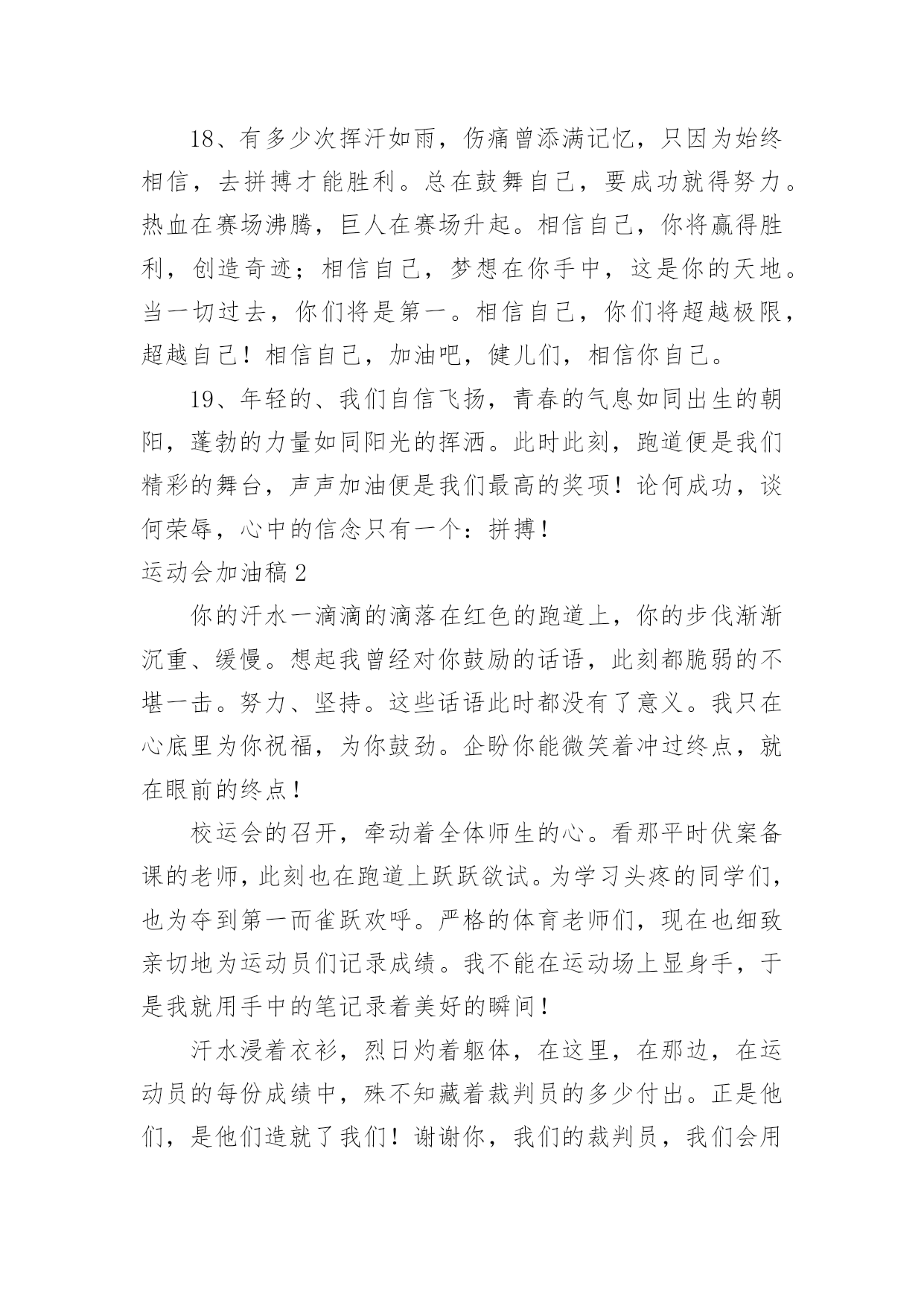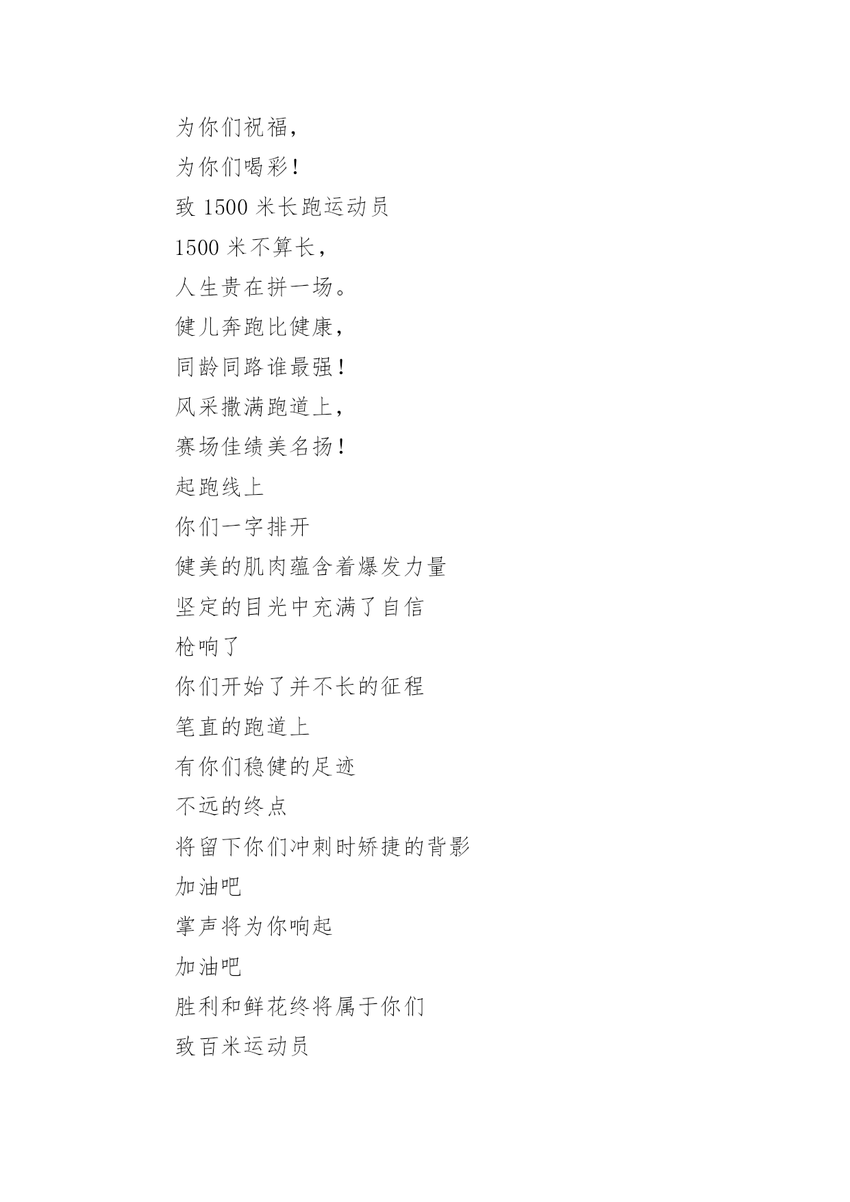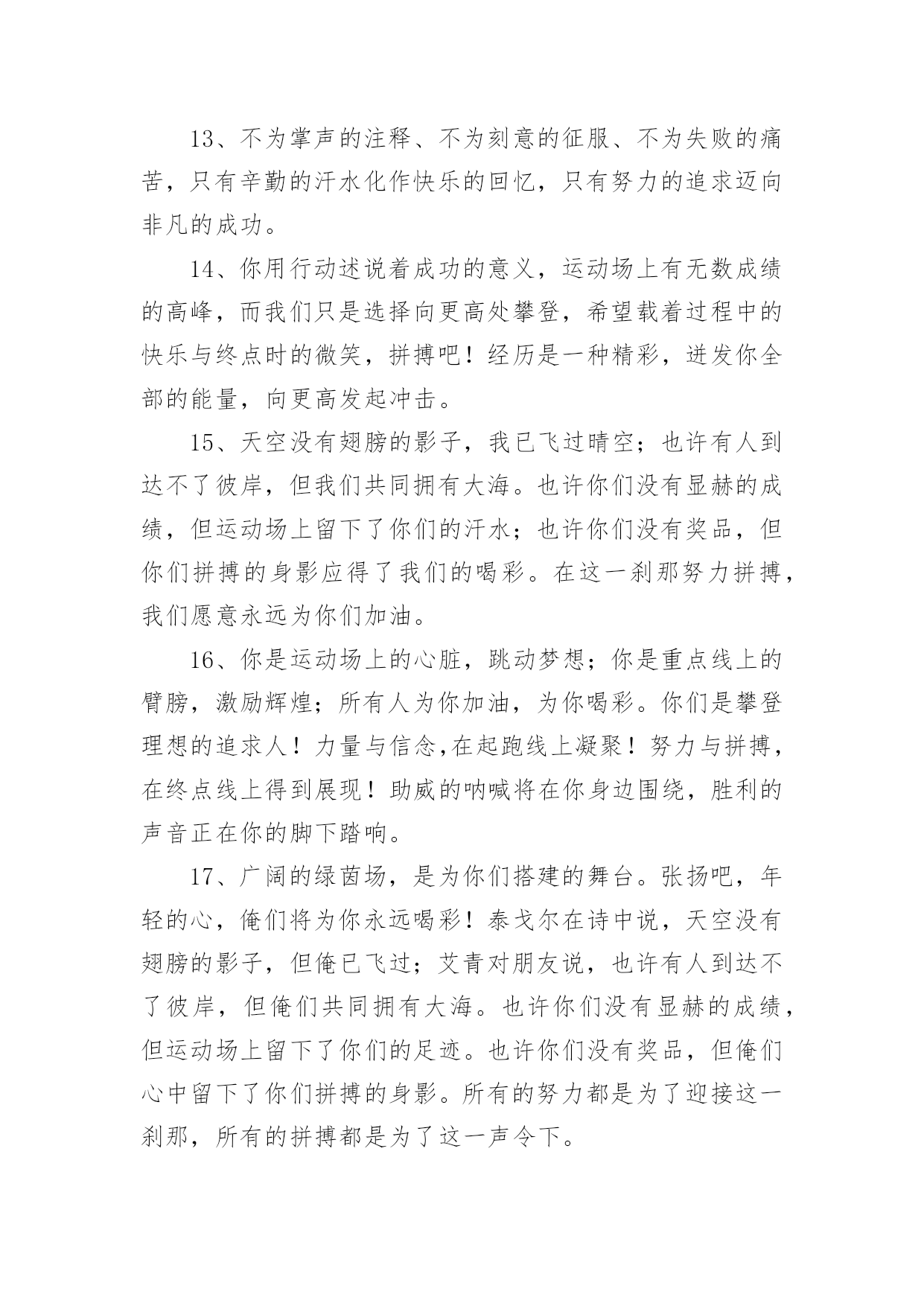 运动会加油稿运动会加油稿在现在社会,接触并使用加油稿的人越来越多,加油稿是鼓励激励对方的文稿。如何写一份恰当的加油稿呢?以下是小编精心整理的运动会加油稿,希望对大家有所帮助。运动会加油稿11、广阔的绿茵场,是为你们搭建的舞台。张扬吧,年轻的心,我们将为你永远喝彩!2、泰戈尔在诗中说,天空没有翅膀的影子,但我已飞过;艾青对朋友说,也许有人到达不了彼岸,但我们共同拥有大海。也许你们没有显赫的成绩,但运动场上留下了你们的足迹。也许你们没有奖品,但我们心中留下了你们拼搏的身影。所有的努力都是为了迎接这一刹那,所有的拼搏都是为了这一声令下。3、就像花儿准备了春、秋、冬,就是为了红透整个盛夏。就像雪花经历了春、夏、秋就是为了洁白整个严冬。蹲下,昂首,出发……轻轻的一抬脚,便牵动了全场的目光潇洒的迫挥挥手,便满足了那一份无言的等待。迎着朝阳,你们踏歌而去,背着希望,我们等待你们的归来。4、也许流星并不少见,但它燃烧的刹那,留给人间最美丽的回忆!也许笑脸并不少见,但胜利的喜悦,总会留给世界精彩的一瞬!是的,那些曾经美妙的东西只有短短的一瞬间,但那却把最辉煌的一刻留给了人间。胜利,是每个人所追求的,胜利的`喜悦,是胜利与重新开始的转折,胜利是新的开始!5、不长不短的距离,需要的是全身心全程投入,自始至终你们都在拼全力此时此刻,你们处在最风光的一刻,无论第几坚持胜利的信心,只要跑下来,你们就是英雄。6、时间在流逝,赛道在延伸,成功在你面前展现心脏的跳动,热血在沸腾,辉煌在你脚下铸就加油吧,健儿们。7、这是意志的拼搏。这是速度的挑战。胜利在向你们招手/胜利在向你们呼唤。8、不为鲜花的围绕,不为刹那的荣耀,只有执着的信念,化作不停的奔跑,心中燃烧着梦想,脚下不停的步伐。9、你用行动述说着过城的重要,没有无尽的终点,没有无法攀登的险峰,希望载着终点在向你微笑,拼搏吧!经历是一种精彩,迸发你全部的能量,成功是你汗水的写照。10、虽然你们在场上的时间很短暂,但你们的身影依然停留在人们的脑海里,因为你们是赛场上最可爱的人。11、不为掌声的注释不为刻意的征服不为失败的痛苦只有辛勤的汗水化作成功的脚步。12、超越对手,更要超越自我,追求卓越是我们的目标,是我们的信念,在清爽的秋季,在喧嚣的赛场,你们点燃了似火的热情,无论成败,你们永远是我们的骄傲,我们都为你们感到自豪!13、不为掌声的注释、不为刻意的征服、不为失败的痛苦,只有辛勤的汗水化作快乐的回忆,只有努力的追求迈向非凡的成功。14、你用行动述说着成功的意义,运动场上有无数成绩的高峰,而我们只是选择向更高处攀登,希望载着过程中的快乐与终点时的微笑,拼搏吧!经历是一种精彩,迸发你全部的能量,向更高发起冲击。15、天空没有翅膀的影子,我已飞过晴空;也许有人到达不了彼岸,但我们共同拥有大海。也许你们没有显赫的成绩,但运动场上留下了你们的汗水;也许你们没有奖品,但你们拼搏的身影应得了我们的喝彩。在这一刹那努力拼搏,我们愿意永远为你们加油。16、你是运动场上的心脏,跳动梦想;你是重点线上的臂膀,激励辉煌;所有人为你加油,为你喝彩。你们是攀登理想的追求人!力量与信念,在起跑线上凝聚!努力与拼搏,在终点线上得到展现!助威的呐喊将在你身边围绕,胜利的声音正在你的脚下踏响。17、广阔的绿茵场,是为你们搭建的舞台。张扬吧,年轻的心,俺们将为你永远喝彩!泰戈尔在诗中说,天空没有翅膀的影子,但俺已飞过;艾青对朋友说,也许有人到达不了彼岸,但俺们共同拥有大海。也许你们没有显赫的成绩,但运动场上留下了你们的足迹。也许你们没有奖品,但俺们心中留下了你们拼搏的身影。所有的努力都是为了迎接这一刹那,所有的拼搏都是为了这一声令下。18、有多少次挥汗如雨,伤痛曾添满记忆,只因为始终相信,去拼搏才能胜利。总在鼓舞自己,要成功就得努力。热血在赛场沸腾,巨人在赛场升起。相信自己,你将赢得胜利,创造奇迹;相信自己,梦想在你手中,这是你的天地。当一切过去,你们将是第一。相信自己,你们将超越极限,超越自己!相信自己,加油吧,健儿们,相信你自己。19、年轻的、我们自信飞扬,青春的气息如同出生的朝阳,蓬勃的力量如同阳光的挥洒。此时此刻,跑道便是我们精彩的舞台,声声加油便是我们最高的奖项!论何成功,谈何荣辱,心中的信念只有一个:拼搏!运动会加油稿2你的汗水一滴滴的滴落在红色的跑道上,你的步伐渐渐沉重、缓慢。想起我曾经对你鼓励的话语,此刻都脆弱的不堪一击。努力、坚持。这些话语此时都没有了意义。我只在心底里为你祝福,为你鼓劲。企盼你能微笑着冲过终点,就在眼前的终点!校运会的召开,牵动着全体师生的心。看那平时伏案备课的老师,此刻也在跑道上跃跃欲试。为学习头疼的同学们,也为夺到第一而雀跃欢呼。严格的体育老师们,现在也细致亲切地为运动员们记录成绩。我不能在运动场上显身手