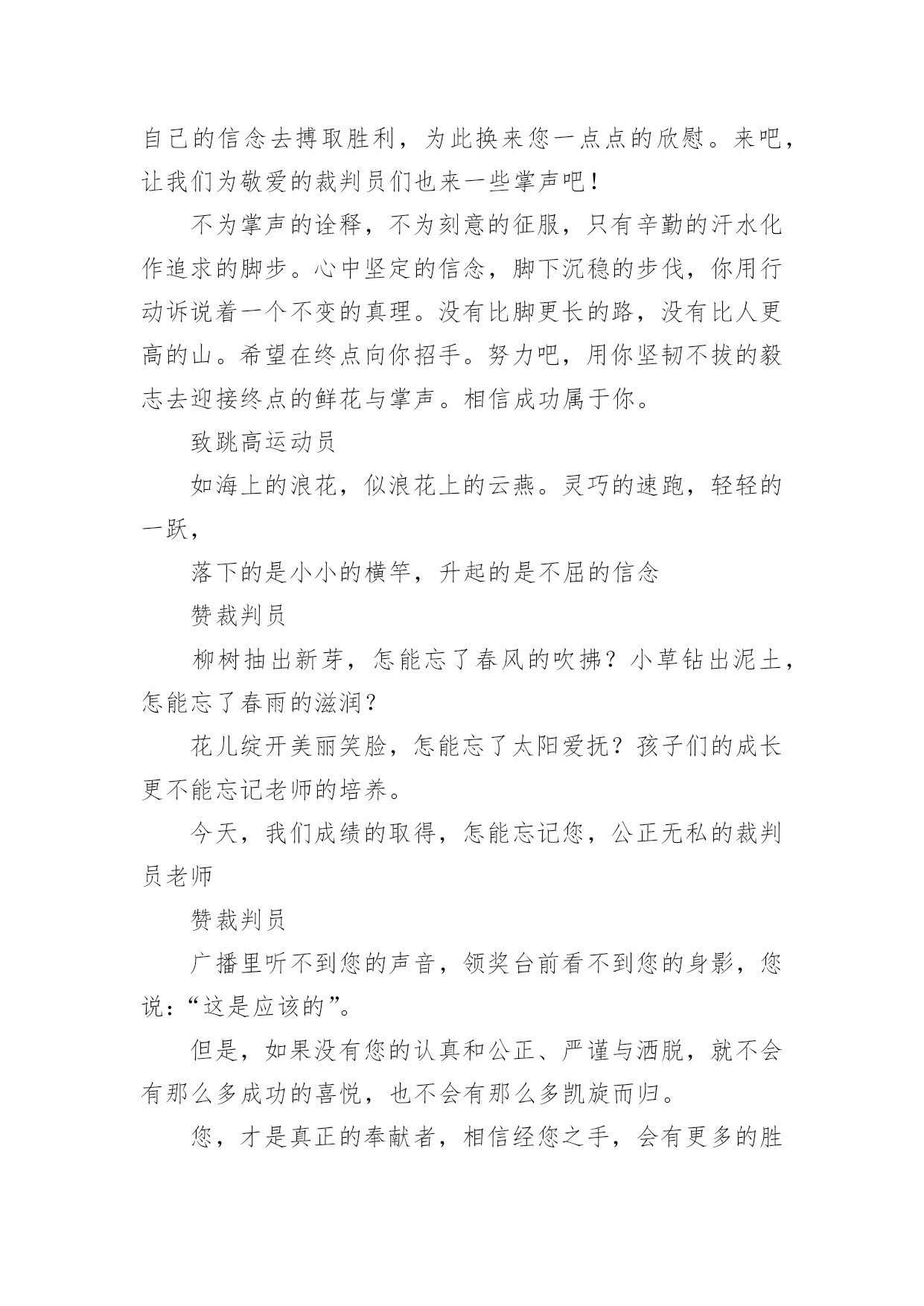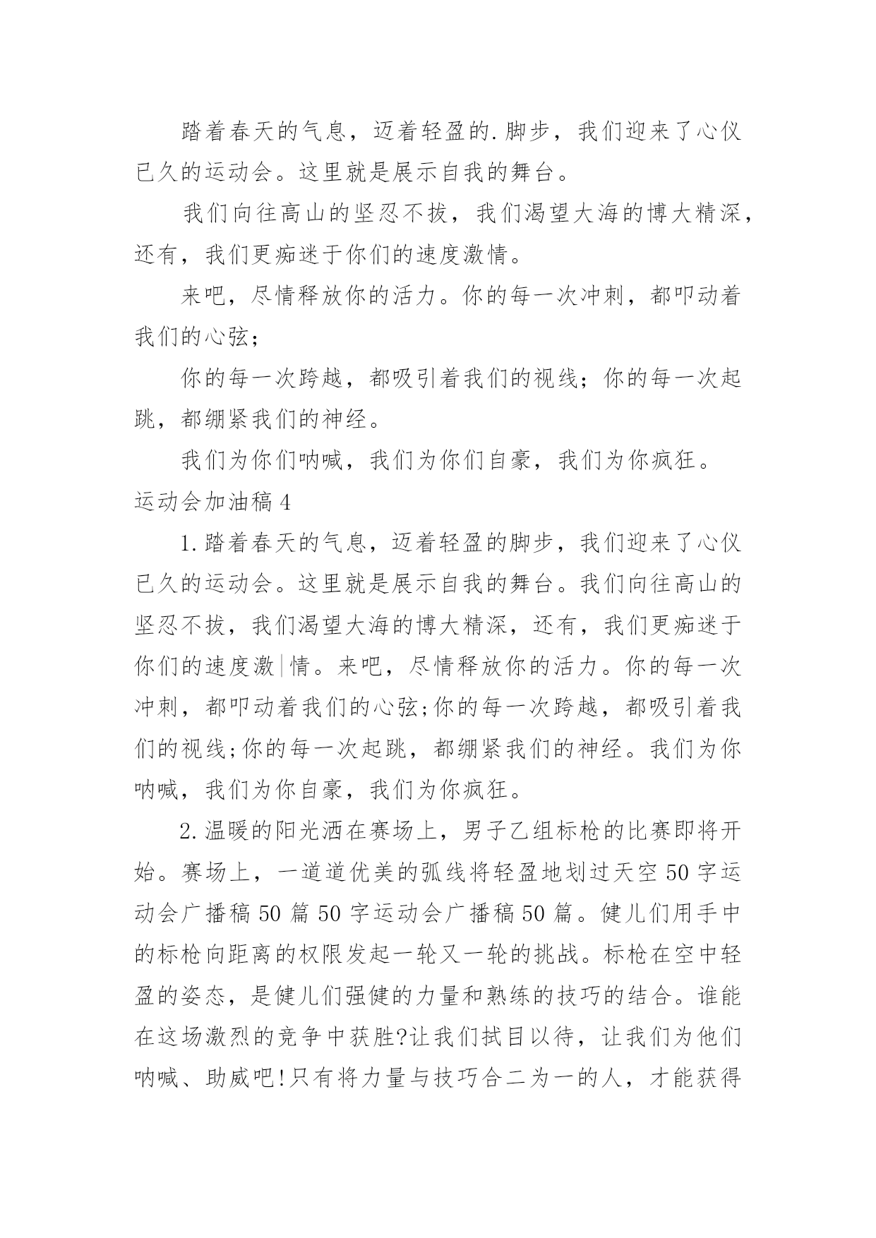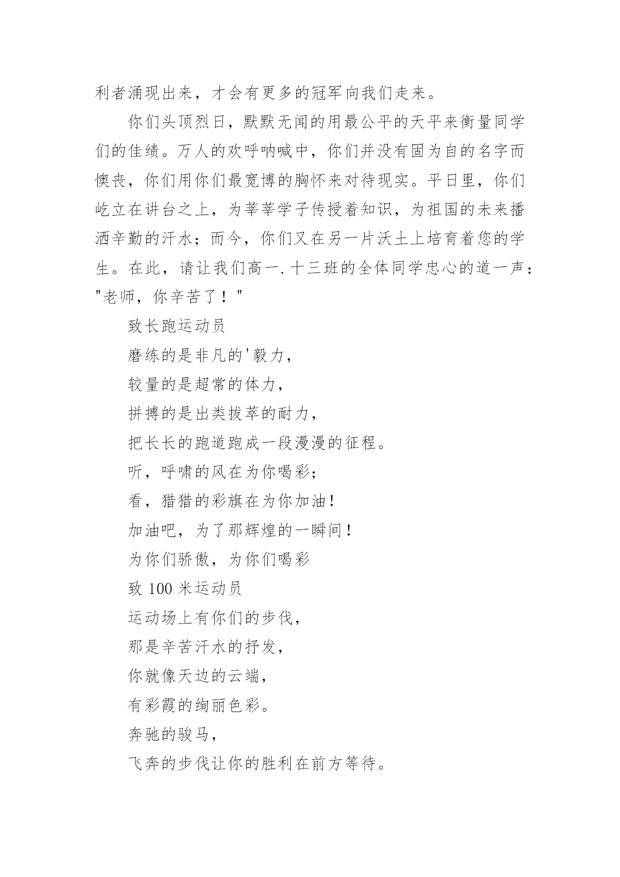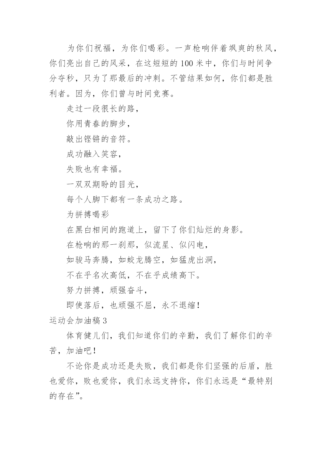 运动会加油稿运动会加油稿在现在社会,接触并使用加油稿的人越来越多,加油稿是鼓励激励对方的文稿。如何写一份恰当的加油稿呢?以下是小编精心整理的运动会加油稿,希望对大家有所帮助。运动会加油稿11、广阔的绿茵场,是为你们搭建的舞台。张扬吧,年轻的心,我们将为你永远喝彩!2、泰戈尔在诗中说,天空没有翅膀的影子,但我已飞过;艾青对朋友说,也许有人到达不了彼岸,但我们共同拥有大海。也许你们没有显赫的成绩,但运动场上留下了你们的足迹。也许你们没有奖品,但我们心中留下了你们拼搏的身影。所有的努力都是为了迎接这一刹那,所有的拼搏都是为了这一声令下。3、就像花儿准备了春、秋、冬,就是为了红透整个盛夏。就像雪花经历了春、夏、秋就是为了洁白整个严冬。蹲下,昂首,出发……轻轻的一抬脚,便牵动了全场的目光潇洒的迫挥挥手,便满足了那一份无言的等待。迎着朝阳,你们踏歌而去,背着希望,我们等待你们的归来。4、也许流星并不少见,但它燃烧的刹那,留给人间最美丽的回忆!也许笑脸并不少见,但胜利的喜悦,总会留给世界精彩的一瞬!是的,那些曾经美妙的东西只有短短的一瞬间,但那却把最辉煌的一刻留给了人间。胜利,是每个人所追求的,胜利的`喜悦,是胜利与重新开始的转折,胜利是新的开始!5、不长不短的距离,需要的是全身心全程投入,自始至终你们都在拼全力此时此刻,你们处在最风光的一刻,无论第几坚持胜利的信心,只要跑下来,你们就是英雄。6、时间在流逝,赛道在延伸,成功在你面前展现心脏的跳动,热血在沸腾,辉煌在你脚下铸就加油吧,健儿们。7、这是意志的拼搏。这是速度的挑战。胜利在向你们招手/胜利在向你们呼唤。8、不为鲜花的围绕,不为刹那的荣耀,只有执着的信念,化作不停的奔跑,心中燃烧着梦想,脚下不停的步伐。9、你用行动述说着过城的重要,没有无尽的终点,没有无法攀登的险峰,希望载着终点在向你微笑,拼搏吧!经历是一种精彩,迸发你全部的能量,成功是你汗水的写照。10、虽然你们在场上的时间很短暂,但你们的身影依然停留在人们的脑海里,因为你们是赛场上最可爱的人。11、不为掌声的注释不为刻意的征服不为失败的痛苦只有辛勤的汗水化作成功的脚步。12、超越对手,更要超越自我,追求卓越是我们的目标,是我们的信念,在清爽的秋季,在喧嚣的赛场,你们点燃了似火的热情,无论成败,你们永远是我们的骄傲,我们都为你们感到自豪!13、不为掌声的注释、不为刻意的征服、不为失败的痛苦,只有辛勤的汗水化作快乐的回忆,只有努力的追求迈向非凡的成功。14、你用行动述说着成功的意义,运动场上有无数成绩的高峰,而我们只是选择向更高处攀登,希望载着过程中的快乐与终点时的微笑,拼搏吧!经历是一种精彩,迸发你全部的能量,向更高发起冲击。15、天空没有翅膀的影子,我已飞过晴空;也许有人到达不了彼岸,但我们共同拥有大海。也许你们没有显赫的成绩,但运动场上留下了你们的汗水;也许你们没有奖品,但你们拼搏的身影应得了我们的喝彩。在这一刹那努力拼搏,我们愿意永远为你们加油。16、你是运动场上的心脏,跳动梦想;你是重点线上的臂膀,激励辉煌;所有人为你加油,为你喝彩。你们是攀登理想的追求人!力量与信念,在起跑线上凝聚!努力与拼搏,在终点线上得到展现!助威的呐喊将在你身边围绕,胜利的声音正在你的脚下踏响。17、广阔的绿茵场,是为你们搭建的舞台。张扬吧,年轻的心,俺们将为你永远喝彩!泰戈尔在诗中说,天空没有翅膀的影子,但俺已飞过;艾青对朋友说,也许有人到达不了彼岸,但俺们共同拥有大海。也许你们没有显赫的成绩,但运动场上留下了你们的足迹。也许你们没有奖品,但俺们心中留下了你们拼搏的身影。所有的努力都是为了迎接这一刹那,所有的拼搏都是为了这一声令下。18、有多少次挥汗如雨,伤痛曾添满记忆,只因为始终相信,去拼搏才能胜利。总在鼓舞自己,要成功就得努力。热血在赛场沸腾,巨人在赛场升起。相信自己,你将赢得胜利,创造奇迹;相信自己,梦想在你手中,这是你的天地。当一切过去,你们将是第一。相信自己,你们将超越极限,超越自己!相信自己,加油吧,健儿们,相信你自己。19、年轻的、我们自信飞扬,青春的气息如同出生的朝阳,蓬勃的力量如同阳光的挥洒。此时此刻,跑道便是我们精彩的舞台,声声加油便是我们最高的奖项!论何成功,谈何荣辱,心中的信念只有一个:拼搏!运动会加油稿2你的汗水一滴滴的滴落在红色的跑道上,你的步伐渐渐沉重、缓慢。想起我曾经对你鼓励的话语,此刻都脆弱的不堪一击。努力、坚持。这些话语此时都没有了意义。我只在心底里为你祝福,为你鼓劲。企盼你能微笑着冲过终点,就在眼前的终点!校运会的召开,牵动着全体师生的心。看那平时伏案备课的老师,此刻也在跑道上跃跃欲试。为学习头疼的同学们,也为夺到第一而雀跃欢呼。严格的体育老师们,现在也细致亲切地为运动员们记录成绩。我不能在运动场上显身手