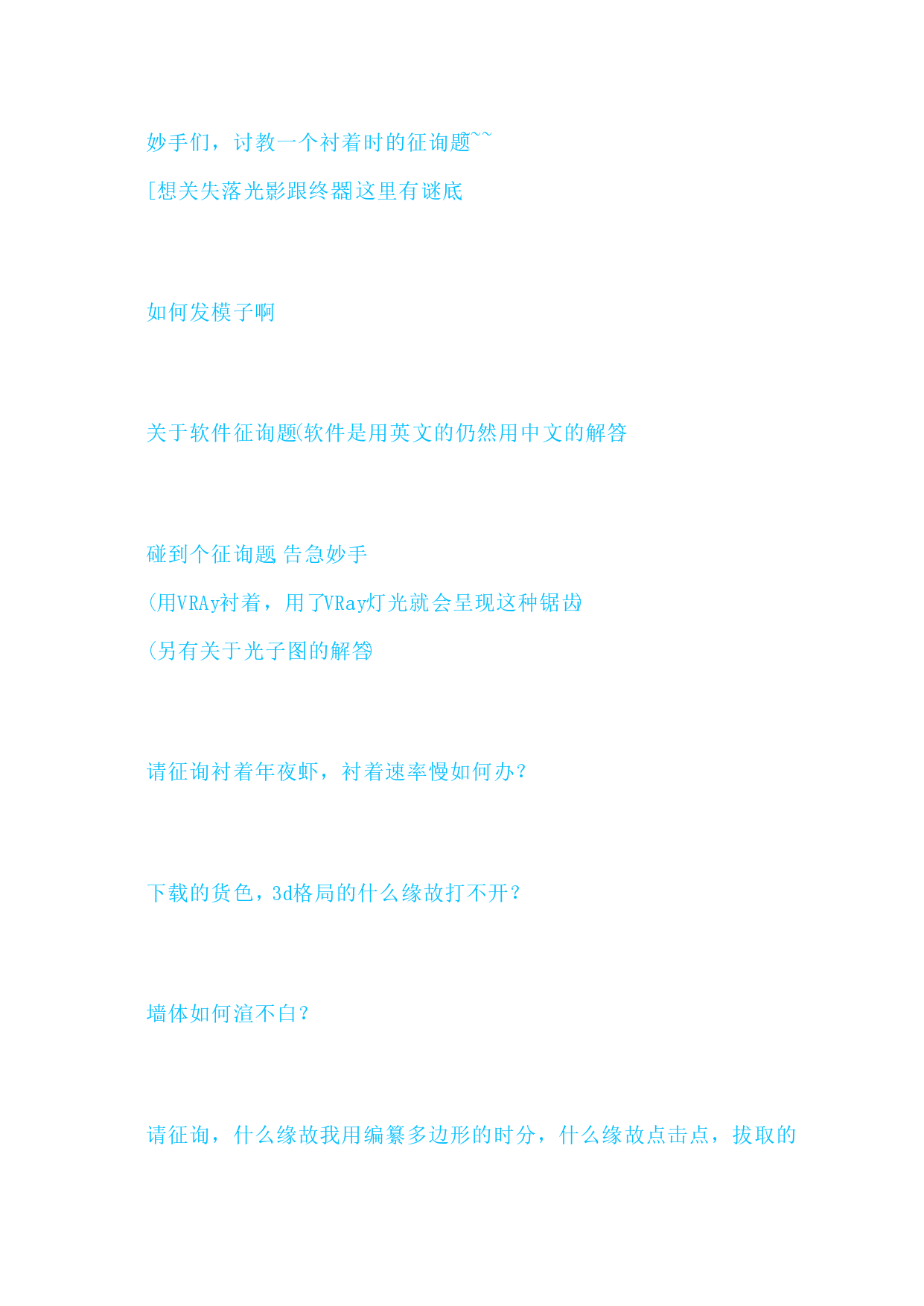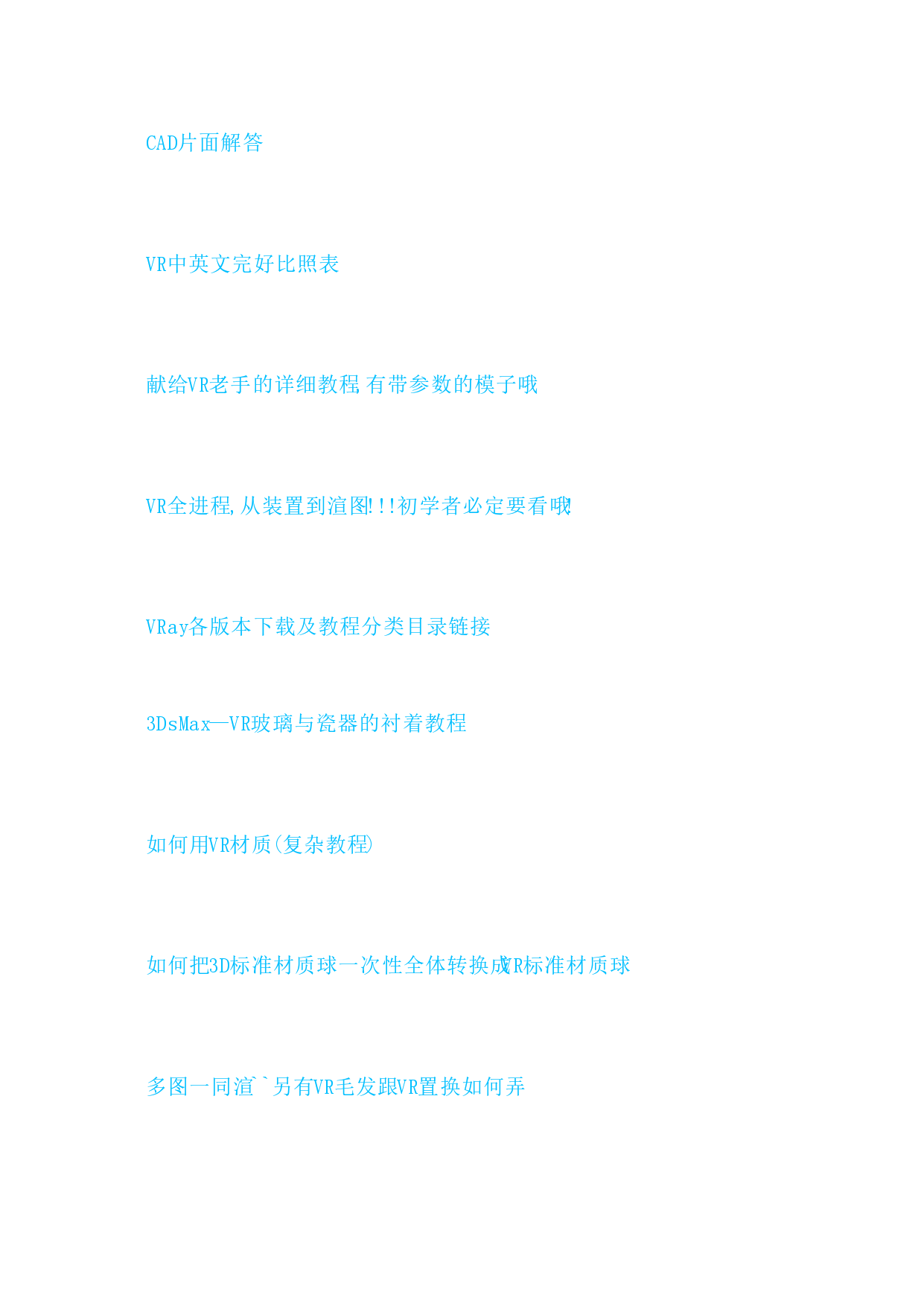 计划吧廊HYPERLINK室内计划教程资本论坛,为中国计划师效劳,供应少量的3dmax教程,Vray教程,cad教程,ps教程,sketchup教程,室内后果图计划,衬着,欣赏,打造最具气氛的计划师交换论坛3DMAX老手进修中罕见征询题及征询答HYPERLINKvray初学者最罕见的征询题的处理方法HYPERLINK材质球用完了,还想接着做新的材质的方法HYPERLINK从3dmax建模到VR衬着出图的全进程(173张图片精华教程)HYPERLINK多边形室内3DMAX建模老手教程〔妙手免进〕HYPERLINK美丽材质是如此制造的〔中文版教程转贴〕HYPERLINKvrayAo跟通道制造足本的小实验,并献上足本!HYPERLINKCAD片面解答HYPERLINKVR中英文完好比照表HYPERLINK献给VR老手的详细教程,有带参数的模子哦HYPERLINKVR全进程,从装置到渲图!!!初学者必定要看哦!HYPERLINKVRay各版本下载及教程分类目录链接HYPERLINK3DsMax—VR玻璃与瓷器的衬着教程HYPERLINK如何用VR材质(复杂教程)HYPERLINK如何把3D标准材质球一次性全体转换成VR标准材质球HYPERLINK多图一同渲``另有VR毛发跟VR置换如何弄HYPERLINK妙手们,讨教一个衬着时的征询题~~~[想关失落光影跟终器]这里有谜底HYPERLINK如何发模子啊HYPERLINK关于软件征询题(软件是用英文的仍然用中文的解答)HYPERLINK碰到个征询题,告急妙手(用VRAy衬着,用了VRay灯光就会呈现这种锯齿)(另有关于光子图的解答)HYPERLINK请征询衬着年夜虾,衬着速率慢如何办?HYPERLINK下载的货色,3d格局的什么缘故打不开?HYPERLINK墙体如何渲不白?HYPERLINK请征询,什么缘故我用编纂多边形的时分,什么缘故点击点,拔取的点挪动不了~??HYPERLINK3D建模都衬着了,突然3D的那个建模文件打不开了!协助!HYPERLINK运用光度学灯光逝世机的缘故HYPERLINK【佳构典藏】罕见LS的征询题的处理HYPERLINK老手VR教程链接Vray进修教程第一课(原创教程)HYPERLINKVR教程第二讲〔材质一)HYPERLINK〔原创]〕VR疾速测试参数设置HYPERLINK原创《疾速出图的设置》HYPERLINK3D中新兵需知的要点(原创教程)HYPERLINK让后果图不含混不灰的方法(PS前期教程)HYPERLINK室内后果图的校色方法〔转载〕经典啊!HYPERLINKPS初学教程十课,不看你会后悔的HYPERLINK衬着器曾经选成vr了,然而材质球倒是黑的HYPERLINK一些复杂有用的3DMAX贴图教程〔20种贴图方法〕HYPERLINK做毛发地毯的步调.HYPERLINK镂空贴图的做法.HYPERLINKVR线框衬着小教程HYPERLINK用完了材质球另有模子没贴材质如何办HYPERLINK低版本翻开高版本MAX插件HYPERLINKVRAY全局细分足本(材质,灯光)HYPERLINK3dsmax模子呈现表现三角面的处理方法!HYPERLINK