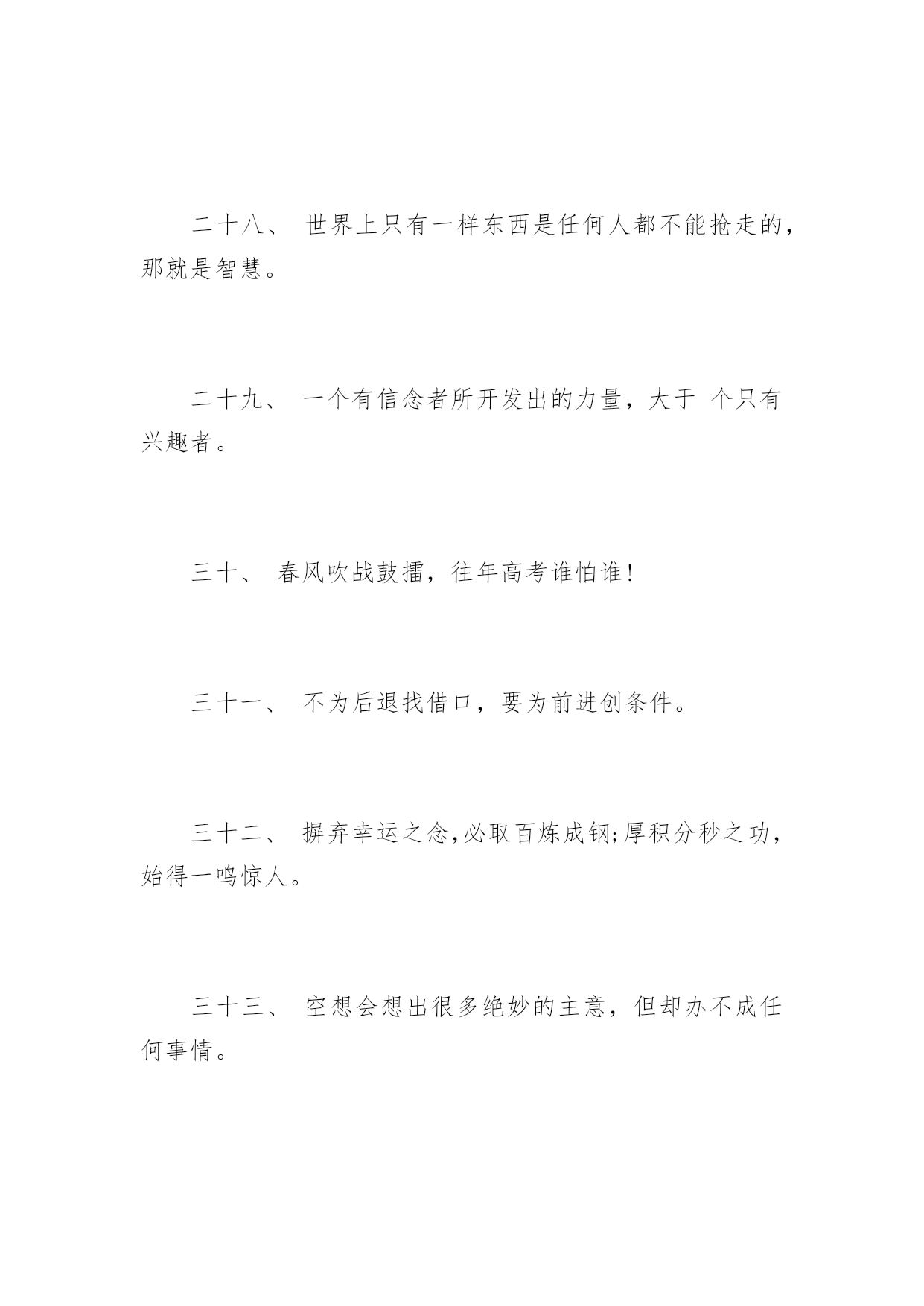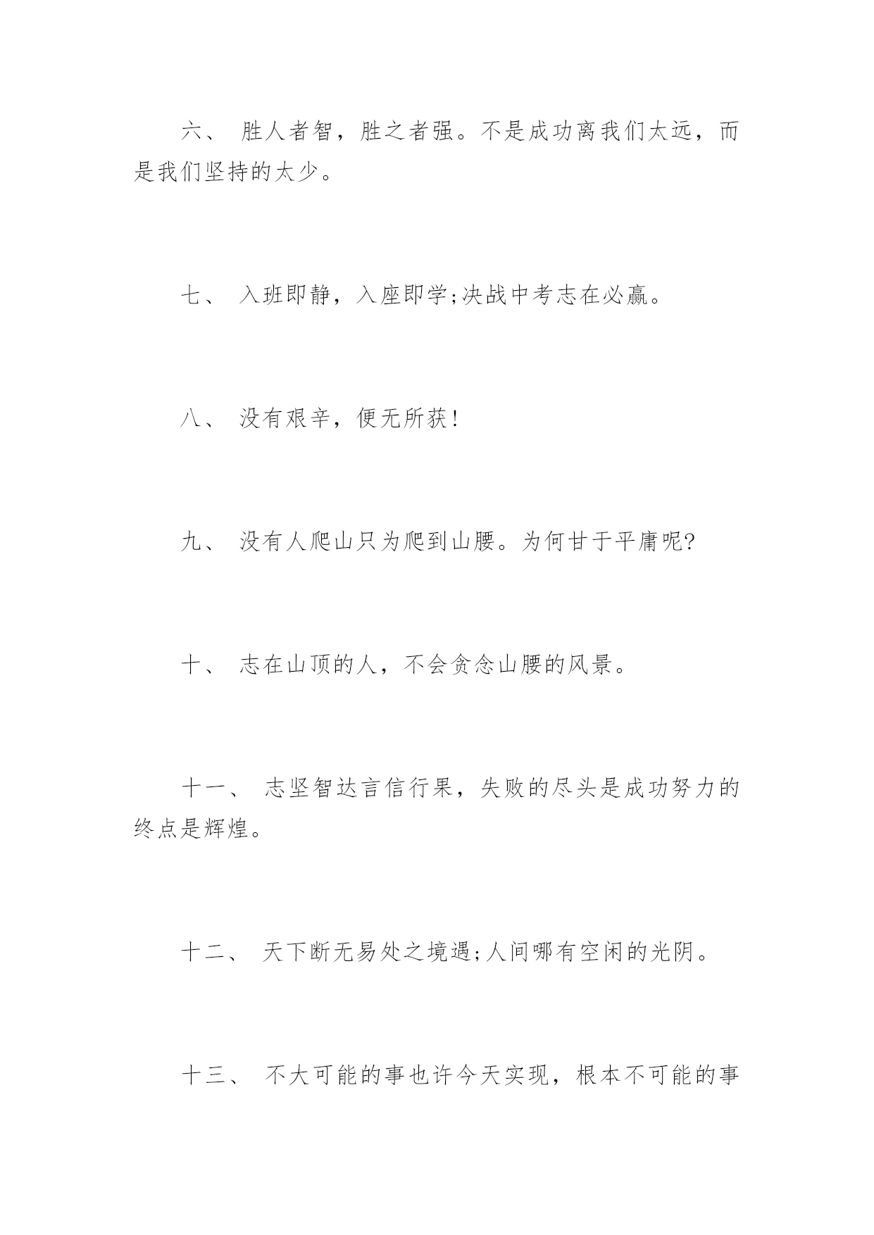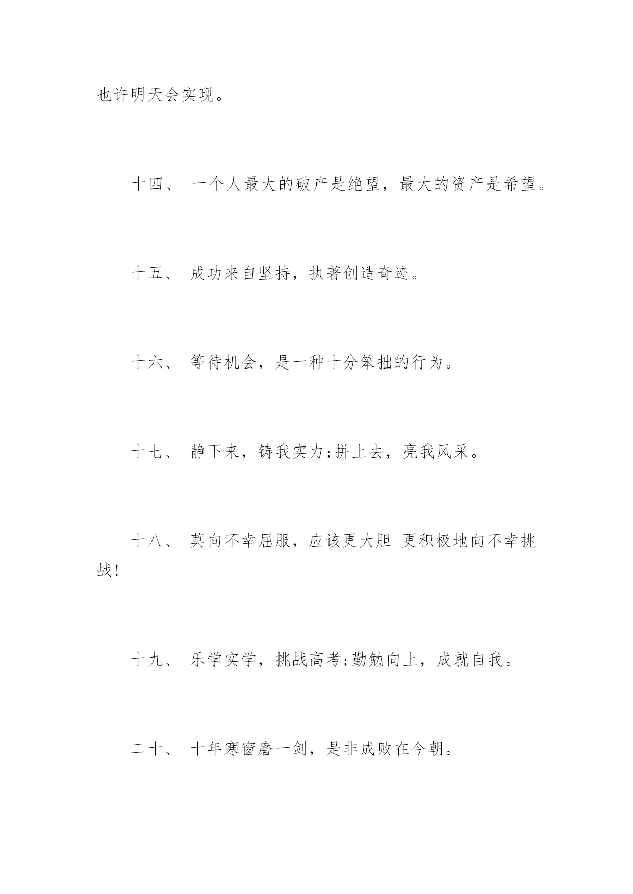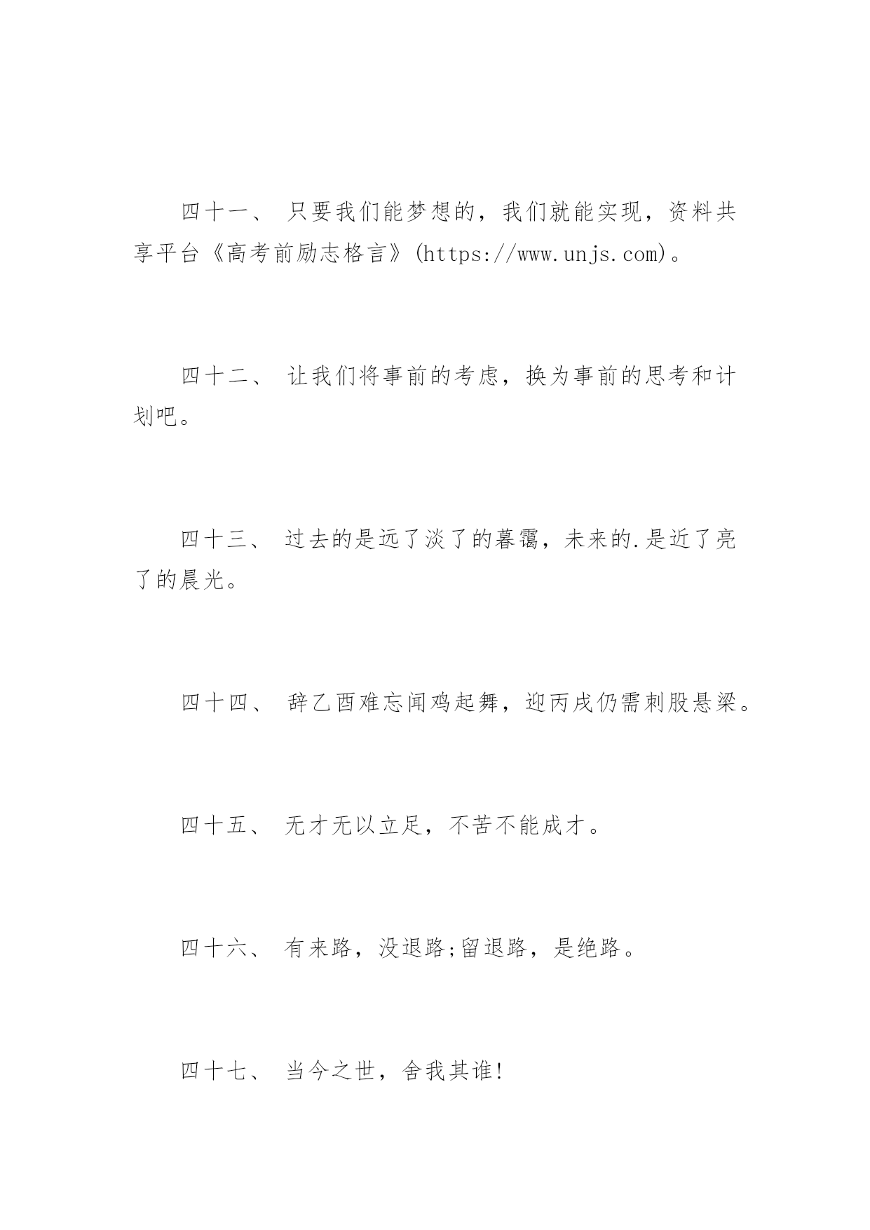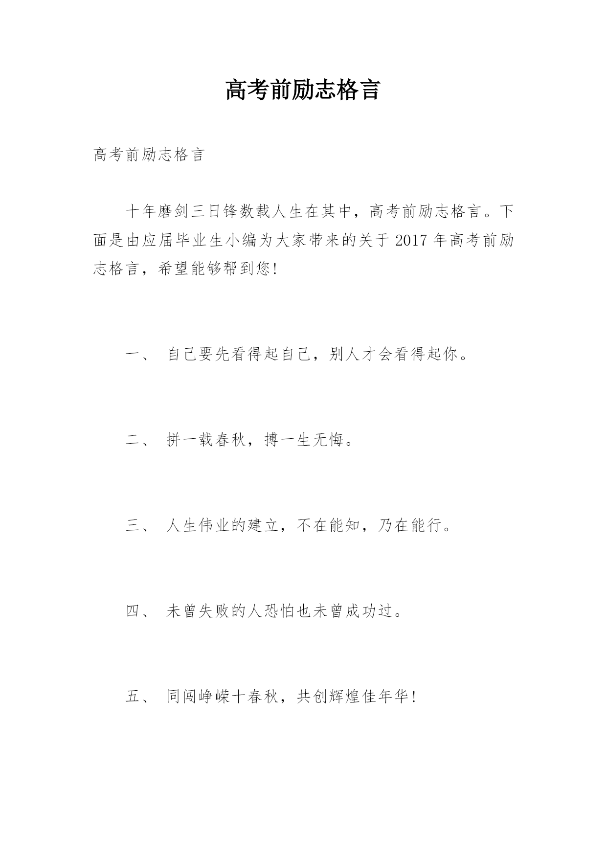 高考前励志格言高考前励志格言十年磨剑三日锋数载人生在其中,高考前励志格言。下面是由应届毕业生小编为大家带来的关于2017年高考前励志格言,希望能够帮到您!一、自己要先看得起自己,别人才会看得起你。二、拼一载春秋,搏一生无悔。三、人生伟业的建立,不在能知,乃在能行。四、未曾失败的人恐怕也未曾成功过。五、同闯峥嵘十春秋,共创辉煌佳年华!六、胜人者智,胜之者强。不是成功离我们太远,而是我们坚持的太少。七、入班即静,入座即学;决战中考志在必赢。八、没有艰辛,便无所获!九、没有人爬山只为爬到山腰。为何甘于平庸呢?十、志在山顶的人,不会贪念山腰的风景。十一、志坚智达言信行果,失败的尽头是成功努力的终点是辉煌。十二、天下断无易处之境遇;人间哪有空闲的光阴。十三、不大可能的事也许今天实现,根本不可能的事也许明天会实现。十四、一个人最大的破产是绝望,最大的资产是希望。十五、成功来自坚持,执著创造奇迹。十六、等待机会,是一种十分笨拙的行为。十七、静下来,铸我实力;拼上去,亮我风采。十八、莫向不幸屈服,应该更大胆更积极地向不幸挑战!十九、乐学实学,挑战高考;勤勉向上,成就自我。二十、十年寒窗磨一剑,是非成败在今朝。二十一、效苏秦之刺股折桂还需苦战,学陶侃之惜时付出必有回报。二十二、对于世界,我微不足道,但对于我自己,我就是全部。二十三、今朝勤学苦,明朝跃龙门。二十四、闻鸡起舞成就拼搏劲旅师,天道酬勤再现辉煌王者风。二十五、莫找借口失败,只找理由成功。二十六、成功是别人失败时还在坚持。二十七、自强不息怀壮志以长行,厚德载物携梦想而抚凌。二十八、世界上只有一样东西是任何人都不能抢走的,那就是智慧。二十九、一个有信念者所开发出的力量,大于个只有兴趣者。三十、春风吹战鼓擂,往年高考谁怕谁!三十一、不为后退找借口,要为前进创条件。三十二、摒弃幸运之念,必取百炼成钢;厚积分秒之功,始得一鸣惊人。三十三、空想会想出很多绝妙的主意,但却办不成任何事情。三十四、辛苦三年,幸福一生。三十五、遇难心不慌,遇易心更细。三十六、大多数人想要改造这个世界,但却罕有人想改造自己。三十七、只有强者才懂得斗争;弱者甚至失败都不够资格,而是生来就是被征服的。三十八、很多事先天注定,那是“命”;但你可以决定怎么面对,那是“运”!三十九、过去的事已经一去不复返。聪明的人是考虑现在和未来,根本无暇去想过去的事。四十、因为有悔,所以披星戴月;因为有梦,所以奋不顾身。四十一、只要我们能梦想的,我们就能实现,资料共享平台《高考前励志格言》(https://www.unjs.com)。四十二、让我们将事前的考虑,换为事前的思考和计划吧。四十三、过去的是远了淡了的暮霭,未来的.是近了亮了的晨光。四十四、辞乙酉难忘闻鸡起舞,迎丙戌仍需刺股悬梁。四十五、无才无以立足,不苦不能成才。四十六、有来路,没退路;留退路,是绝路。四十七、当今之世,舍我其谁!四十八、当你感到悲哀痛苦时,最好是去学些什么东西。学习会使你永远立于不败之地。四十九、不要等待机会,而要创造机会。五十、别想一下造出大海,必须先由小河川开始。五十一、欲望以提升热忱,毅力以磨平高山。五十二、让刻苦成为习惯,用汗水浇灌未来。五十三、立志高远,脚踏实地;刻苦钻研,勤学苦思;稳定心态,不馁不弃。五十四、眼泪不是我们的答案,拼搏才是我们的选择。五十五、再长的路,一步步也能走完,再短的路,不迈开双脚也无法到达。五十六、月考分数上下何足挂齿,平常名次浮动纯属正常。五十七、拼一个秋冬春夏!赢一生无怨无悔!五十八、世上没有绝望的处境,只有对处境绝望的人。五十九、人生难得几回搏,此时不搏,何时搏。六十、每一发奋努力的背后,必有加倍的赏赐。六十一、不要问别人为你做了什么,而要问你为别人做了什么。六十二、人生之路多坎坷,摔个跟头别难过,爬起来,掸掸土,前方就是一片乐土。六十三、再冷的石头,坐上三年也会暖。六十四、自己选择的路跪着也要把它走完。六十五、人活着要呼吸。呼者,出一口气;吸者,争一口气。六十六、一路风雨前程磨砺意志,半载苦乐同享铸就辉煌。六十七、把握现在就是创造未来。六十八、谁也不能随随便便地成功,它来自彻底的自我管理和毅力。六十九、拼一分高一分,一分成就终生。七十、忘时,忘物,忘我。诚实,朴实,踏实。七十一、不为失败找理由,要为成功找方法。七十二、积极的人在每一次忧患中都看到一个机会,而消极的人则在每个机会都看到忧患。七十三、成功的人是跟别人学习经验,失败的人只跟自己学习经验。七十四、赞美是一种激励,给别人赞美的同时,不要忘了也给自己一点赞美。七十五、旁观者的姓名永远爬不到比赛的记分板上。七十六、只有经历地狱般的磨练,才能炼出创造天堂的力量。七十七、今天多一份拼搏明天多几份欢笑。七十八、容易走的路都是下坡