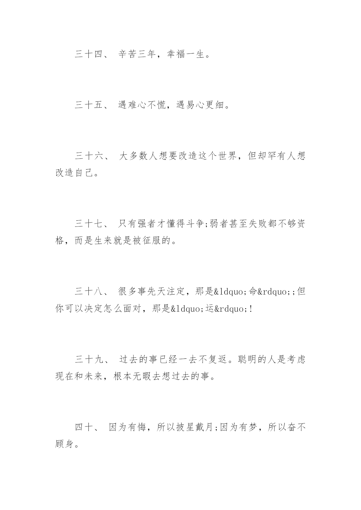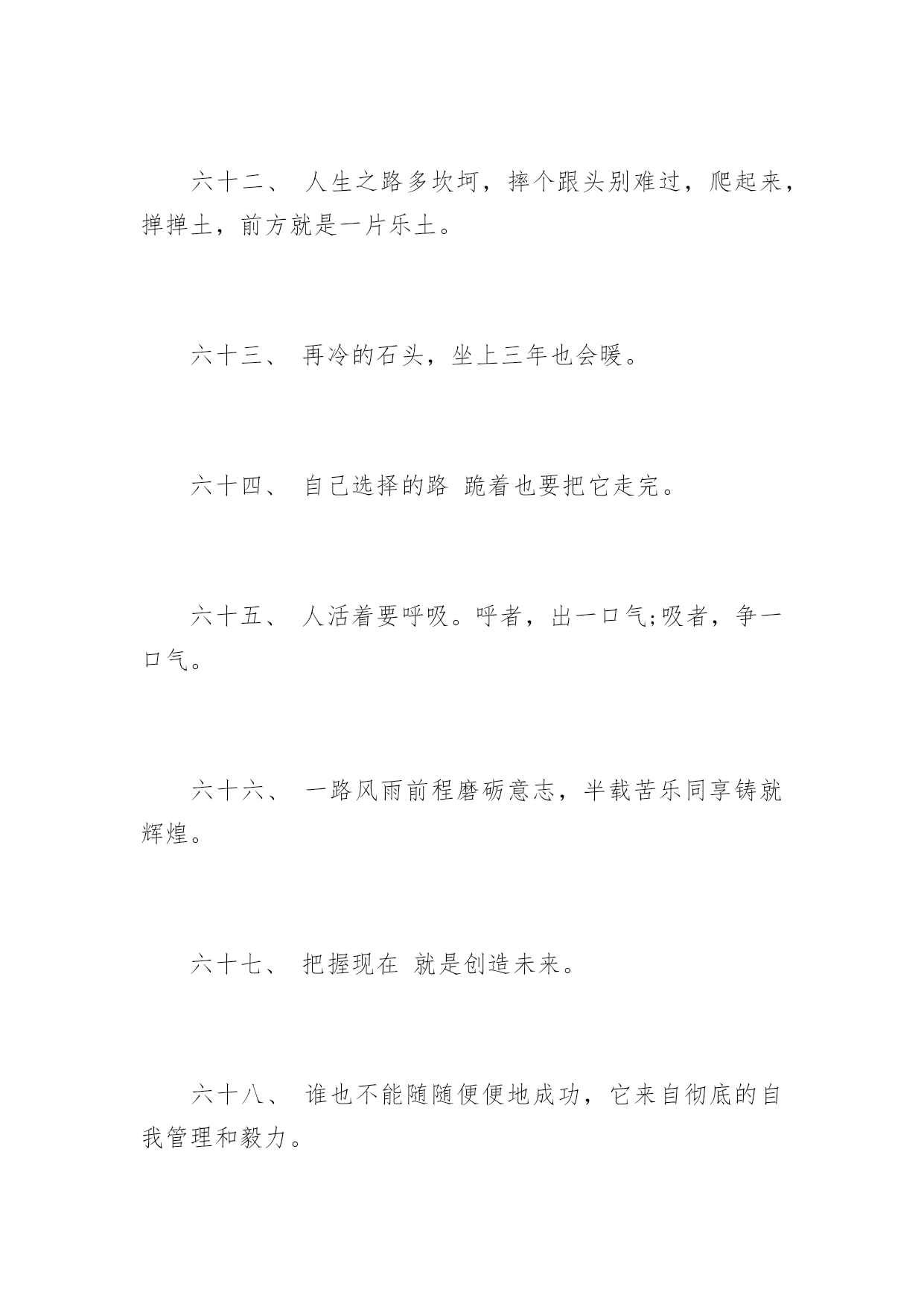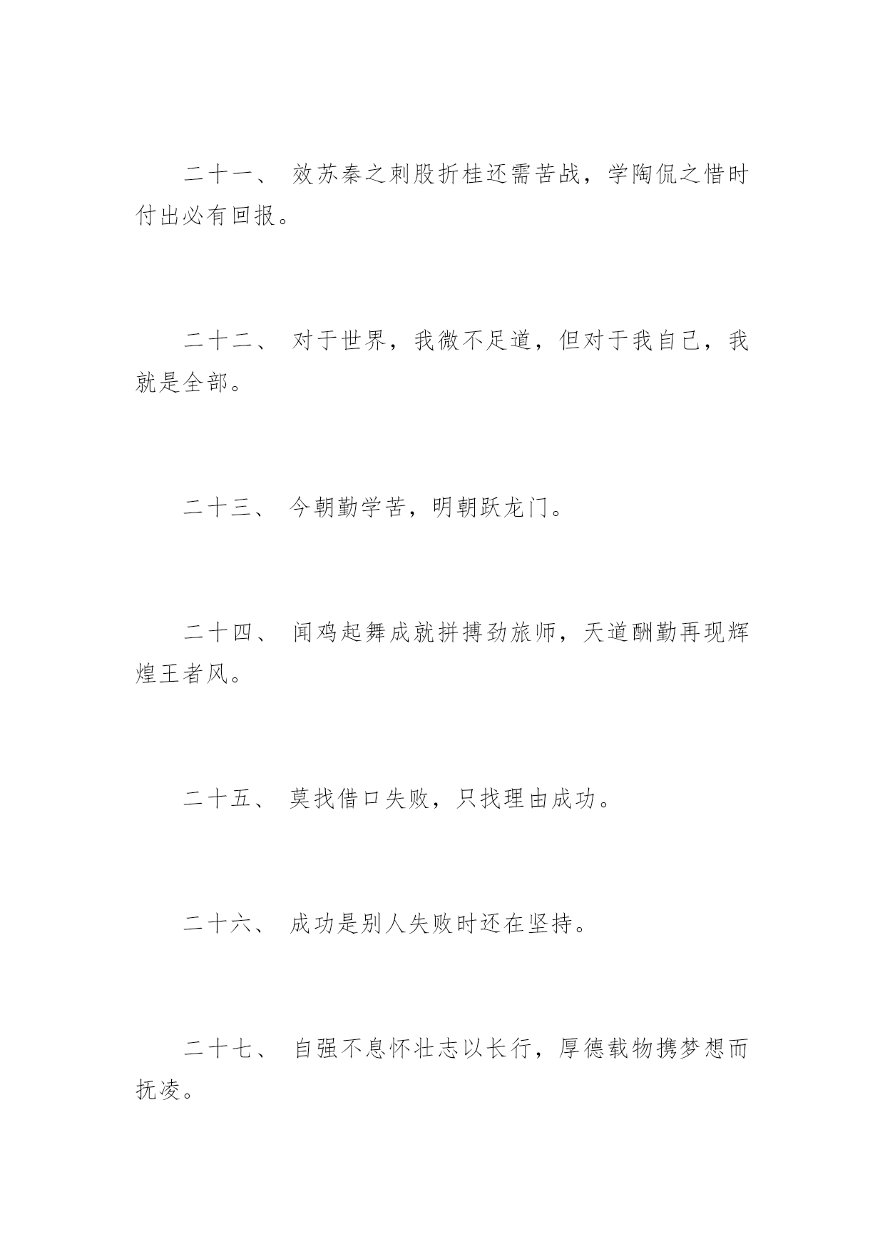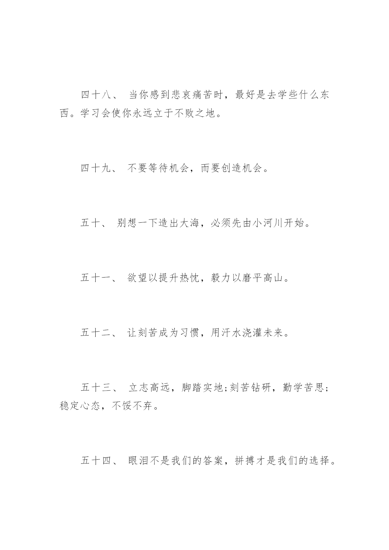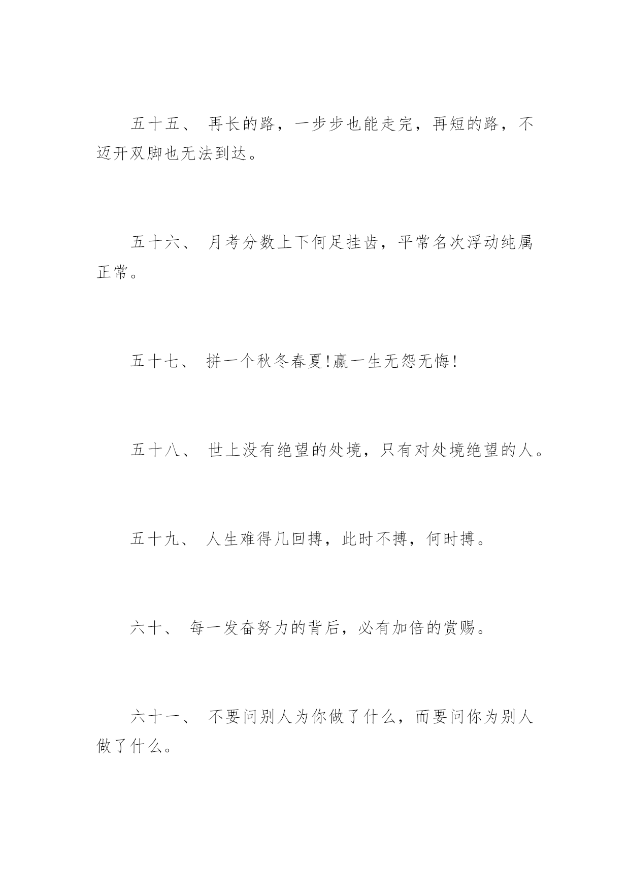 高考前励志格言高考前励志格言十年磨剑三日锋数载人生在其中,高考前励志格言。下面是由应届毕业生小编为大家带来的关于2017年高考前励志格言,希望能够帮到您!一、自己要先看得起自己,别人才会看得起你。二、拼一载春秋,搏一生无悔。三、人生伟业的建立,不在能知,乃在能行。四、未曾失败的人恐怕也未曾成功过。五、同闯峥嵘十春秋,共创辉煌佳年华!六、胜人者智,胜之者强。不是成功离我们太远,而是我们坚持的太少。七、入班即静,入座即学;决战中考志在必赢。八、没有艰辛,便无所获!九、没有人爬山只为爬到山腰。为何甘于平庸呢?十、志在山顶的人,不会贪念山腰的风景。十一、志坚智达言信行果,失败的尽头是成功努力的终点是辉煌。十二、天下断无易处之境遇;人间哪有空闲的光阴。十三、不大可能的事也许今天实现,根本不可能的事也许明天会实现。十四、一个人最大的破产是绝望,最大的资产是希望。十五、成功来自坚持,执著创造奇迹。十六、等待机会,是一种十分笨拙的行为。十七、静下来,铸我实力;拼上去,亮我风采。十八、莫向不幸屈服,应该更大胆更积极地向不幸挑战!十九、乐学实学,挑战高考;勤勉向上,成就自我。二十、十年寒窗磨一剑,是非成败在今朝。二十一、效苏秦之刺股折桂还需苦战,学陶侃之惜时付出必有回报。二十二、对于世界,我微不足道,但对于我自己,我就是全部。二十三、今朝勤学苦,明朝跃龙门。二十四、闻鸡起舞成就拼搏劲旅师,天道酬勤再现辉煌王者风。二十五、莫找借口失败,只找理由成功。二十六、成功是别人失败时还在坚持。二十七、自强不息怀壮志以长行,厚德载物携梦想而抚凌。二十八、世界上只有一样东西是任何人都不能抢走的,那就是智慧。二十九、一个有信念者所开发出的力量,大于个只有兴趣者。三十、春风吹战鼓擂,往年高考谁怕谁!三十一、不为后退找借口,要为前进创条件。三十二、摒弃幸运之念,必取百炼成钢;厚积分秒之功,始得一鸣惊人。三十三、空想会想出很多绝妙的主意,但却办不成任何事情。三十四、辛苦三年,幸福一生。三十五、遇难心不慌,遇易心更细。三十六、大多数人想要改造这个世界,但却罕有人想改造自己。三十七、只有强者才懂得斗争;弱者甚至失败都不够资格,而是生来就是被征服的。三十八、很多事先天注定,那是“命”;但你可以决定怎么面对,那是“运”!三十九、过去的事已经一去不复返。聪明的人是考虑现在和未来,根本无暇去想过去的事。四十、因为有悔,所以披星戴月;因为有梦,所以奋不顾身。四十一、只要我们能梦想的,我们就能实现,资料共享平台《高考前励志格言》(https://www.unjs.com)。四十二、让我们将事前的考虑,换为事前的思考和计划吧。四十三、过去的是远了淡了的暮霭,未来的.是近了亮了的晨光。四十四、辞乙酉难忘闻鸡起舞,迎丙戌仍需刺股悬梁。四十五、无才无以立足,不苦不能成才。四十六、有来路,没退路;留退路,是绝路。四十七、当今之世,舍我其谁!四十八、当你感到悲哀痛苦时,最好是去学些什么东西。学习会使你永远立于不败之地。四十九、不要等待机会,而要创造机会。五十、别想一下造出大海,必须先由小河川开始。五十一、欲望以提升热忱,毅力以磨平高山。五十二、让刻苦成为习惯,用汗水浇灌未来。五十三、立志高远,脚踏实地;刻苦钻研,勤学苦思;稳定心态,不馁不弃。五十四、眼泪不是我们的答案,拼搏才是我们的选择。五十五、再长的路,一步步也能走完,再短的路,不迈开双脚也无法到达。五十六、月考分数上下何足挂齿,平常名次浮动纯属正常。五十七、拼一个秋冬春夏!赢一生无怨无悔!五十八、世上没有绝望的处境,只有对处境绝望的人。五十九、人生难得几回搏,此时不搏,何时搏。六十、每一发奋努力的背后,必有加倍的赏赐。六十一、不要问别人为你做了什么,而要问你为别人做了什么。六十二、人生之路多坎坷,摔个跟头别难过,爬起来,掸掸土,前方就是一片乐土。六十三、再冷的石头,坐上三年也会暖。六十四、自己选择的路跪着也要把它走完。六十五、人活着要呼吸。呼者,出一口气;吸者,争一口气。六十六、一路风雨前程磨砺意志,半载苦乐同享铸就辉煌。六十七、把握现在就是创造未来。六十八、谁也不能随随便便地成功,它来自彻底的自我管理和毅力。六十九、拼一分高一分,一分成就终生。七十、忘时,忘物,忘我。诚实,朴实,踏实。七十一、不为失败找理由,要为成功找方法。七十二、积极的人在每一次忧患中都看到一个机会,而消极的人则在每个机会都看到忧患。七十三、成功的人是跟别人学习经验,失败的人只跟自己学习经验。七十四、赞美是一种激励,给别人赞美的同时,不要忘了也给自己一点赞美。七十五、旁观者的姓名永远爬不到比赛的记分板上。七十六、只有经历地狱般的磨练,才能炼出创造天堂的力量。七十七、今天多一份拼搏明天多几份欢笑。七十八、容易走的路都是下坡