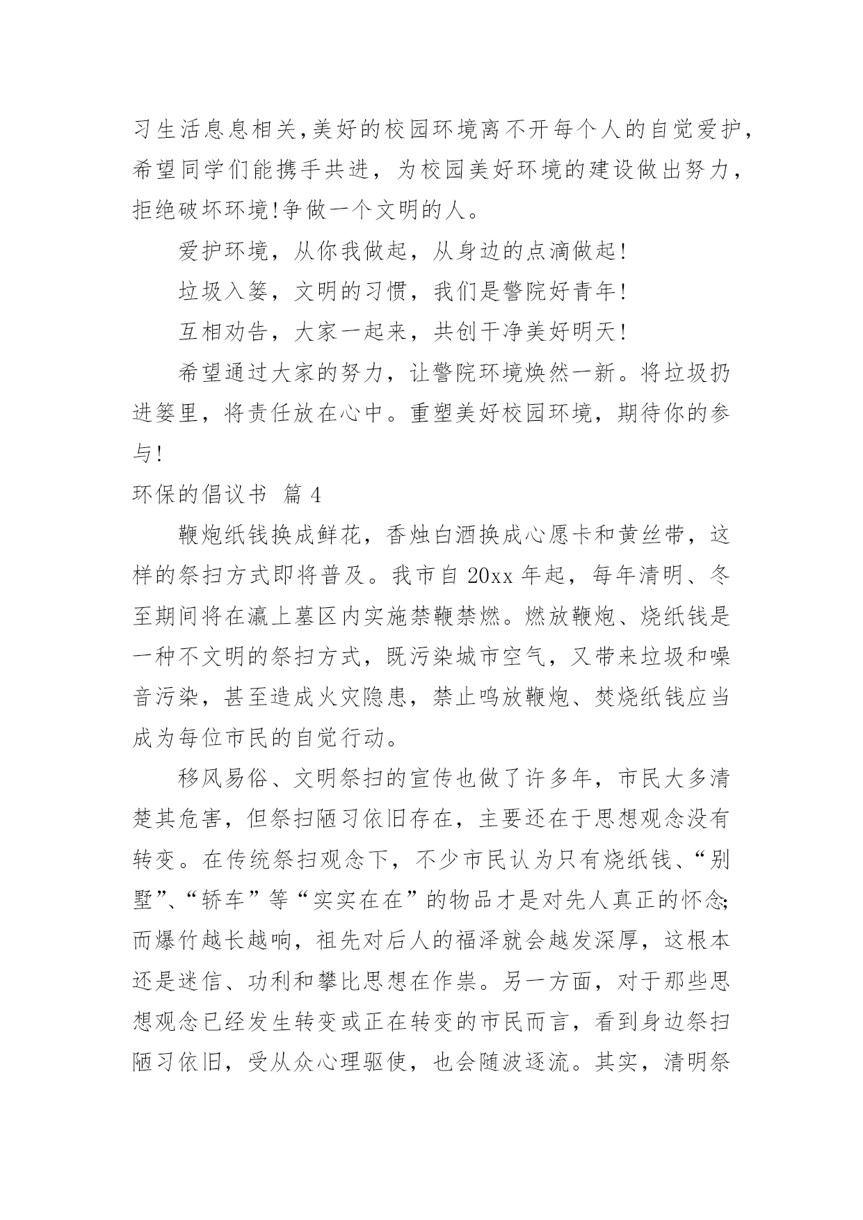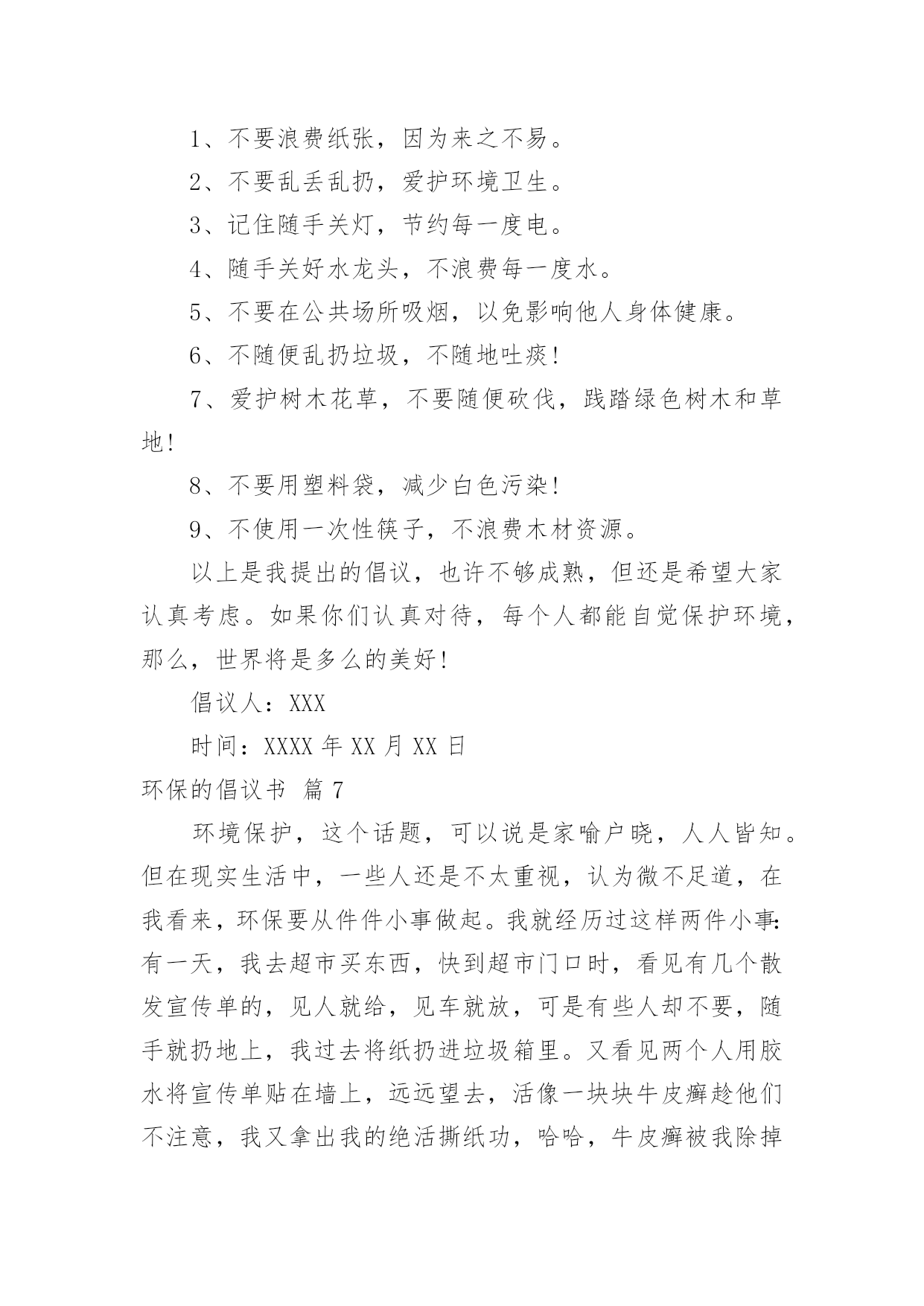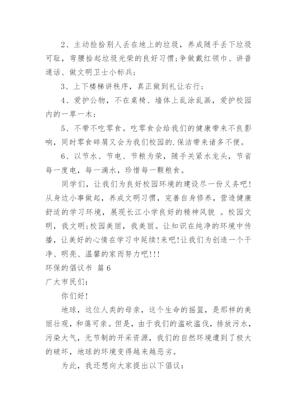 环保的倡议书精选环保的倡议书汇编7篇环保的倡议书篇1中学全体同学:为了增强同学们的环保意识,使校园、班级环境更加整洁,为了培养我们青少年勤俭节约的好习惯,历城中学大队部提出倡议,倡议从10月开始在全校各中队开展“饮料瓶与废纸回收”活动。通过活动让队员在实际的学习生活中体验节约习惯,能给班集体带来收益和给班级、学校带来环境整洁美丽的好处。倡议少先队员们做到以下几点:1、平时用完的废纸及饮料瓶不要胡乱丢弃在学校园里,自觉培养良好的环保意识。2、饮料瓶回收活动以班级为单位进行,每个班准备两个回收箱或袋,一个装废纸,一个装饮料瓶。由劳动委员和生活委员作为活动的班级负责员。3、班级里推荐两名环保卫士。负责监督队员的文明环保行为,维护班级环境整洁。4、学校每双周周五下午组织一次回收,回收时,各班安排好专人按时到团队室送交。学校大队部将联系社区内的废品收购人员到学校收购,少先大队按班级做好记录,回收的钱归各中队所有,作为各中队的活动经费。5、各中队要安排1名责任心较强的队员,管理好本中队的回收资金,并做好资金的收支记录。6、本学期末少先大队评出“环保先进中队”、“环保先进队员”,给予表彰奖励。最后,我们大队部再次发出倡议,希望每个少先队员从我做起,保护我们的美丽校园!环保的倡议书篇2节能环保事关全人类的福祉,联合国环境规划署将每年的6月5日设定为世界环境日,每年践行一个主题,20xx年世界环境日主题是“践行绿色生活”,中国主题是“向污染宣战”。全国节能宣传周由国家发改委等十四个部门联合发起,每年6月份举办,20xx年主题是“节能有道,节俭有德”。两个活动集中宣传,呼吁人们行动起来,勤俭节约,文明健康,低碳生活。特倡议如下:一、树立节能环保的理念。“垃圾是放错位置的资源”,“小节能创大效益”,“金山银山不如绿水青山”。二、了解节能环保的范畴。节能环保与我们每个人日常生活息息相关,节水、节电、节煤、节油等就是节能;保护动植物、植树种草、不乱排废水废气、不在公共场所排放噪声、不乱抛生活垃圾等就是环保;多步少车、充分利用废弃物品等既是节能又是环保。三、参与节能环保的行为。如果您节约了一张纸、一度电、一滴油、一滴水、拒绝使用一次性制品,您就是节能践行者;如果您购物自备布袋和菜篮、出门自带整理袋收集垃圾、家中分类处置垃圾、少开车多步行、保护动植物、自觉维护公共环境和参与环保公益活动等,您就是环保志愿者;如果您主动参与环境监督,对身边制造环境污染的人和事拨打了12369环保举报热线电话,使环境污染和生态破坏事项得到及时制止,您就是环保维权,人士。地球只有一个,她的生命是脆弱的,节能环保,人人有责,真正检验我们对环境的贡献不是言辞,而是行动。只要我们从自己做起,从小事做起,共同携手保护我们的家园,我们工作生活的这片土地就一定会天蓝、水碧、山青。环保的倡议书篇3亲爱的同学们:当你在这美丽的校园中学习,为我们美好的未来而努力时,相信我们每一个同学都渴望有一个干净的校园,渴望健康的生命,渴望绿色,渴望我们有一个良好的生活环境。学校是育人的场所,环境教育是提高我们思想道德素质和科学文化素质的基本手段之一,建立节约型和环境友好型校园,这不仅是学校自身发展的需要,更是我们学生应有的社会责任。为了增强大家的环境保护意识,让校园、班级环境更加整洁靓丽,有利于创建绿色和谐的校园环境,陇东学院美术学院团委恳切地向师生们提出如下倡议:1:树立绿色文明观念,自觉关心环境状况,把个人环保行为视为个人文明修养的组成部分。2:不乱扔垃圾,果皮纸屑,不随地吐痰,不随意采摘校园的一草一木,爱护公共绿地。3:爱护仪器、设备和公物,使设备始终保持完好状态,尽力减少损坏维修。4:节约用水,珍惜水资源,减少水污染;节约用电,做到人走灯灭,光线充足时不要开灯,避免“白昼灯”、“长明灯的情况发生,微机室电脑用后及时关机。5:节约用纸,尽量少用餐巾纸,草稿纸等尽量两面用。6:生活节俭,不随意浪费粮食,不剩饭,培养良好的生活习惯。7:尽量少用塑料袋,尽量少用一次性的纸杯、塑料杯。8:从我做起,号召全校同学树立环境意识,为创建绿色和谐校园出自己的一份力。“历览前贤国与家,成由勤俭败由奢”,中华民族历来倡导节约,父母老师也再三强调环境的保护,让我们义不容辞地承担各自的使命,树立环境意识,养成节约资源的习惯,从我做起,从点滴小事做起,为共建环境友好型的和谐校园而努力!每位同学都希望能在干净舒适的校园度过美好的大学时光,可如今的警校校园环境正受到严重的威胁!无论在教室(特别是大教室)、山顶球场,或是其他的公共场所,时常可见垃圾。校内光洁物业的工作人员打扫非常辛苦,常常佝偻着腰重复着拾捡的动作,在寒风中踽踽独行,只为给学子们创造一个干净的环境。然而,校园环境的清洁,只有保洁人员的清扫是远远不够的,还需要大家共同
