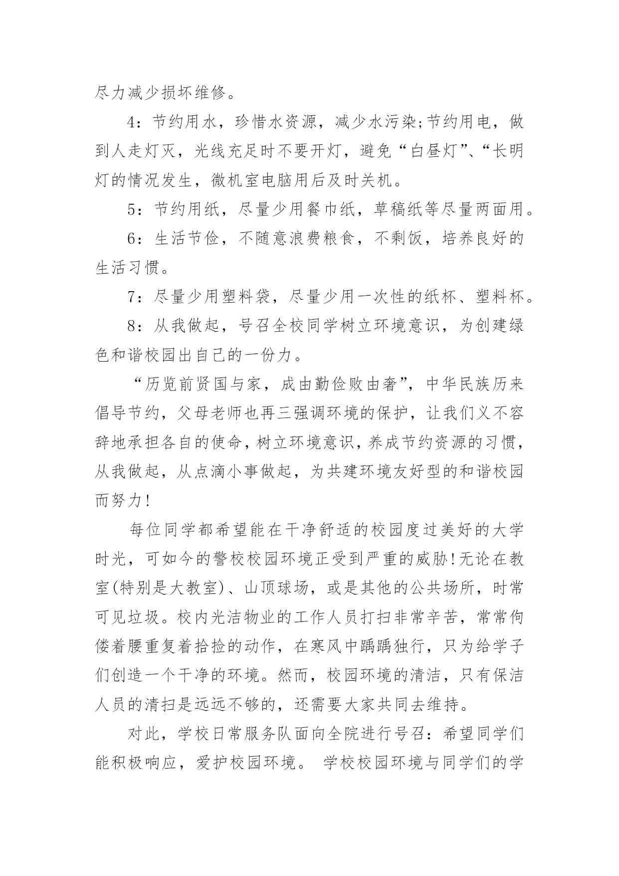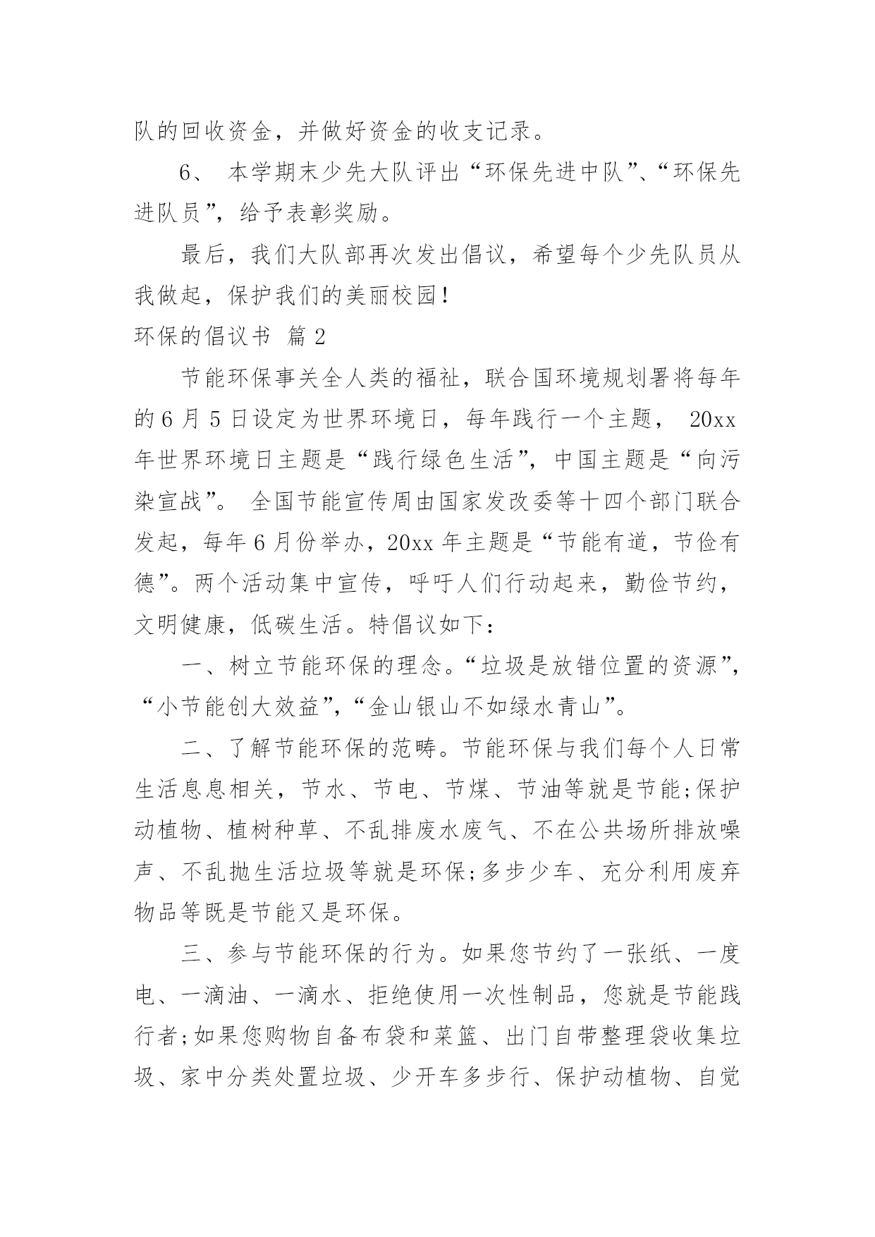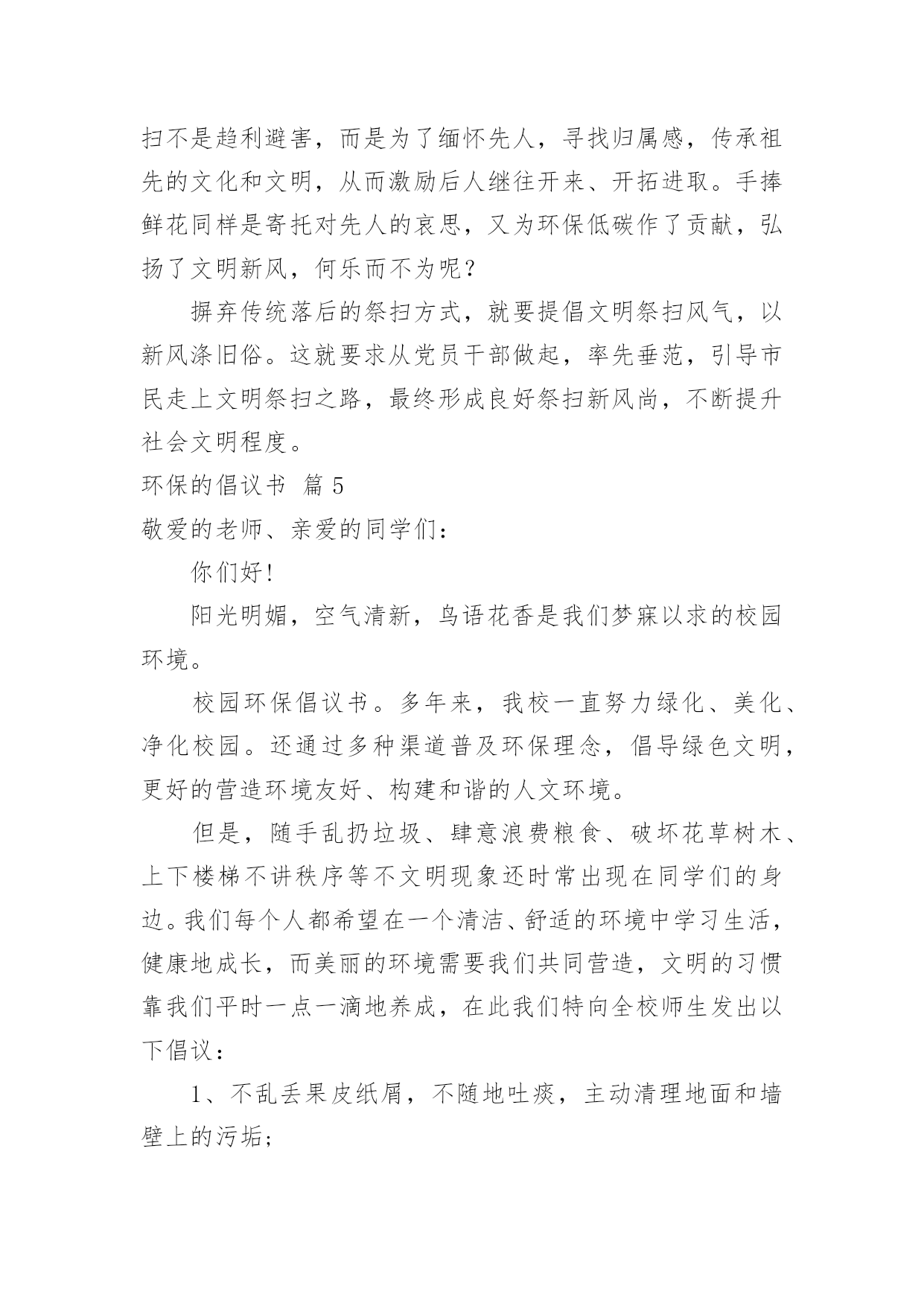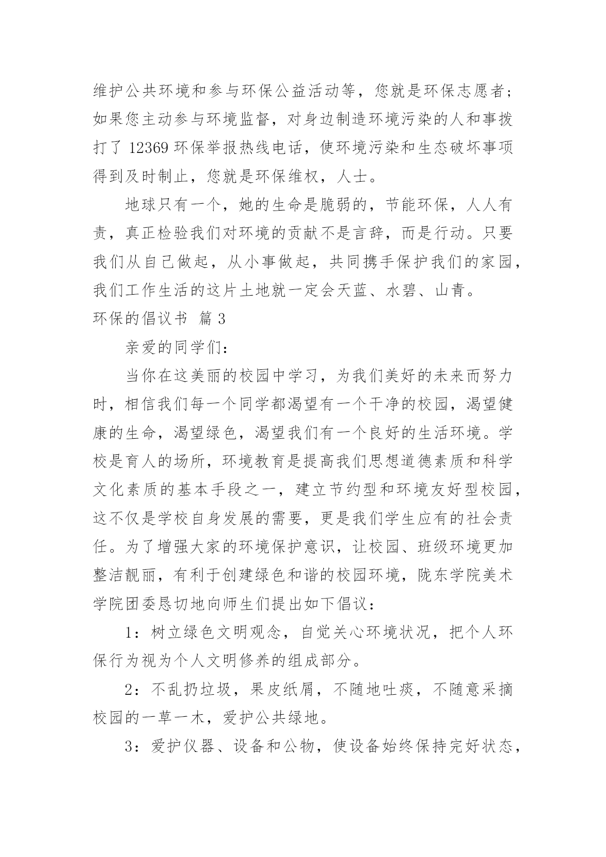 环保的倡议书精选环保的倡议书汇编7篇环保的倡议书篇1中学全体同学:为了增强同学们的环保意识,使校园、班级环境更加整洁,为了培养我们青少年勤俭节约的好习惯,历城中学大队部提出倡议,倡议从10月开始在全校各中队开展“饮料瓶与废纸回收”活动。通过活动让队员在实际的学习生活中体验节约习惯,能给班集体带来收益和给班级、学校带来环境整洁美丽的好处。倡议少先队员们做到以下几点:1、平时用完的废纸及饮料瓶不要胡乱丢弃在学校园里,自觉培养良好的环保意识。2、饮料瓶回收活动以班级为单位进行,每个班准备两个回收箱或袋,一个装废纸,一个装饮料瓶。由劳动委员和生活委员作为活动的班级负责员。3、班级里推荐两名环保卫士。负责监督队员的文明环保行为,维护班级环境整洁。4、学校每双周周五下午组织一次回收,回收时,各班安排好专人按时到团队室送交。学校大队部将联系社区内的废品收购人员到学校收购,少先大队按班级做好记录,回收的钱归各中队所有,作为各中队的活动经费。5、各中队要安排1名责任心较强的队员,管理好本中队的回收资金,并做好资金的收支记录。6、本学期末少先大队评出“环保先进中队”、“环保先进队员”,给予表彰奖励。最后,我们大队部再次发出倡议,希望每个少先队员从我做起,保护我们的美丽校园!环保的倡议书篇2节能环保事关全人类的福祉,联合国环境规划署将每年的6月5日设定为世界环境日,每年践行一个主题,20xx年世界环境日主题是“践行绿色生活”,中国主题是“向污染宣战”。全国节能宣传周由国家发改委等十四个部门联合发起,每年6月份举办,20xx年主题是“节能有道,节俭有德”。两个活动集中宣传,呼吁人们行动起来,勤俭节约,文明健康,低碳生活。特倡议如下:一、树立节能环保的理念。“垃圾是放错位置的资源”,“小节能创大效益”,“金山银山不如绿水青山”。二、了解节能环保的范畴。节能环保与我们每个人日常生活息息相关,节水、节电、节煤、节油等就是节能;保护动植物、植树种草、不乱排废水废气、不在公共场所排放噪声、不乱抛生活垃圾等就是环保;多步少车、充分利用废弃物品等既是节能又是环保。三、参与节能环保的行为。如果您节约了一张纸、一度电、一滴油、一滴水、拒绝使用一次性制品,您就是节能践行者;如果您购物自备布袋和菜篮、出门自带整理袋收集垃圾、家中分类处置垃圾、少开车多步行、保护动植物、自觉维护公共环境和参与环保公益活动等,您就是环保志愿者;如果您主动参与环境监督,对身边制造环境污染的人和事拨打了12369环保举报热线电话,使环境污染和生态破坏事项得到及时制止,您就是环保维权,人士。地球只有一个,她的生命是脆弱的,节能环保,人人有责,真正检验我们对环境的贡献不是言辞,而是行动。只要我们从自己做起,从小事做起,共同携手保护我们的家园,我们工作生活的这片土地就一定会天蓝、水碧、山青。环保的倡议书篇3亲爱的同学们:当你在这美丽的校园中学习,为我们美好的未来而努力时,相信我们每一个同学都渴望有一个干净的校园,渴望健康的生命,渴望绿色,渴望我们有一个良好的生活环境。学校是育人的场所,环境教育是提高我们思想道德素质和科学文化素质的基本手段之一,建立节约型和环境友好型校园,这不仅是学校自身发展的需要,更是我们学生应有的社会责任。为了增强大家的环境保护意识,让校园、班级环境更加整洁靓丽,有利于创建绿色和谐的校园环境,陇东学院美术学院团委恳切地向师生们提出如下倡议:1:树立绿色文明观念,自觉关心环境状况,把个人环保行为视为个人文明修养的组成部分。2:不乱扔垃圾,果皮纸屑,不随地吐痰,不随意采摘校园的一草一木,爱护公共绿地。3:爱护仪器、设备和公物,使设备始终保持完好状态,尽力减少损坏维修。4:节约用水,珍惜水资源,减少水污染;节约用电,做到人走灯灭,光线充足时不要开灯,避免“白昼灯”、“长明灯的情况发生,微机室电脑用后及时关机。5:节约用纸,尽量少用餐巾纸,草稿纸等尽量两面用。6:生活节俭,不随意浪费粮食,不剩饭,培养良好的生活习惯。7:尽量少用塑料袋,尽量少用一次性的纸杯、塑料杯。8:从我做起,号召全校同学树立环境意识,为创建绿色和谐校园出自己的一份力。“历览前贤国与家,成由勤俭败由奢”,中华民族历来倡导节约,父母老师也再三强调环境的保护,让我们义不容辞地承担各自的使命,树立环境意识,养成节约资源的习惯,从我做起,从点滴小事做起,为共建环境友好型的和谐校园而努力!每位同学都希望能在干净舒适的校园度过美好的大学时光,可如今的警校校园环境正受到严重的威胁!无论在教室(特别是大教室)、山顶球场,或是其他的公共场所,时常可见垃圾。校内光洁物业的工作人员打扫非常辛苦,常常佝偻着腰重复着拾捡的动作,在寒风中踽踽独行,只为给学子们创造一个干净的环境。然而,校园环境的清洁,只有保洁人员的清扫是远远不够的,还需要大家共同