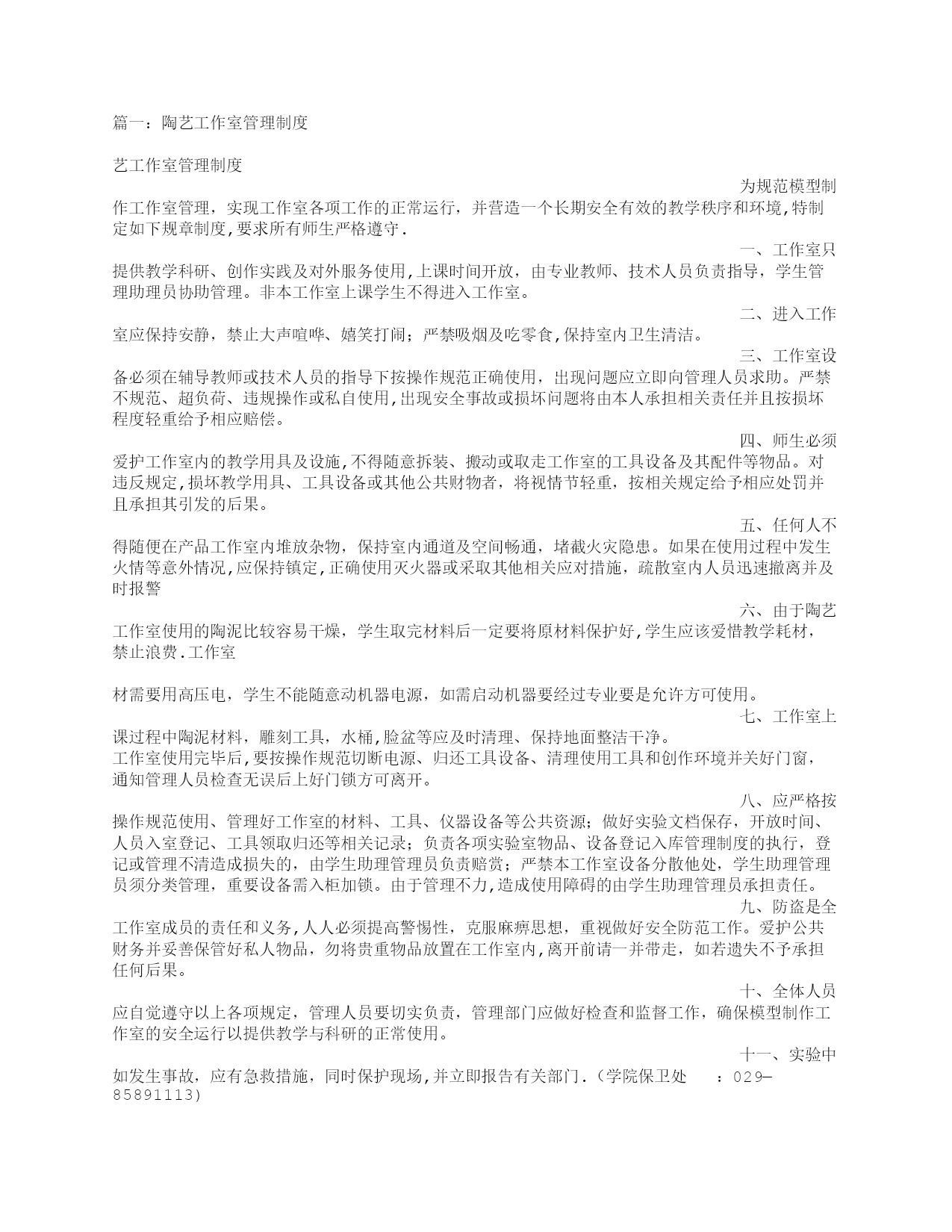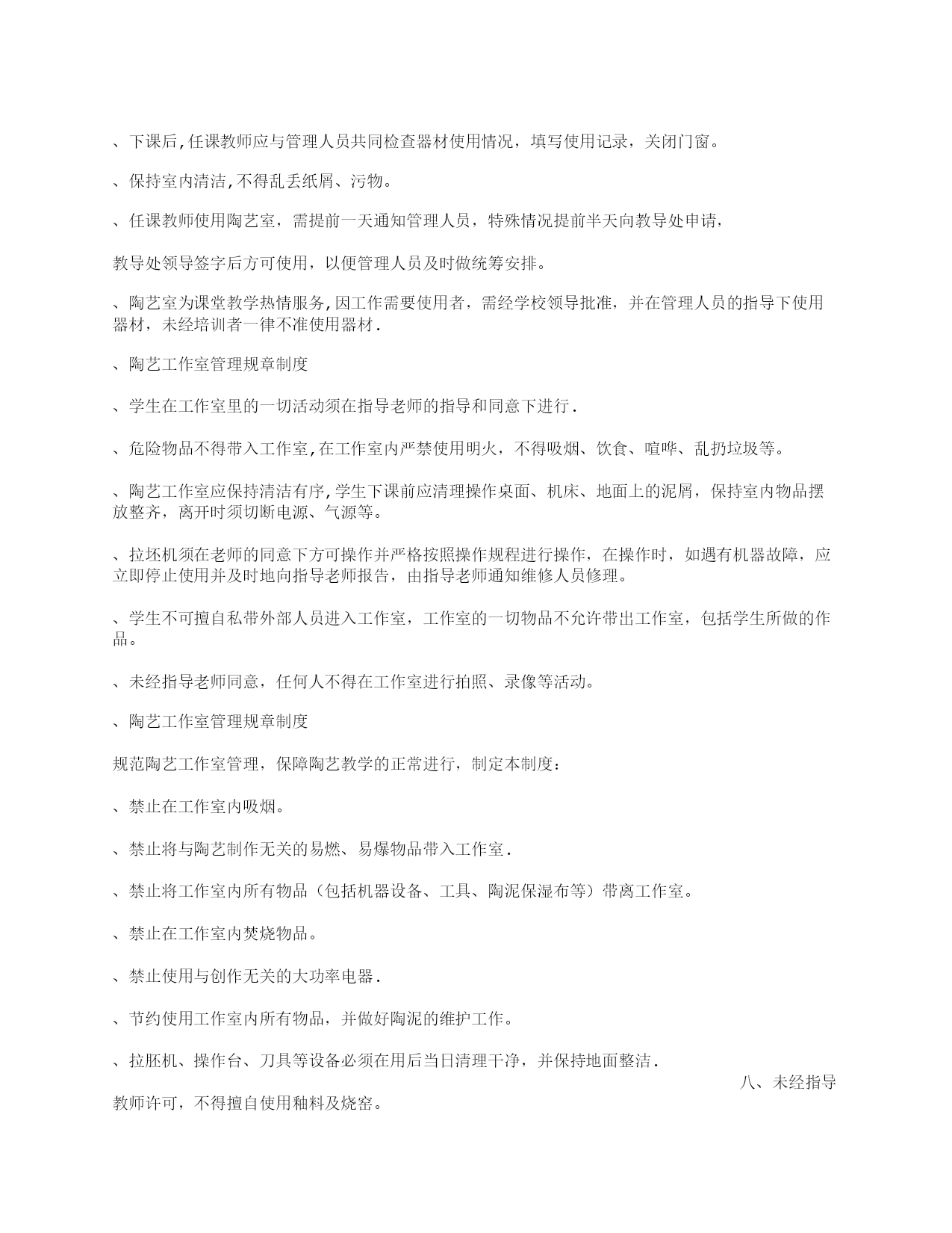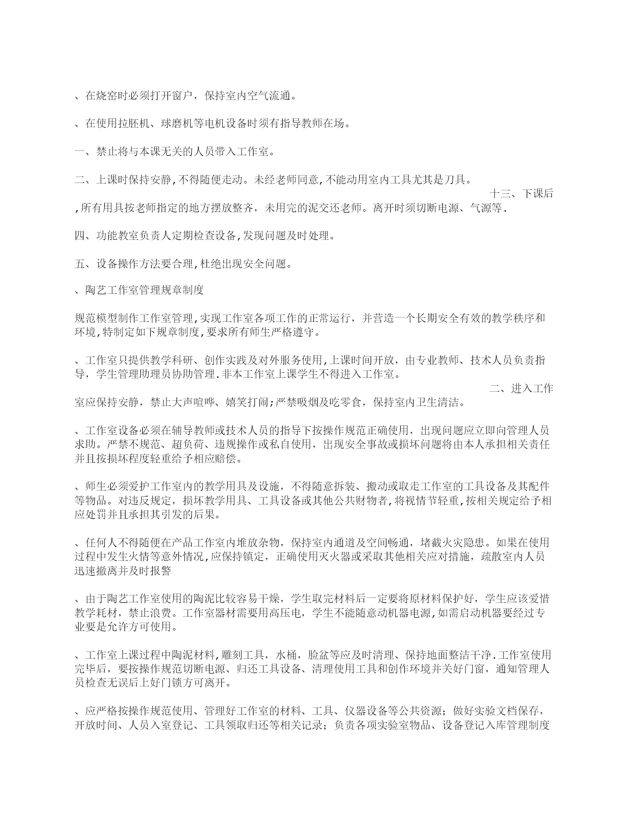 陶艺工作室规章制度实用文档(实用文档,可以直接使用,可编辑优秀版资料,欢迎下载)篇一:陶艺工作室管理制度陶艺工作室管理制度为规范模型制作工作室管理,实现工作室各项工作的正常运行,并营造一个长期安全有效的教学秩序和环境,特制定如下规章制度,要求所有师生严格遵守.一、工作室只提供教学科研、创作实践及对外服务使用,上课时间开放,由专业教师、技术人员负责指导,学生管理助理员协助管理。非本工作室上课学生不得进入工作室。二、进入工作室应保持安静,禁止大声喧哗、嬉笑打闹;严禁吸烟及吃零食,保持室内卫生清洁。三、工作室设备必须在辅导教师或技术人员的指导下按操作规范正确使用,出现问题应立即向管理人员求助。严禁不规范、超负荷、违规操作或私自使用,出现安全事故或损坏问题将由本人承担相关责任并且按损坏程度轻重给予相应赔偿。四、师生必须爱护工作室内的教学用具及设施,不得随意拆装、搬动或取走工作室的工具设备及其配件等物品。对违反规定,损坏教学用具、工具设备或其他公共财物者,将视情节轻重,按相关规定给予相应处罚并且承担其引发的后果。五、任何人不得随便在产品工作室内堆放杂物,保持室内通道及空间畅通,堵截火灾隐患。如果在使用过程中发生火情等意外情况,应保持镇定,正确使用灭火器或采取其他相关应对措施,疏散室内人员迅速撤离并及时报警六、由于陶艺工作室使用的陶泥比较容易干燥,学生取完材料后一定要将原材料保护好,学生应该爱惜教学耗材,禁止浪费.工作室器材需要用高压电,学生不能随意动机器电源,如需启动机器要经过专业要是允许方可使用。七、工作室上课过程中陶泥材料,雕刻工具,水桶,脸盆等应及时清理、保持地面整洁干净。工作室使用完毕后,要按操作规范切断电源、归还工具设备、清理使用工具和创作环境并关好门窗,通知管理人员检查无误后上好门锁方可离开。八、应严格按操作规范使用、管理好工作室的材料、工具、仪器设备等公共资源;做好实验文档保存,开放时间、人员入室登记、工具领取归还等相关记录;负责各项实验室物品、设备登记入库管理制度的执行,登记或管理不清造成损失的,由学生助理管理员负责赔赏;严禁本工作室设备分散他处,学生助理管理员须分类管理,重要设备需入柜加锁。由于管理不力,造成使用障碍的由学生助理管理员承担责任。九、防盗是全工作室成员的责任和义务,人人必须提高警惕性,克服麻痹思想,重视做好安全防范工作。爱护公共财务并妥善保管好私人物品,勿将贵重物品放置在工作室内,离开前请一并带走,如若遗失不予承担任何后果。十、全体人员应自觉遵守以上各项规定,管理人员要切实负责,管理部门应做好检查和监督工作,确保模型制作工作室的安全运行以提供教学与科研的正常使用。十一、实验中如发生事故,应有急救措施,同时保护现场,并立即报告有关部门.(学院保卫处:029—85891113)人文艺术学院2021年11月1日篇二:陶艺制作室规章制度陶艺制作室规章制度为了规范陶艺制作室使用及管理,制定以下制度:1、任课教师要做好使用前的准备工作,如:熟悉器材,工具材料的摆放等。2、非经管理人员允许,其他人员不得随意出入。3、陶艺室内设备不得随意乱动,室内一切物品不得随意带出教室。4、爱护公物、器材,细心操作,机器发生故障应及时报告管理人员,如发生损坏机器事故,要有当事人酌情赔偿。5、下课后,任课教师应与管理人员共同检查器材使用情况,填写使用记录,关闭门窗.6、保持室内清洁,不得乱丢纸屑、污物.7、任课教师使用陶艺室,需提前一天通知管理人员,特殊情况提前半天向教导处申请,待教导处领导签字后方可使用,以便管理人员及时做统筹安排。8、陶艺室为课堂教学热情服务,因工作需要使用者,需经学校领导批准,并在管理人员的指导下使用器材,未经培训者一律不准使用器材.篇三:陶艺工作室管理规章制度microsoftword文档(2)陶艺工作室管理规章制度为规范陶艺工作室管理,保障陶艺教学的正常进行,制定本制度:一、禁止在工作室内吸烟。二、禁止将与陶艺制作无关的易燃、易爆物品带入工作室。三、禁止将工作室内所有物品(包括机器设备、工具、陶泥保湿布等)带离工作室。四、禁止在工作室内焚烧物品。五、禁止使用与创作无关的大功率电器.六、节约使用工作室内所有物品,并做好陶泥的维护工作.七、拉胚机、操作台、刀具等设备必须在用后当日清理干净,并保持地面整洁.八、未经指导教师许可,不得擅自使用釉料及烧窑。九、在烧窑时必须打开窗户,保持室内空气流通。十、在使用拉胚机、球磨机等电机设备时须有指导教师在场。十一、禁止将与本课无关的人员带入工作室。十二、上课时保持安静,不得随便走动。未经老师同意,不能动用室内工具尤其是刀具。十三、下课后,所有用具按老师指定的地方摆放整齐,未用完的泥交还老师