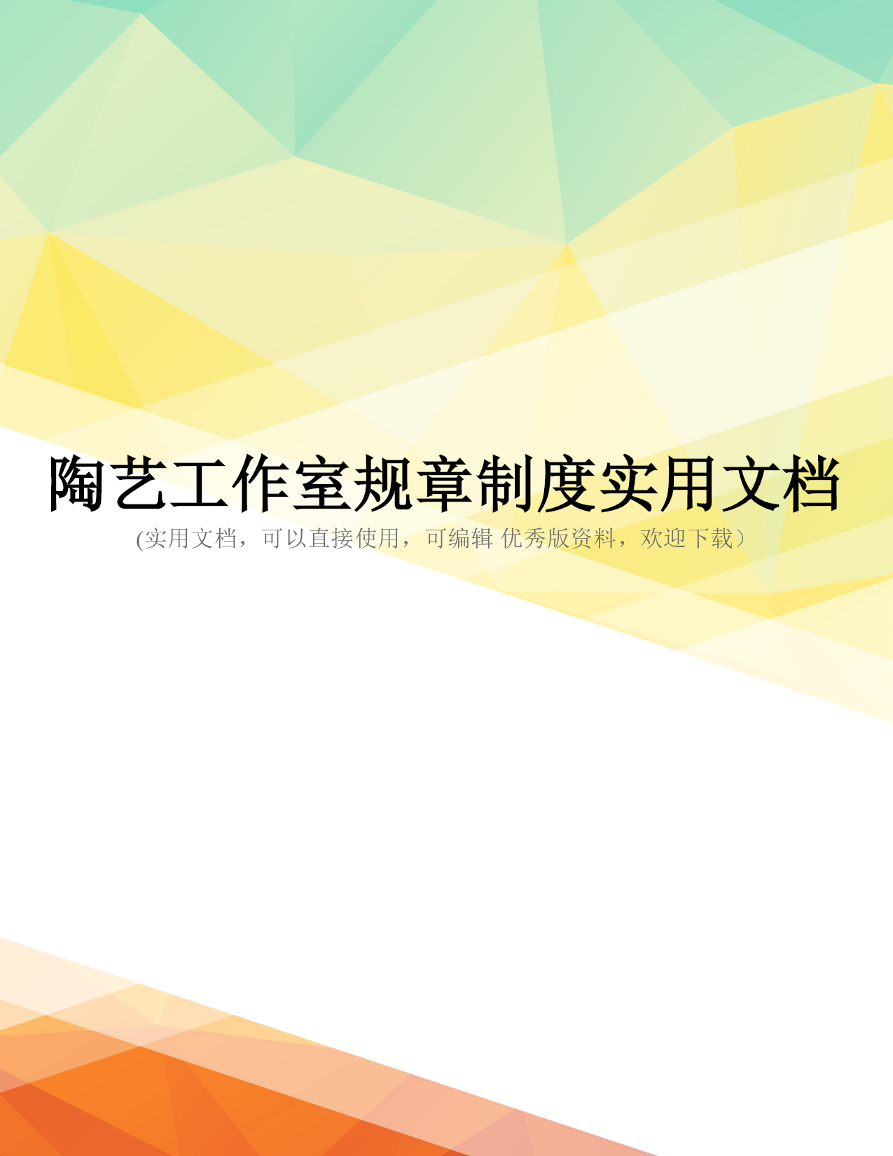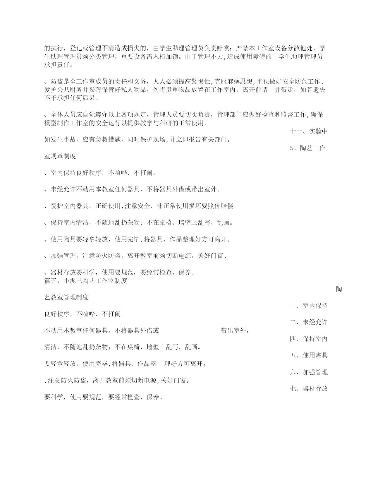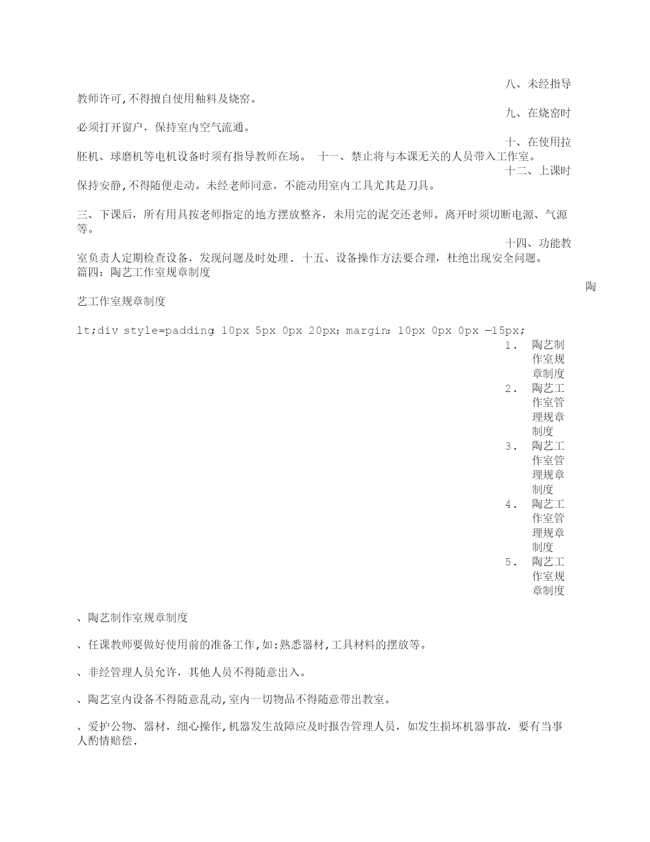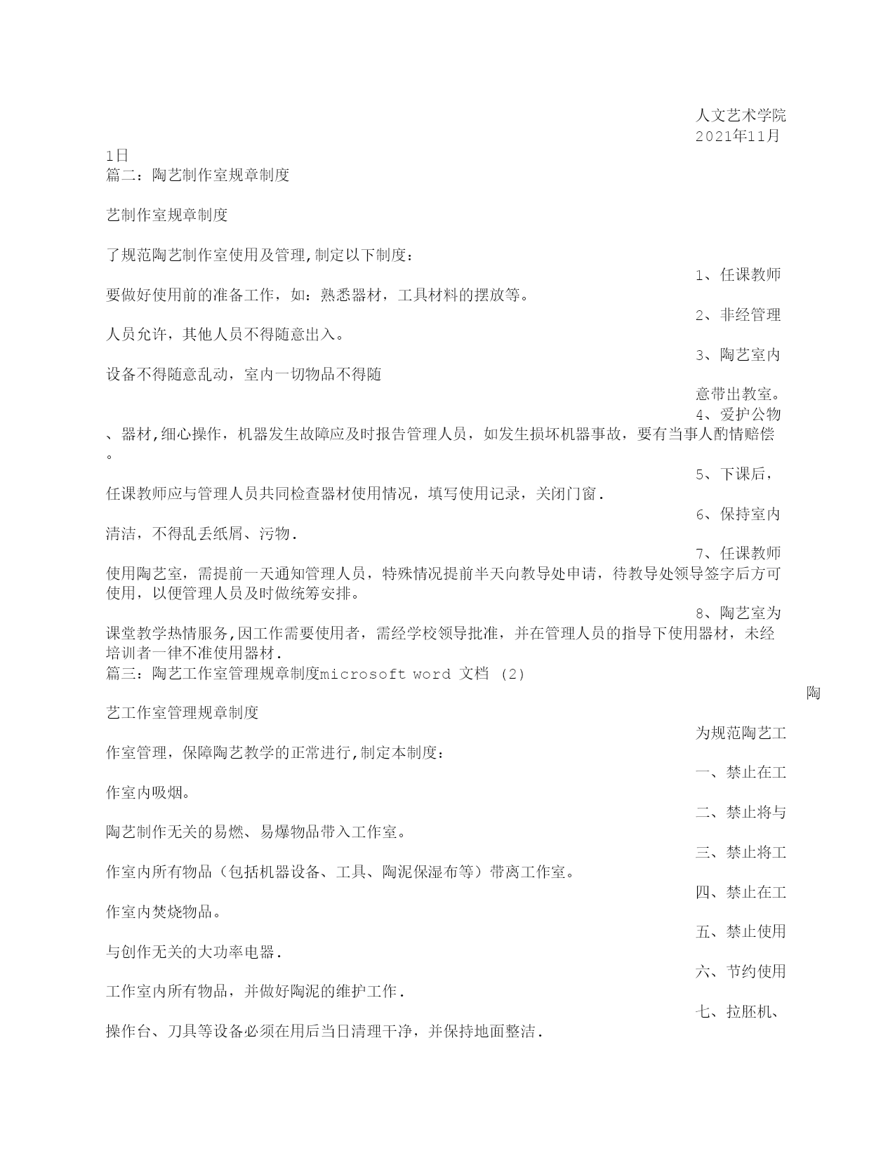 陶艺工作室规章制度实用文档(实用文档,可以直接使用,可编辑优秀版资料,欢迎下载)篇一:陶艺工作室管理制度陶艺工作室管理制度为规范模型制作工作室管理,实现工作室各项工作的正常运行,并营造一个长期安全有效的教学秩序和环境,特制定如下规章制度,要求所有师生严格遵守.一、工作室只提供教学科研、创作实践及对外服务使用,上课时间开放,由专业教师、技术人员负责指导,学生管理助理员协助管理。非本工作室上课学生不得进入工作室。二、进入工作室应保持安静,禁止大声喧哗、嬉笑打闹;严禁吸烟及吃零食,保持室内卫生清洁。三、工作室设备必须在辅导教师或技术人员的指导下按操作规范正确使用,出现问题应立即向管理人员求助。严禁不规范、超负荷、违规操作或私自使用,出现安全事故或损坏问题将由本人承担相关责任并且按损坏程度轻重给予相应赔偿。四、师生必须爱护工作室内的教学用具及设施,不得随意拆装、搬动或取走工作室的工具设备及其配件等物品。对违反规定,损坏教学用具、工具设备或其他公共财物者,将视情节轻重,按相关规定给予相应处罚并且承担其引发的后果。五、任何人不得随便在产品工作室内堆放杂物,保持室内通道及空间畅通,堵截火灾隐患。如果在使用过程中发生火情等意外情况,应保持镇定,正确使用灭火器或采取其他相关应对措施,疏散室内人员迅速撤离并及时报警六、由于陶艺工作室使用的陶泥比较容易干燥,学生取完材料后一定要将原材料保护好,学生应该爱惜教学耗材,禁止浪费.工作室器材需要用高压电,学生不能随意动机器电源,如需启动机器要经过专业要是允许方可使用。七、工作室上课过程中陶泥材料,雕刻工具,水桶,脸盆等应及时清理、保持地面整洁干净。工作室使用完毕后,要按操作规范切断电源、归还工具设备、清理使用工具和创作环境并关好门窗,通知管理人员检查无误后上好门锁方可离开。八、应严格按操作规范使用、管理好工作室的材料、工具、仪器设备等公共资源;做好实验文档保存,开放时间、人员入室登记、工具领取归还等相关记录;负责各项实验室物品、设备登记入库管理制度的执行,登记或管理不清造成损失的,由学生助理管理员负责赔赏;严禁本工作室设备分散他处,学生助理管理员须分类管理,重要设备需入柜加锁。由于管理不力,造成使用障碍的由学生助理管理员承担责任。九、防盗是全工作室成员的责任和义务,人人必须提高警惕性,克服麻痹思想,重视做好安全防范工作。爱护公共财务并妥善保管好私人物品,勿将贵重物品放置在工作室内,离开前请一并带走,如若遗失不予承担任何后果。十、全体人员应自觉遵守以上各项规定,管理人员要切实负责,管理部门应做好检查和监督工作,确保模型制作工作室的安全运行以提供教学与科研的正常使用。十一、实验中如发生事故,应有急救措施,同时保护现场,并立即报告有关部门.(学院保卫处:029—85891113)人文艺术学院2021年11月1日篇二:陶艺制作室规章制度陶艺制作室规章制度为了规范陶艺制作室使用及管理,制定以下制度:1、任课教师要做好使用前的准备工作,如:熟悉器材,工具材料的摆放等。2、非经管理人员允许,其他人员不得随意出入。3、陶艺室内设备不得随意乱动,室内一切物品不得随意带出教室。4、爱护公物、器材,细心操作,机器发生故障应及时报告管理人员,如发生损坏机器事故,要有当事人酌情赔偿。5、下课后,任课教师应与管理人员共同检查器材使用情况,填写使用记录,关闭门窗.6、保持室内清洁,不得乱丢纸屑、污物.7、任课教师使用陶艺室,需提前一天通知管理人员,特殊情况提前半天向教导处申请,待教导处领导签字后方可使用,以便管理人员及时做统筹安排。8、陶艺室为课堂教学热情服务,因工作需要使用者,需经学校领导批准,并在管理人员的指导下使用器材,未经培训者一律不准使用器材.篇三:陶艺工作室管理规章制度microsoftword文档(2)陶艺工作室管理规章制度为规范陶艺工作室管理,保障陶艺教学的正常进行,制定本制度:一、禁止在工作室内吸烟。二、禁止将与陶艺制作无关的易燃、易爆物品带入工作室。三、禁止将工作室内所有物品(包括机器设备、工具、陶泥保湿布等)带离工作室。四、禁止在工作室内焚烧物品。五、禁止使用与创作无关的大功率电器.六、节约使用工作室内所有物品,并做好陶泥的维护工作.七、拉胚机、操作台、刀具等设备必须在用后当日清理干净,并保持地面整洁.八、未经指导教师许可,不得擅自使用釉料及烧窑。九、在烧窑时必须打开窗户,保持室内空气流通。十、在使用拉胚机、球磨机等电机设备时须有指导教师在场。十一、禁止将与本课无关的人员带入工作室。十二、上课时保持安静,不得随便走动。未经老师同意,不能动用室内工具尤其是刀具。十三、下课后,所有用具按老师指定的地方摆放整齐,未用完的泥交还老师