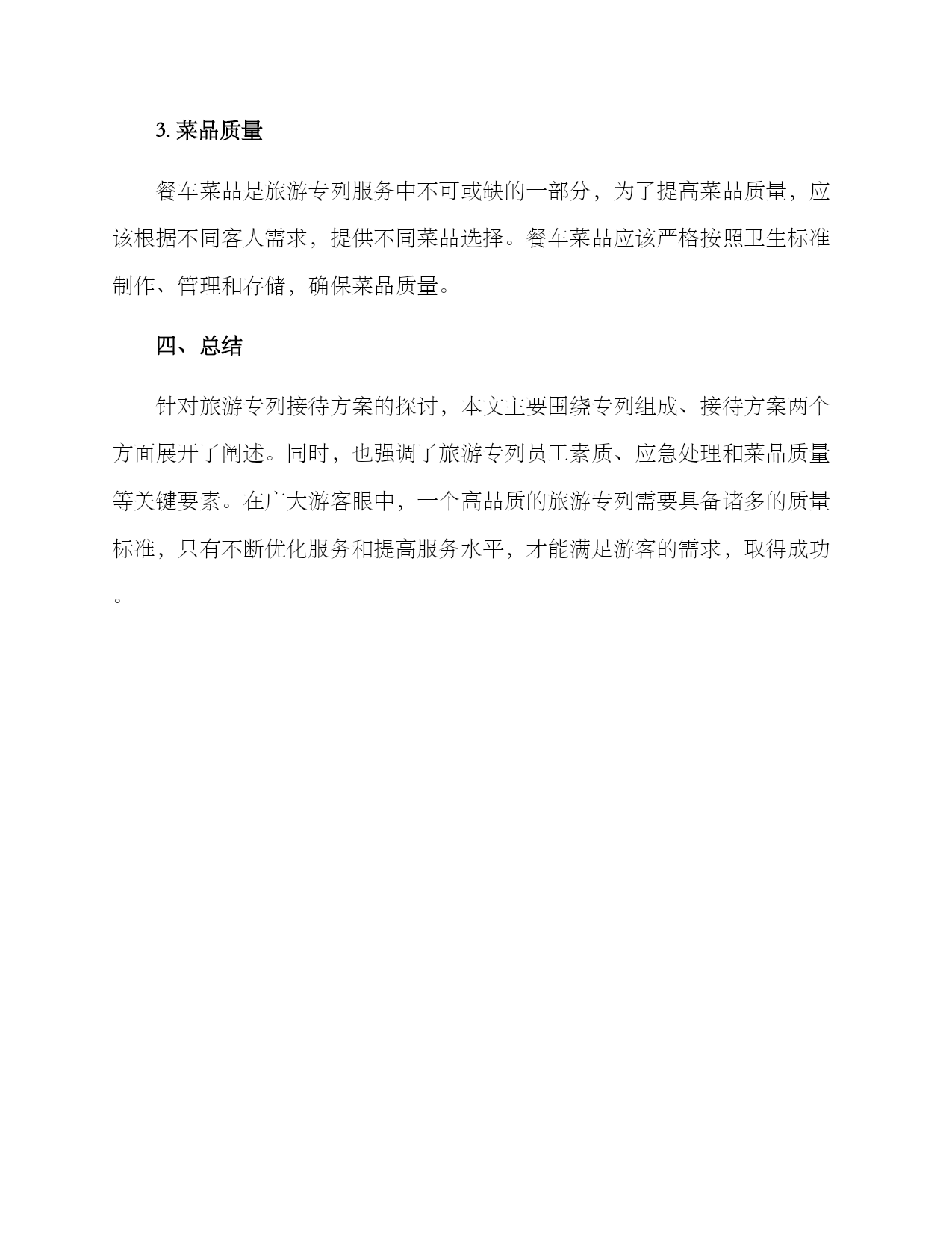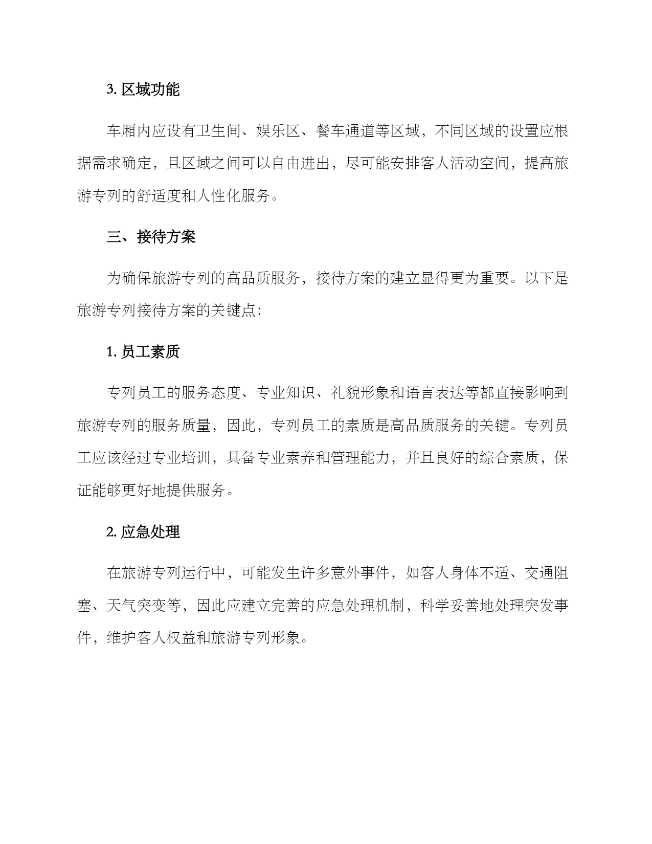 旅游专列接待方案一、背景近年来,随着生活水平不断提高,人们对旅游的需求越来越强烈,个性化、高品质的旅游方式备受青睐。作为旅游行业的重要组成部分之一,旅游专列在旅游市场中的地位也越来越受到重视。为更好地满足游客需求,提高旅游服务质量,本文以旅游专列接待方案为主题,进行探讨。二、专列组成旅游专列主要包括机车头、客车、餐车和后勤保障车等组成部分。其中,客车为核心部分,需安排明确的车厢分区、座位布局和区域功能。1.车厢分区根据不同的需求,车厢可以分为卧铺区、座位区、休息区、娱乐区和会议区等。针对不同客户的需求,合理分配车厢,并根据具体需求调整车厢布局,提高空间使用效率,增加舒适度与便利性。2.座位布局座位布局需充分考虑个人需求和旅游目的,根据行程长度和客人数量等具体情况确定座位密度和座位布局。座位按照一定规律排列,方便客人活动和交流。座椅还应具有舒适性、靠背调节功能。3.区域功能车厢内应设有卫生间、娱乐区、餐车通道等区域,不同区域的设置应根据需求确定,且区域之间可以自由进出,尽可能安排客人活动空间,提高旅游专列的舒适度和人性化服务。三、接待方案为确保旅游专列的高品质服务,接待方案的建立显得更为重要。以下是旅游专列接待方案的关键点:1.员工素质专列员工的服务态度、专业知识、礼貌形象和语言表达等都直接影响到旅游专列的服务质量,因此,专列员工的素质是高品质服务的关键。专列员工应该经过专业培训,具备专业素养和管理能力,并且良好的综合素质,保证能够更好地提供服务。2.应急处理在旅游专列运行中,可能发生许多意外事件,如客人身体不适、交通阻塞、天气突变等,因此应建立完善的应急处理机制,科学妥善地处理突发事件,维护客人权益和旅游专列形象。3.菜品质量餐车菜品是旅游专列服务中不可或缺的一部分,为了提高菜品质量,应该根据不同客人需求,提供不同菜品选择。餐车菜品应该严格按照卫生标准制作、管理和存储,确保菜品质量。四、总结针对旅游专列接待方案的探讨,本文主要围绕专列组成、接待方案两个方面展开了阐述。同时,也强调了旅游专列员工素质、应急处理和菜品质量等关键要素。在广大游客眼中,一个高品质的旅游专列需要具备诸多的质量标准,只有不断优化服务和提高服务水平,才能满足游客的需求,取得成功。