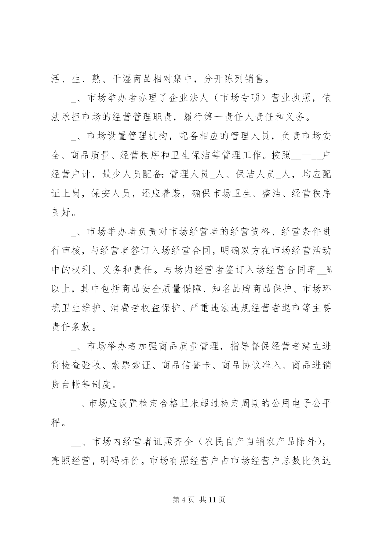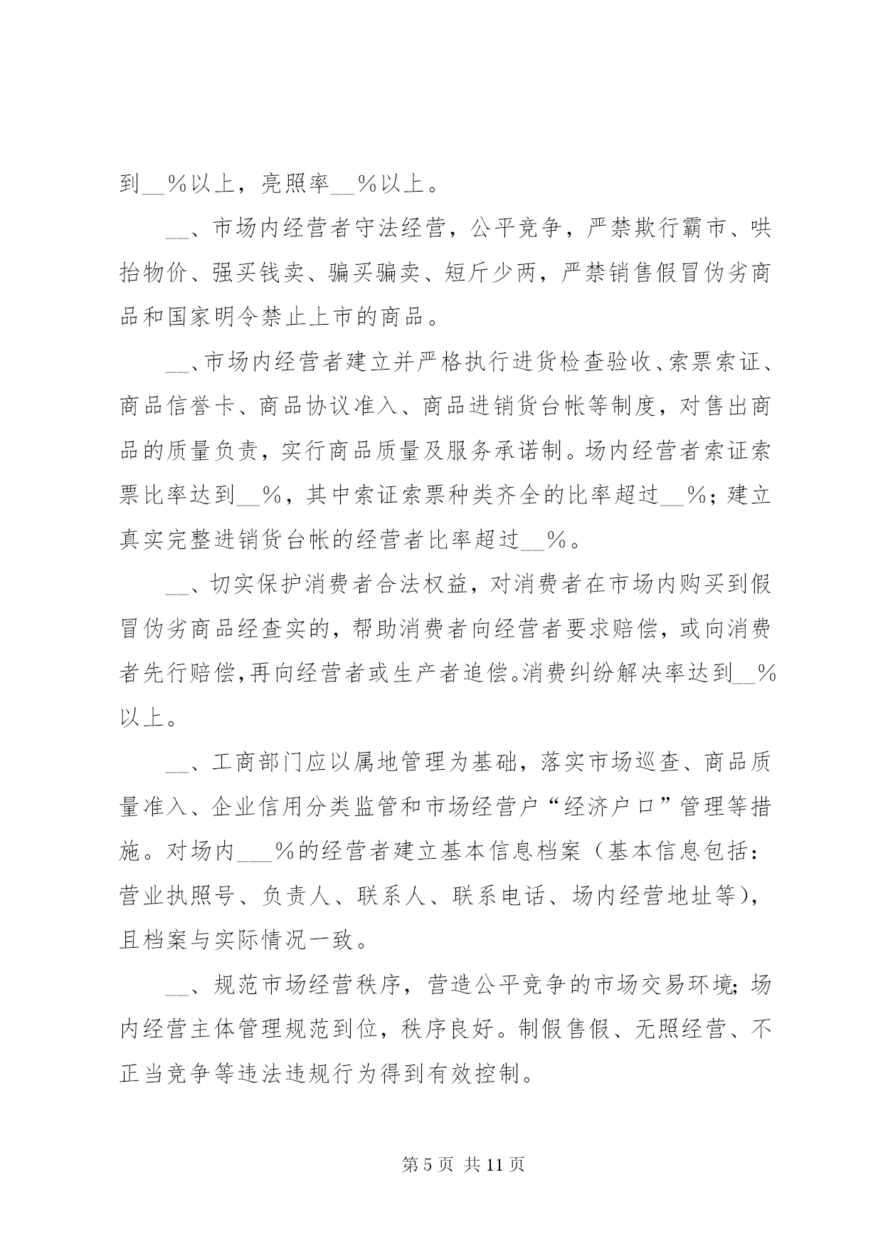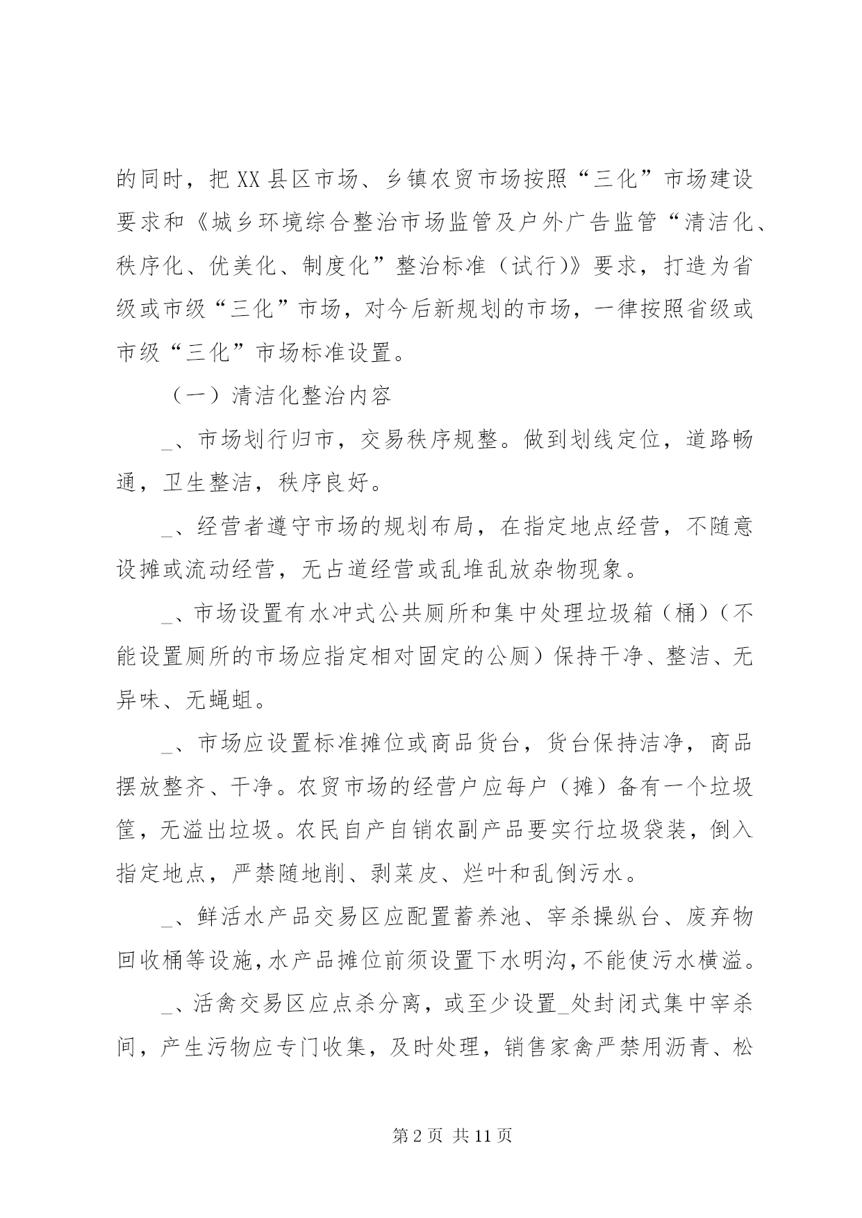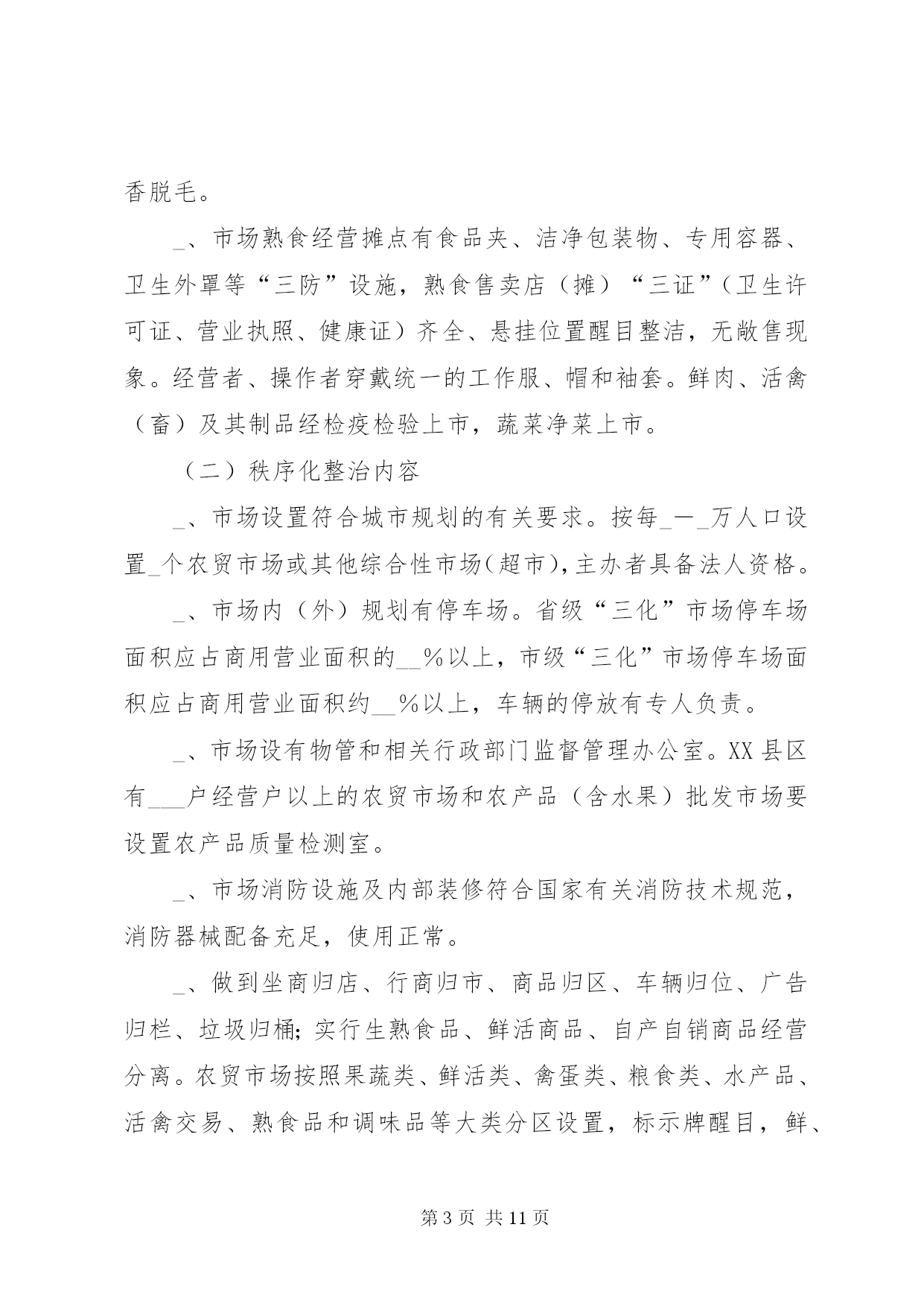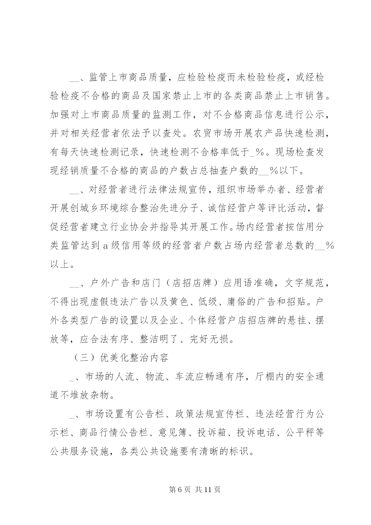 第PAGE\*Arabic\*MERGEFORMAT11页共NUMPAGES\*MERGEFORMAT11页工商局城乡环境整治工作方案一、整治工作目标为更好的贯彻落实省局和市委、市政府关于城乡环境综合整治工作的安排部署,按照《××市城乡环境综合整治指挥部关于明确各项工作组织职责及成员单位的通知》(××市城乡整治[____]_号)以及省工商局《城乡环境综合整治市场监管及户外广告监管“清洁化、秩序化、优美化、制度化”整治标准(试行)》的要求,着力使我市各类集贸市场达到整洁、文明、交易有序、政府放心、老百姓满意的市场。二、整治工作的范围加强对××XX县区__个农贸市场、__个小商品交易市场,区、县乡镇人民政府所在地的中心场镇农贸市场、公路干线场镇的农贸市场的综合管理,切实维护市场经营秩序,积极督促市场业主对市场设施的完善和容貌的整治,积极配合相关部门规范户外广告、牌匾、霓虹灯设置,治理广告乱贴乱画和市场“牛皮癣”的清理整治工作,确保市场内各类广告规范。三、整治工作的内容按照省委刘奇葆书记一系列指示精神,坚持近期和长期相结合的原则,立足长远,加大整治工作力度,使城乡市场容貌有重大改观。我市工商部门要切实履行好城乡环境综合整治市场秩序组长单位的工作职责,在着力市场及户外广告整治“五个规范”的同时,把XX县区市场、乡镇农贸市场按照“三化”市场建设要求和《城乡环境综合整治市场监管及户外广告监管“清洁化、秩序化、优美化、制度化”整治标准(试行)》要求,打造为省级或市级“三化”市场,对今后新规划的市场,一律按照省级或市级“三化”市场标准设置。(一)清洁化整治内容_、市场划行归市,交易秩序规整。做到划线定位,道路畅通,卫生整洁,秩序良好。_、经营者遵守市场的规划布局,在指定地点经营,不随意设摊或流动经营,无占道经营或乱堆乱放杂物现象。_、市场设置有水冲式公共厕所和集中处理垃圾箱(桶)(不能设置厕所的市场应指定相对固定的公厕)保持干净、整洁、无异味、无蝇蛆。_、市场应设置标准摊位或商品货台,货台保持洁净,商品摆放整齐、干净。农贸市场的经营户应每户(摊)备有一个垃圾筐,无溢出垃圾。农民自产自销农副产品要实行垃圾袋装,倒入指定地点,严禁随地削、剥菜皮、烂叶和乱倒污水。_、鲜活水产品交易区应配置蓄养池、宰杀操纵台、废弃物回收桶等设施,水产品摊位前须设置下水明沟,不能使污水横溢。_、活禽交易区应点杀分离,或至少设置_处封闭式集中宰杀间,产生污物应专门收集,及时处理,销售家禽严禁用沥青、松香脱毛。_、市场熟食经营摊点有食品夹、洁净包装物、专用容器、卫生外罩等“三防”设施,熟食售卖店(摊)“三证”(卫生许可证、营业执照、健康证)齐全、悬挂位置醒目整洁,无敞售现象。经营者、操作者穿戴统一的工作服、帽和袖套。鲜肉、活禽(畜)及其制品经检疫检验上市,蔬菜净菜上市。(二)秩序化整治内容_、市场设置符合城市规划的有关要求。按每_-_万人口设置_个农贸市场或其他综合性市场(超市),主办者具备法人资格。_、市场内(外)规划有停车场。省级“三化”市场停车场面积应占商用营业面积的__%以上,市级“三化”市场停车场面积应占商用营业面积约__%以上,车辆的停放有专人负责。_、市场设有物管和相关行政部门监督管理办公室。XX县区有___户经营户以上的农贸市场和农产品(含水果)批发市场要设置农产品质量检测室。_、市场消防设施及内部装修符合国家有关消防技术规范,消防器械配备充足,使用正常。_、做到坐商归店、行商归市、商品归区、车辆归位、广告归栏、垃圾归桶;实行生熟食品、鲜活商品、自产自销商品经营分离。农贸市场按照果蔬类、鲜活类、禽蛋类、粮食类、水产品、活禽交易、熟食品和调味品等大类分区设置,标示牌醒目,鲜、活、生、熟、干湿商品相对集中,分开陈列销售。_、市场举办者办理了企业法人(市场专项)营业执照,依法承担市场的经营管理职责,履行第一责任人责任和义务。_、市场设置管理机构,配备相应的管理人员,负责市场安全、商品质量、经营秩序和卫生保洁等管理工作。按照__—__户经营户计,最少人员配备:管理人员_人、保洁人员_人,均应配证上岗,保安人员,还应着装,确保市场卫生、整洁、经营秩序良好。_、市场举办者负责对市场经营者的经营资格、经营条件进行审核,与经营者签订入场经营合同,明确双方在市场经营活动中的权利、义务和责任。与场内经营者签订入场经营合同率__%以上,其中包括商品安全质量保障、知名品牌商品保护、市场环境卫生维护、消费者权益保护、严重违法违规经营者退市等主要责任条款。_、市场举办者加强商品质量管理,指导督促经营者建立进货检查验收、索票索证、商品信誉卡、商品协议准入、商品进销货台帐等制度。__、市场应设置检定合格且未超过检定周期的公用电子公平秤。__、市场内经营者证照齐全