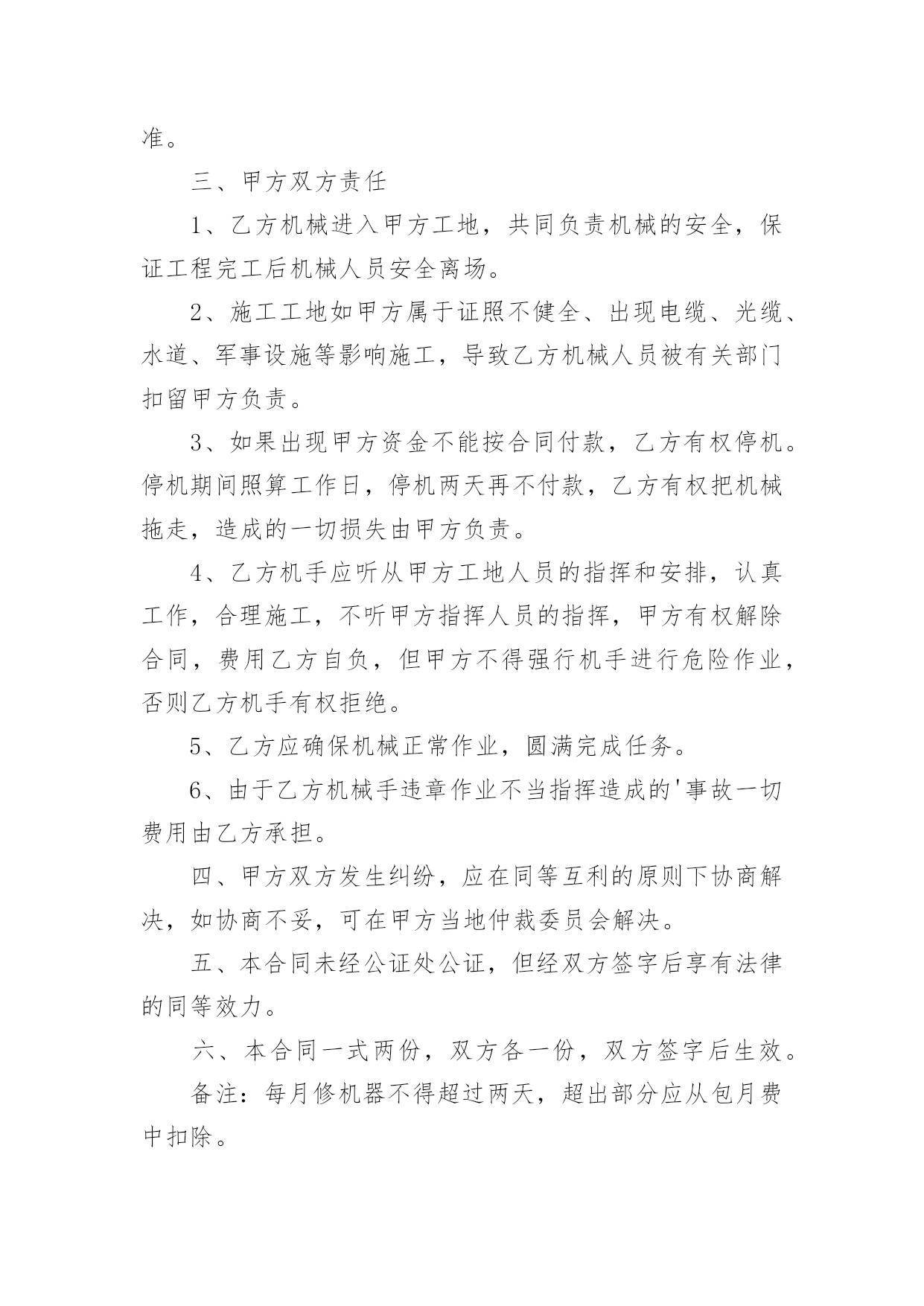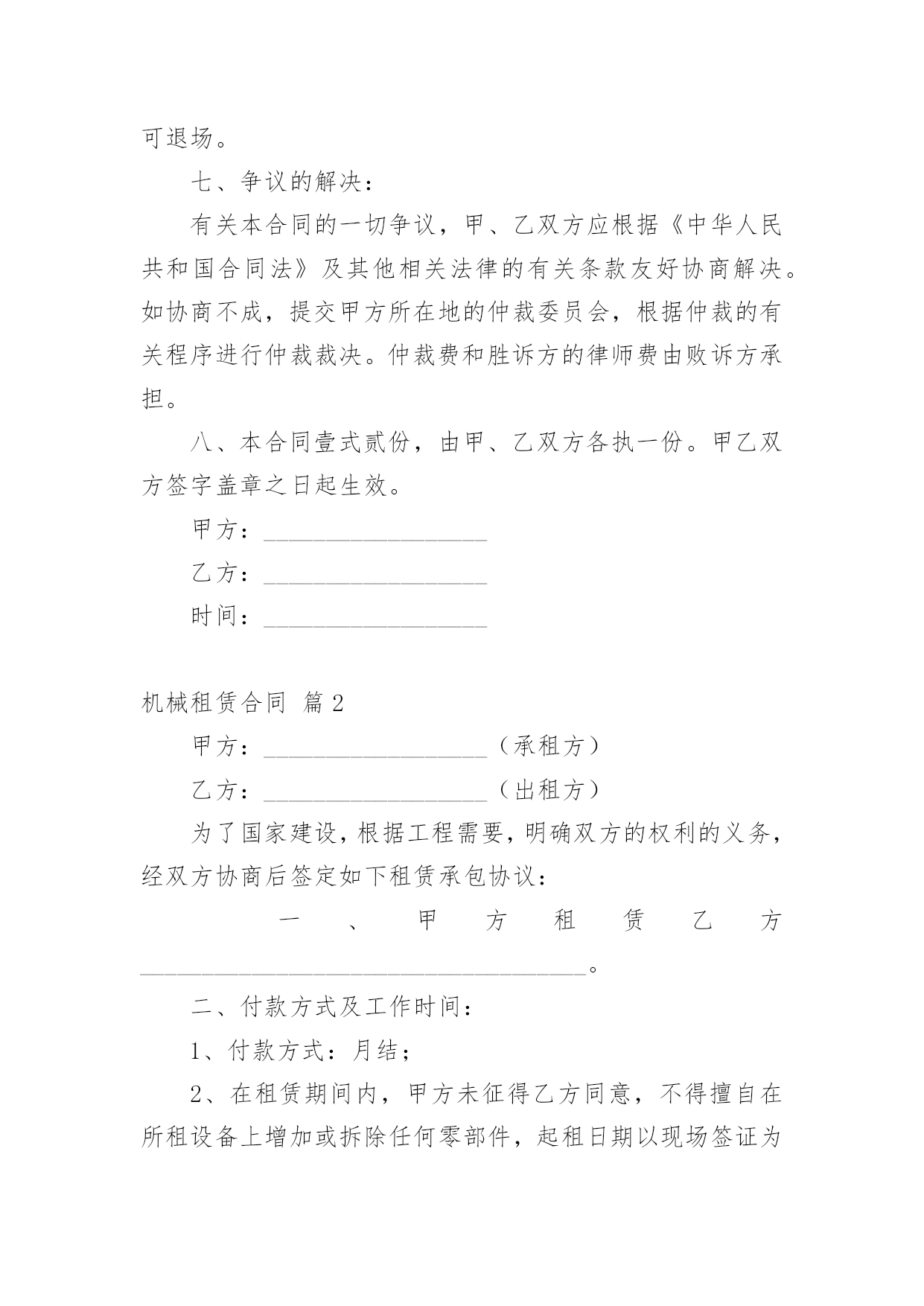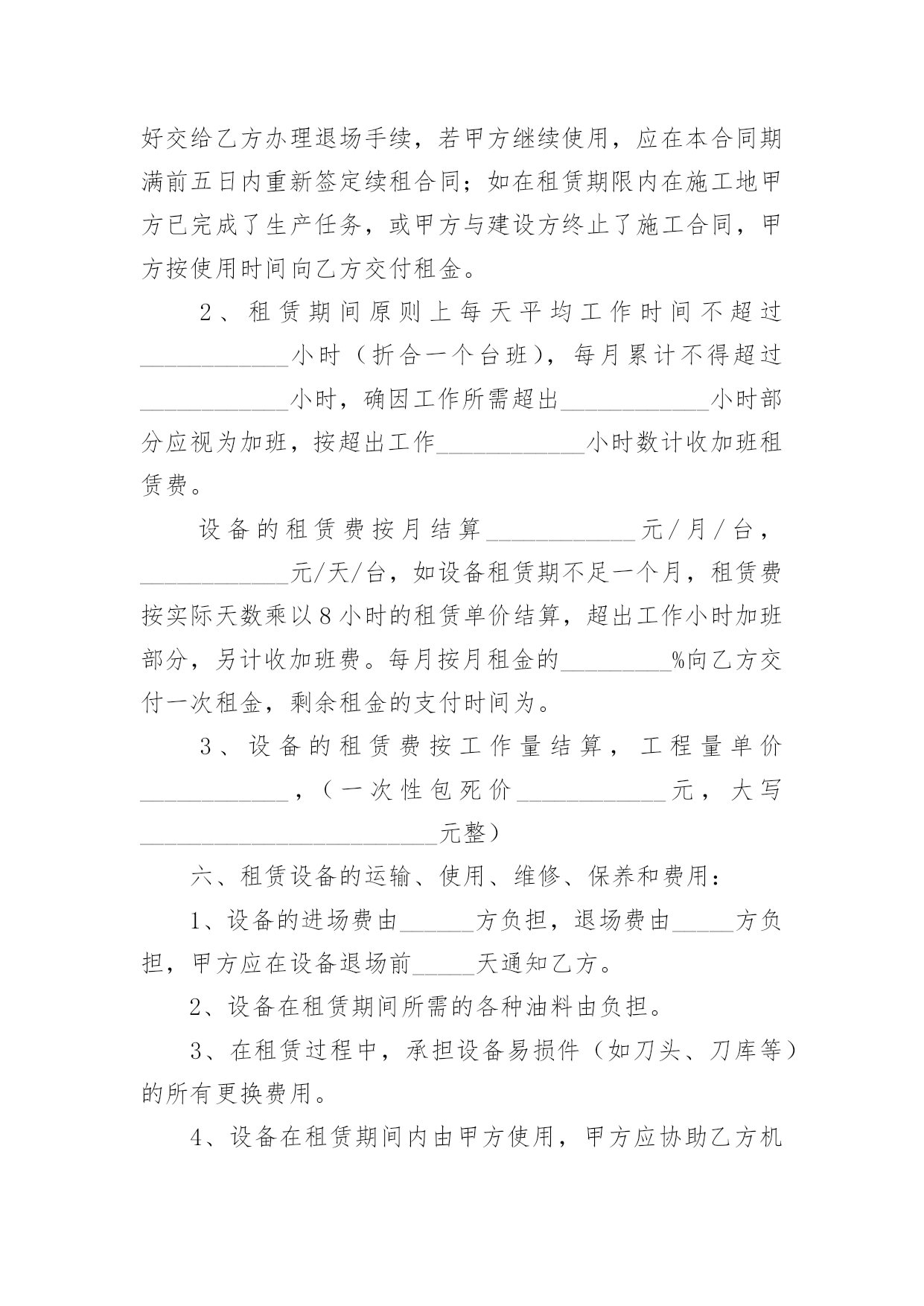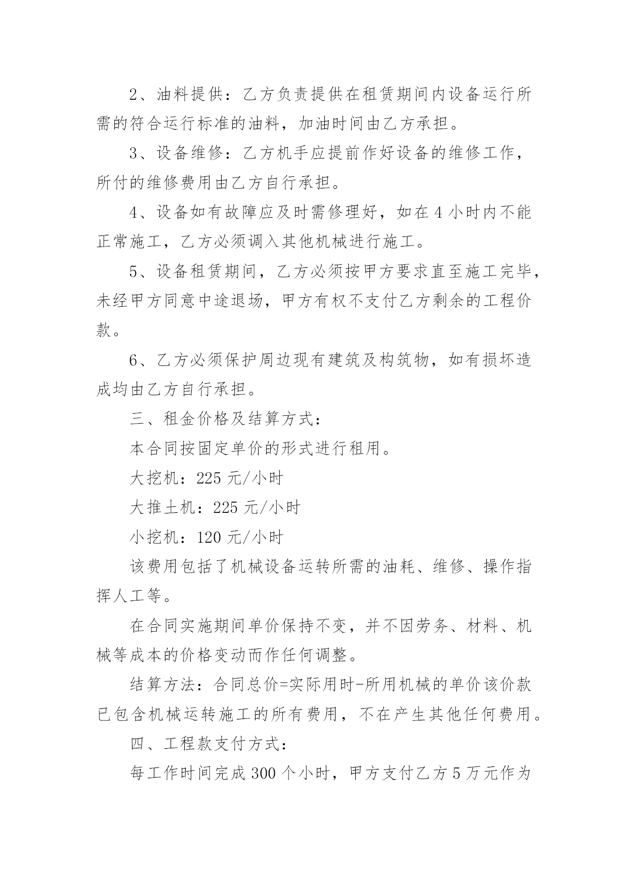机械租赁合同机械租赁合同(通用)随着法律法规不断完善,人们越发重视合同,合同对我们的约束力越来越不可忽视,签订合同是为了保障双方的利益,避免不必要的争端。拟定合同的注意事项有许多,你确定会写吗?下面是小编整理的机械租赁合同,仅供参考,希望能够帮助到大家。机械租赁合同篇1承租方(甲方):__________________出租方(乙方):__________________根据《中华人民共和国合同法》的规定,经双方协商一致,就甲方向乙方承租设备达成如下协议:一、设备的使用地点及工程情况:使用地点:______________________________________________________工程情况:本地块内原厂房及设备基础地坑等建筑物的清除,便于勘察及打桩。二、承租方式及相关约定:1、乙方所提供的机械设备进场前必须提供设备的品牌、型号、功能、购买时间等,经甲方同意后方可进场施工。2、油料提供:乙方负责提供在租赁期间内设备运行所需的符合运行标准的油料,加油时间由乙方承担。3、设备维修:乙方机手应提前作好设备的维修工作,所付的维修费用由乙方自行承担。4、设备如有故障应及时需修理好,如在4小时内不能正常施工,乙方必须调入其他机械进行施工。5、设备租赁期间,乙方必须按甲方要求直至施工完毕,未经甲方同意中途退场,甲方有权不支付乙方剩余的工程价款。6、乙方必须保护周边现有建筑及构筑物,如有损坏造成均由乙方自行承担。三、租金价格及结算方式:本合同按固定单价的形式进行租用。大挖机:225元/小时大推土机:225元/小时小挖机:120元/小时该费用包括了机械设备运转所需的油耗、维修、操作指挥人工等。在合同实施期间单价保持不变,并不因劳务、材料、机械等成本的价格变动而作任何调整。结算方法:合同总价=实际用时-所用机械的单价该价款已包含机械运转施工的所有费用,不在产生其他任何费用。四、工程款支付方式:每工作时间完成300个小时,甲方支付乙方5万元作为机械施工进度款,待工程施工完毕结算后,乙方提供全部发票后一个月内支付剩余工程价款。五、甲乙双方权利与义务:乙方责任:1、乙方提供本工程所需完好的`施工机械设备,进场后确保能够根据甲方要求高效率的施工。2、乙方驾驶员应按机械设备的安全操作规程施工,施工前要熟悉了解周边的环境。3、乙方进场施工前应对驾驶员进行安全教育,提高安全意识,如在施工过程中发生安全事故,一切后果与责任均由乙方自行承担,甲方不承担任何责任与经济损失。4、乙方现场必须有指挥员进行现场调配与指挥。5、乙方人员施工期间如发现地下管线、构造物、文物等应进行保护,并且第一时间通知甲方管理人员,共同商讨施工方案后再进行施工。6、乙方现场指挥员及驾驶员需服从甲方的调配和指挥。7、乙方必须按甲方需求,进行同时提供一台或多台机械设备。甲方责任:1、甲方提供已知的地下障碍物、管线及施工总平面图。2、甲方及时处理障碍物的施工方案。3、按约定支付乙方的施工机械费。六、验收要求:按甲方的要求进行施工,施工完毕经甲方验收满意后方可退场。七、争议的解决:有关本合同的一切争议,甲、乙双方应根据《中华人民共和国合同法》及其他相关法律的有关条款友好协商解决。如协商不成,提交甲方所在地的仲裁委员会,根据仲裁的有关程序进行仲裁裁决。仲裁费和胜诉方的律师费由败诉方承担。八、本合同壹式贰份,由甲、乙双方各执一份。甲乙双方签字盖章之日起生效。甲方:__________________乙方:__________________时间:__________________机械租赁合同篇2甲方:__________________(承租方)乙方:__________________(出租方)为了国家建设,根据工程需要,明确双方的权利的义务,经双方协商后签定如下租赁承包协议:一、甲方租赁乙方____________________________________。二、付款方式及工作时间:1、付款方式:月结;2、在租赁期间内,甲方未征得乙方同意,不得擅自在所租设备上增加或拆除任何零部件,起租日期以现场签证为准。三、甲方双方责任1、乙方机械进入甲方工地,共同负责机械的安全,保证工程完工后机械人员安全离场。2、施工工地如甲方属于证照不健全、出现电缆、光缆、水道、军事设施等影响施工,导致乙方机械人员被有关部门扣留甲方负责。3、如果出现甲方资金不能按合同付款,乙方有权停机。停机期间照算工作日,停机两天再不付款,乙方有权把机械拖走,造成的一切损失由甲方负责。4、乙方机手应听从甲方工地人员的指挥和安排,认真工作,合理施工,不听甲方指挥人员的指挥,甲方有权解除合同,费用乙方自负,但甲方不得强行机手进行危险作业,否则乙方机手有权拒绝。5、乙方应确保机械正常作业,圆满完成任务。6、由于乙方机械手
