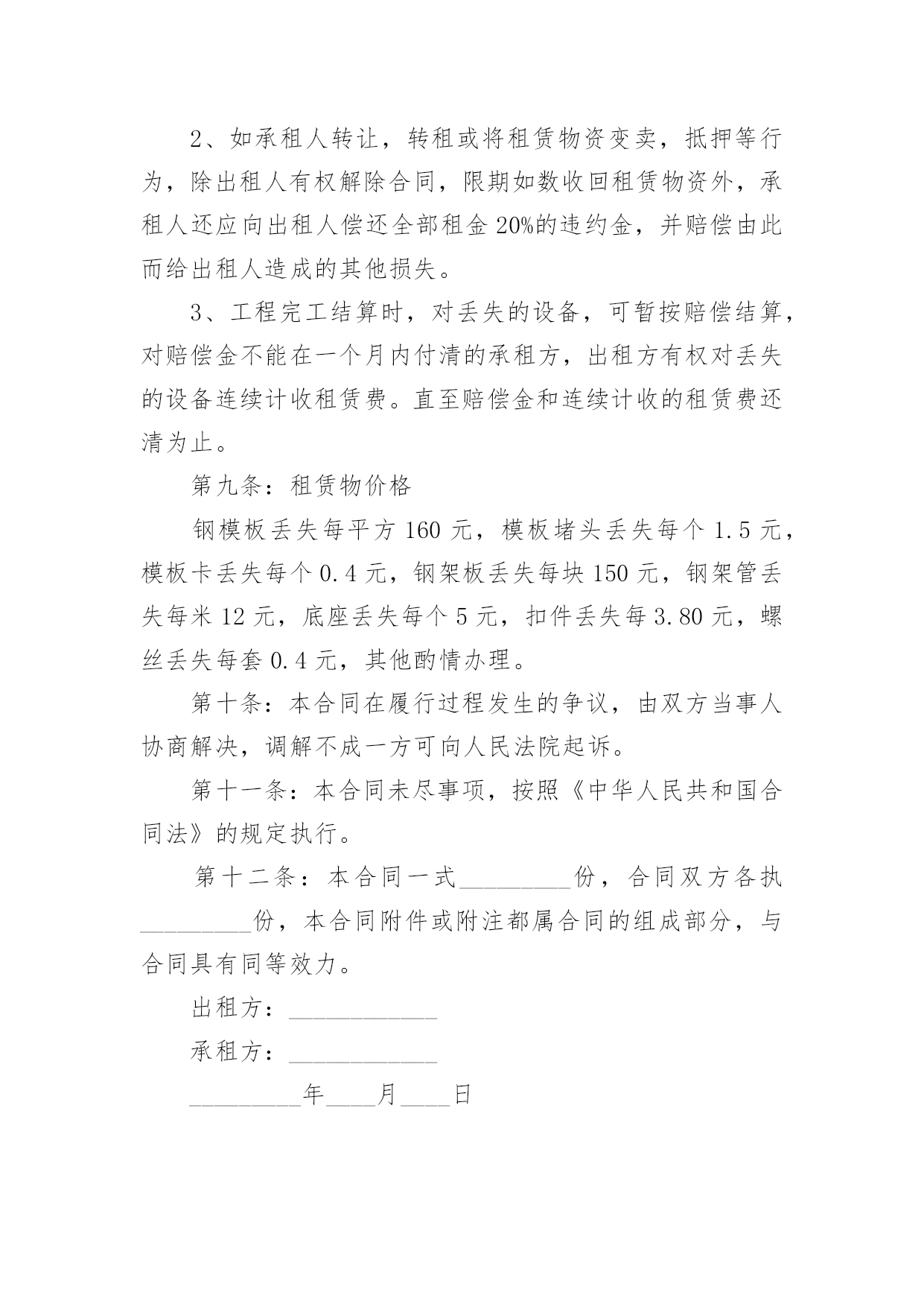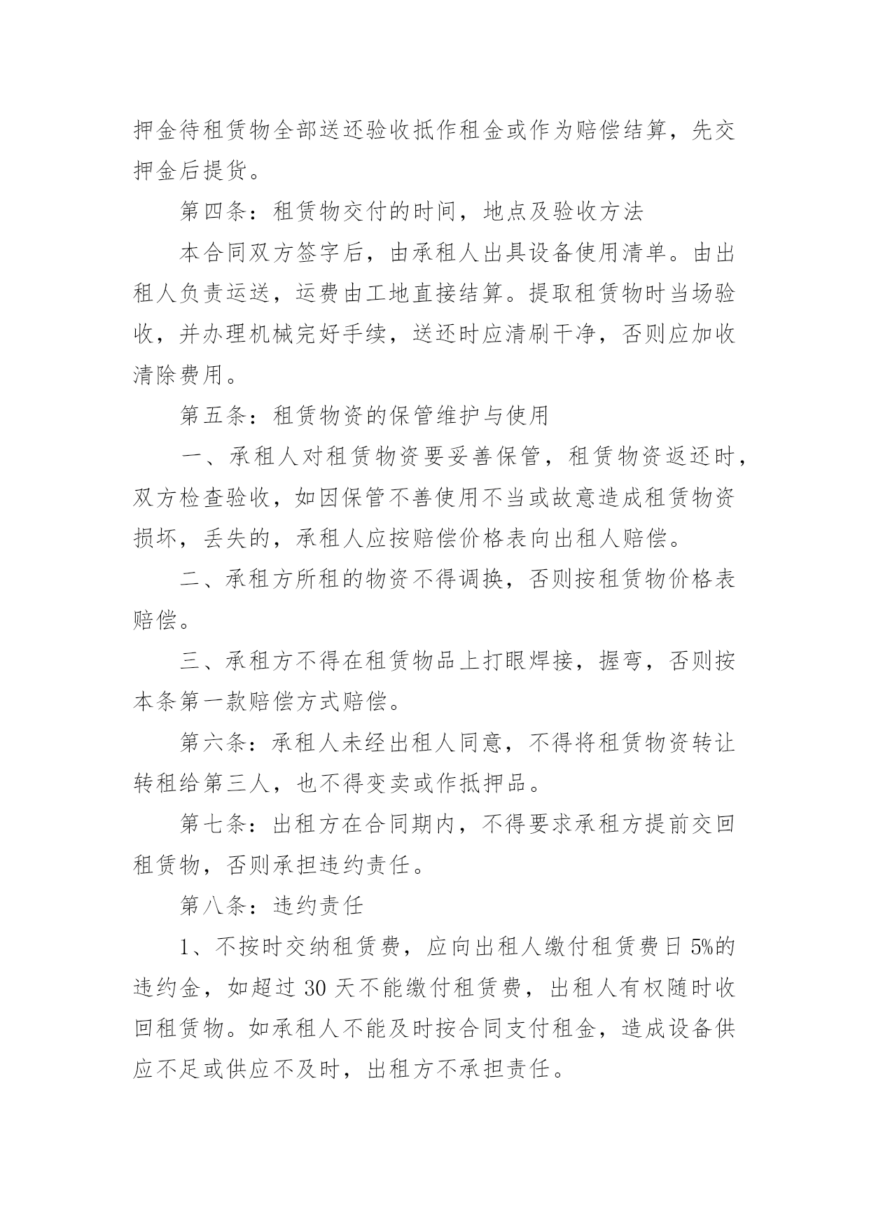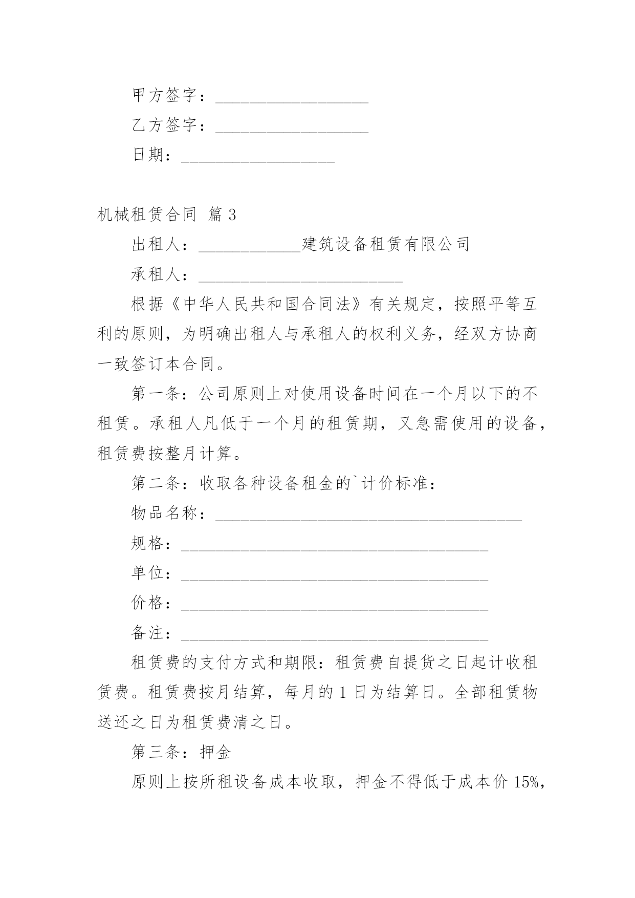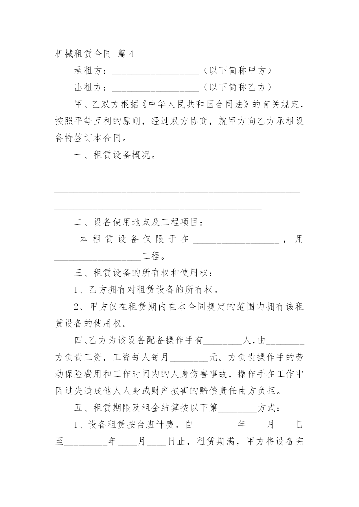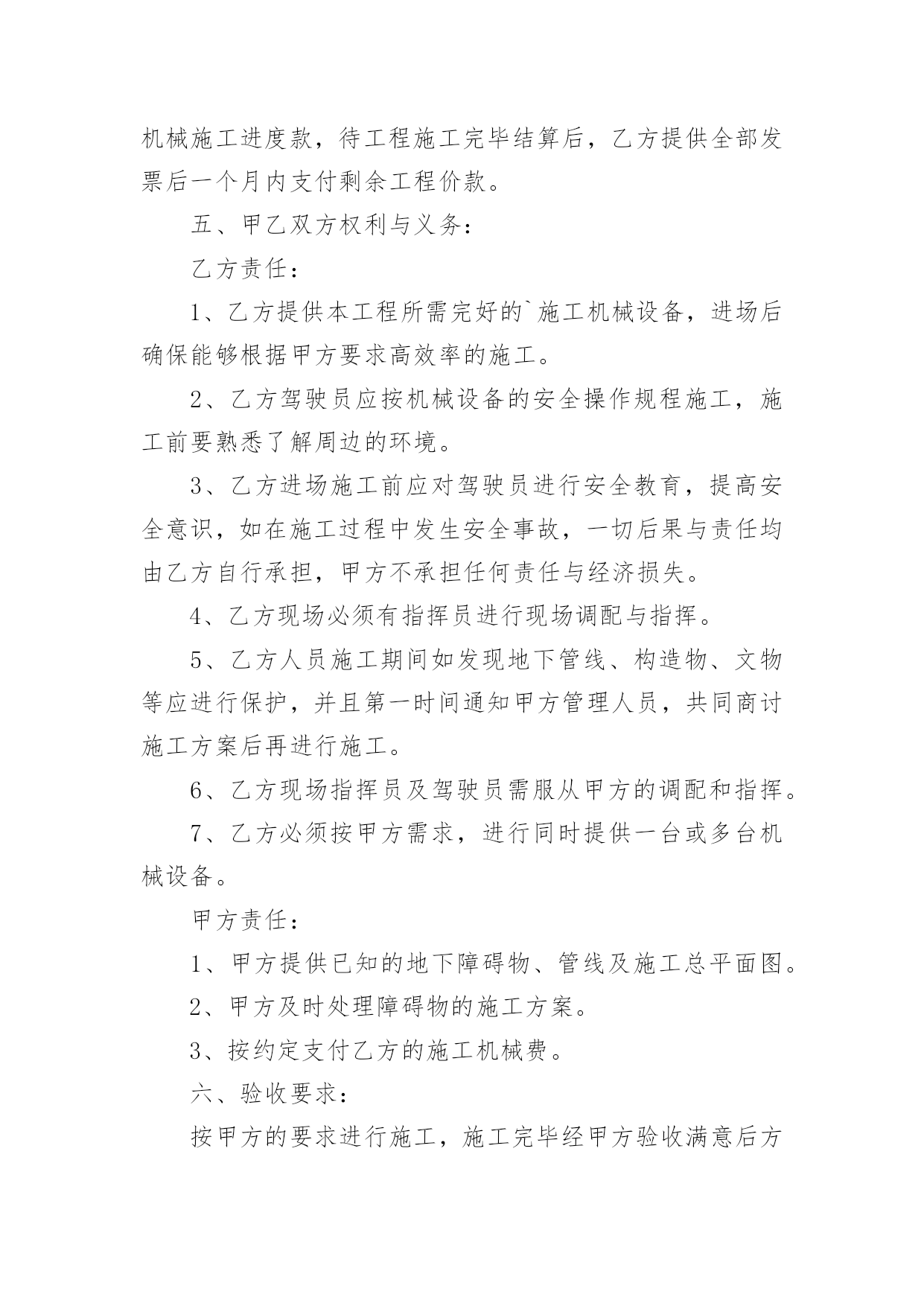 机械租赁合同机械租赁合同(通用)随着法律法规不断完善,人们越发重视合同,合同对我们的约束力越来越不可忽视,签订合同是为了保障双方的利益,避免不必要的争端。拟定合同的注意事项有许多,你确定会写吗?下面是小编整理的机械租赁合同,仅供参考,希望能够帮助到大家。机械租赁合同篇1承租方(甲方):__________________出租方(乙方):__________________根据《中华人民共和国合同法》的规定,经双方协商一致,就甲方向乙方承租设备达成如下协议:一、设备的使用地点及工程情况:使用地点:______________________________________________________工程情况:本地块内原厂房及设备基础地坑等建筑物的清除,便于勘察及打桩。二、承租方式及相关约定:1、乙方所提供的机械设备进场前必须提供设备的品牌、型号、功能、购买时间等,经甲方同意后方可进场施工。2、油料提供:乙方负责提供在租赁期间内设备运行所需的符合运行标准的油料,加油时间由乙方承担。3、设备维修:乙方机手应提前作好设备的维修工作,所付的维修费用由乙方自行承担。4、设备如有故障应及时需修理好,如在4小时内不能正常施工,乙方必须调入其他机械进行施工。5、设备租赁期间,乙方必须按甲方要求直至施工完毕,未经甲方同意中途退场,甲方有权不支付乙方剩余的工程价款。6、乙方必须保护周边现有建筑及构筑物,如有损坏造成均由乙方自行承担。三、租金价格及结算方式:本合同按固定单价的形式进行租用。大挖机:225元/小时大推土机:225元/小时小挖机:120元/小时该费用包括了机械设备运转所需的油耗、维修、操作指挥人工等。在合同实施期间单价保持不变,并不因劳务、材料、机械等成本的价格变动而作任何调整。结算方法:合同总价=实际用时-所用机械的单价该价款已包含机械运转施工的所有费用,不在产生其他任何费用。四、工程款支付方式:每工作时间完成300个小时,甲方支付乙方5万元作为机械施工进度款,待工程施工完毕结算后,乙方提供全部发票后一个月内支付剩余工程价款。五、甲乙双方权利与义务:乙方责任:1、乙方提供本工程所需完好的`施工机械设备,进场后确保能够根据甲方要求高效率的施工。2、乙方驾驶员应按机械设备的安全操作规程施工,施工前要熟悉了解周边的环境。3、乙方进场施工前应对驾驶员进行安全教育,提高安全意识,如在施工过程中发生安全事故,一切后果与责任均由乙方自行承担,甲方不承担任何责任与经济损失。4、乙方现场必须有指挥员进行现场调配与指挥。5、乙方人员施工期间如发现地下管线、构造物、文物等应进行保护,并且第一时间通知甲方管理人员,共同商讨施工方案后再进行施工。6、乙方现场指挥员及驾驶员需服从甲方的调配和指挥。7、乙方必须按甲方需求,进行同时提供一台或多台机械设备。甲方责任:1、甲方提供已知的地下障碍物、管线及施工总平面图。2、甲方及时处理障碍物的施工方案。3、按约定支付乙方的施工机械费。六、验收要求:按甲方的要求进行施工,施工完毕经甲方验收满意后方可退场。七、争议的解决:有关本合同的一切争议,甲、乙双方应根据《中华人民共和国合同法》及其他相关法律的有关条款友好协商解决。如协商不成,提交甲方所在地的仲裁委员会,根据仲裁的有关程序进行仲裁裁决。仲裁费和胜诉方的律师费由败诉方承担。八、本合同壹式贰份,由甲、乙双方各执一份。甲乙双方签字盖章之日起生效。甲方:__________________乙方:__________________时间:__________________机械租赁合同篇2甲方:__________________(承租方)乙方:__________________(出租方)为了国家建设,根据工程需要,明确双方的权利的义务,经双方协商后签定如下租赁承包协议:一、甲方租赁乙方____________________________________。二、付款方式及工作时间:1、付款方式:月结;2、在租赁期间内,甲方未征得乙方同意,不得擅自在所租设备上增加或拆除任何零部件,起租日期以现场签证为准。三、甲方双方责任1、乙方机械进入甲方工地,共同负责机械的安全,保证工程完工后机械人员安全离场。2、施工工地如甲方属于证照不健全、出现电缆、光缆、水道、军事设施等影响施工,导致乙方机械人员被有关部门扣留甲方负责。3、如果出现甲方资金不能按合同付款,乙方有权停机。停机期间照算工作日,停机两天再不付款,乙方有权把机械拖走,造成的一切损失由甲方负责。4、乙方机手应听从甲方工地人员的指挥和安排,认真工作,合理施工,不听甲方指挥人员的指挥,甲方有权解除合同,费用乙方自负,但甲方不得强行机手进行危险作业,否则乙方机手有权拒绝。5、乙方应确保机械正常作业,圆满完成任务。6、由于乙方机械手